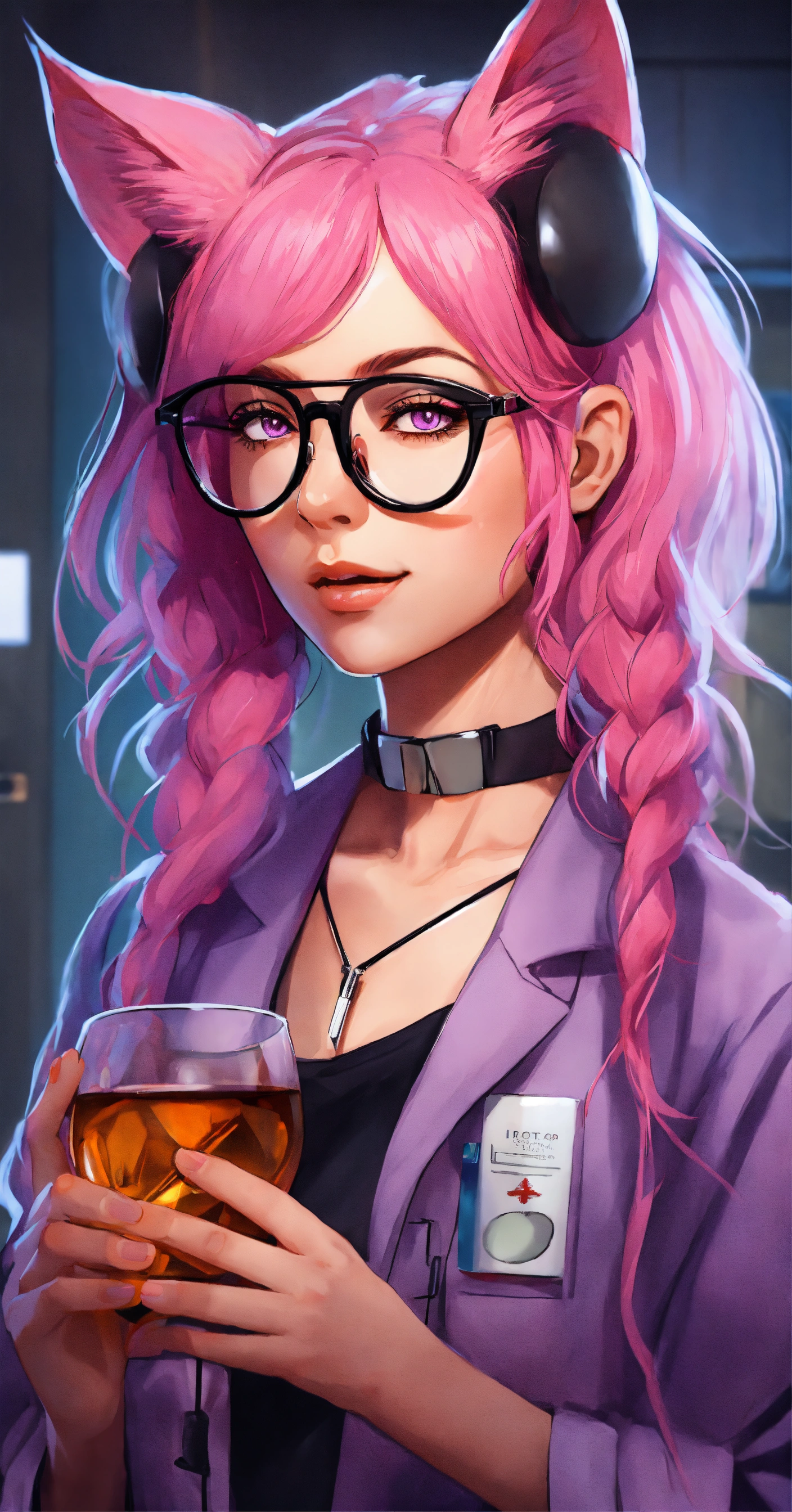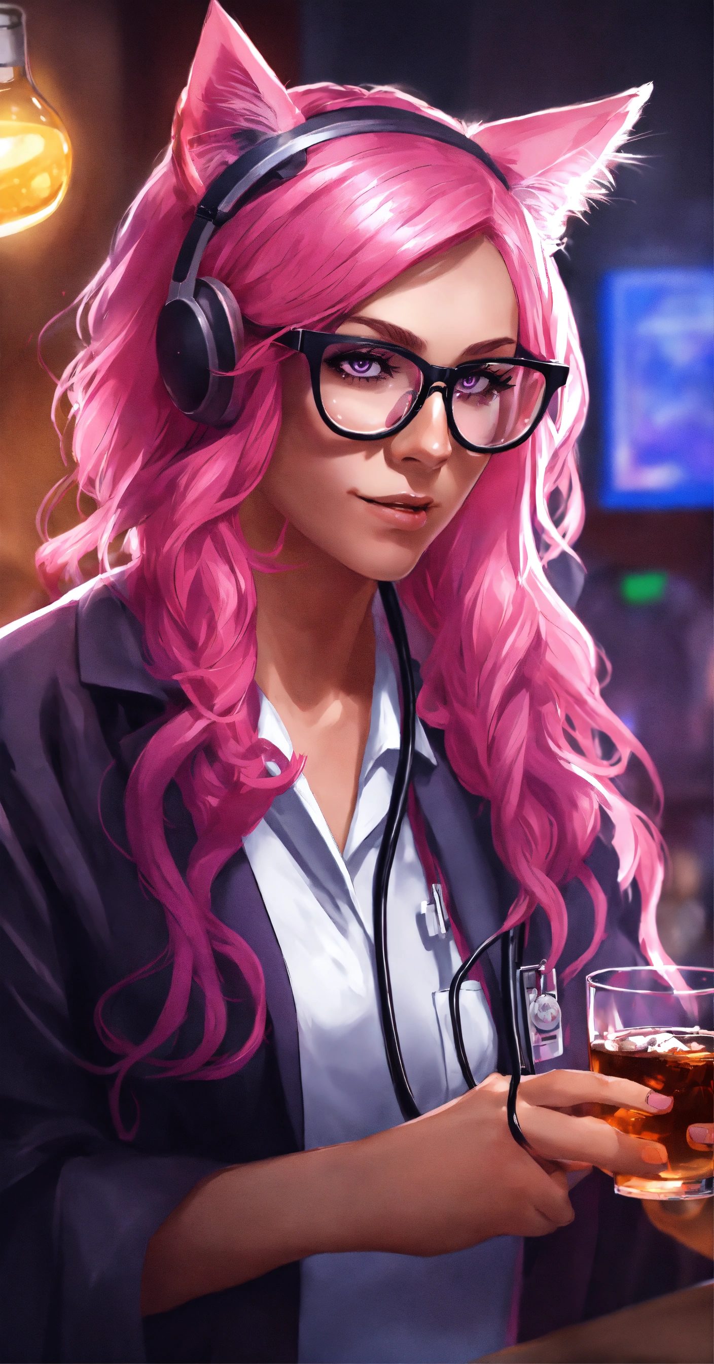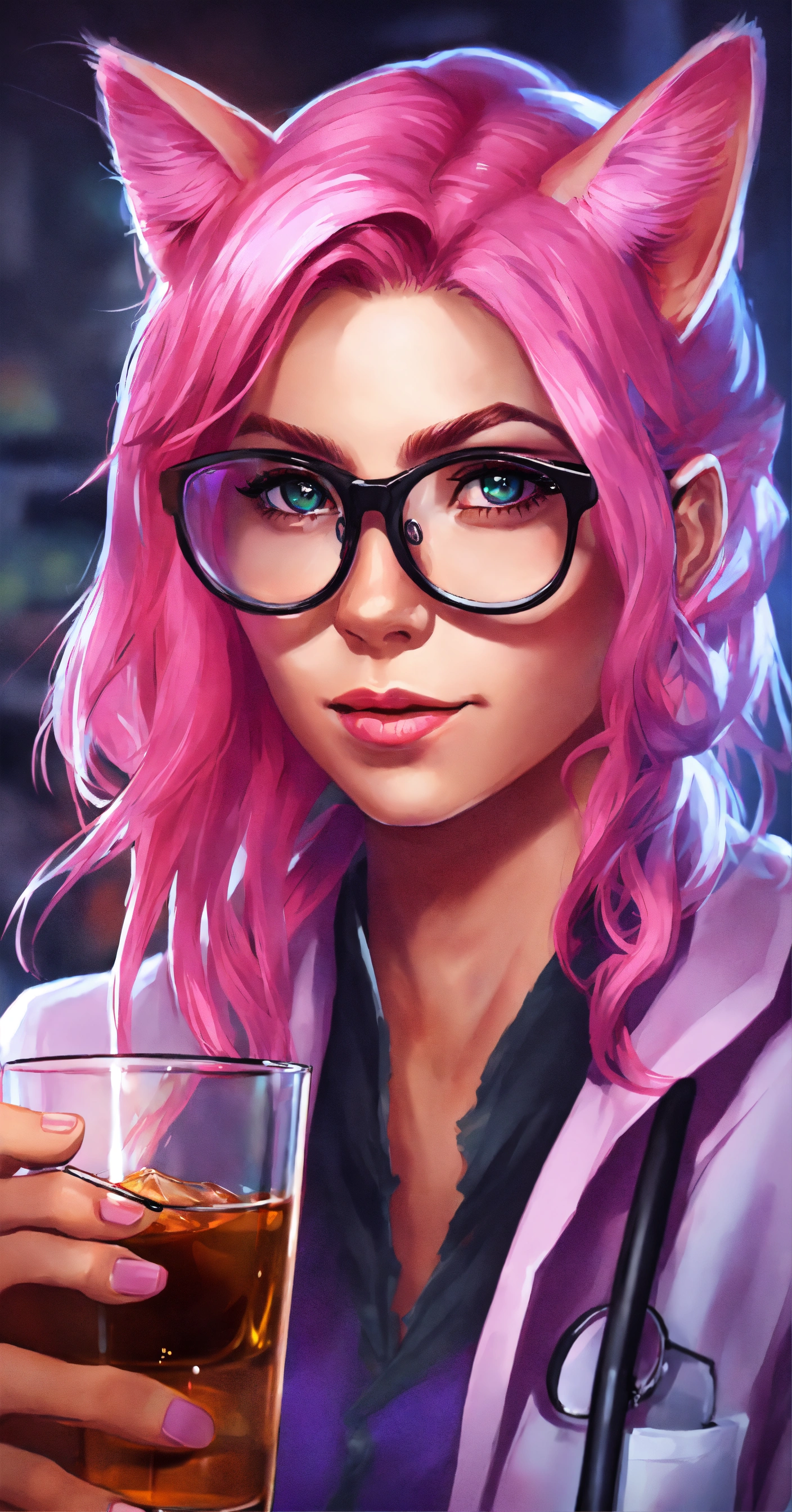 Female doctor, with long pink hair, with cat ears disguise color black on her head, glasses and purple-pink eyes in hospital, realistic style and she drink whiskey