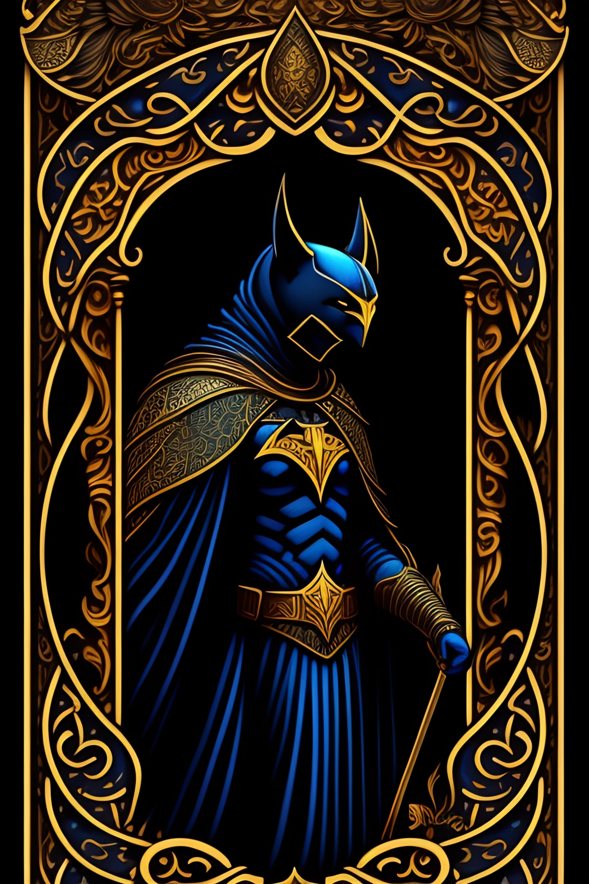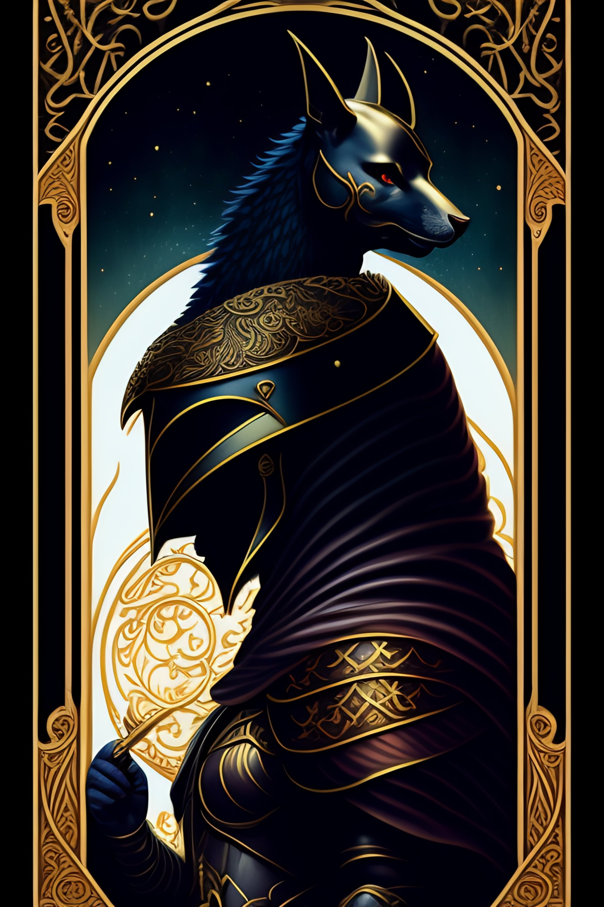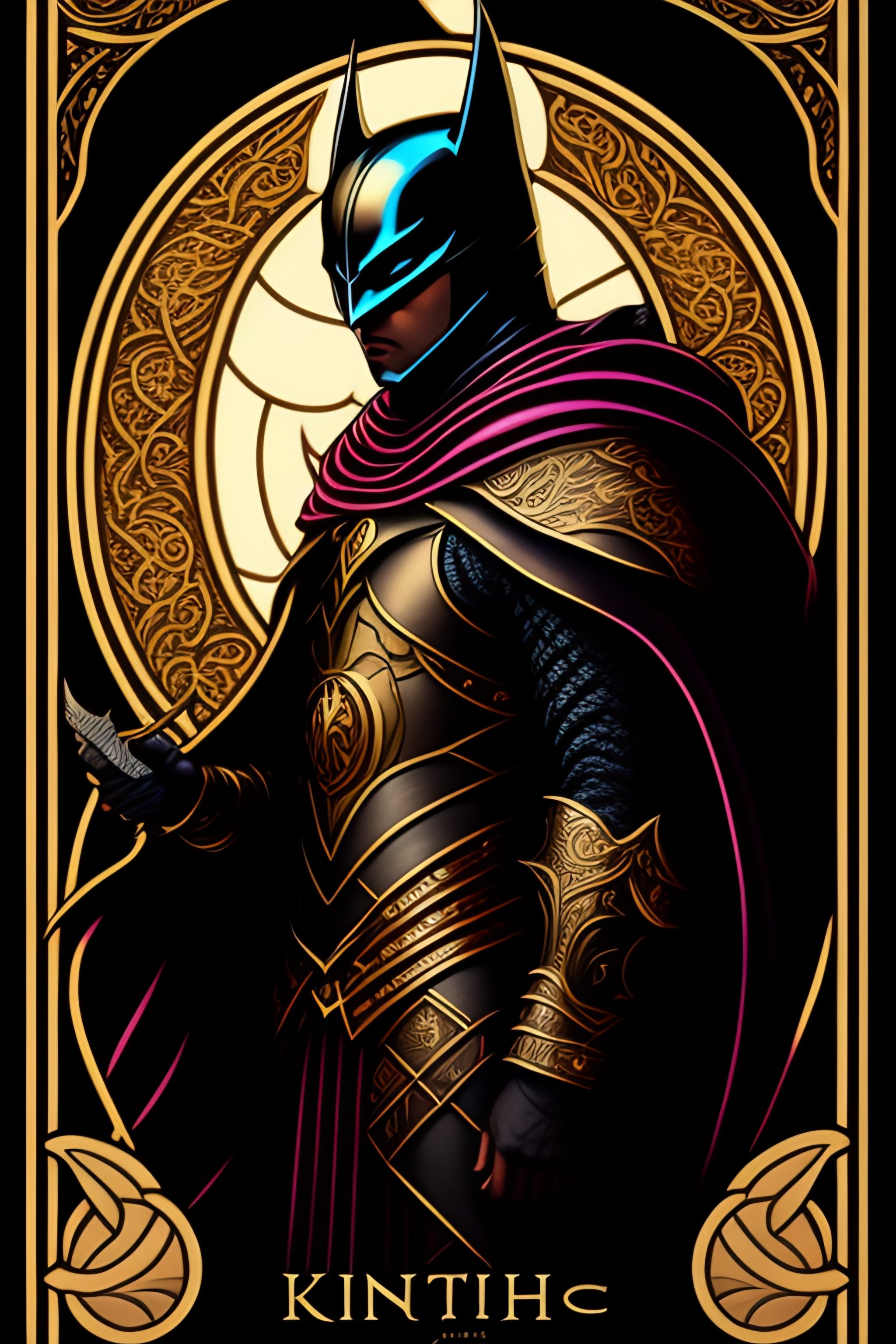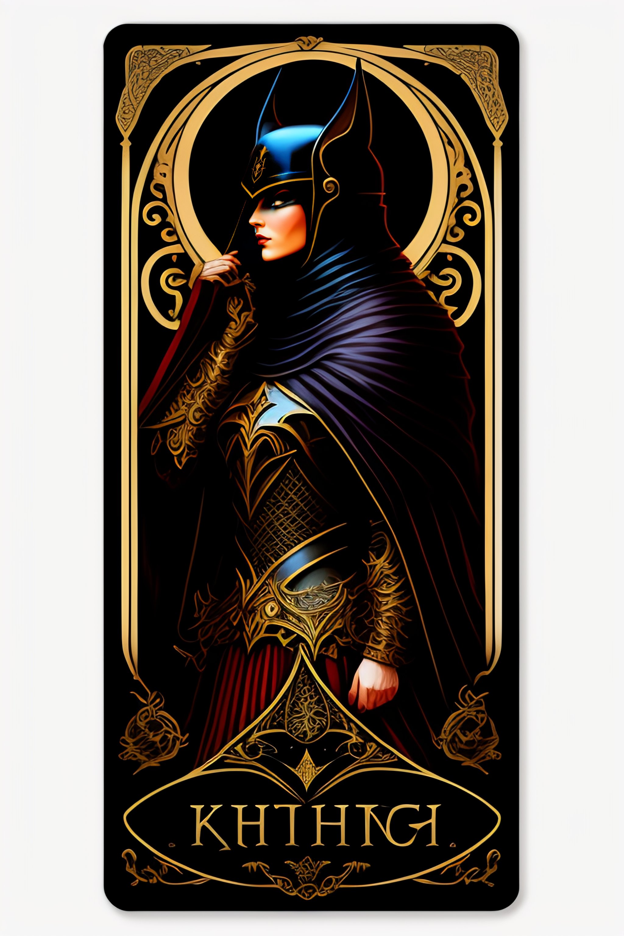 A art nouveau tarot card of a dark knight with a dragon style helmet