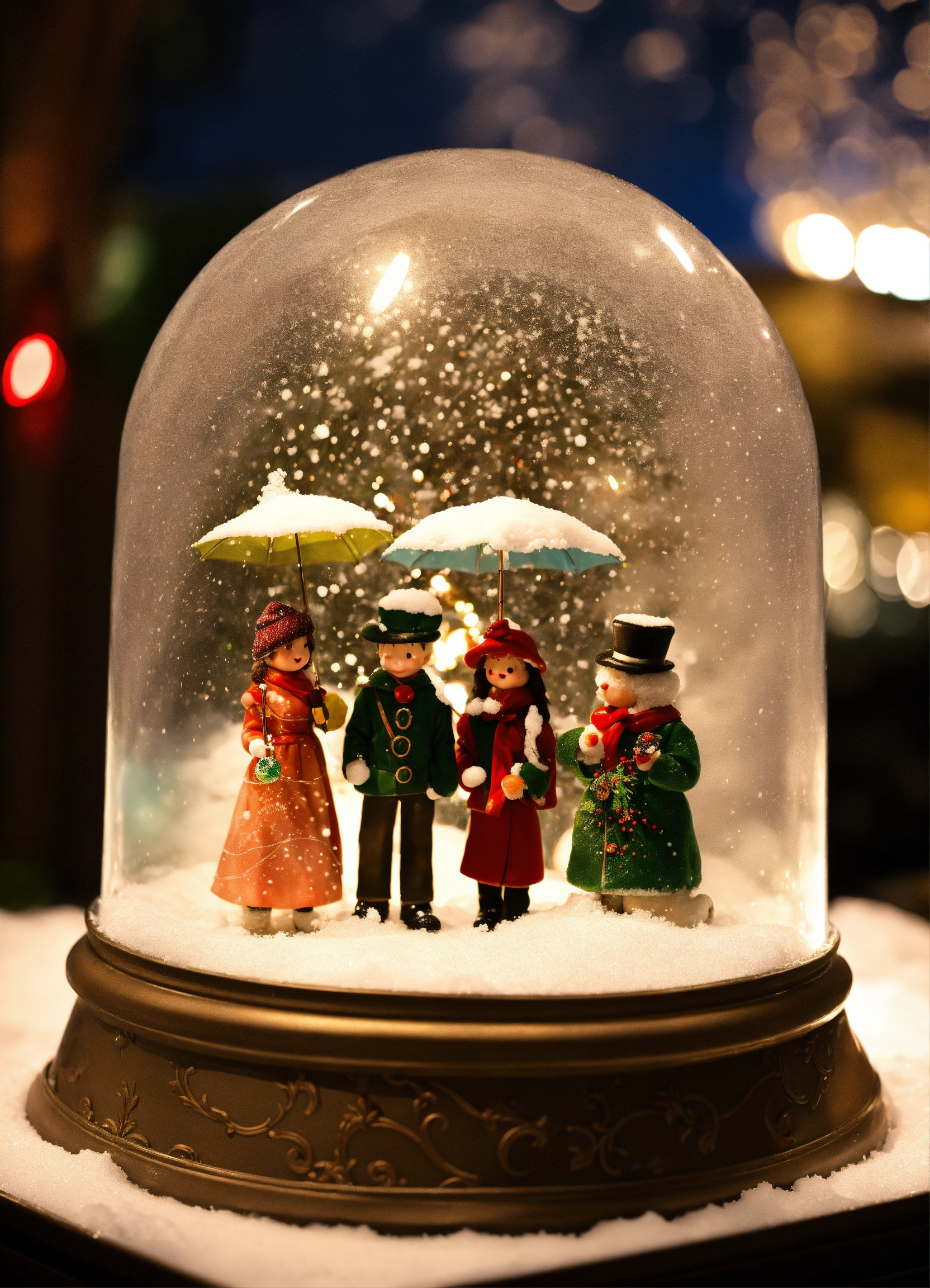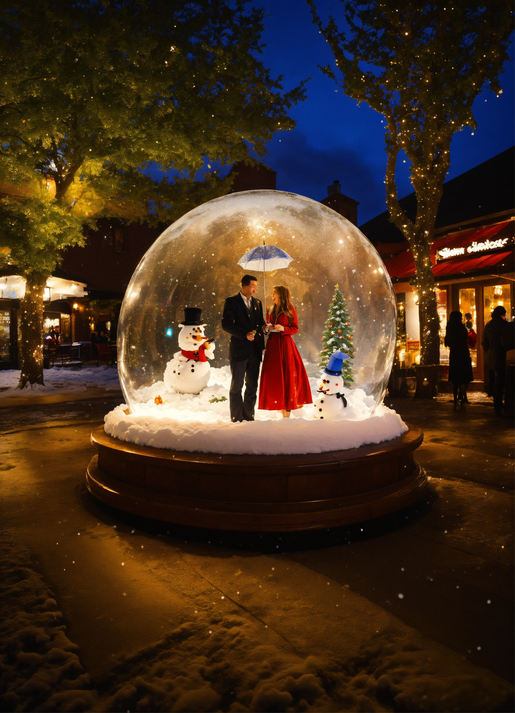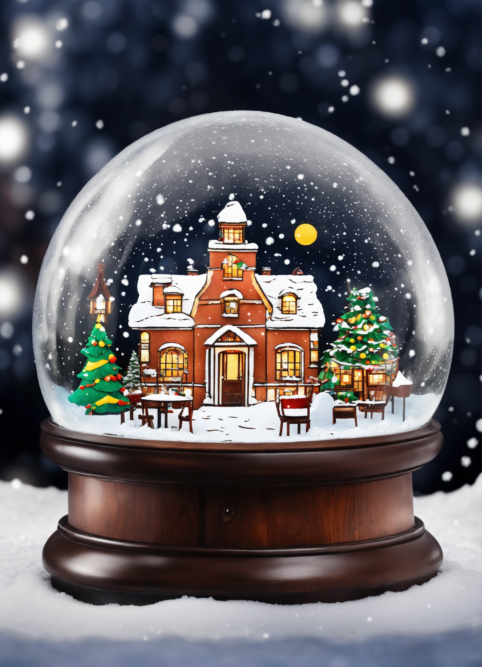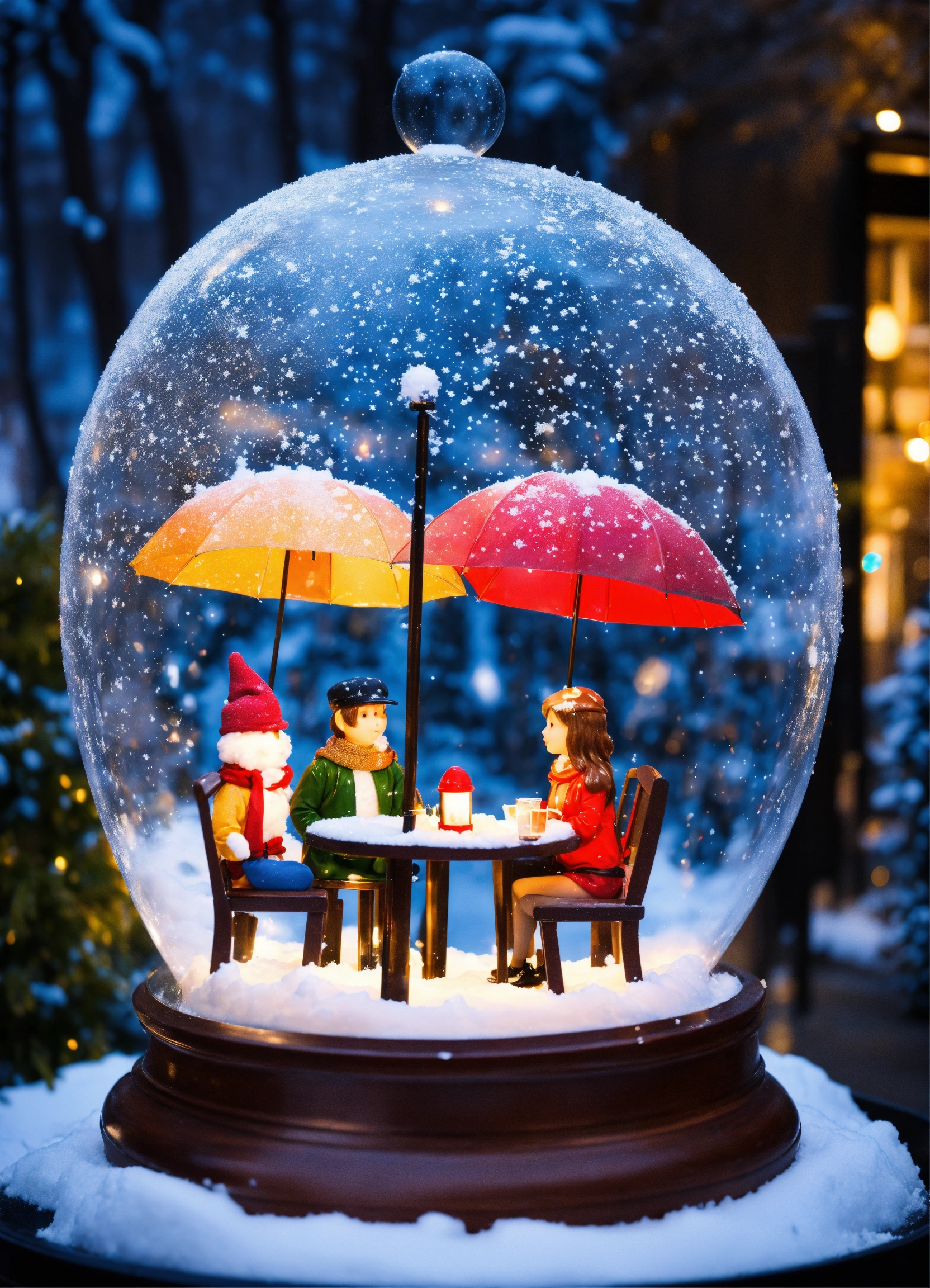 Generate an imaginative scene of friends inside a life-sized snow globe situated in front of the restaurant. the snow globe should have a charming cloud and umbrella theme, complete with artificial snow gently falling around the friends inside