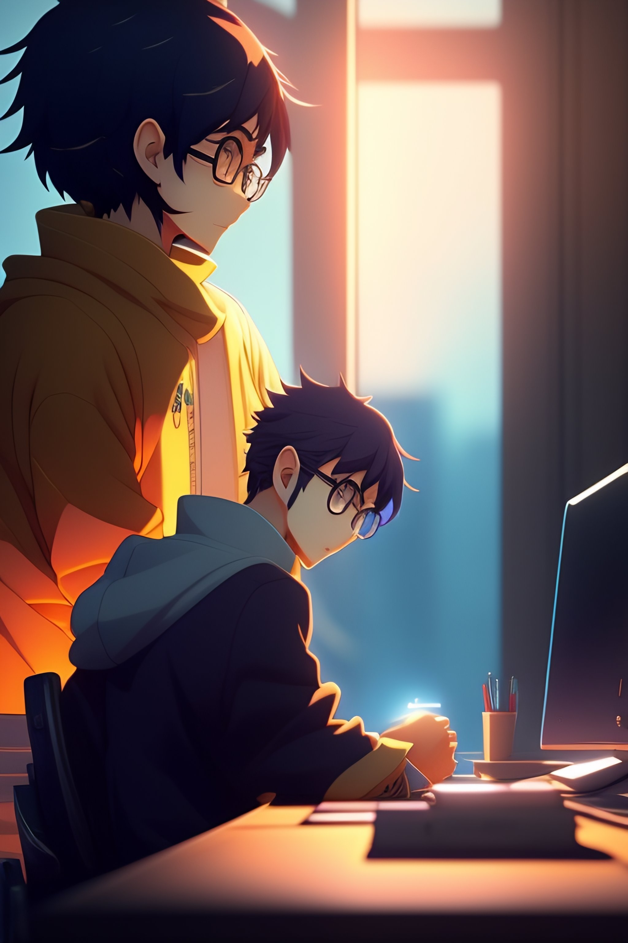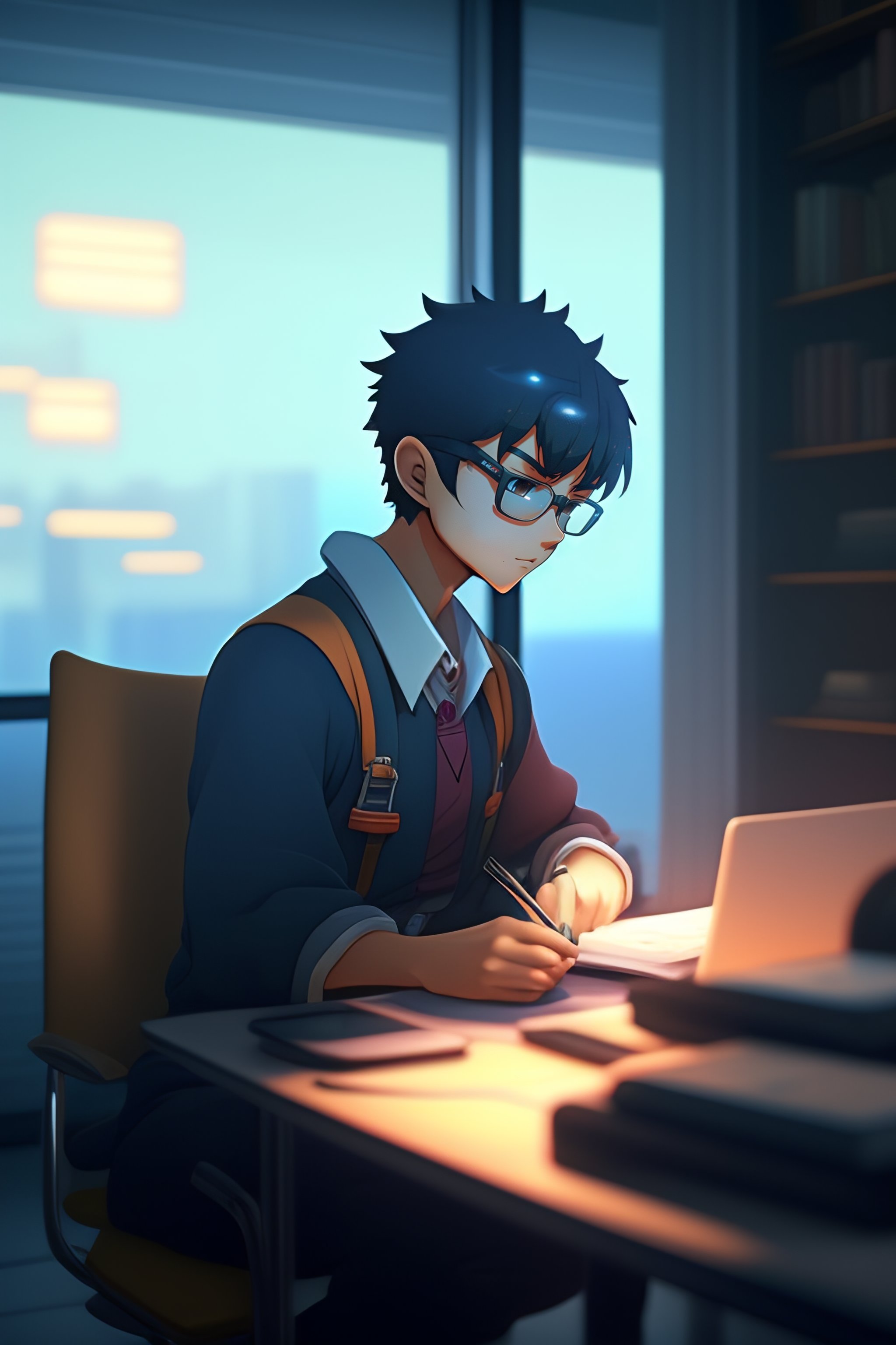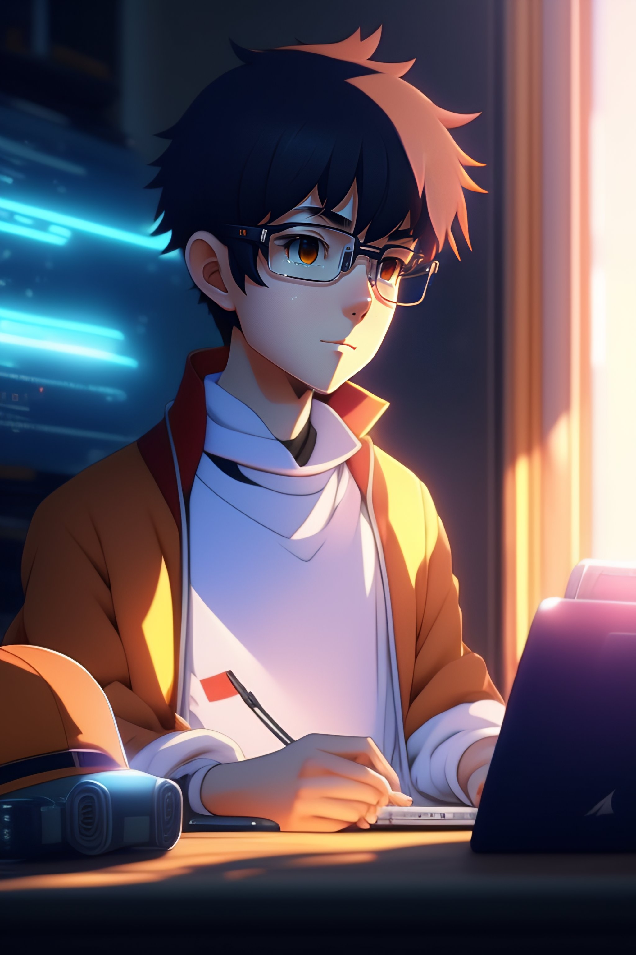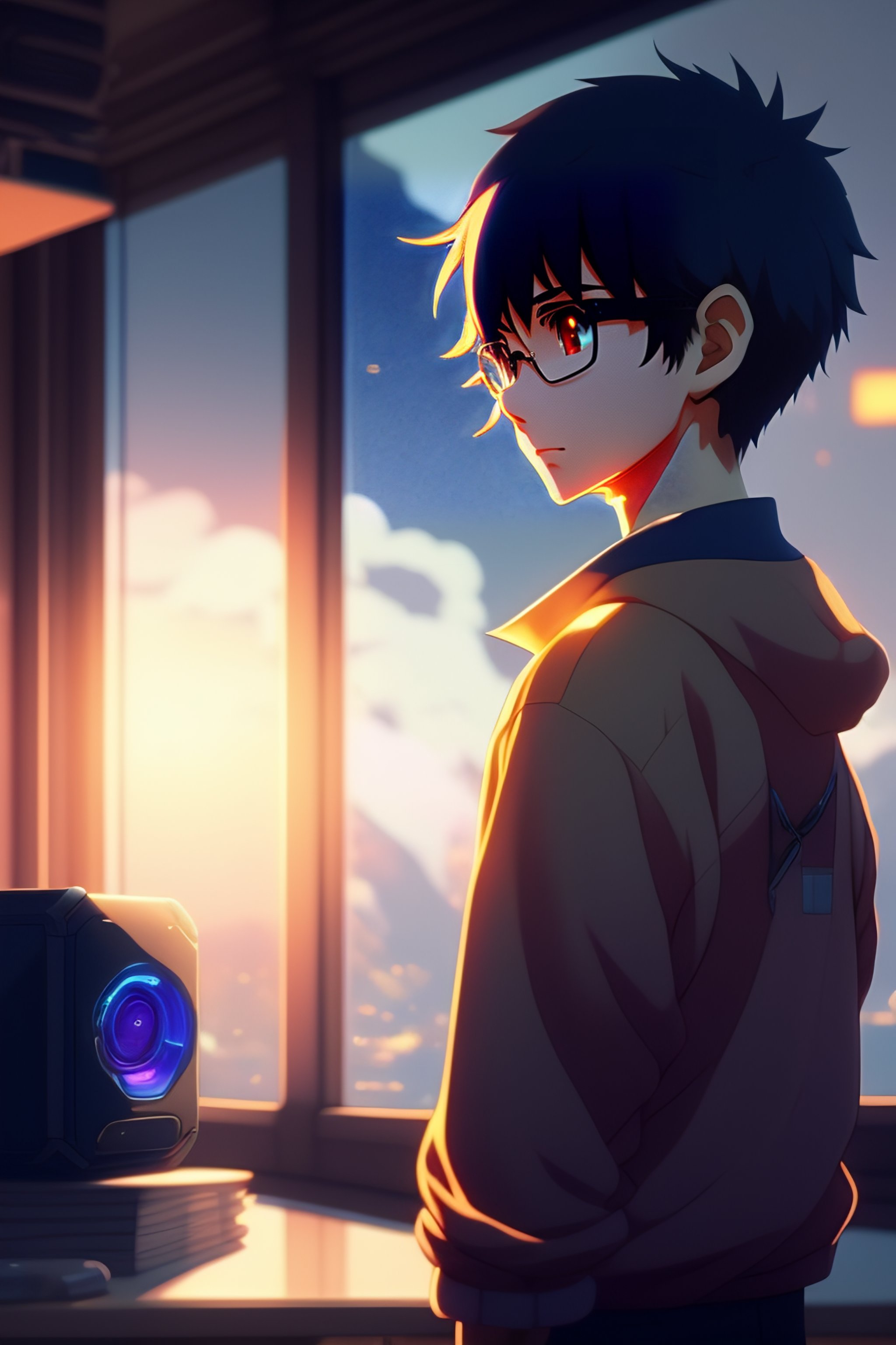 A nerdy anime boy is planing his work in a room full of gadgets, by makoto shinkai and ghibli studio, dramatic lighting, highly detailed, incredible quality, trending on artstation