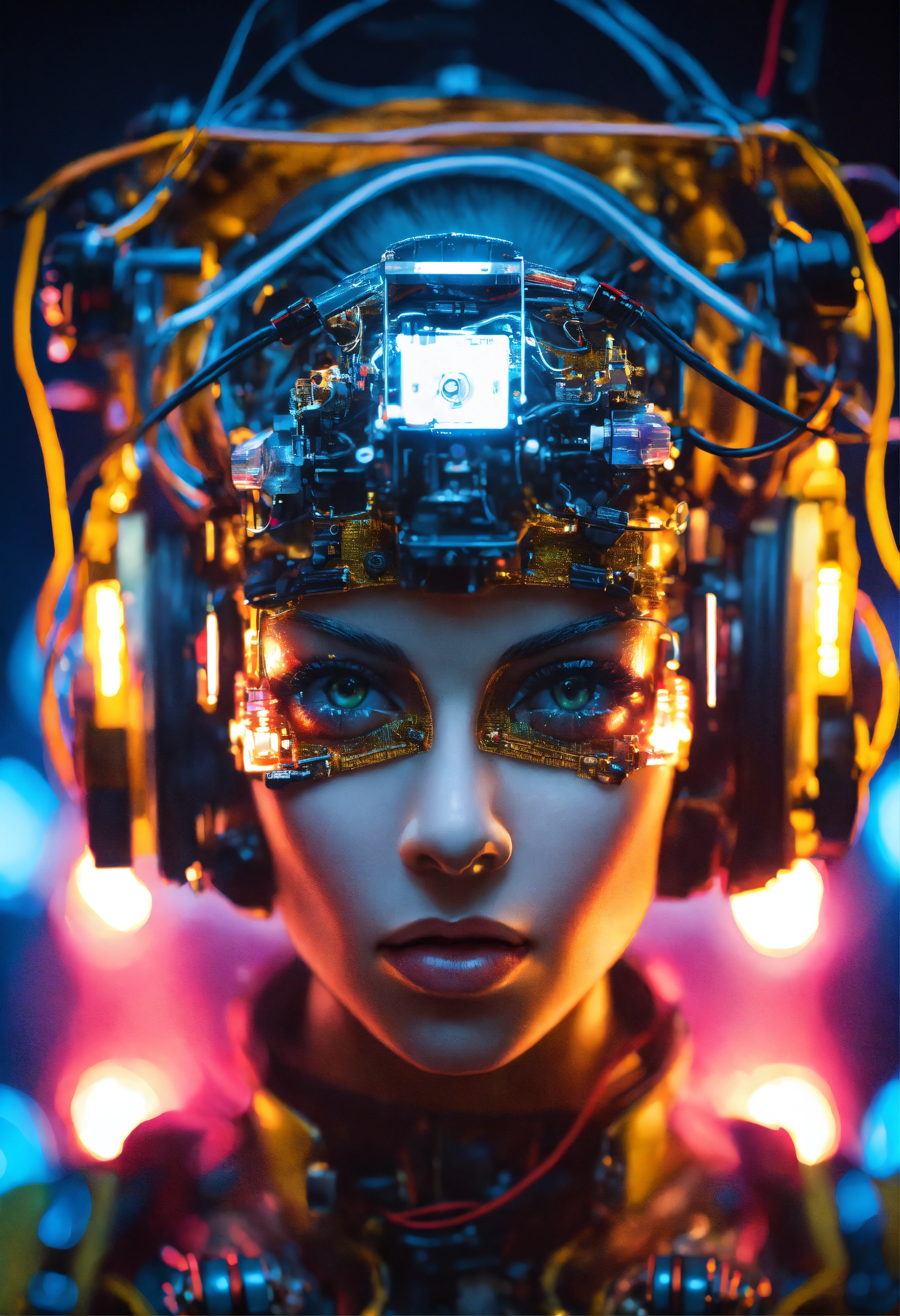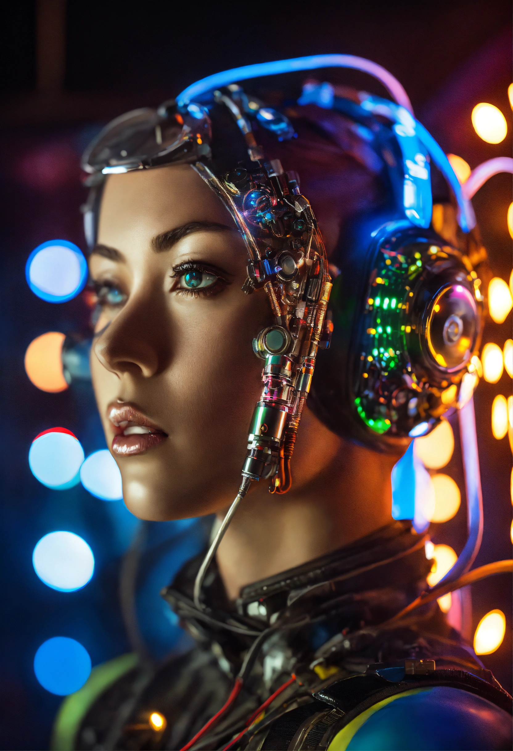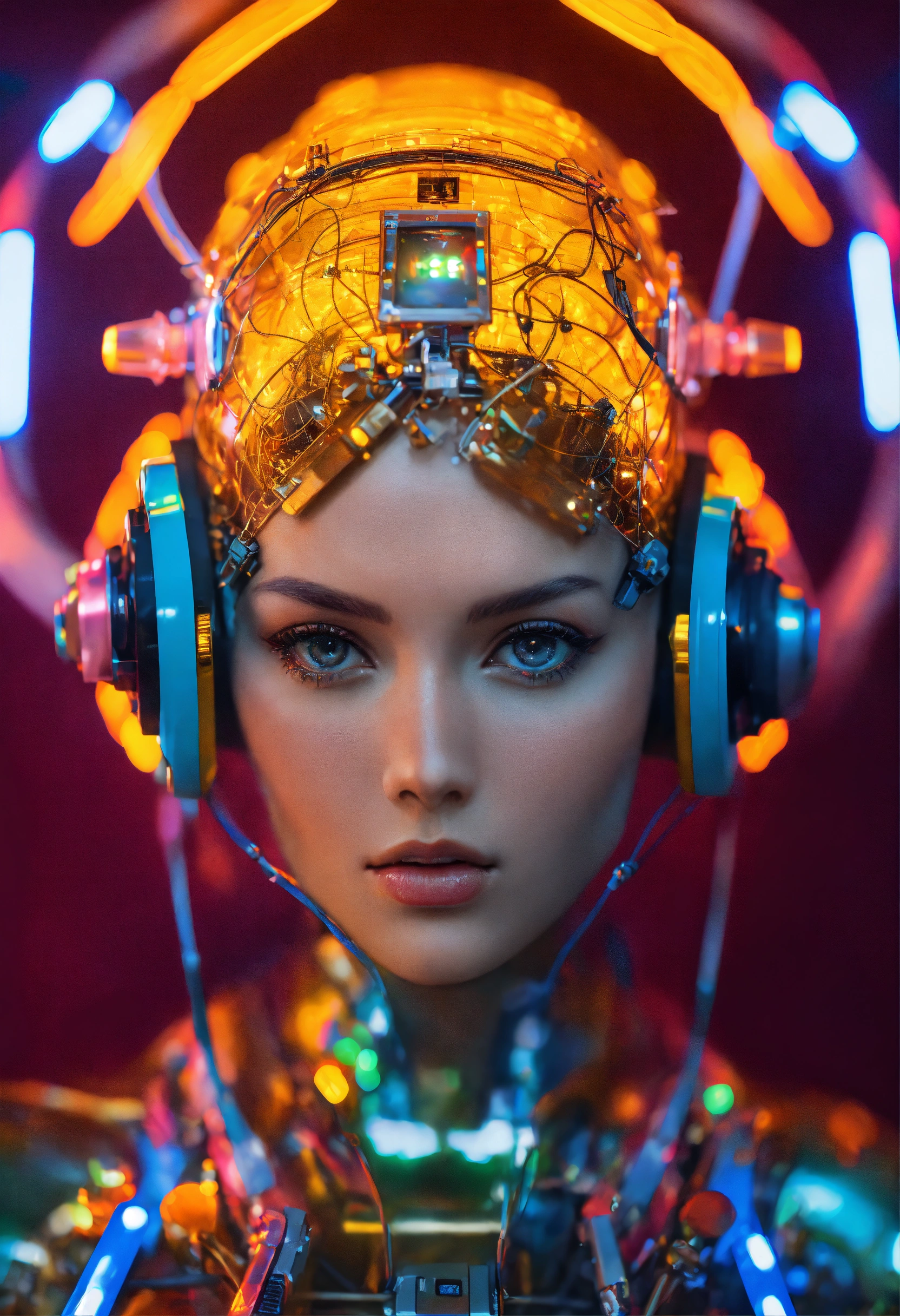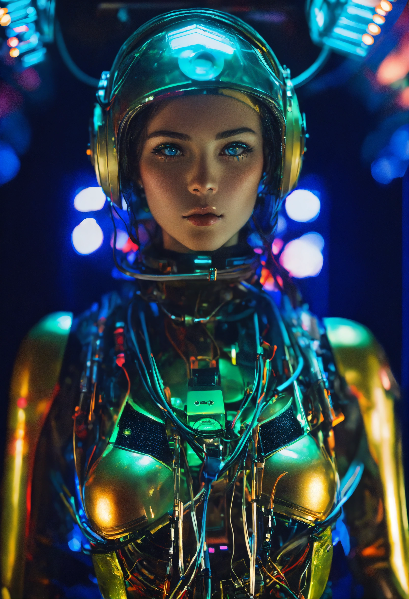 Portrait photography, a cyborg astronaut woman head without body, connected by cables and wires and led, an attractive transparent iridescent plexiglass body punk plc robots with plexiglass motor head, with ray guns, beautiful, highly detailed, sharp focus, studio photography, xf iq 4, 150 mp, 50 mm, iso 200, 1/1 60 s, realistic, colorful disco lights, octane render, adobe lightroom, rule of thirds, symmetrical balance, depth layering, polarizing filter, sense of depth, ai enhanced