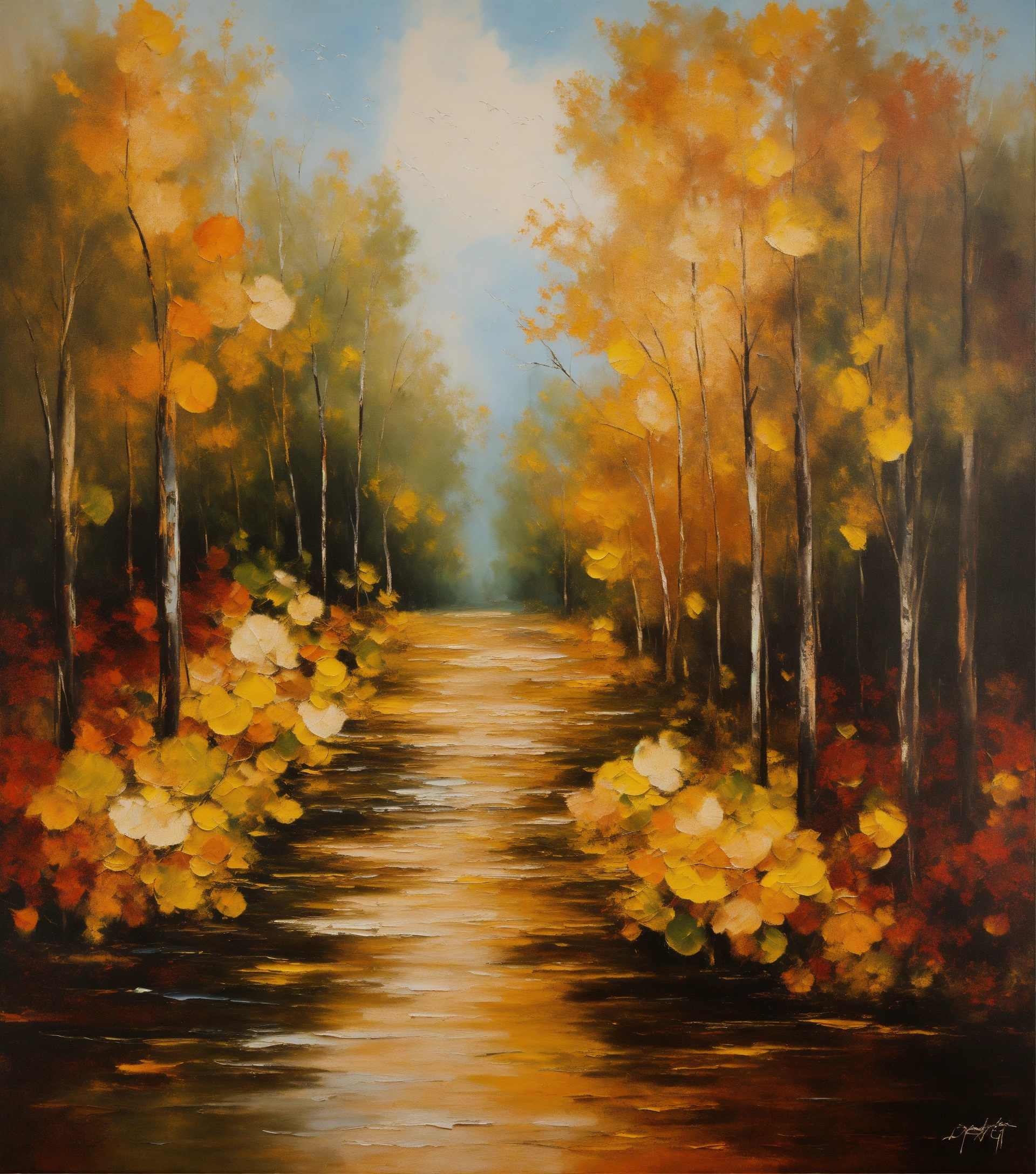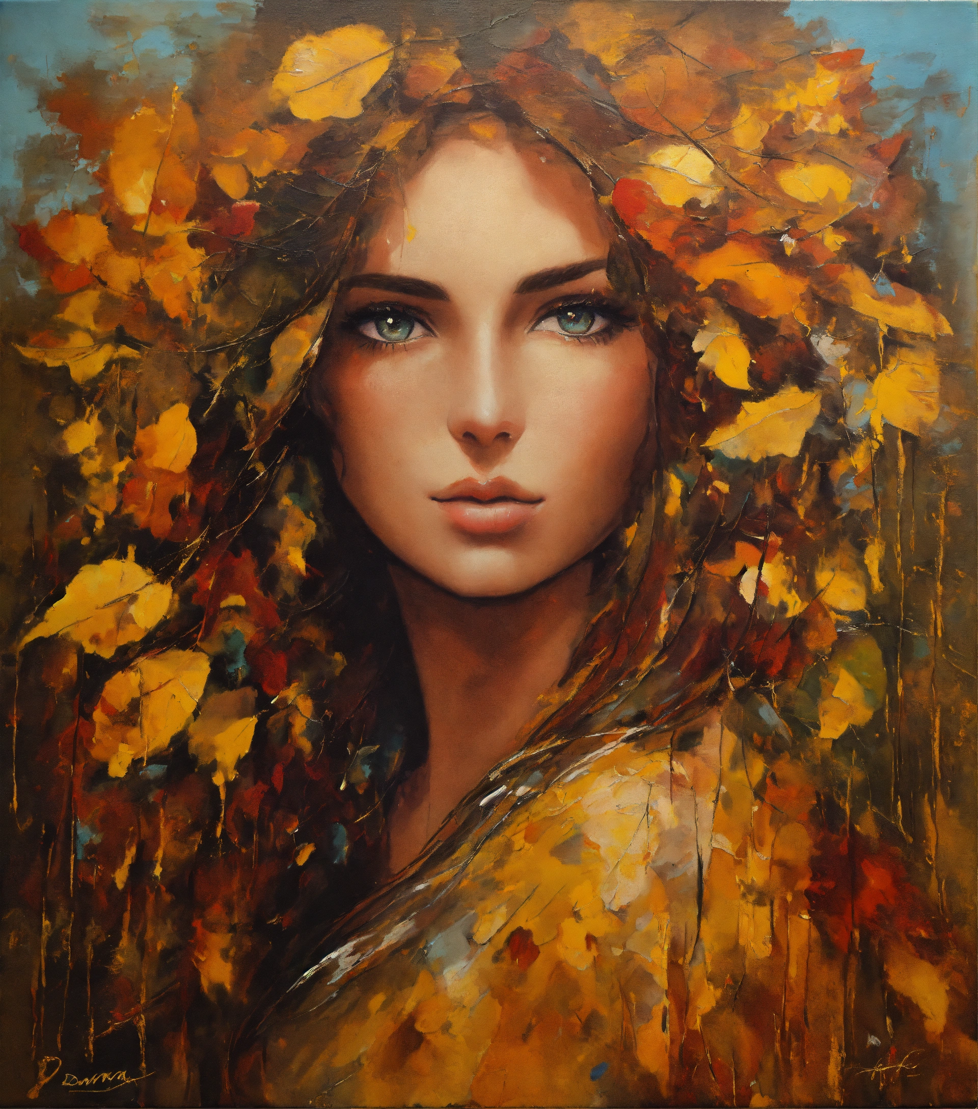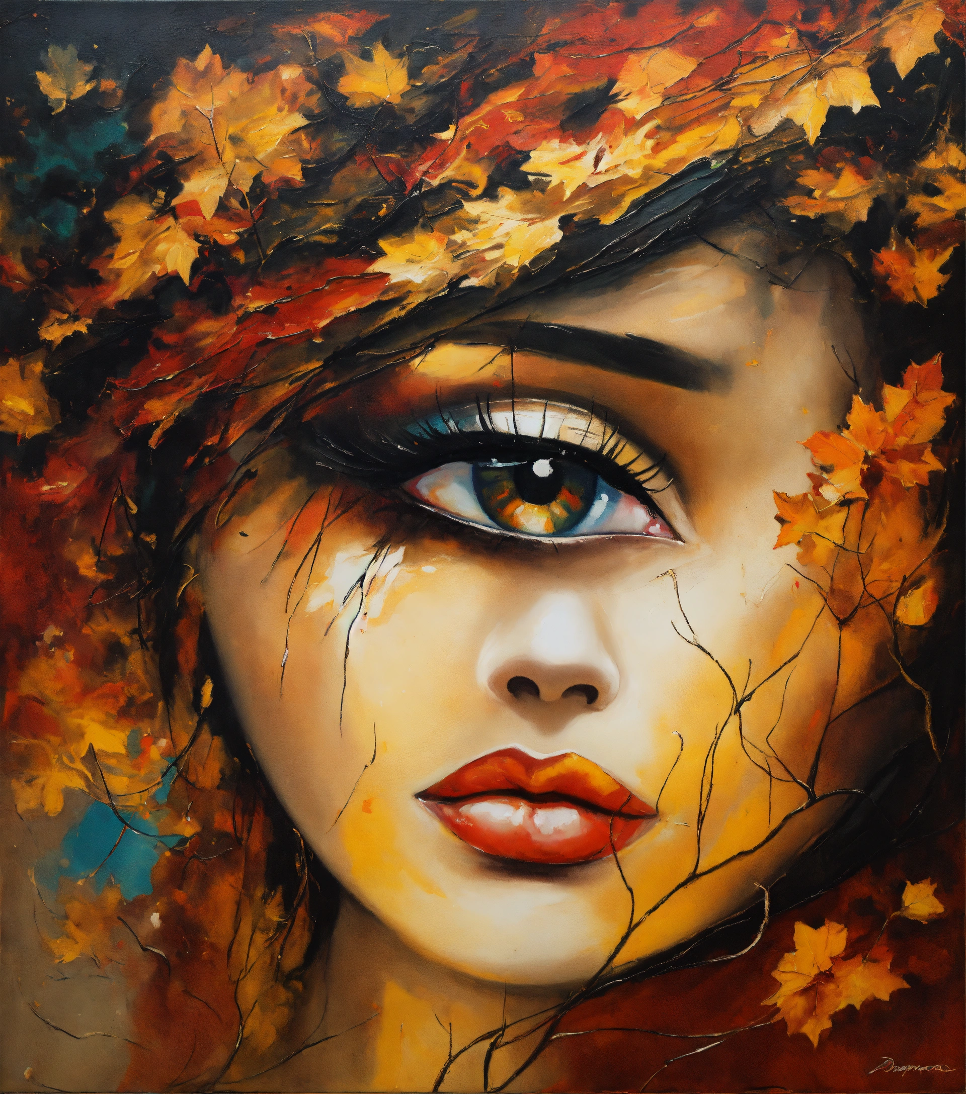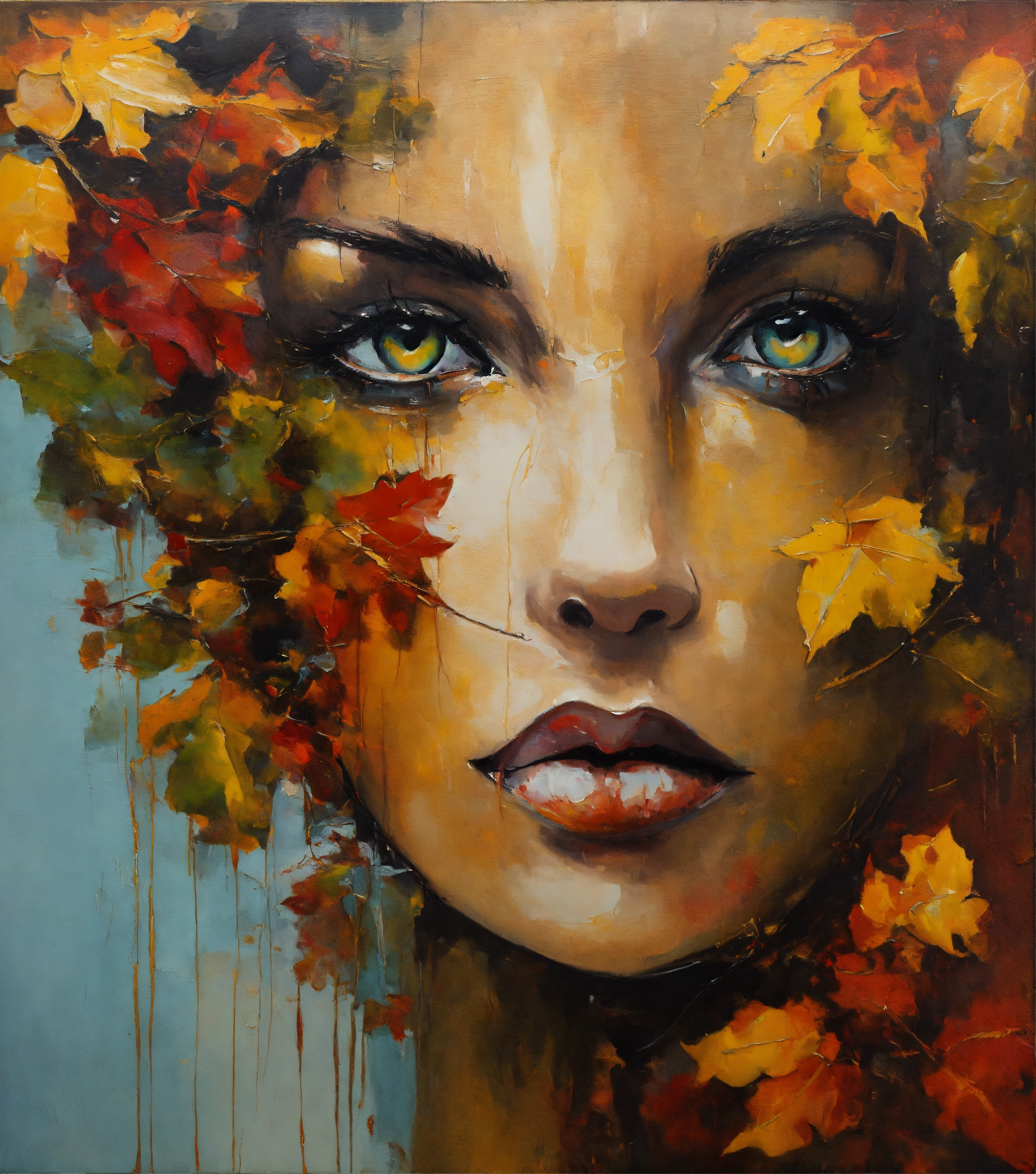 Abstract oil painting donna matura con grandi occhi neri in autunno dorato