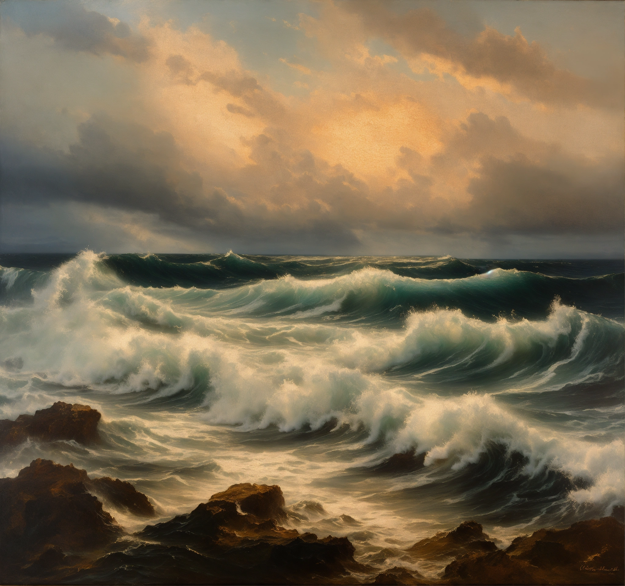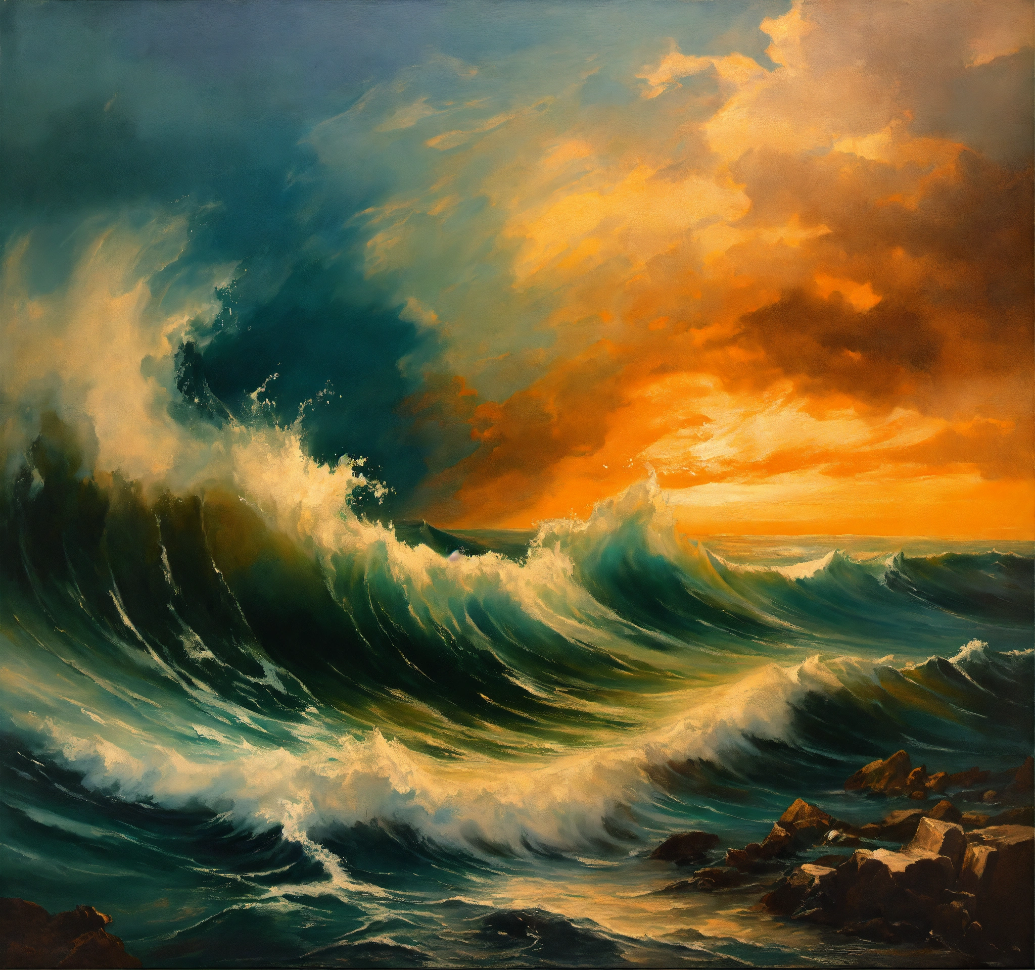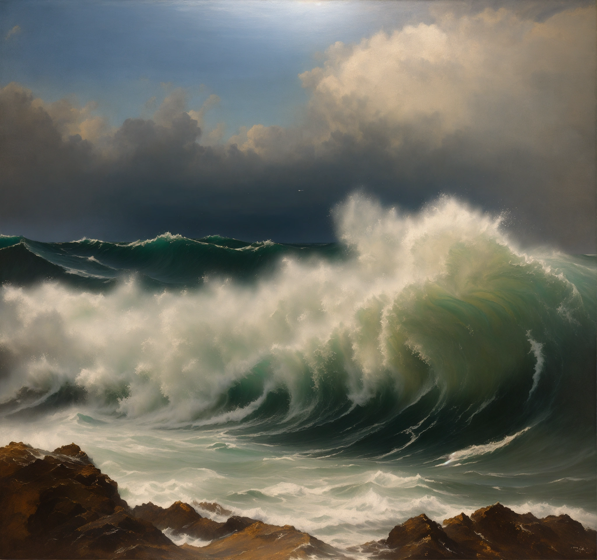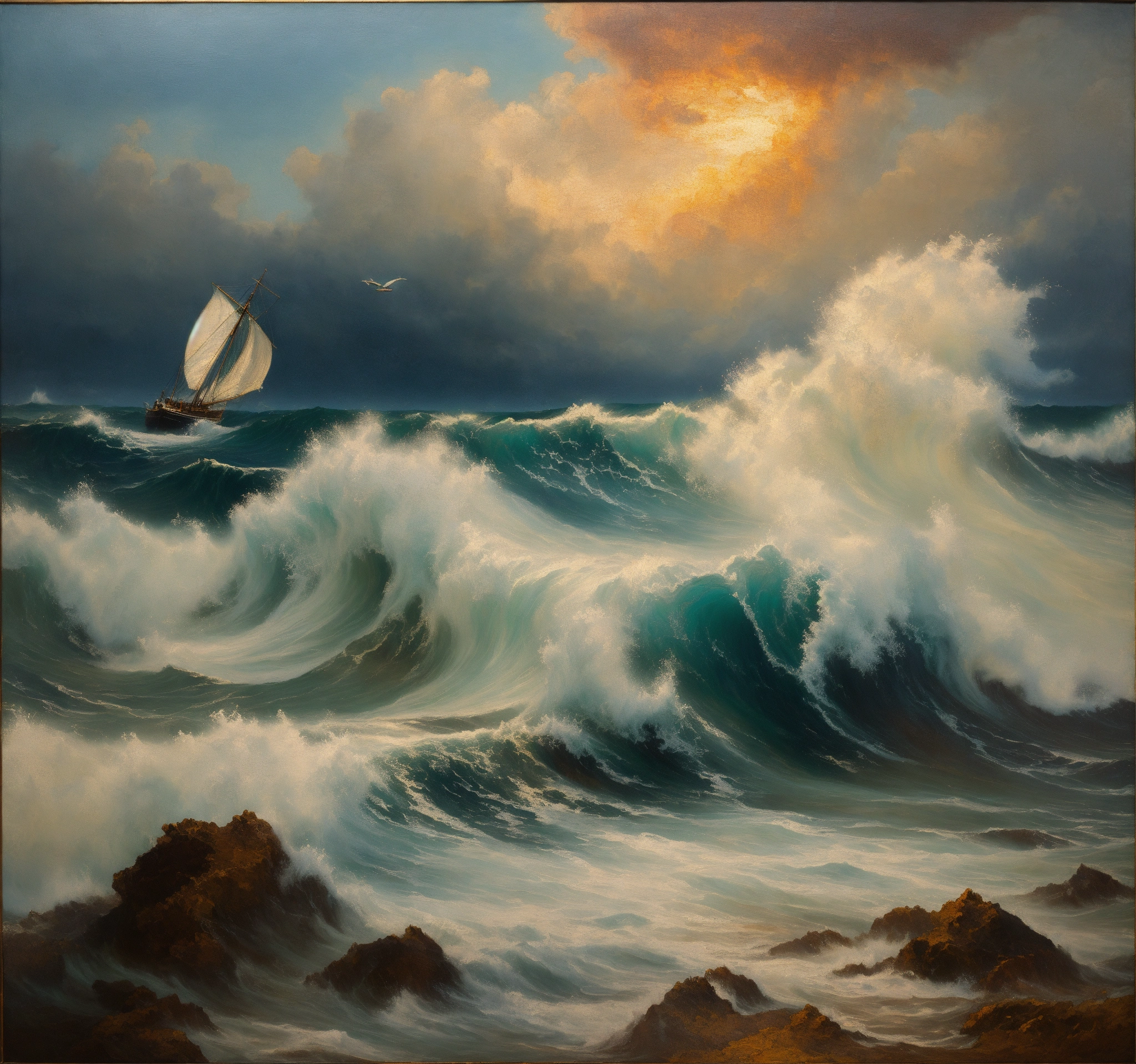 Aged baroque-style oil painting illustrating the vast expanse of the sea with its turbulent waves. Amidst the ocean's fury, several giant tentacles emerge from the depths, adding a touch of mystery and awe to the scene. The weathered appearance of the painting enhances the drama and age-old tales of sea monsters.