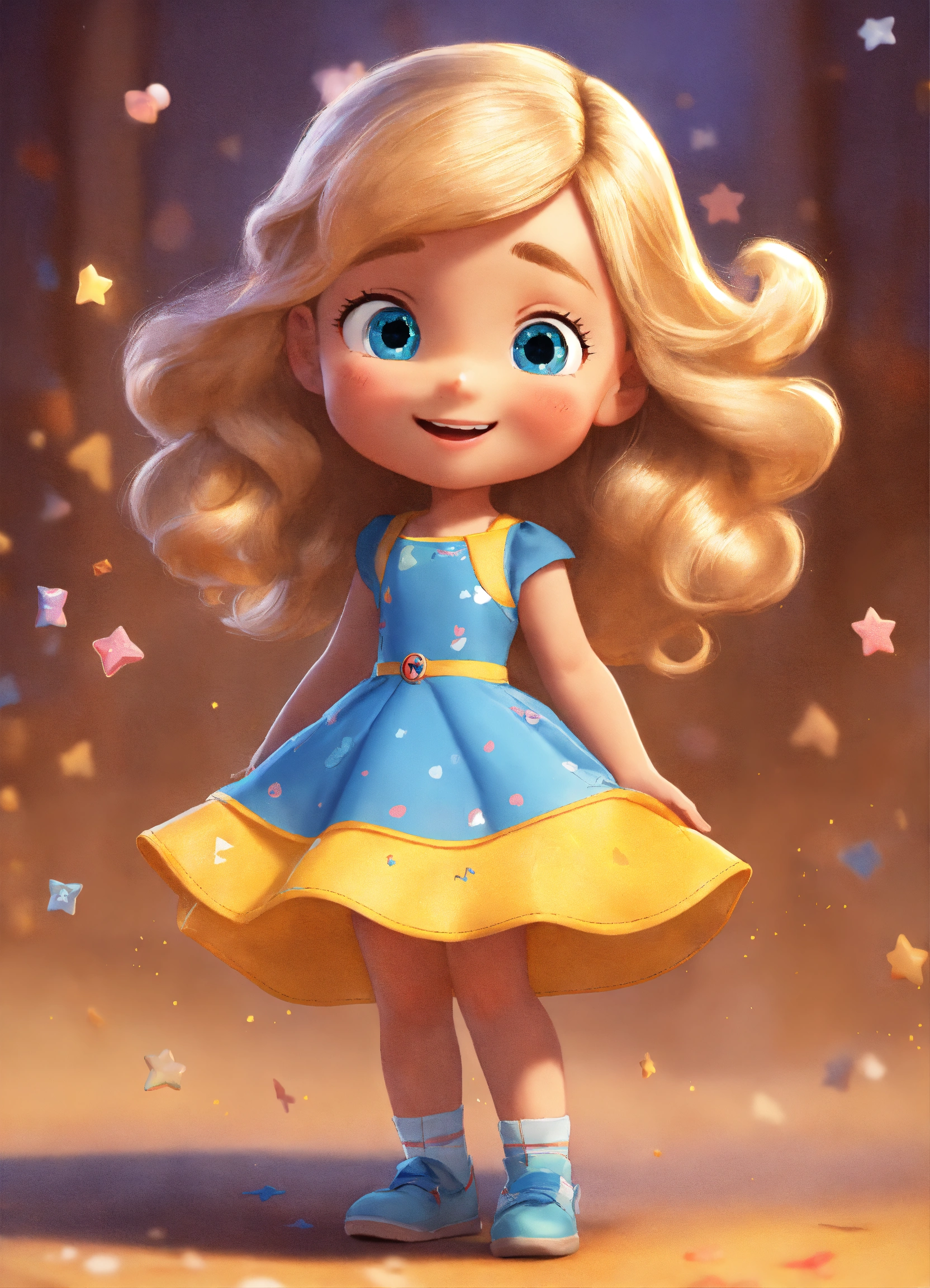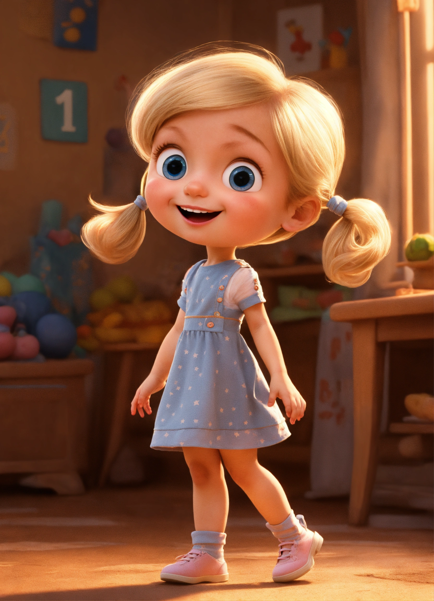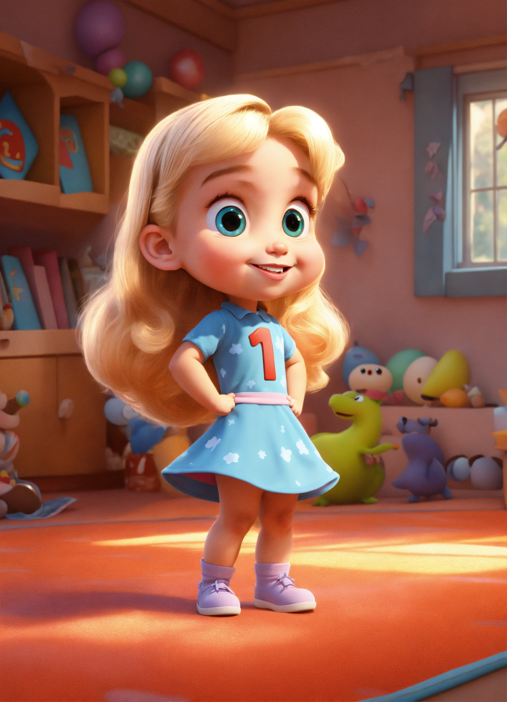 Blond shoulder length hair joyful little girl wearing an adorable dress handling shape of the number 1, cartoon style, well shaded, smooth, pixar