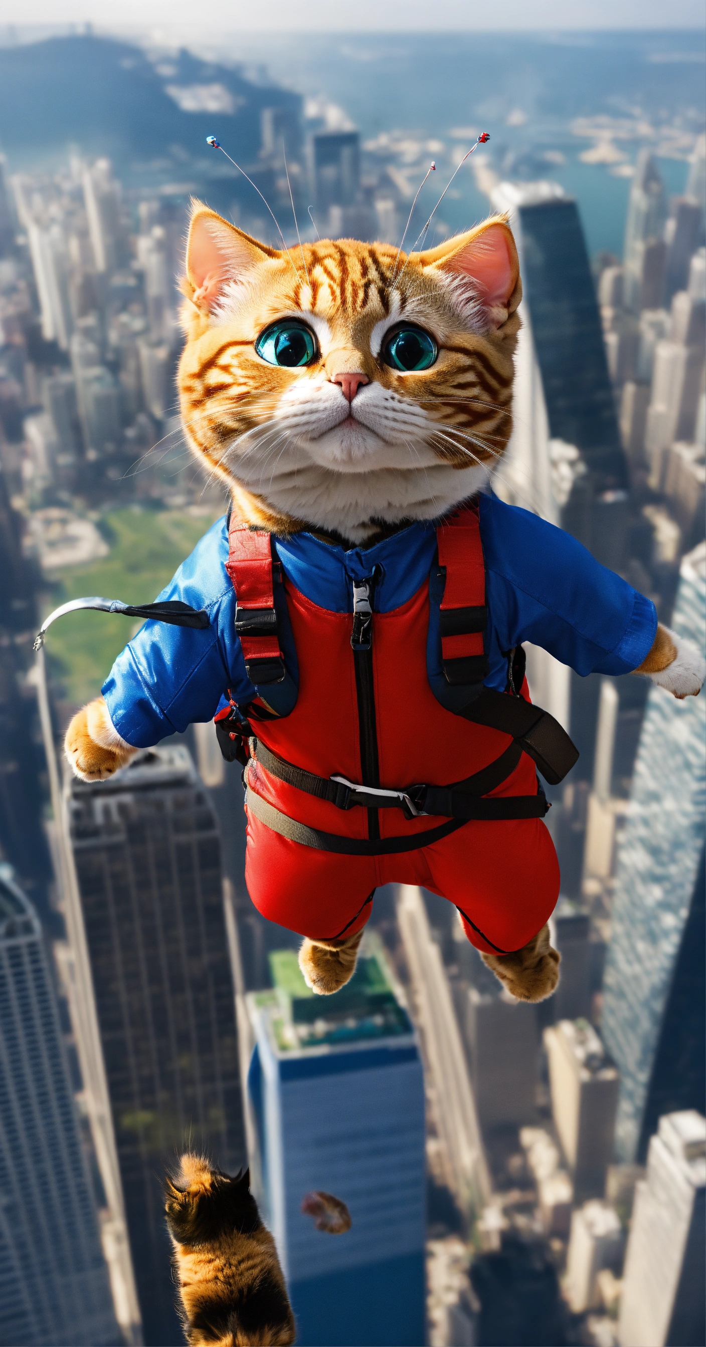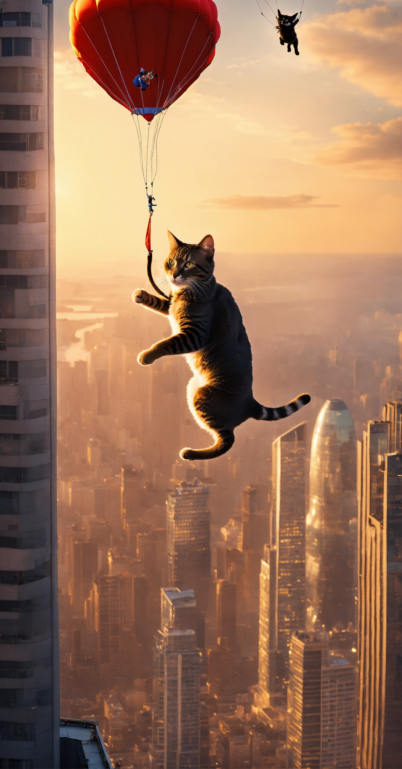 Create an image of a daredevil cat base jumping off a towering skyscraper, wearing a mini parachute and a fearless expression.