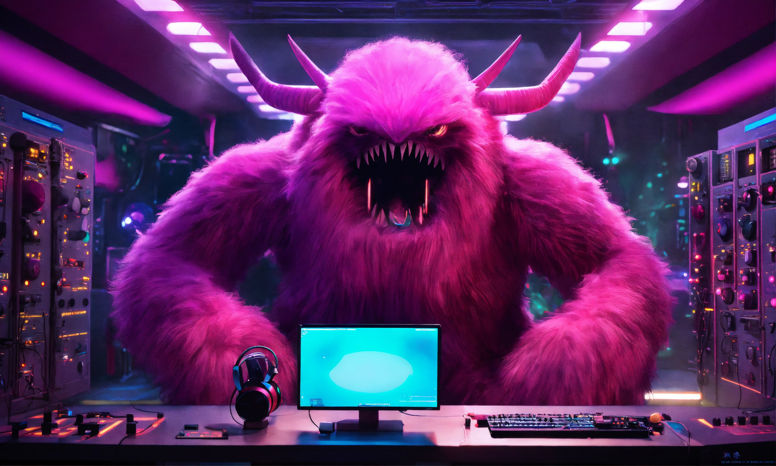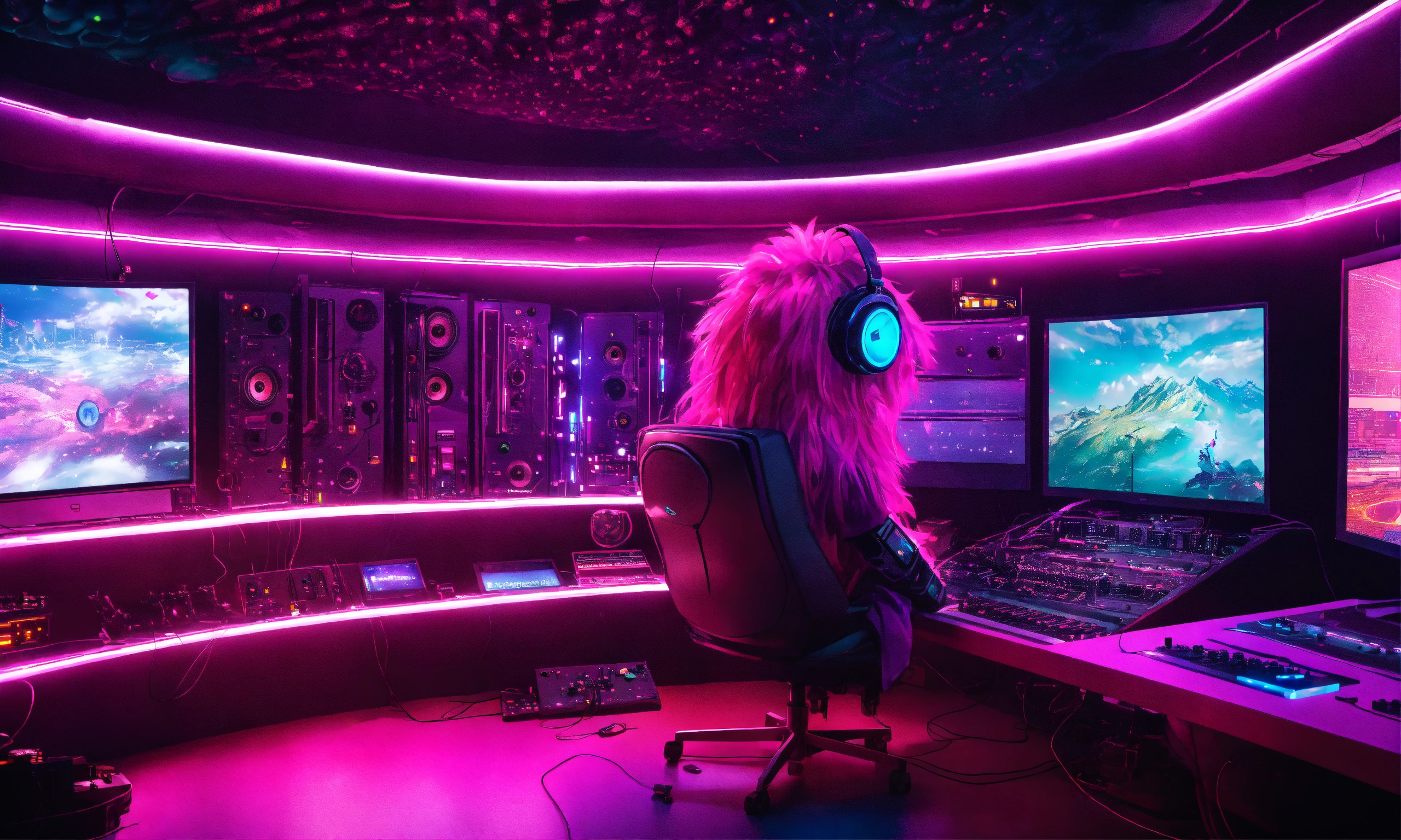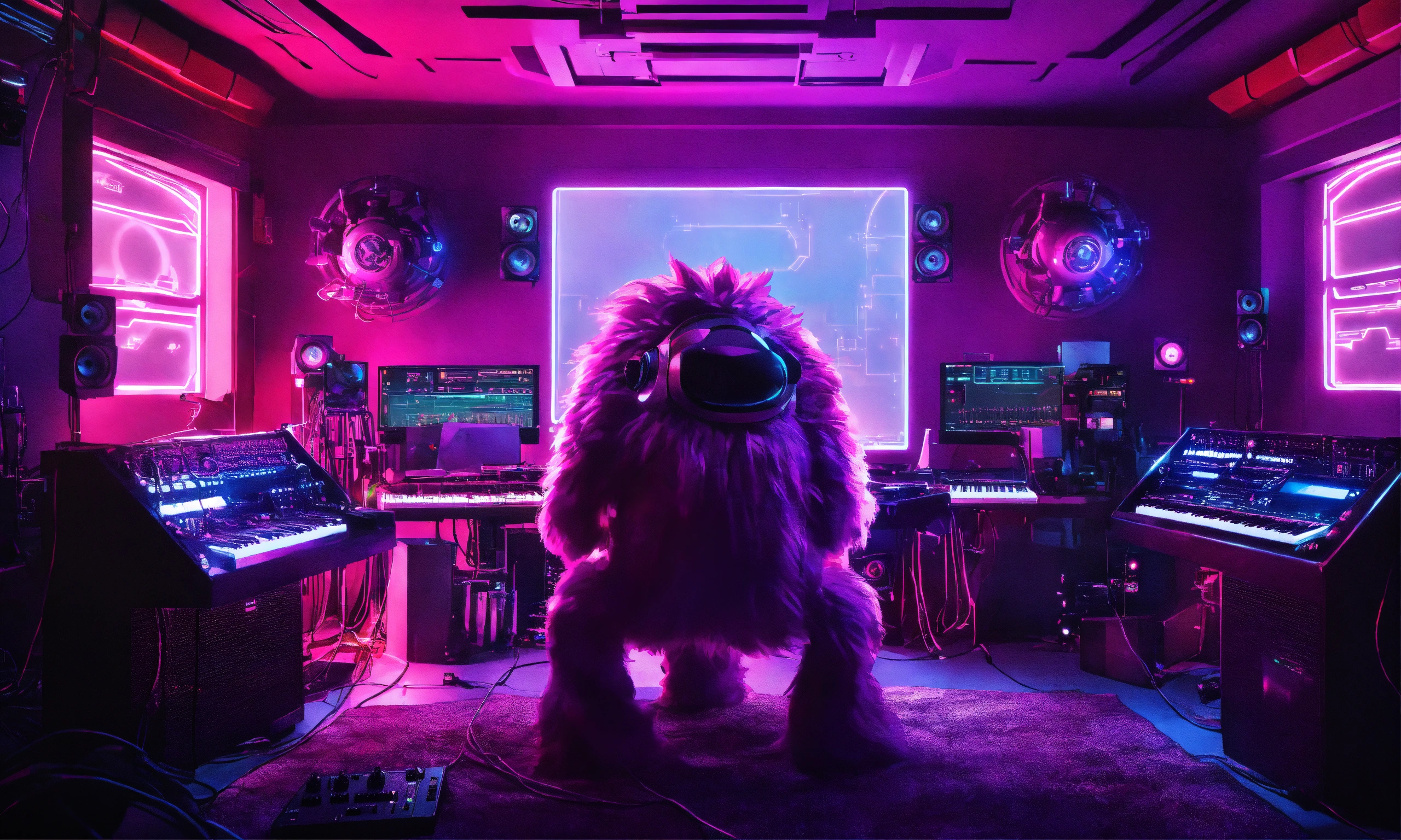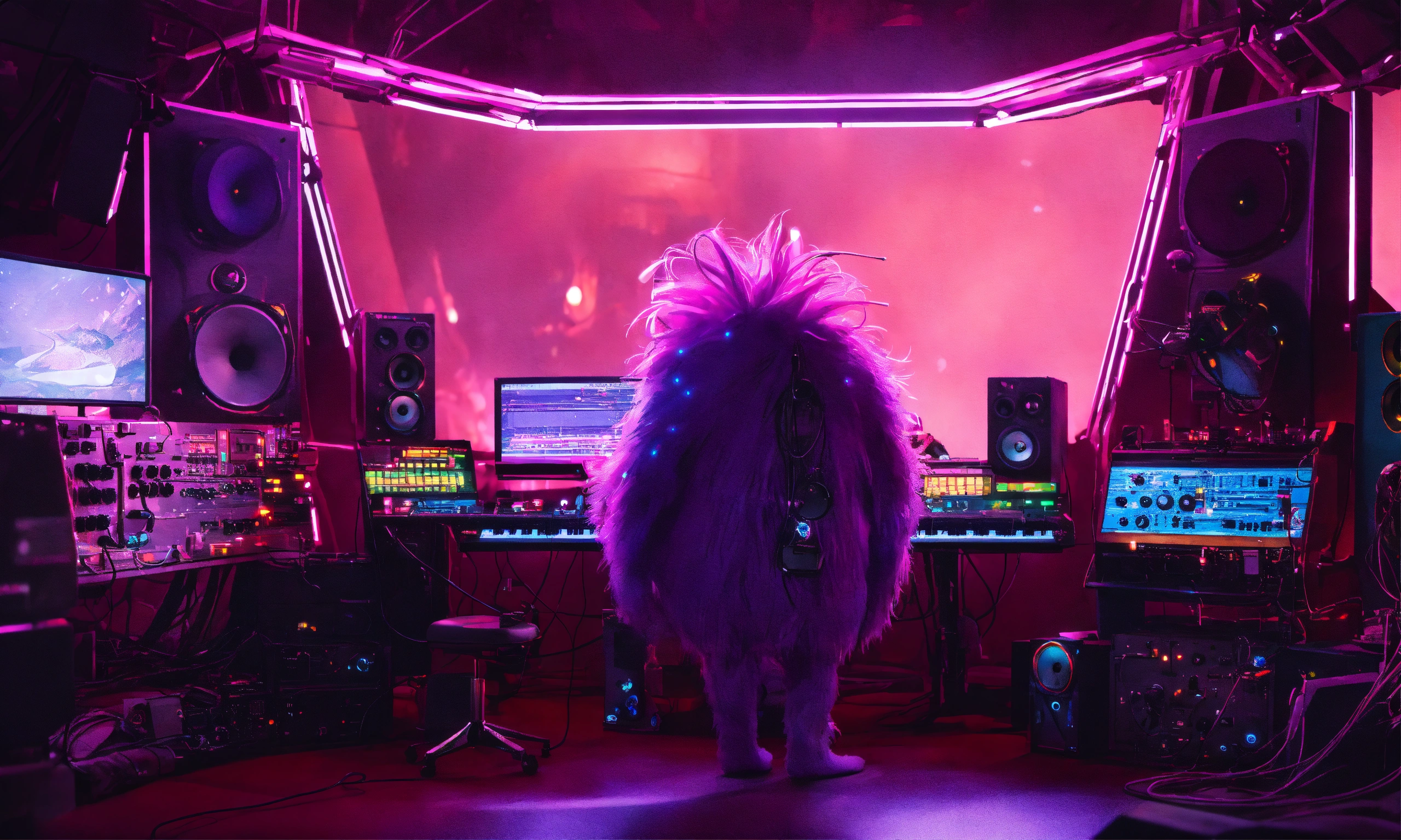 From inside a space ship the back view of an oversized huge hairy pink and purple grimace monster, wearing futuristic earphones with antenna, sitting at an alien analog synth ans musical workstation with high tech controls, knobs, and lighted buttons in a studio, hands on controls. there is a boxy silver square friendly robot hovering next to him, pixar, realistic, giant tron illuminated speakers. the room is a mess of wires and cables, fantasy, 3d