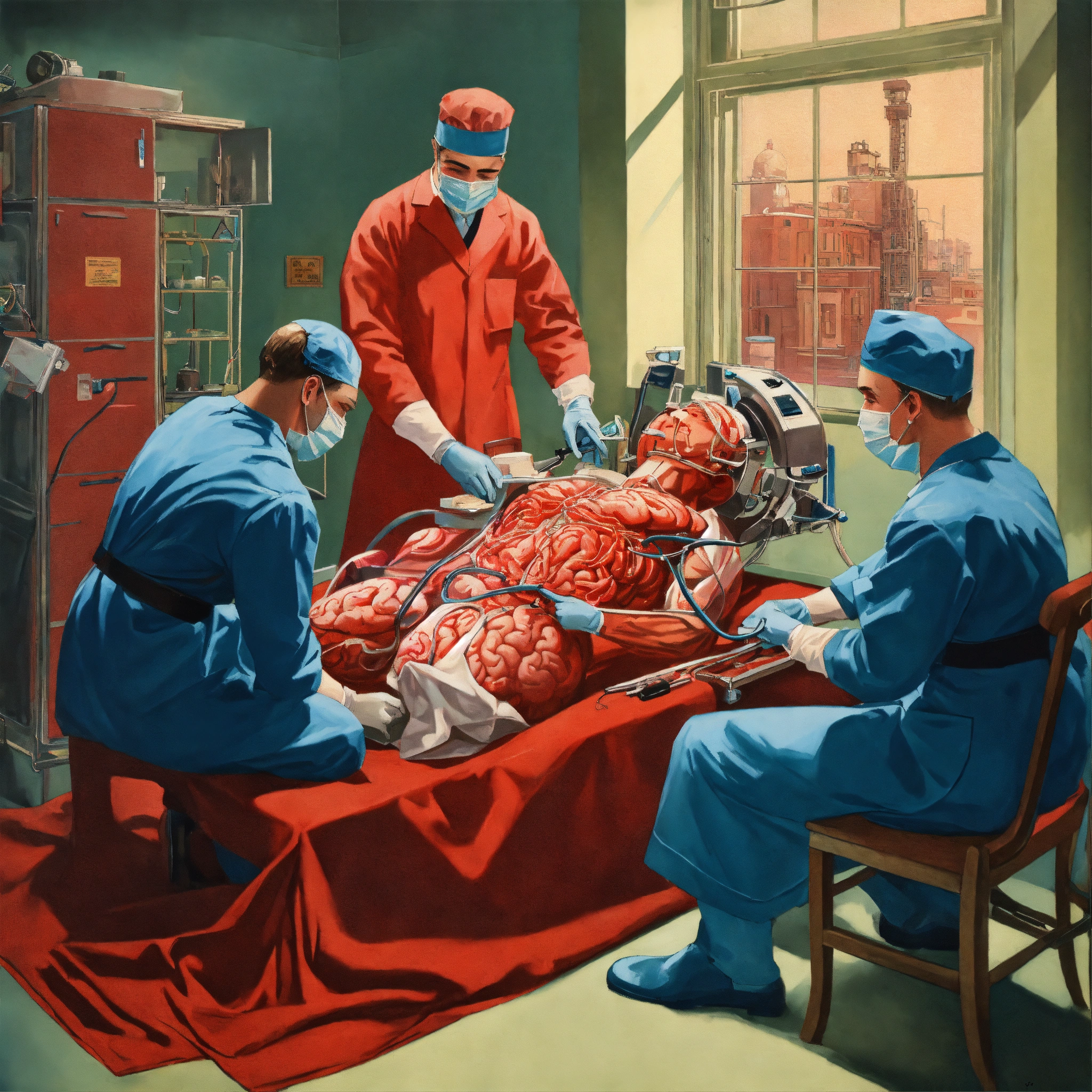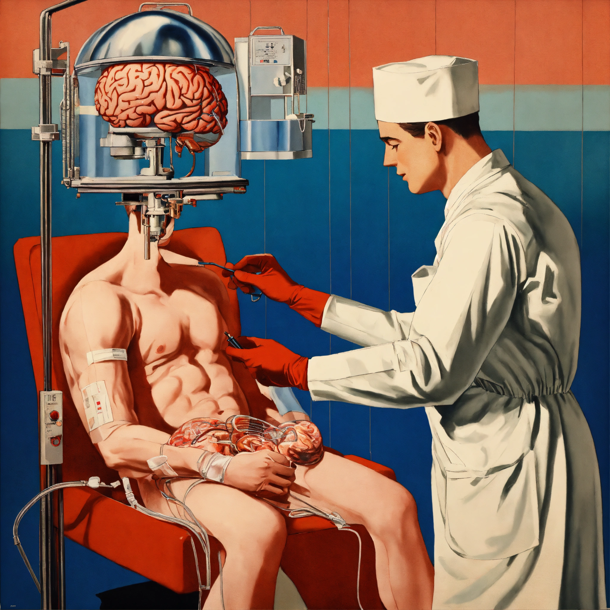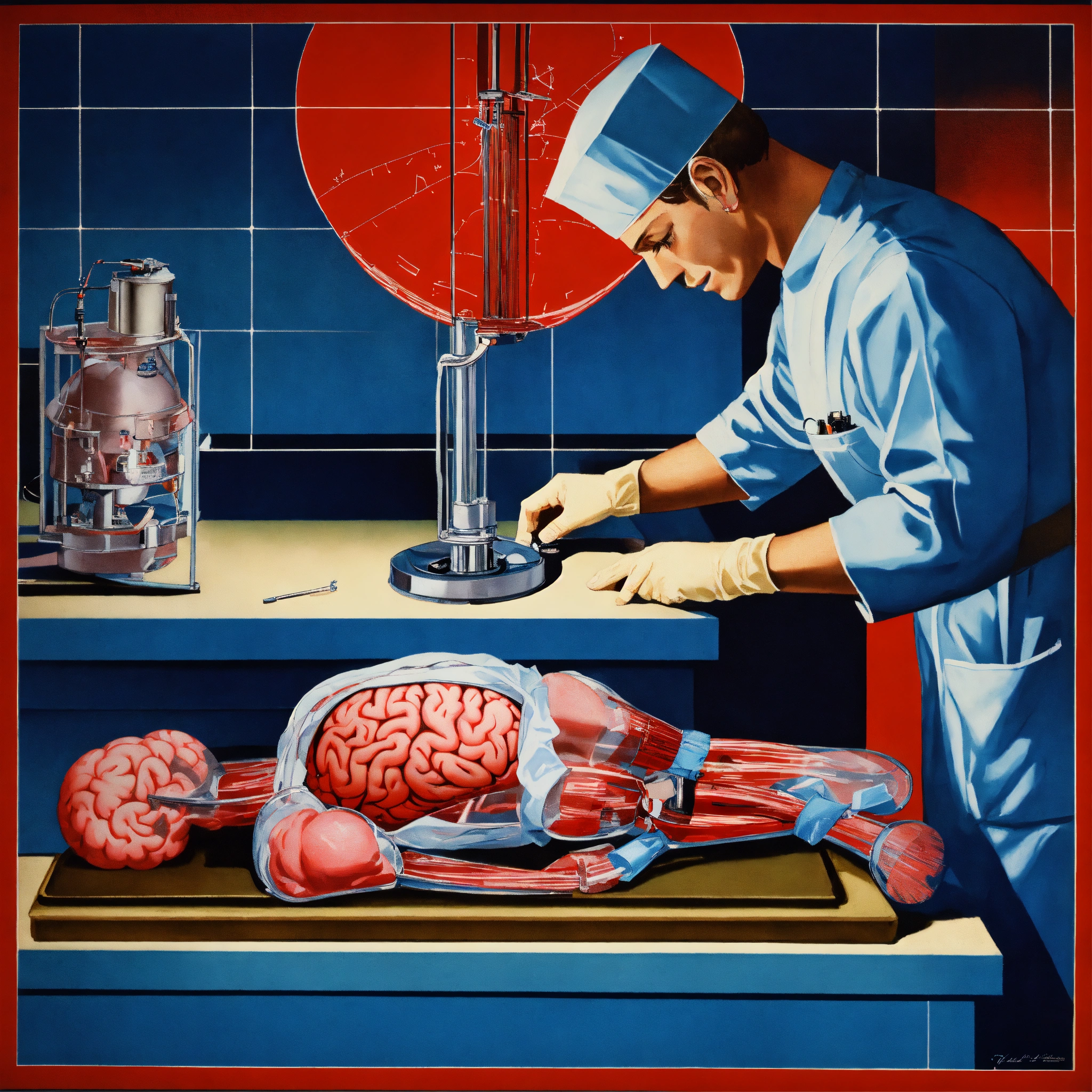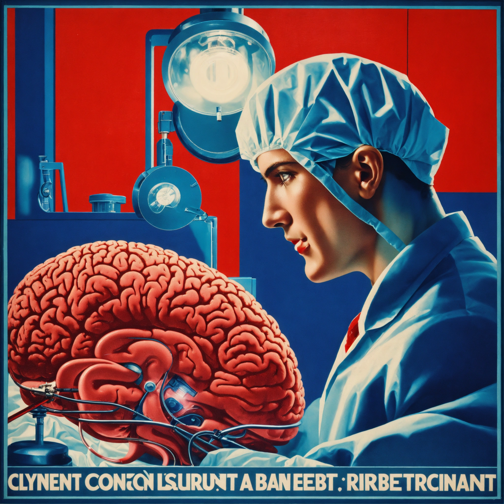 1930s poster of a surgeon performing a brain transplant, highly detailed, red and blue color scheme, masterpiece