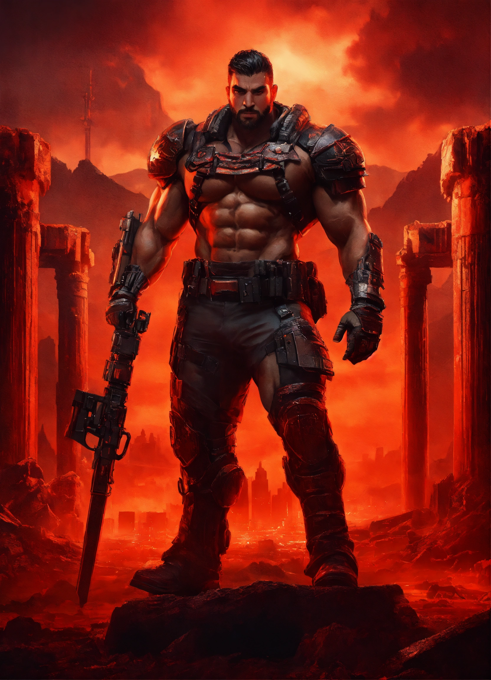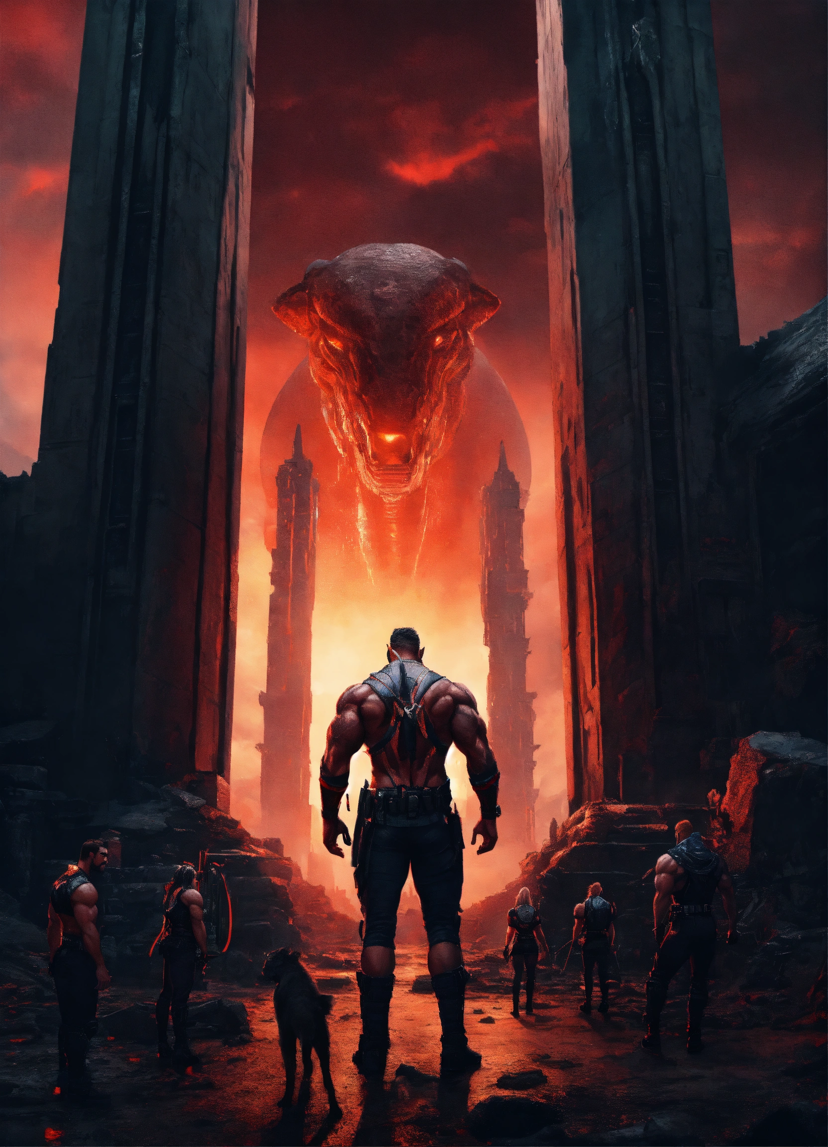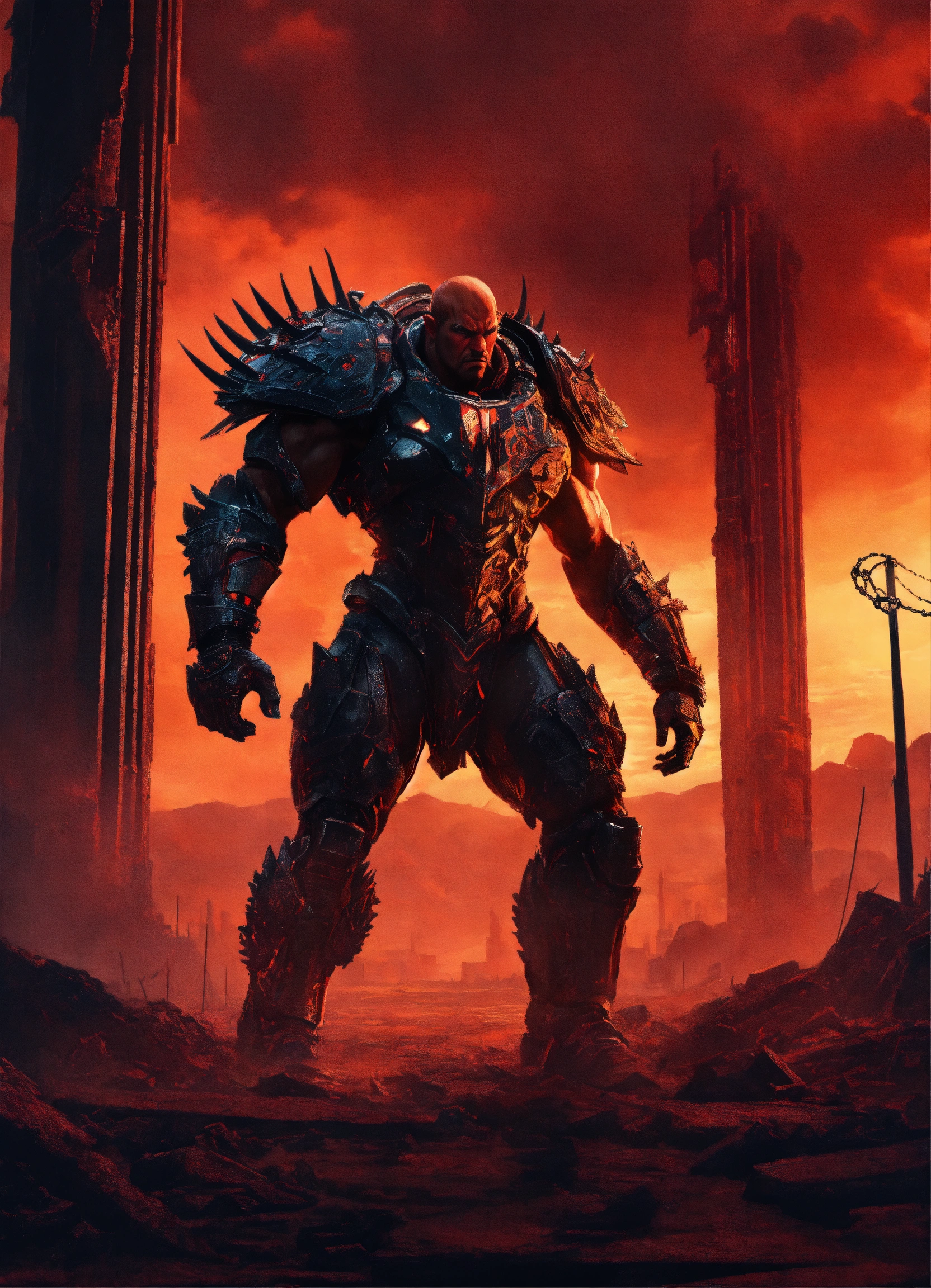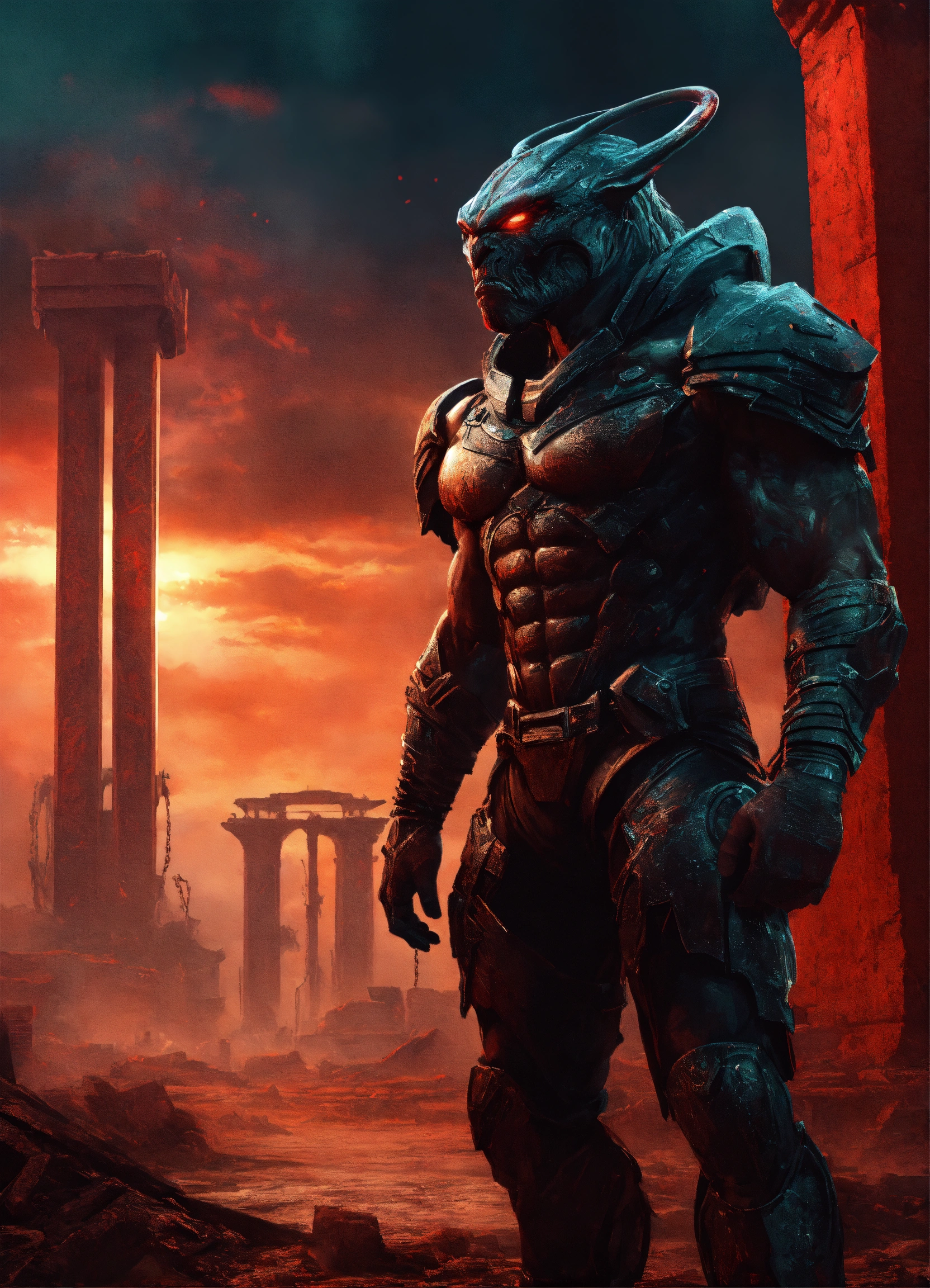 Huge strong monstrous prison guard, front facing in an alien city arena, front facing huge muscular man-beast with tusks and alien futuristic armor, very muscular front facing, with male and female prisoners chained to pillars behind him throughout the of an ruins of an alien city and a violent red sky behind him, fantasy, high detail, realistic photo, high detail, digital painting, cinematic, stunning, hyper-realistic, sharp focus, high resolution 8k, insanely detailed