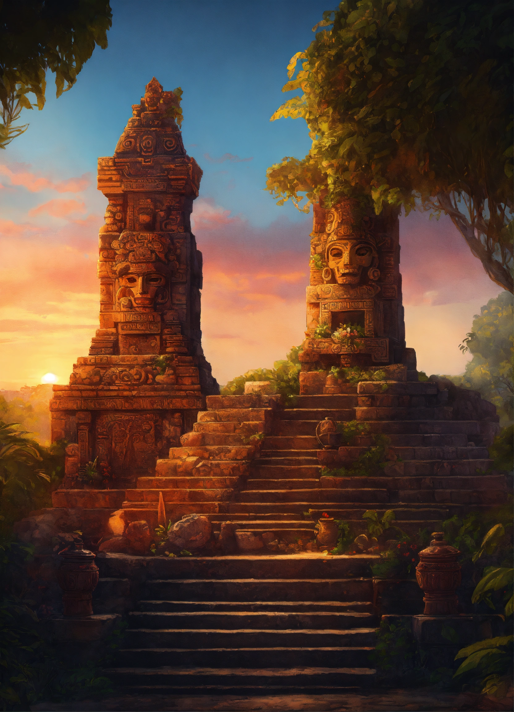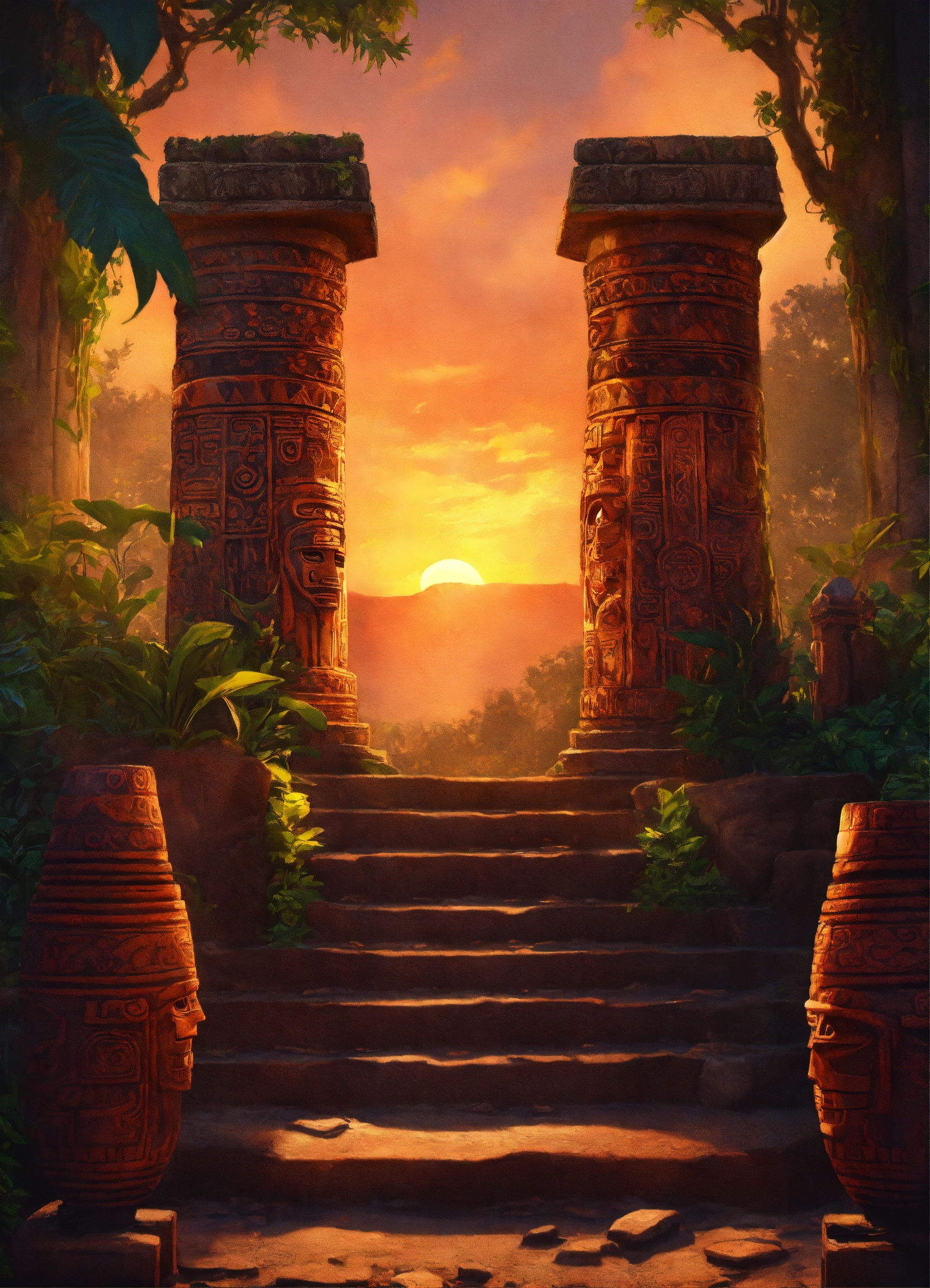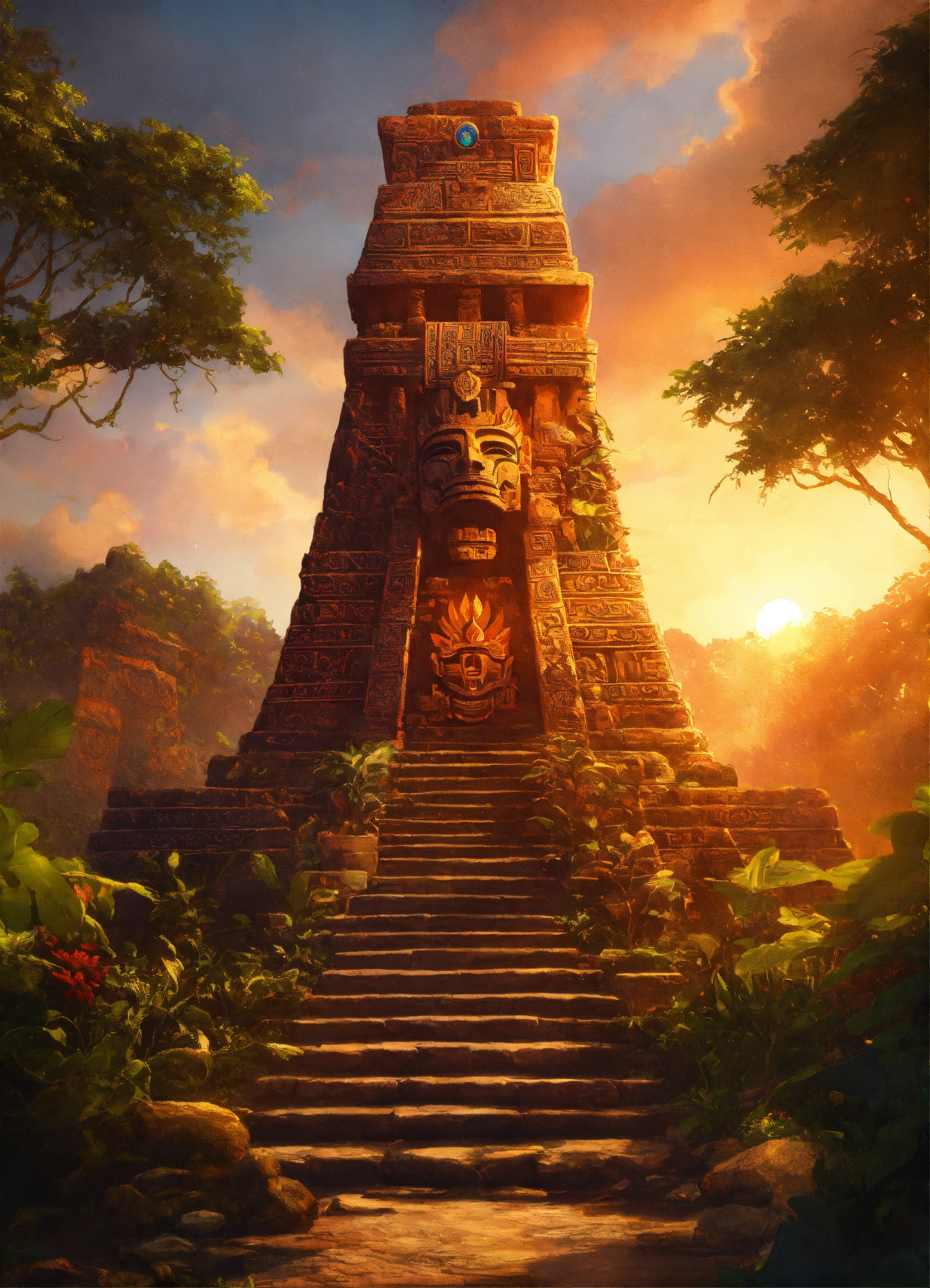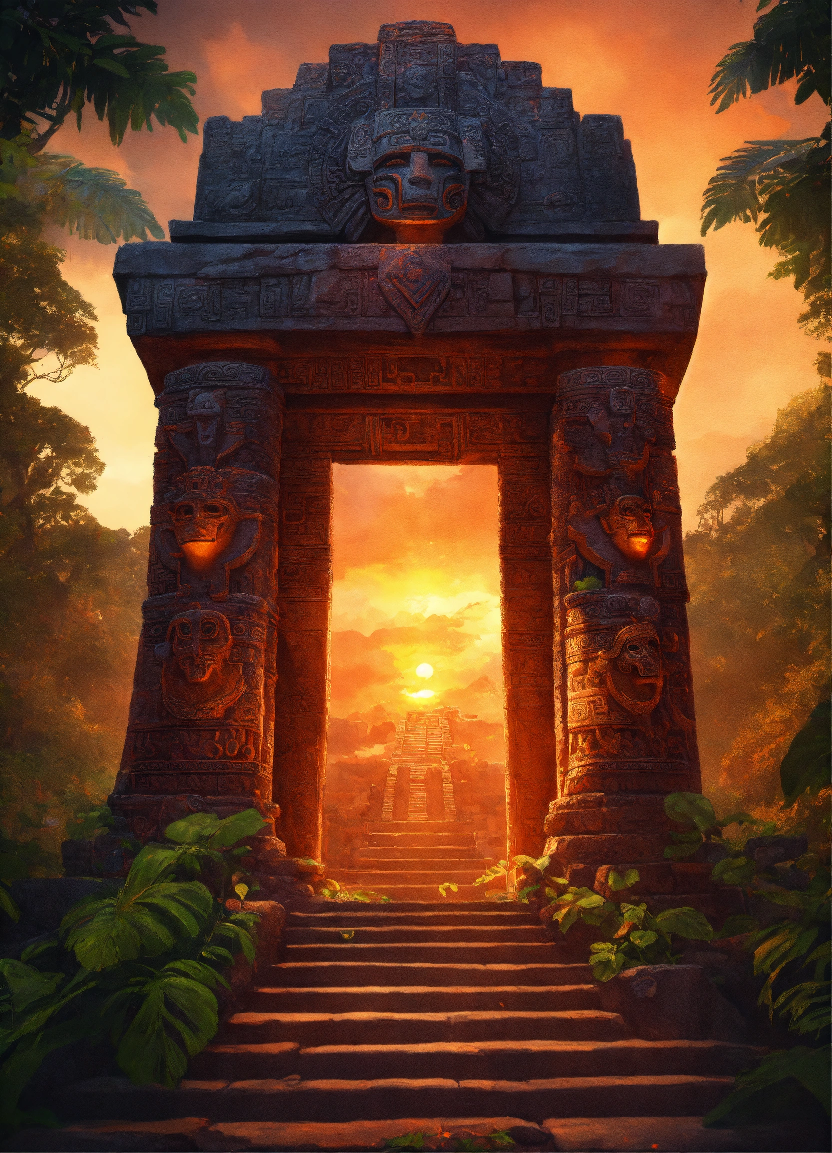 Mayan stone tomb, digital painting, artstation, cg art, elegant, highly detailed, sharp focus, virtual painted, cups with fire, high contrast, aztec mask, column, jungle, stone tomb, stone statues, sunset, vines, warm colors, on a hill, symmetry