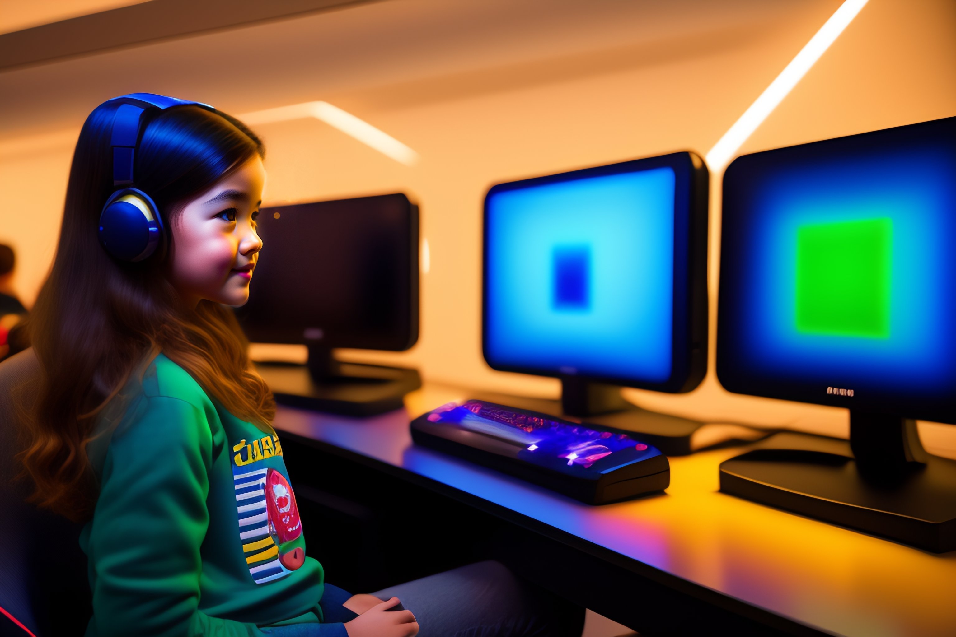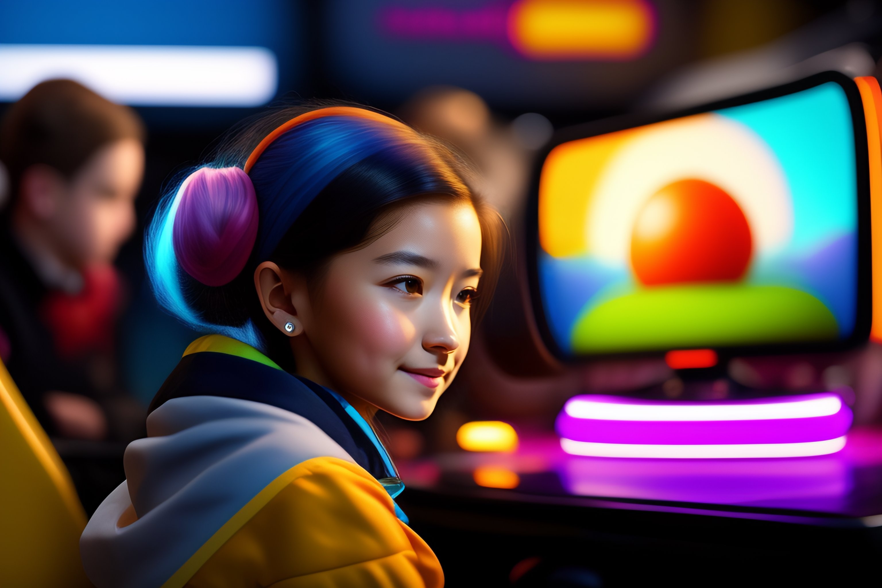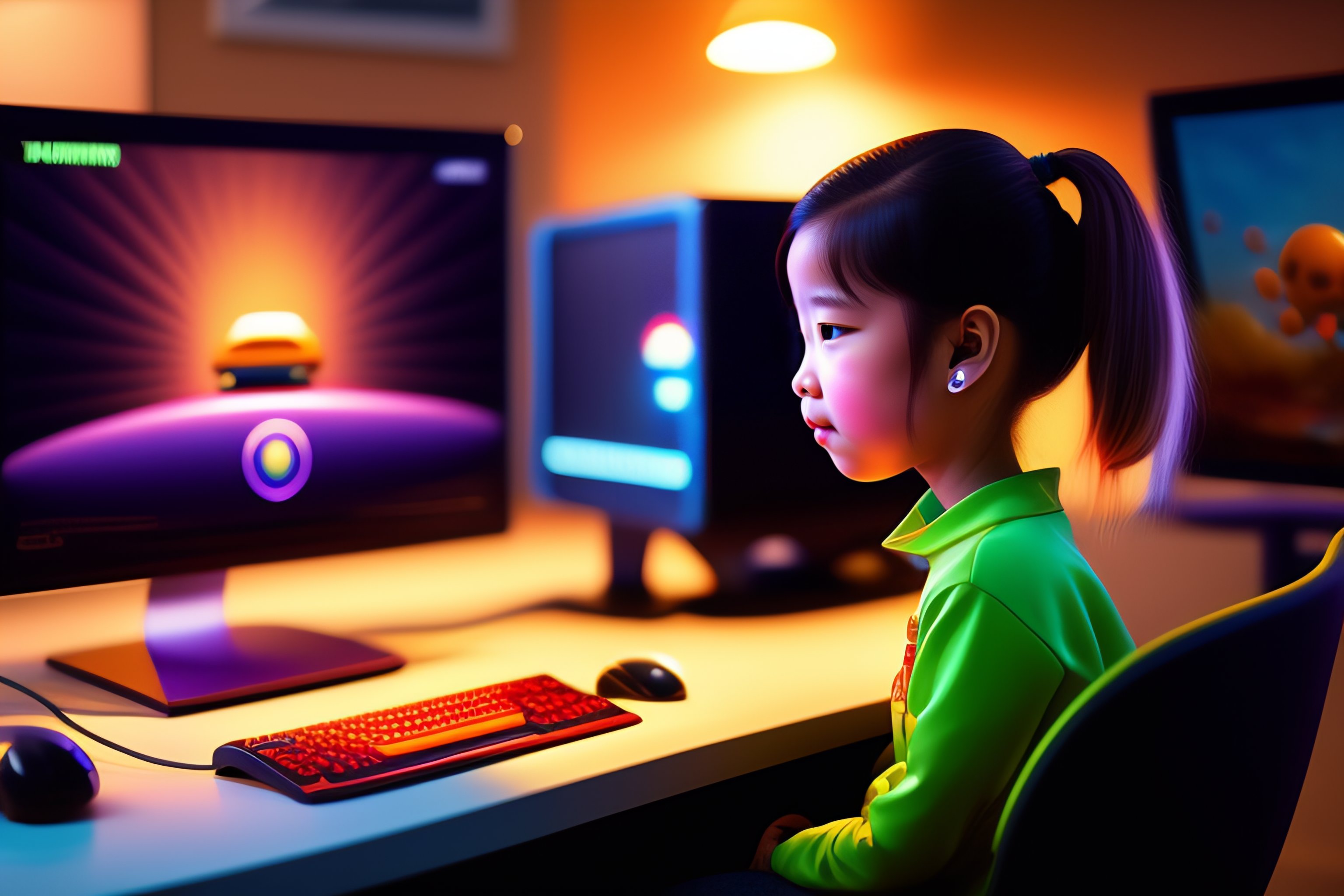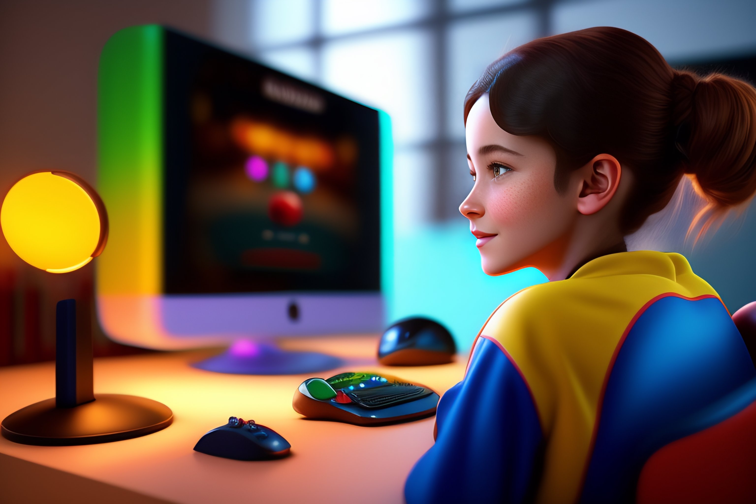 Bright pixar art girl playing computer games, where the characters of the game come out of the computer screen