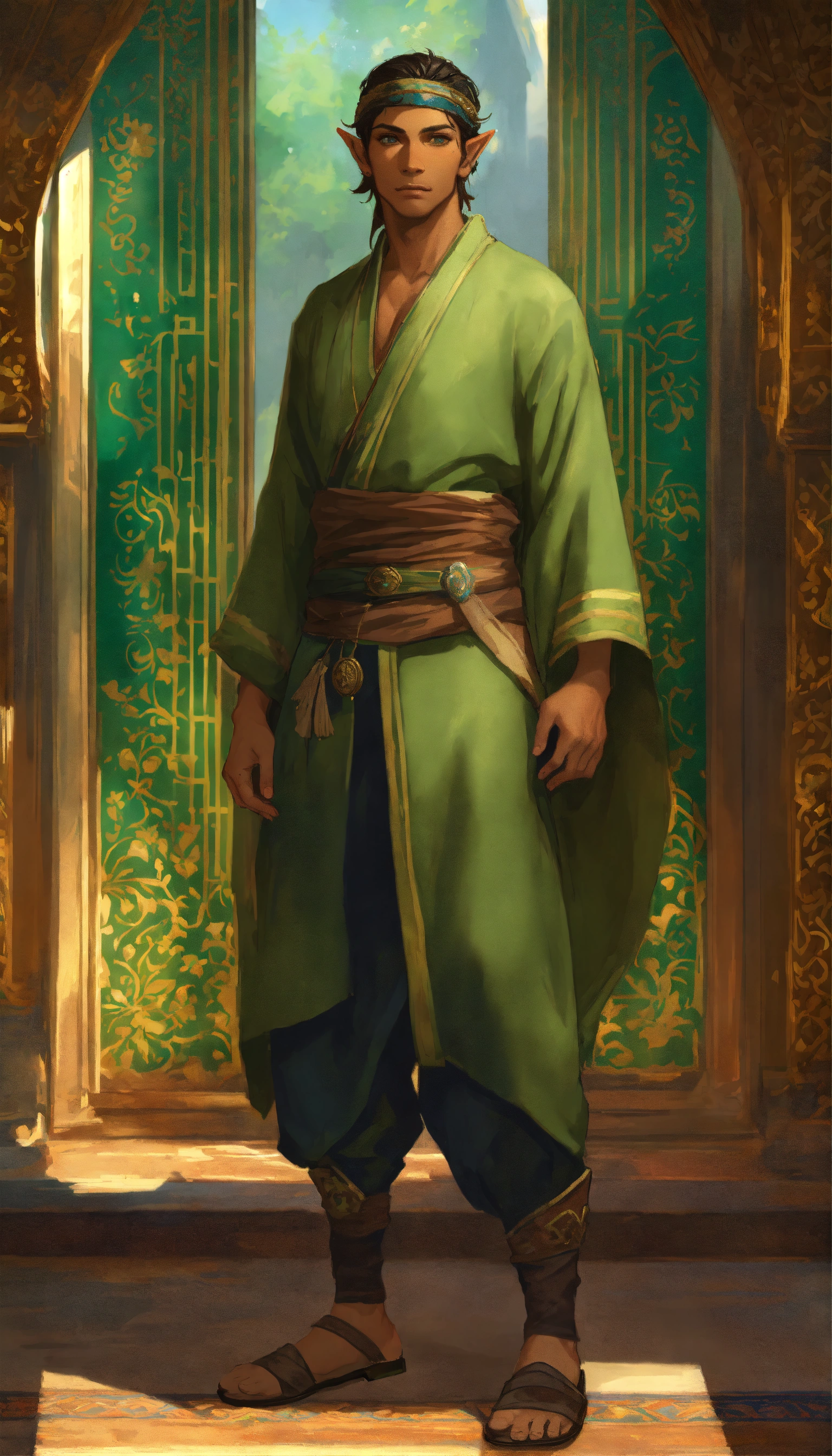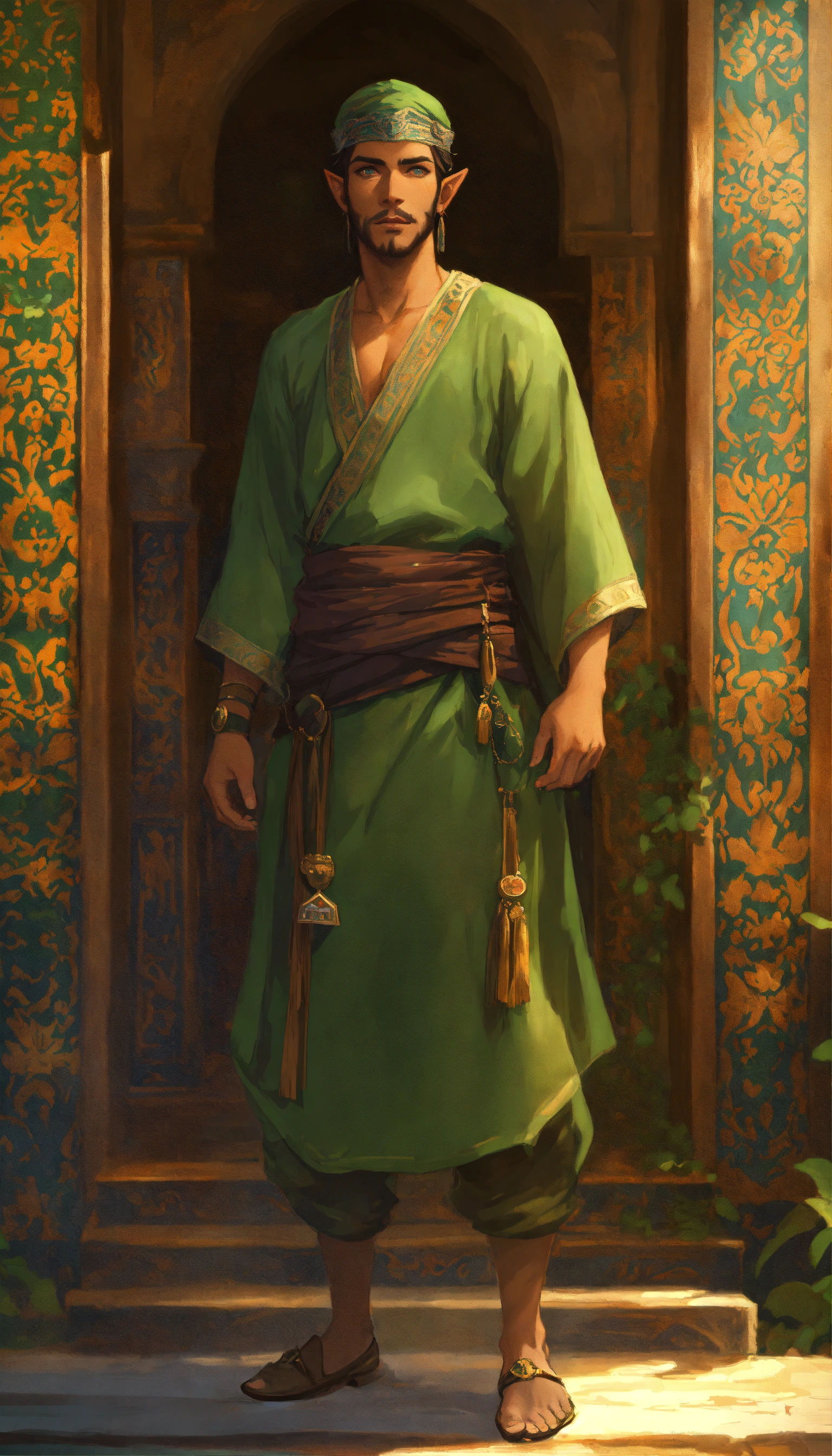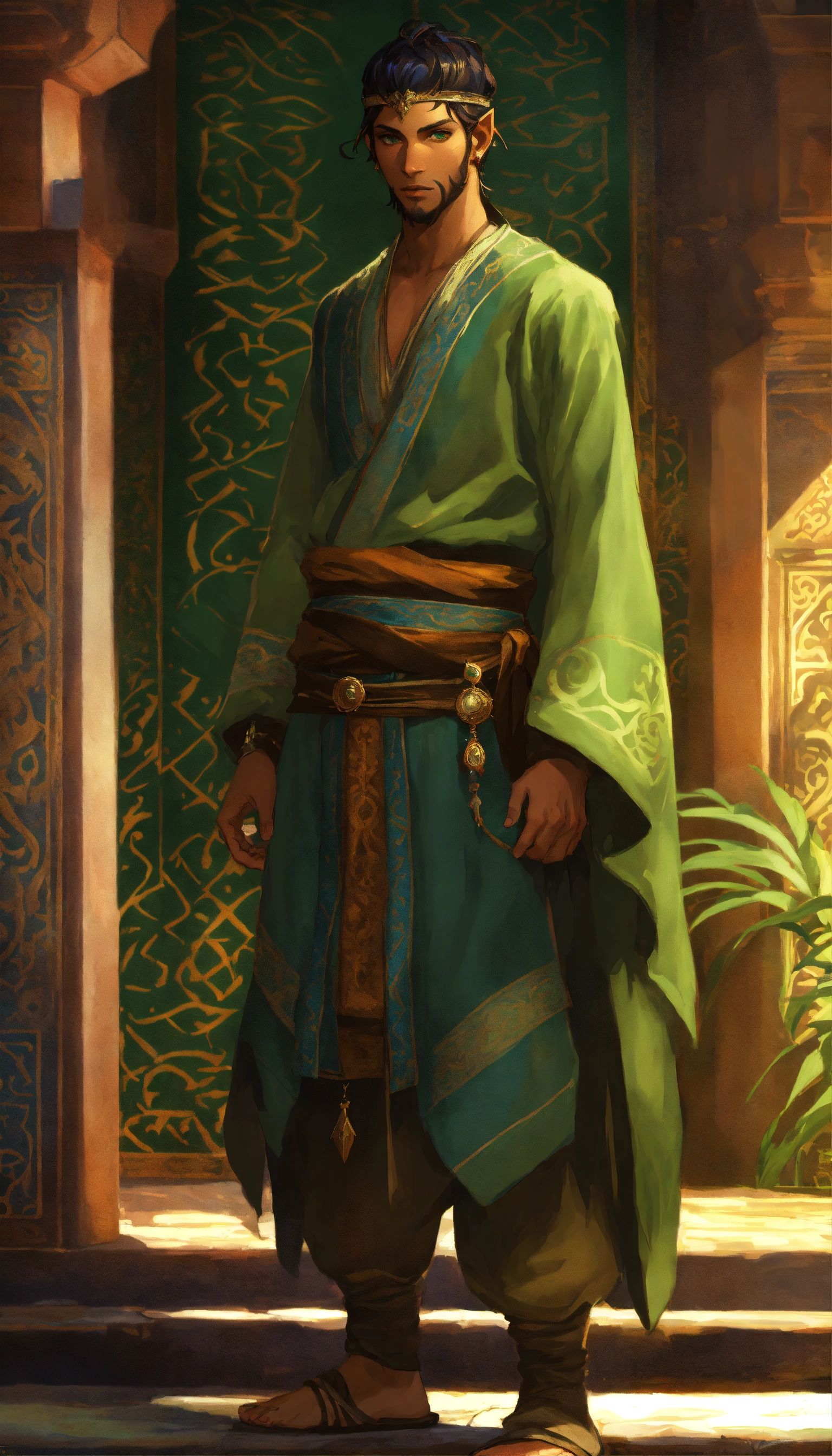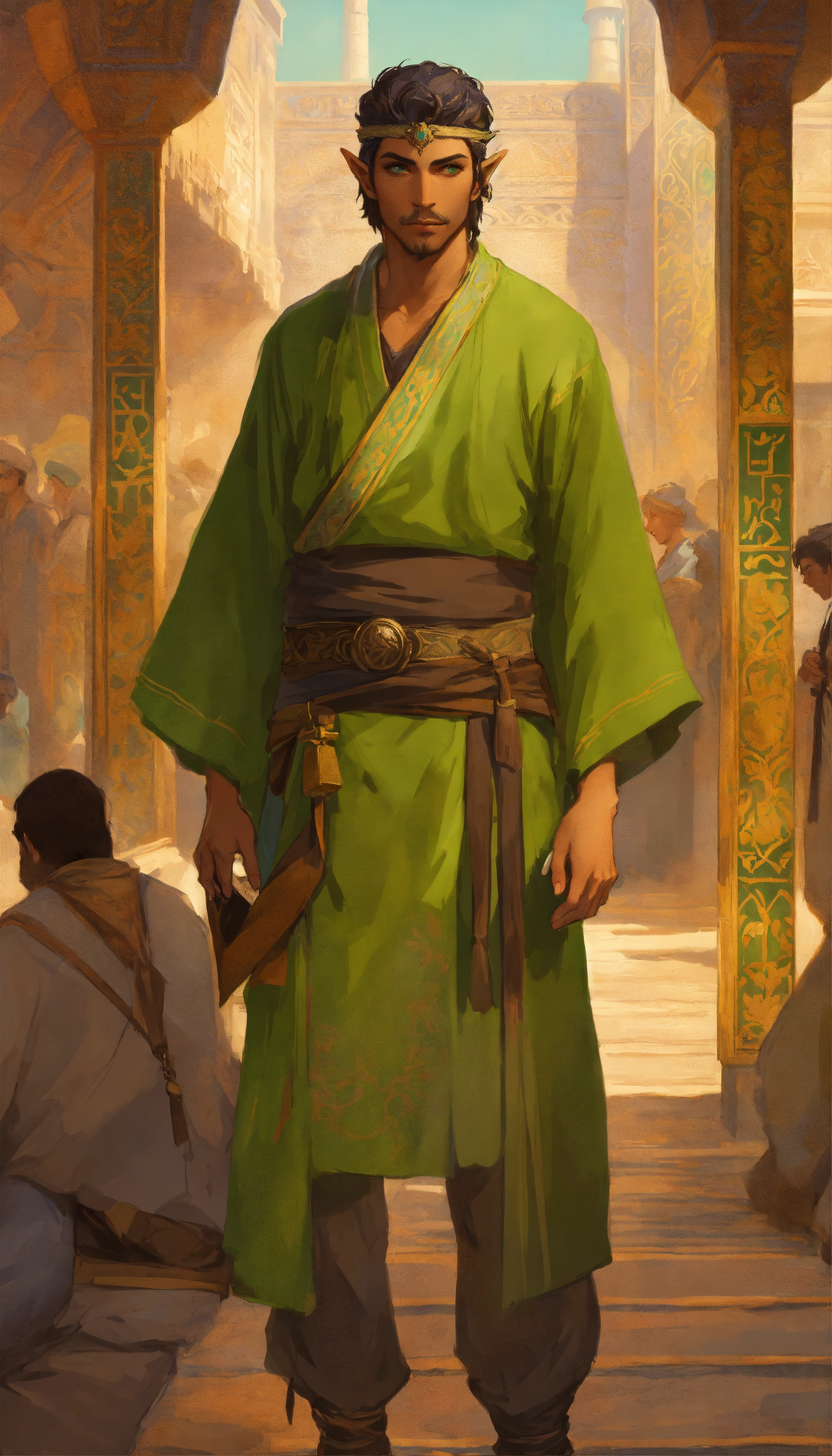 Male merchant elf based on timurid man, turkish, green eyes, tan skin, dark, high cheekbones, background samarkand, greg rutkowski, makoto shinkai, alphonse mucha, stylized, full body
