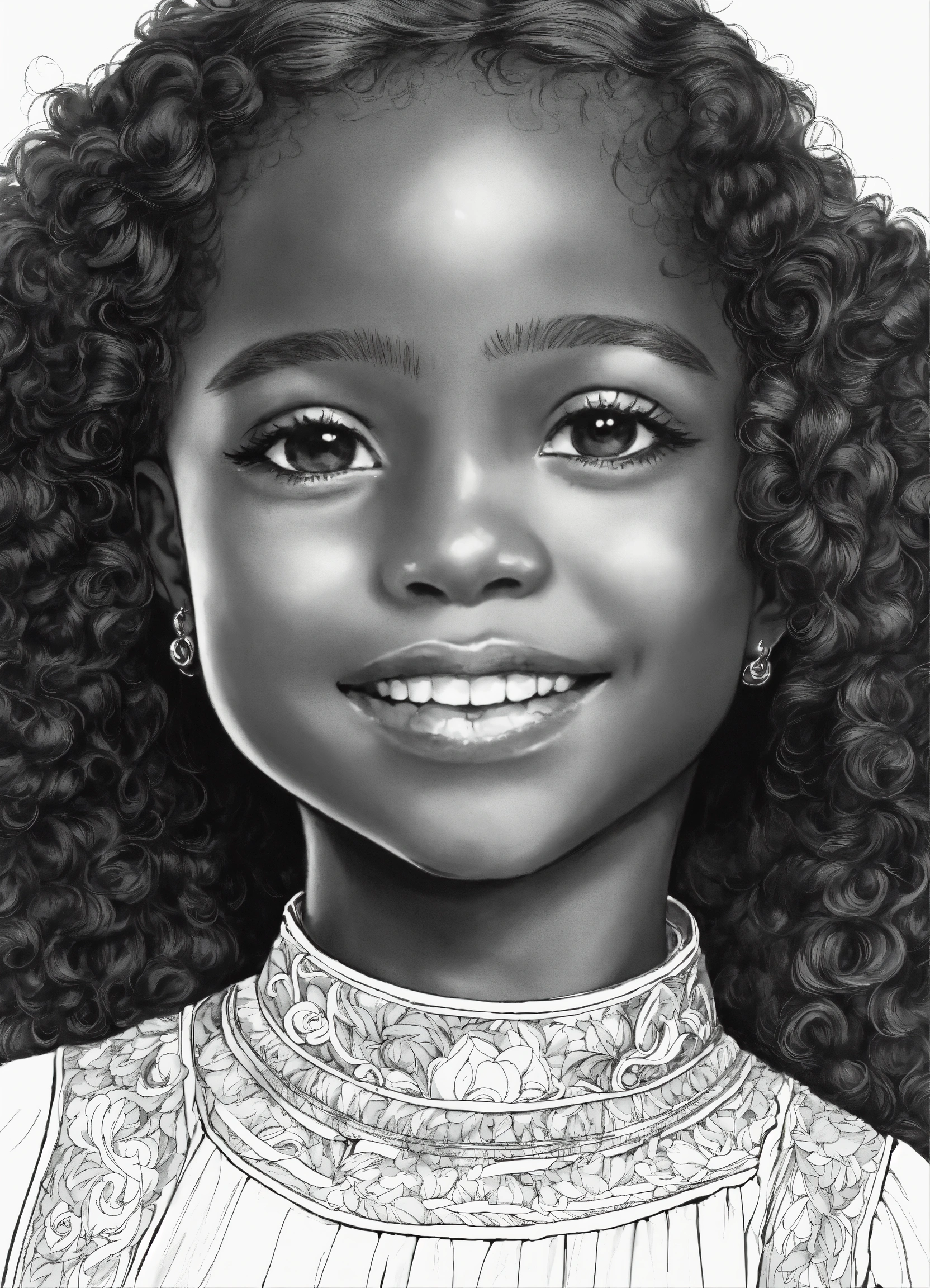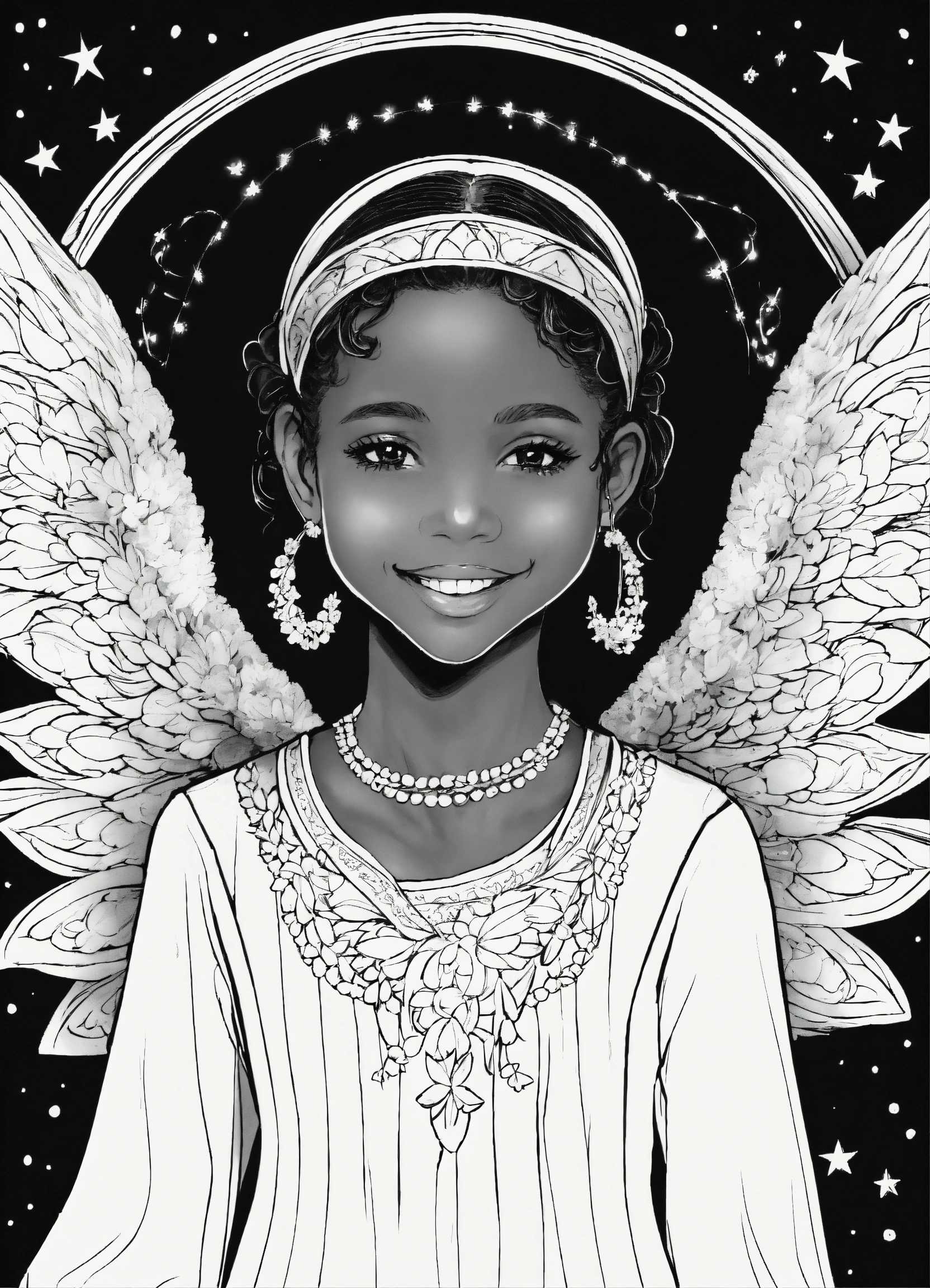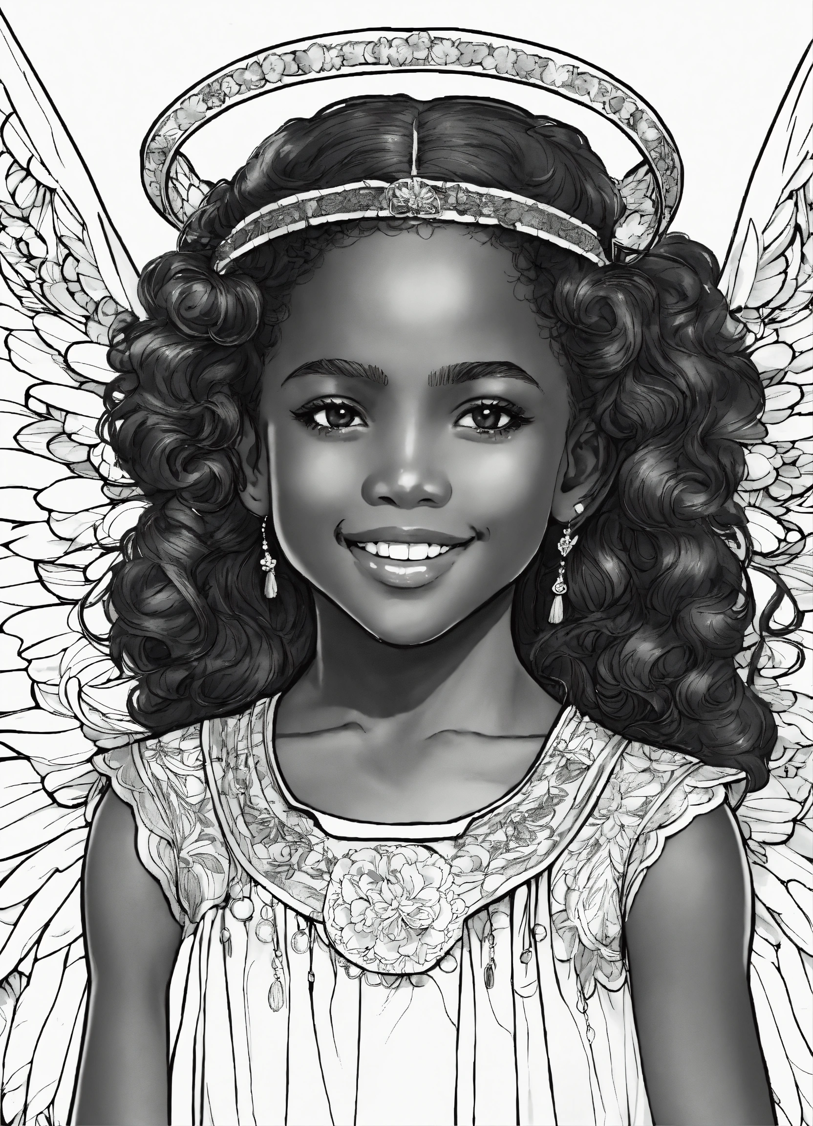 Black and white coloring page of closeup of dark skinned young girl dressed in angelic attire with opaque top and flowing with angelic smile