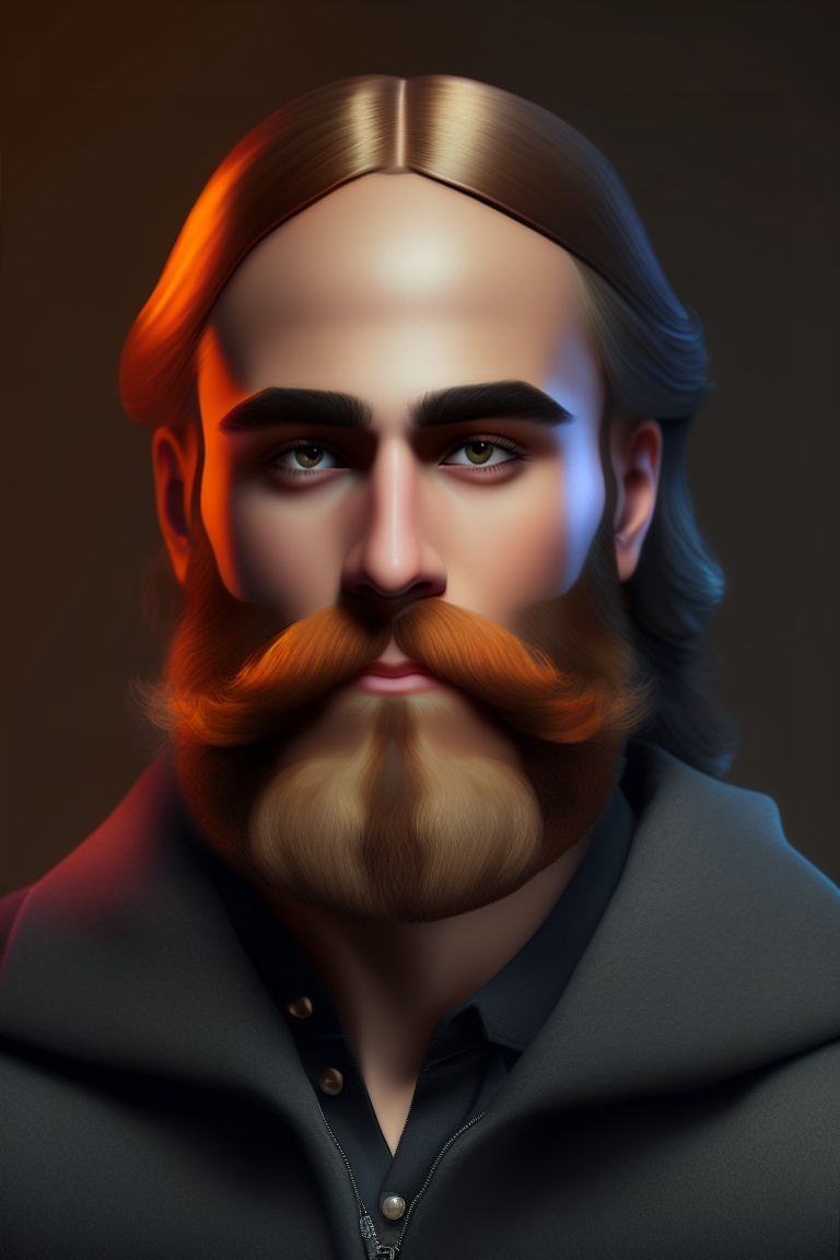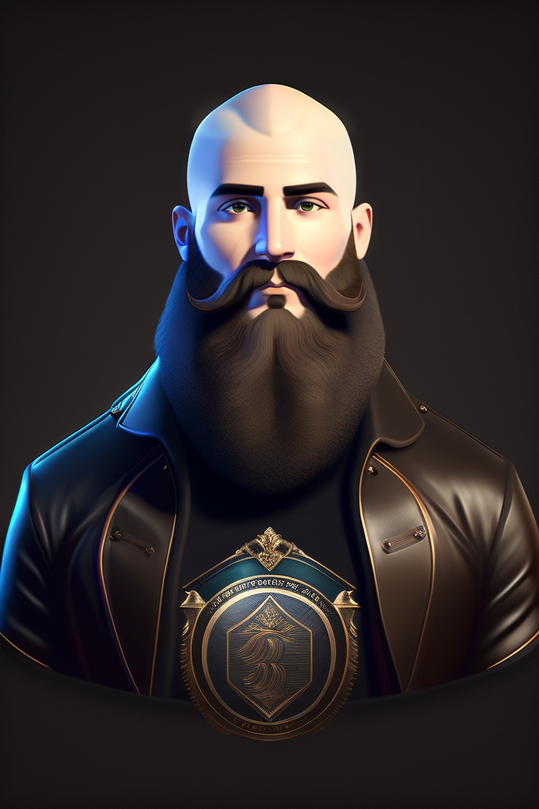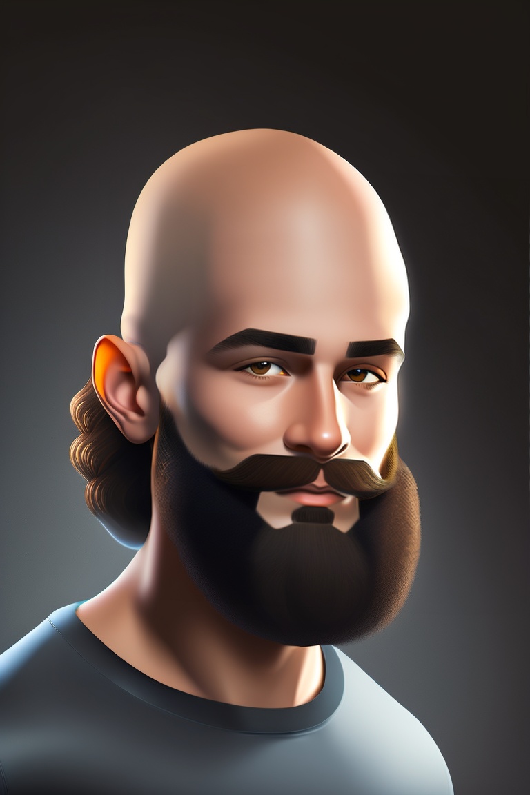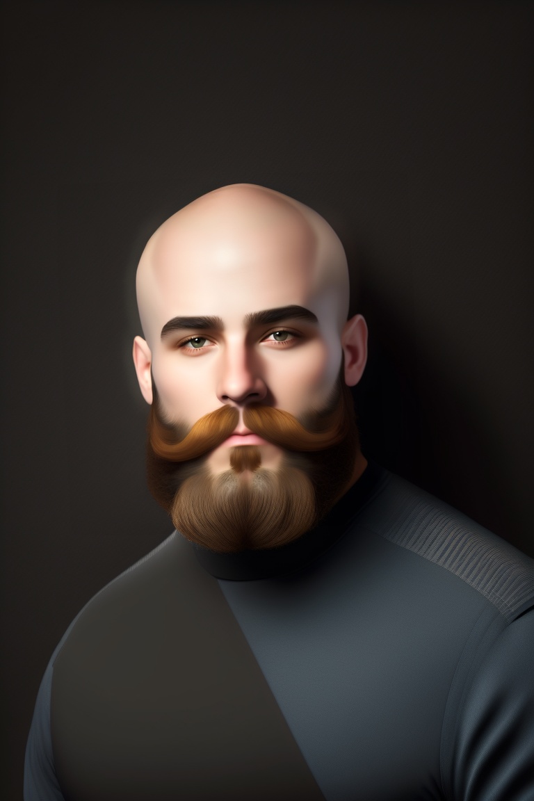 Boy motivational, bald head, big mustache, french beared, long hair, positivity, black background dark, front view