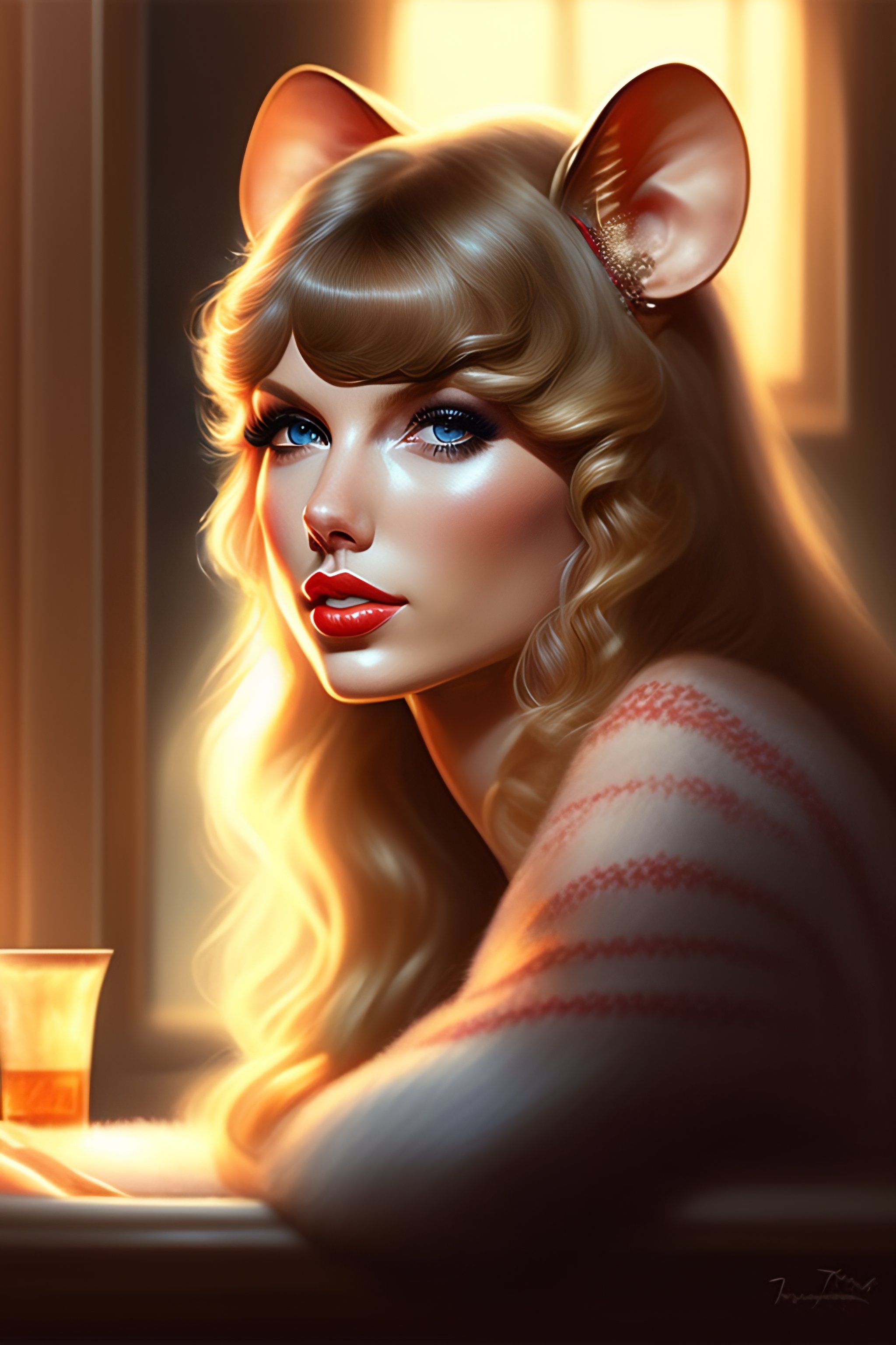 Taylor swift is just a cute little mouse, just a cute little thing, taylor swift face, mouse body, blush, high focus, wood paneling, warm lighting, by artgerm and greg rutkowski, deviantart, sitting by a small hole in the wall