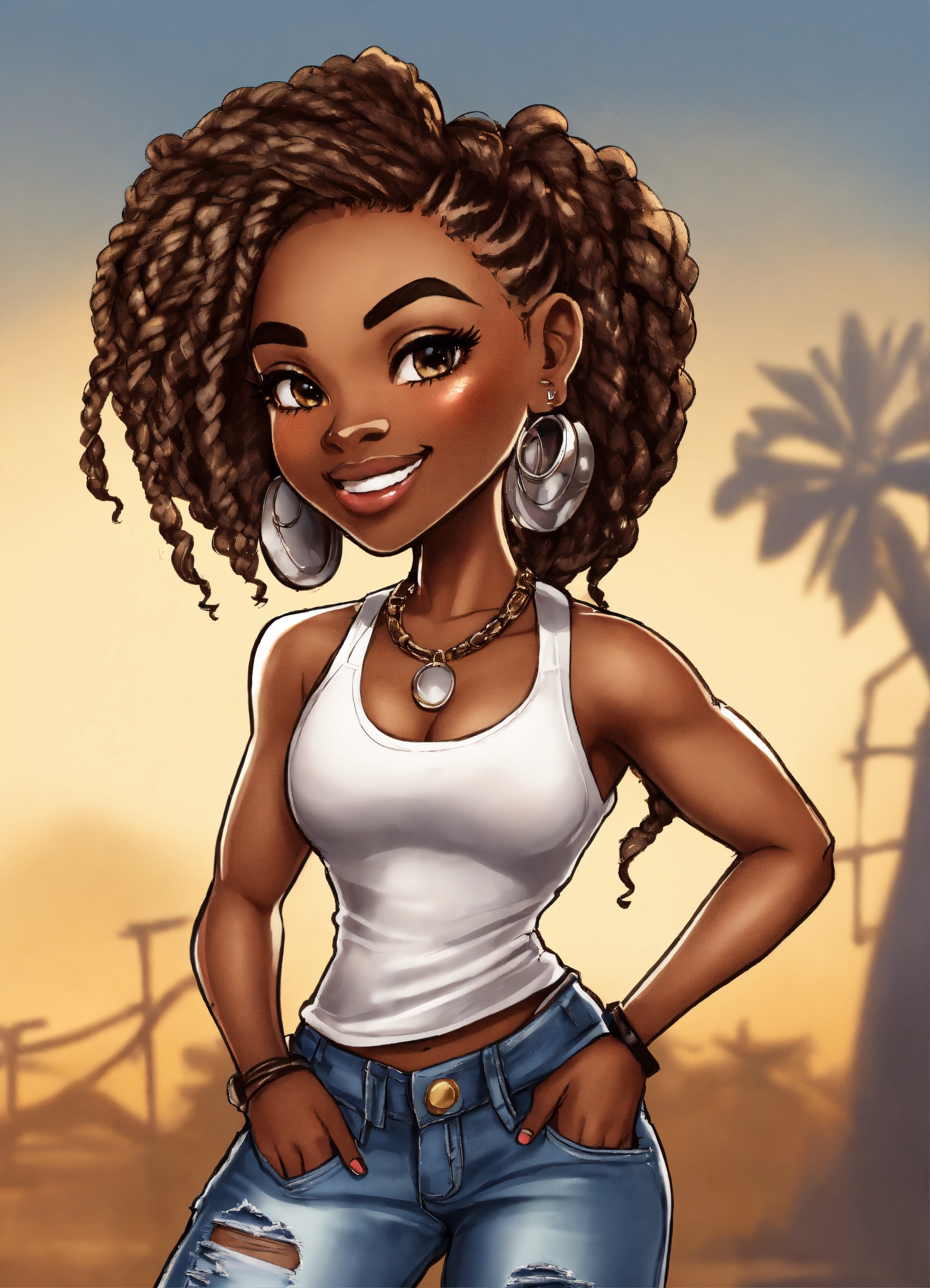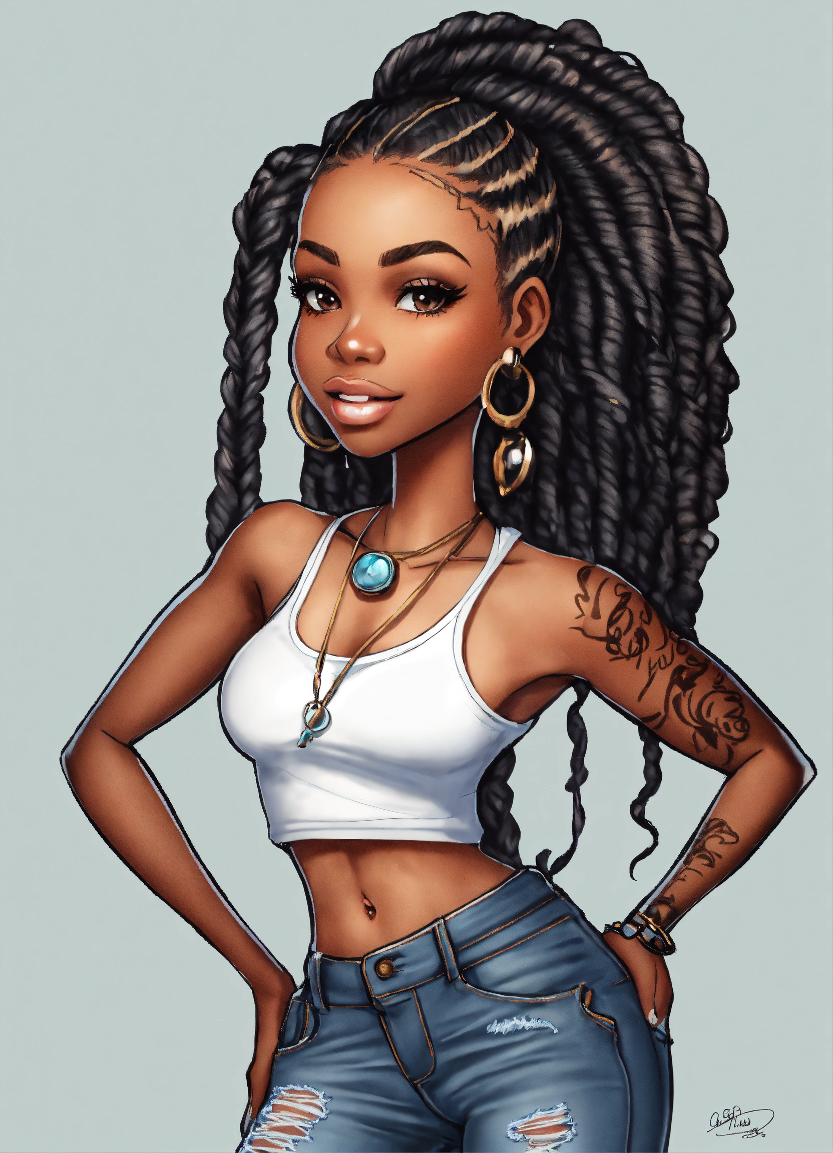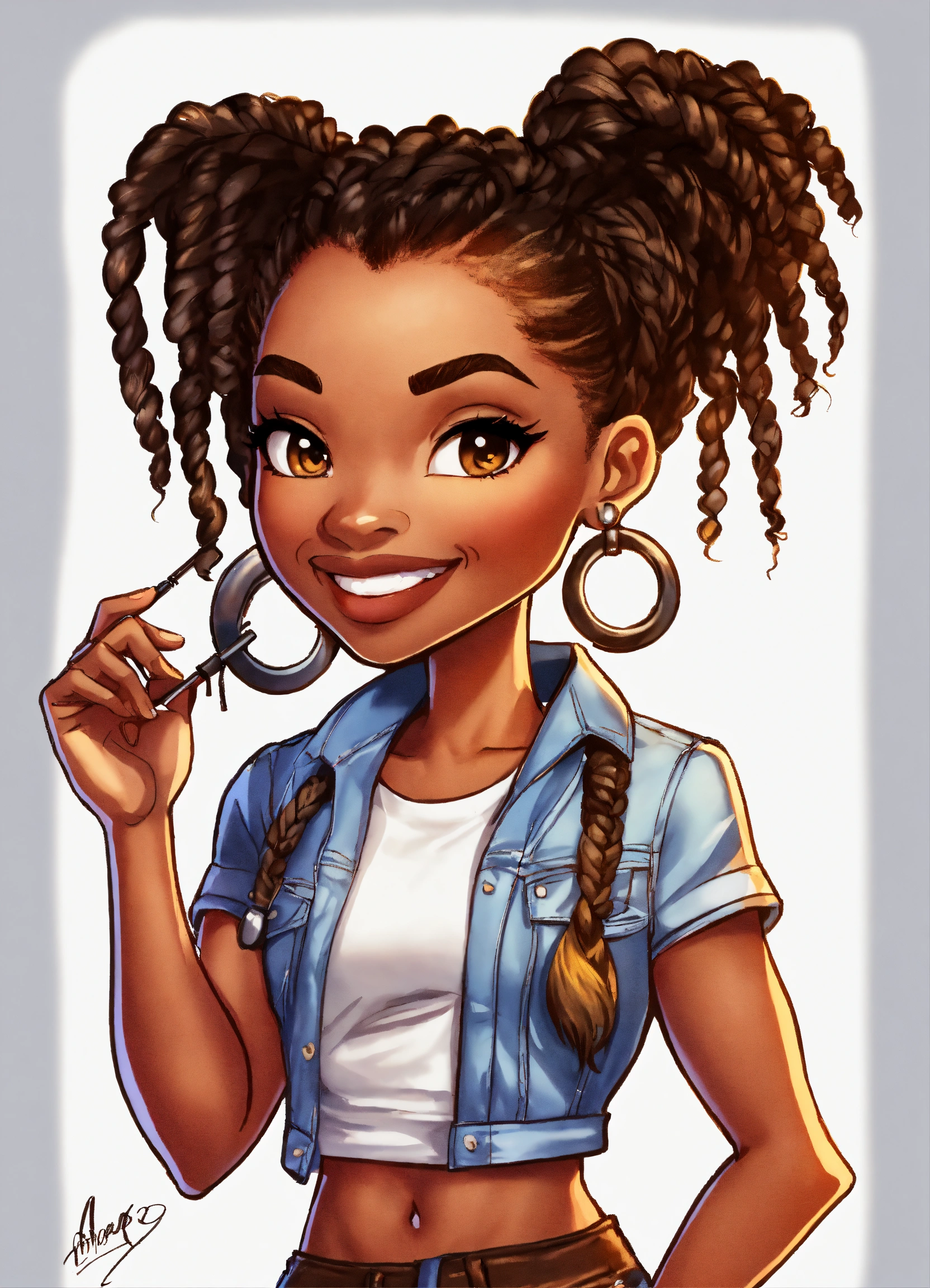 An airbrush cartoon chibi illustration of an african american woman, standing and looking over her shoulder playfully, 8x11 aspect ratio. she's dressed in ripped skinny jeans and a stylish crop top. her hair is styled in senegalese twists. bright white background. ("drawn with") airbrush techniques, fine detailing, chibi proportions."