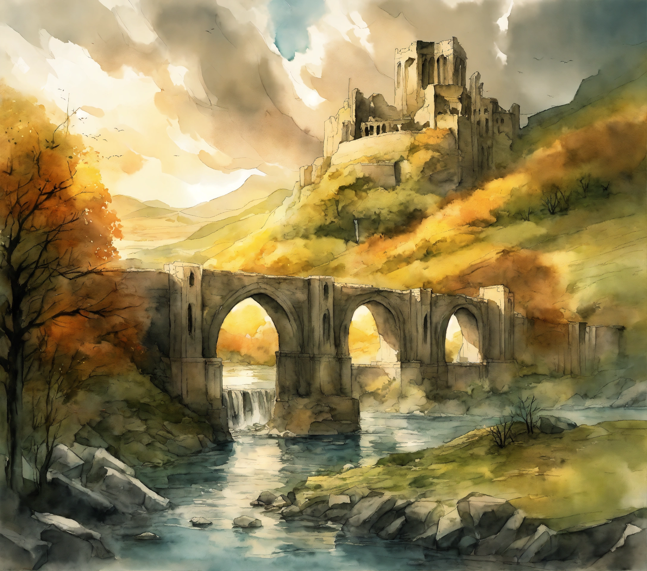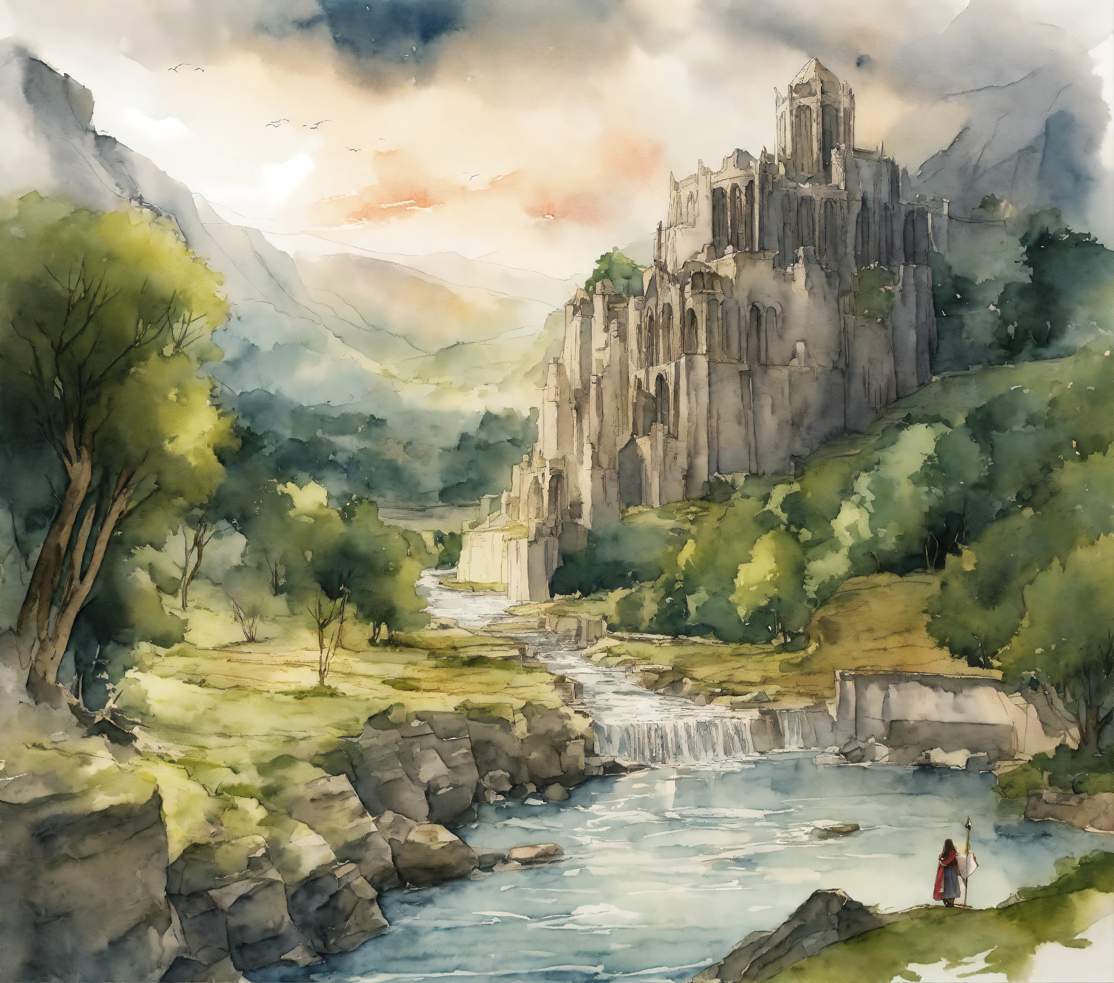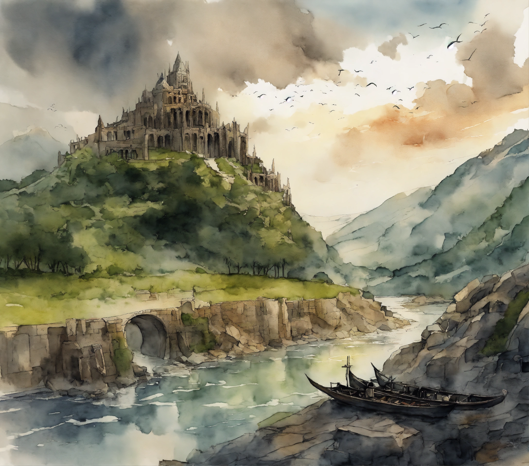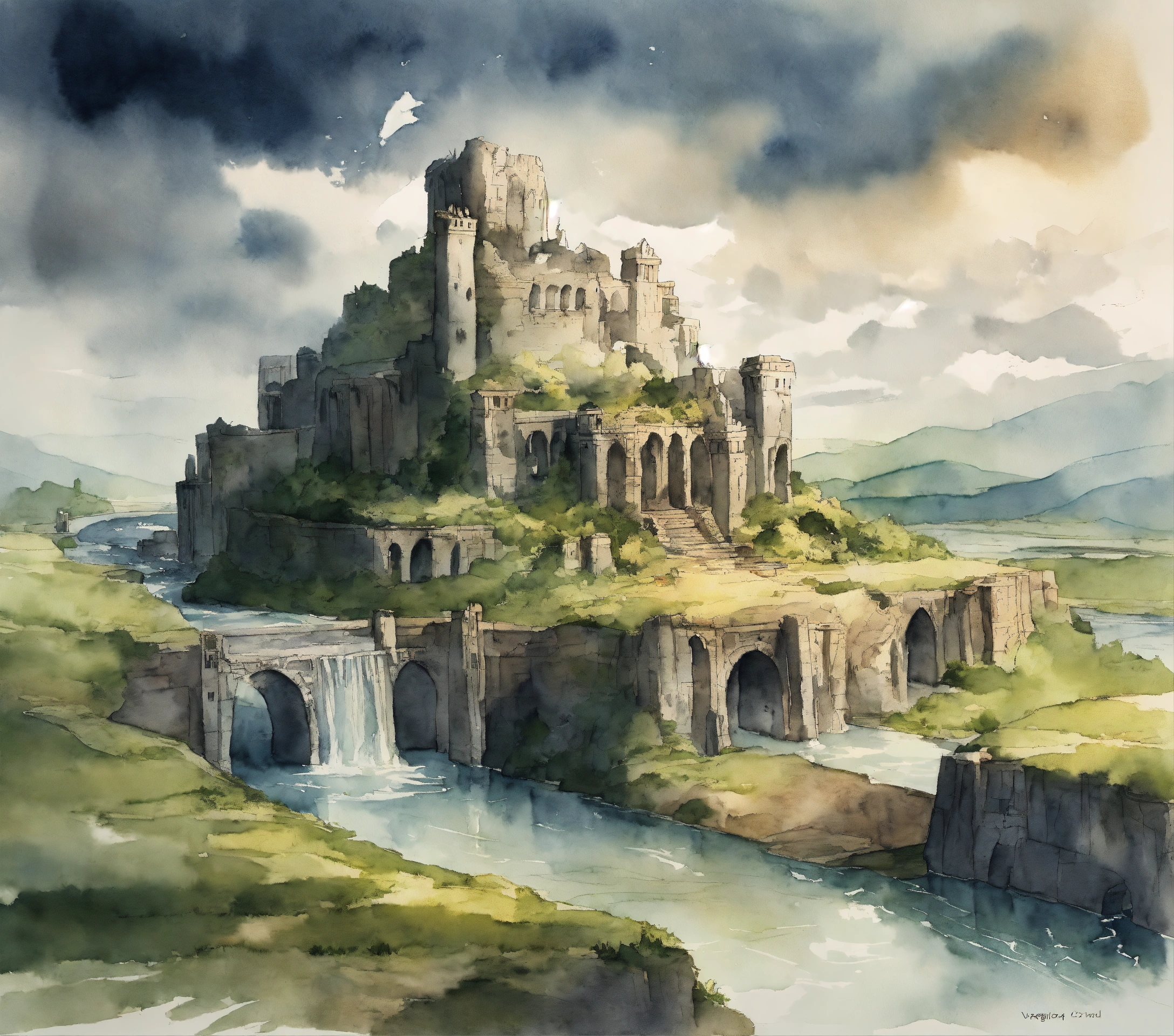 The ruins of amon sul from lotr over a river in vagabond manga drawing art style, watercolor, with grey clouds the background