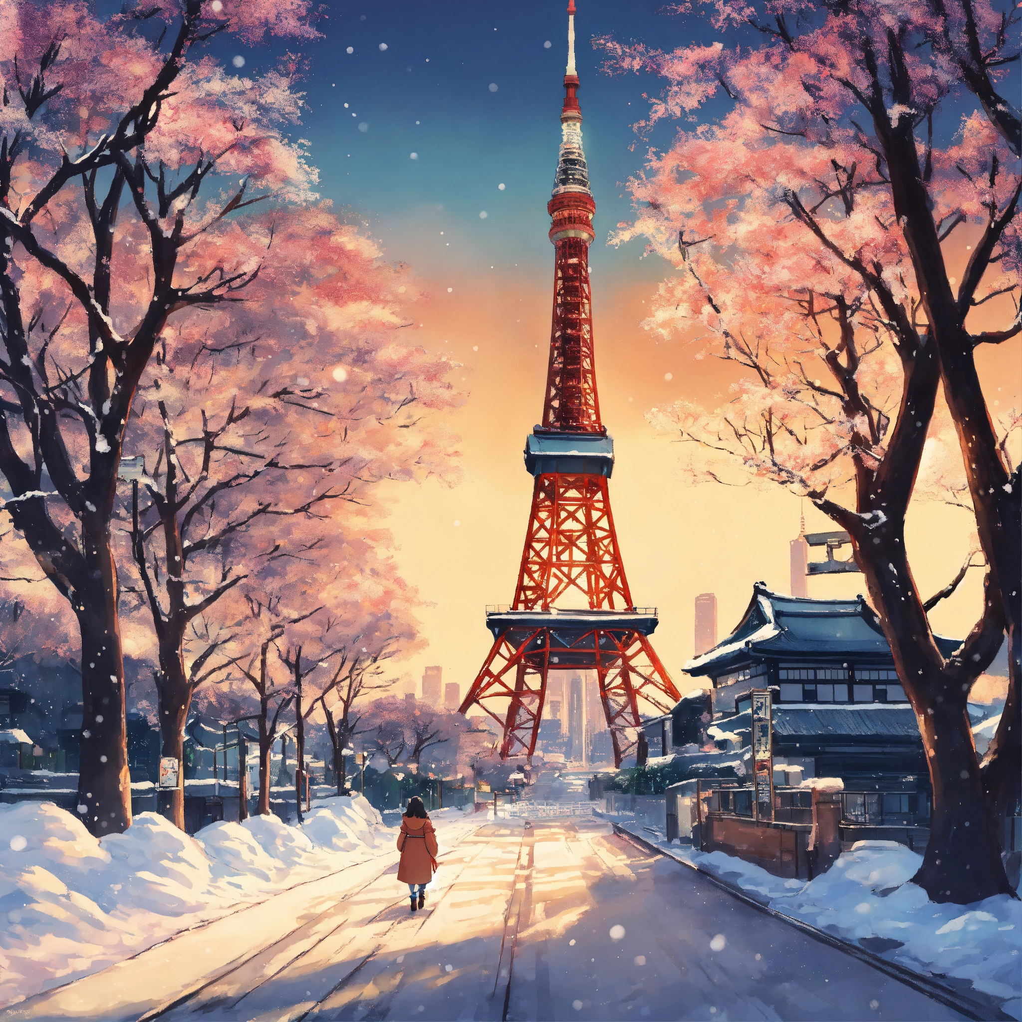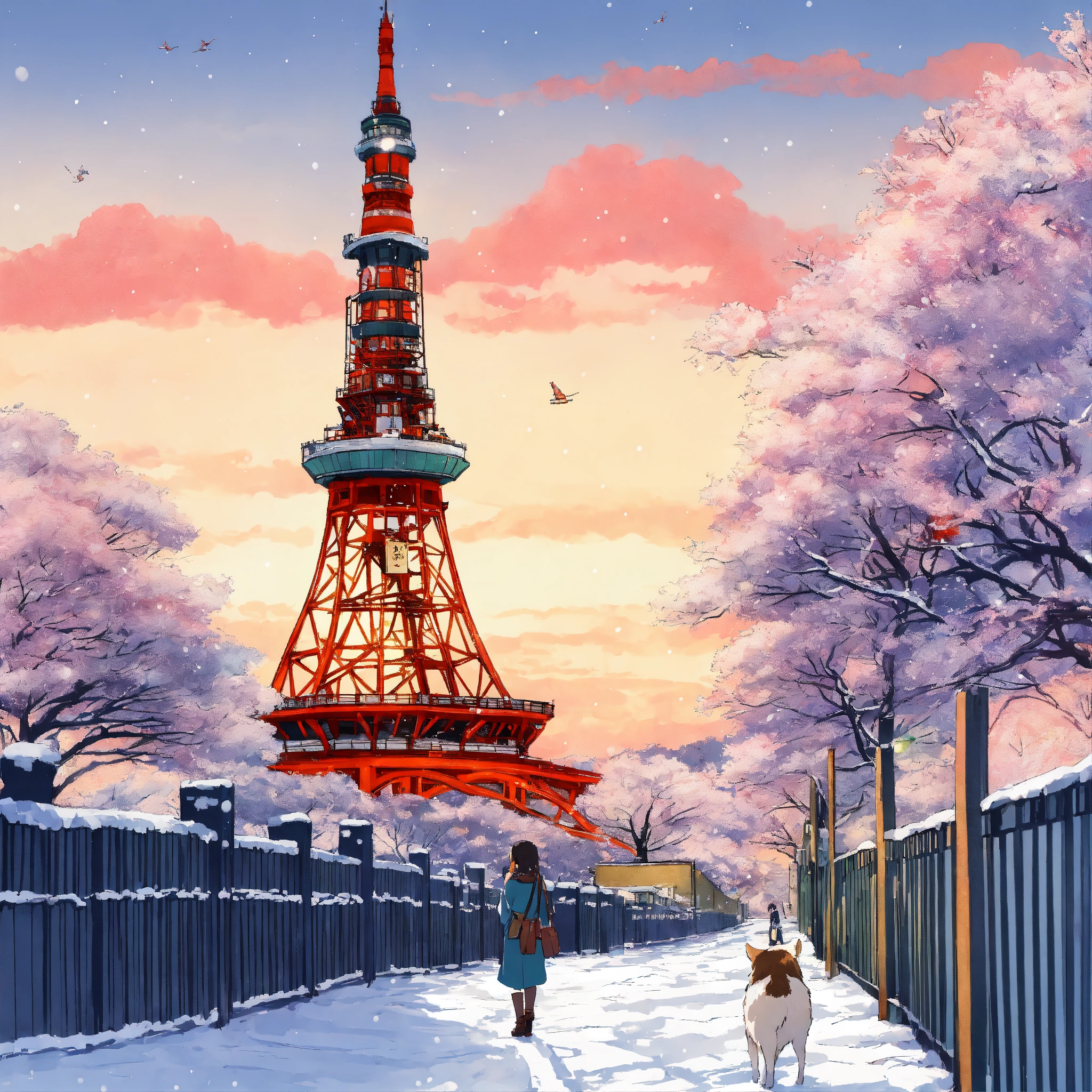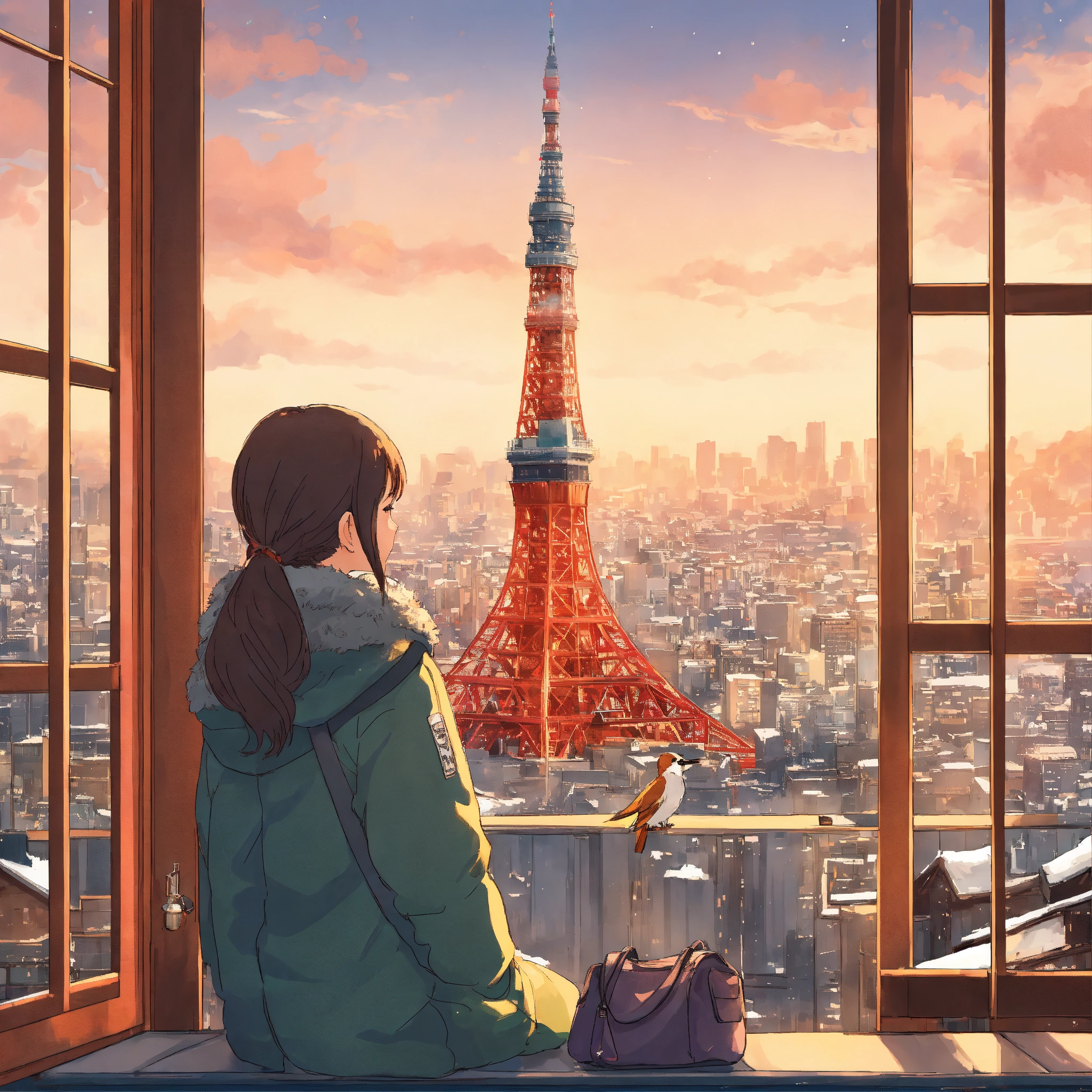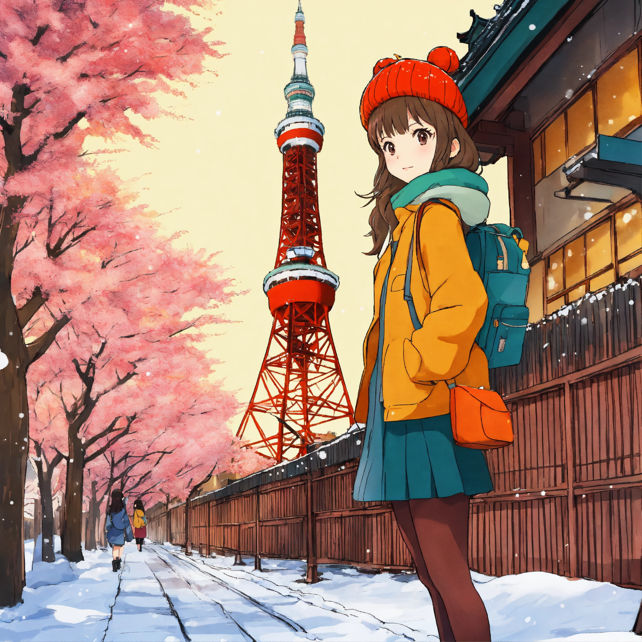 1 female, japanese, 20 years old, tokyo tower in winter, studio ghibli style illustration, wide angle