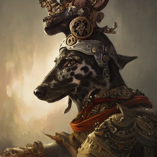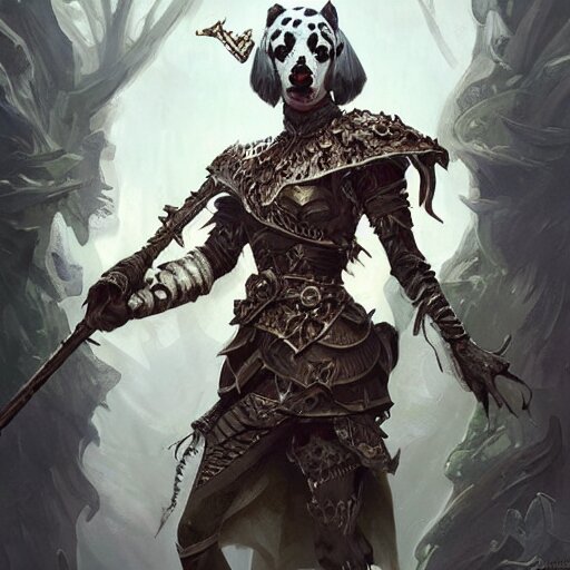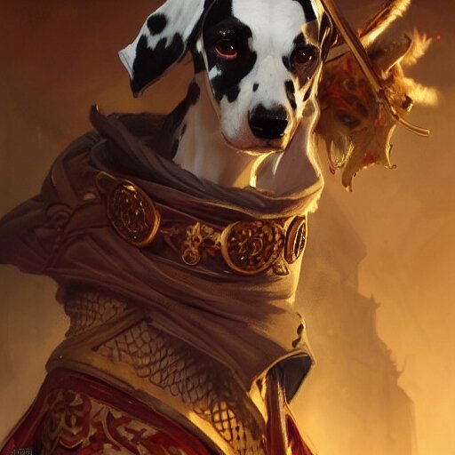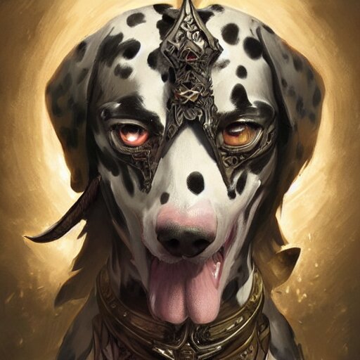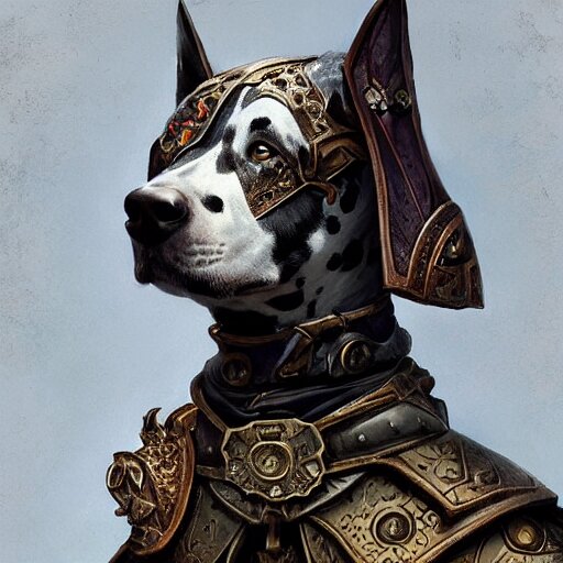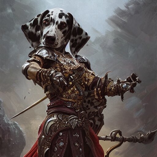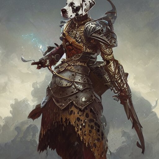 Anthropomorphic dalmatian dog warrior, d&d, fantasy, intricate, elegant, highly detailed, digital painting, artstation, concept art, matte, sharp focus, illustration, hearthstone, art by artgerm and greg rutkowski and alphonse mucha
