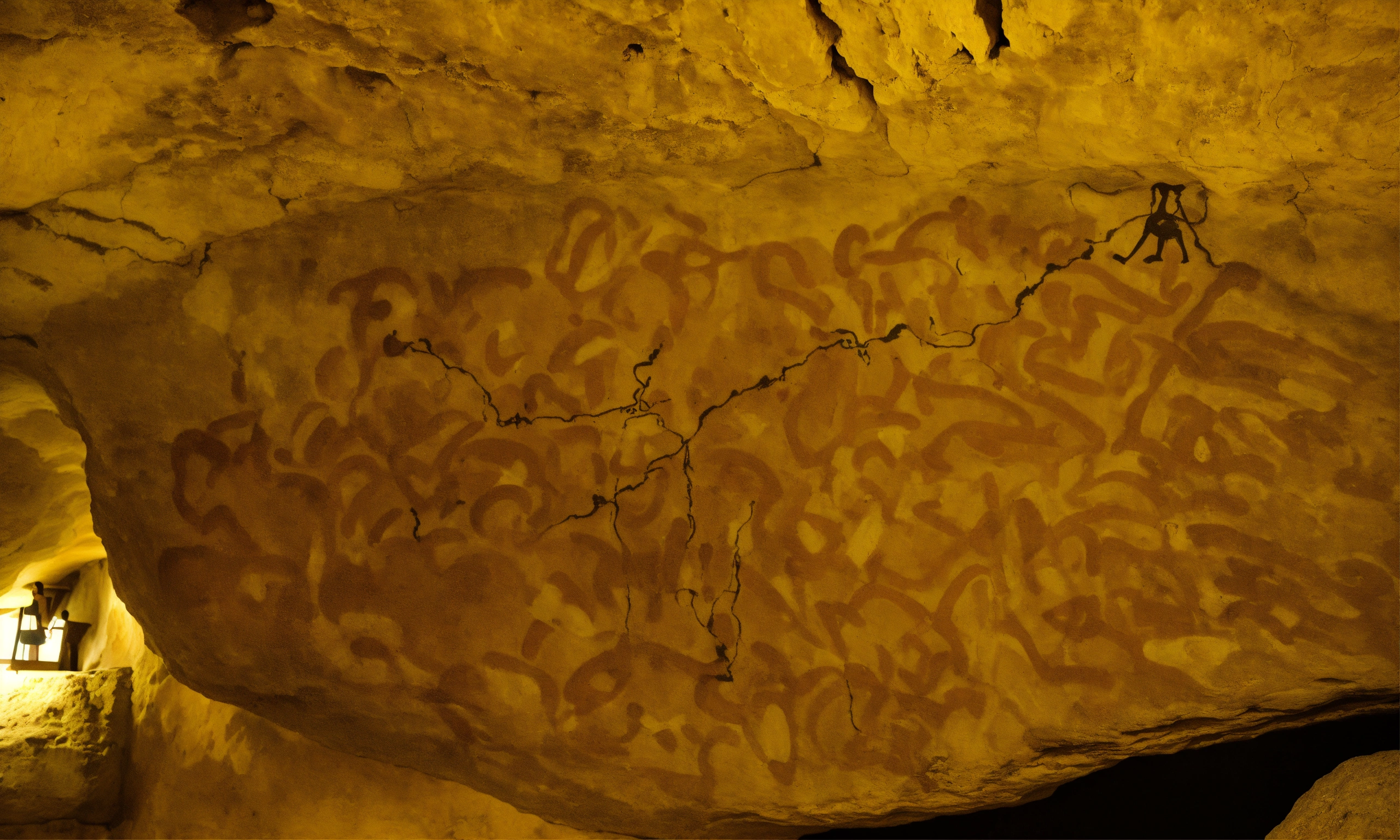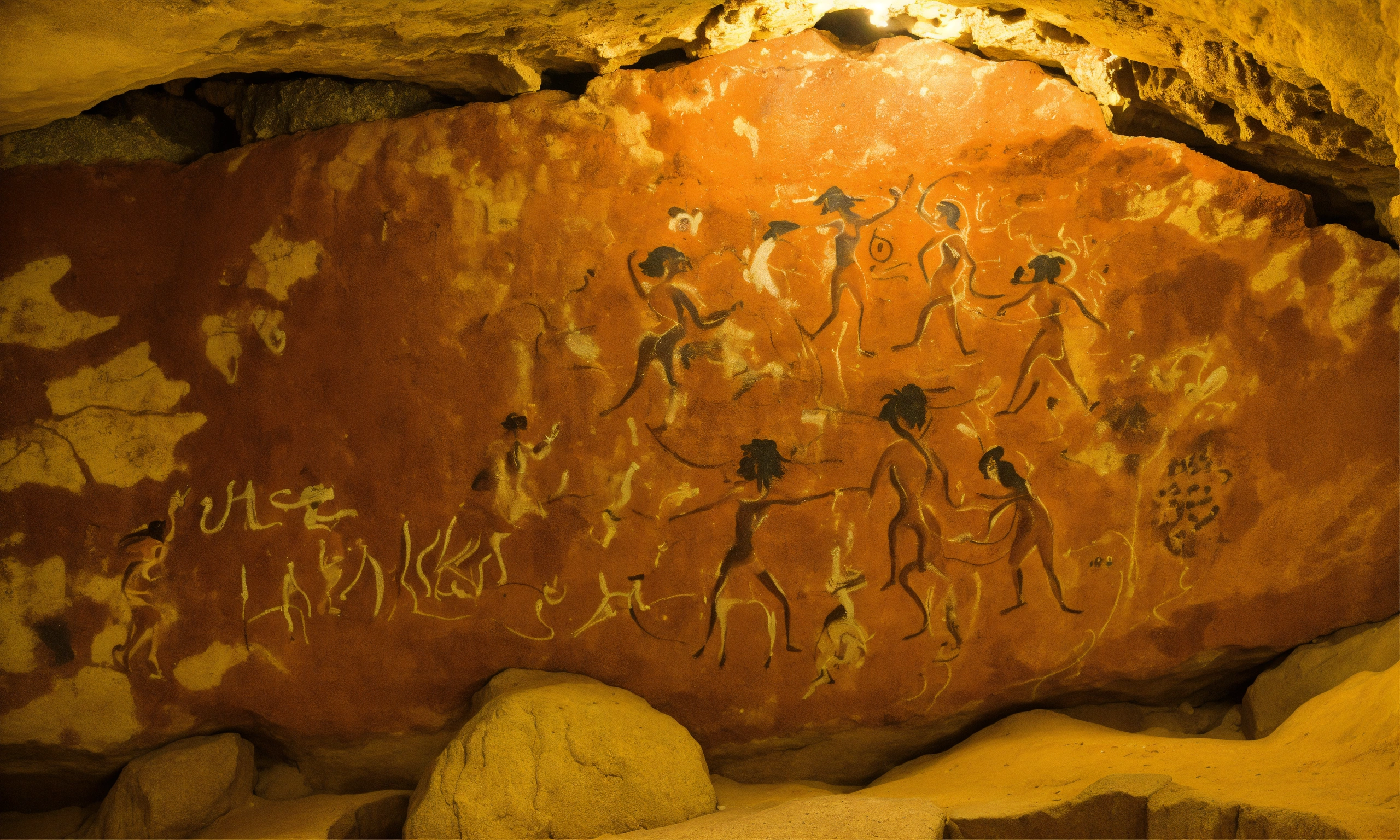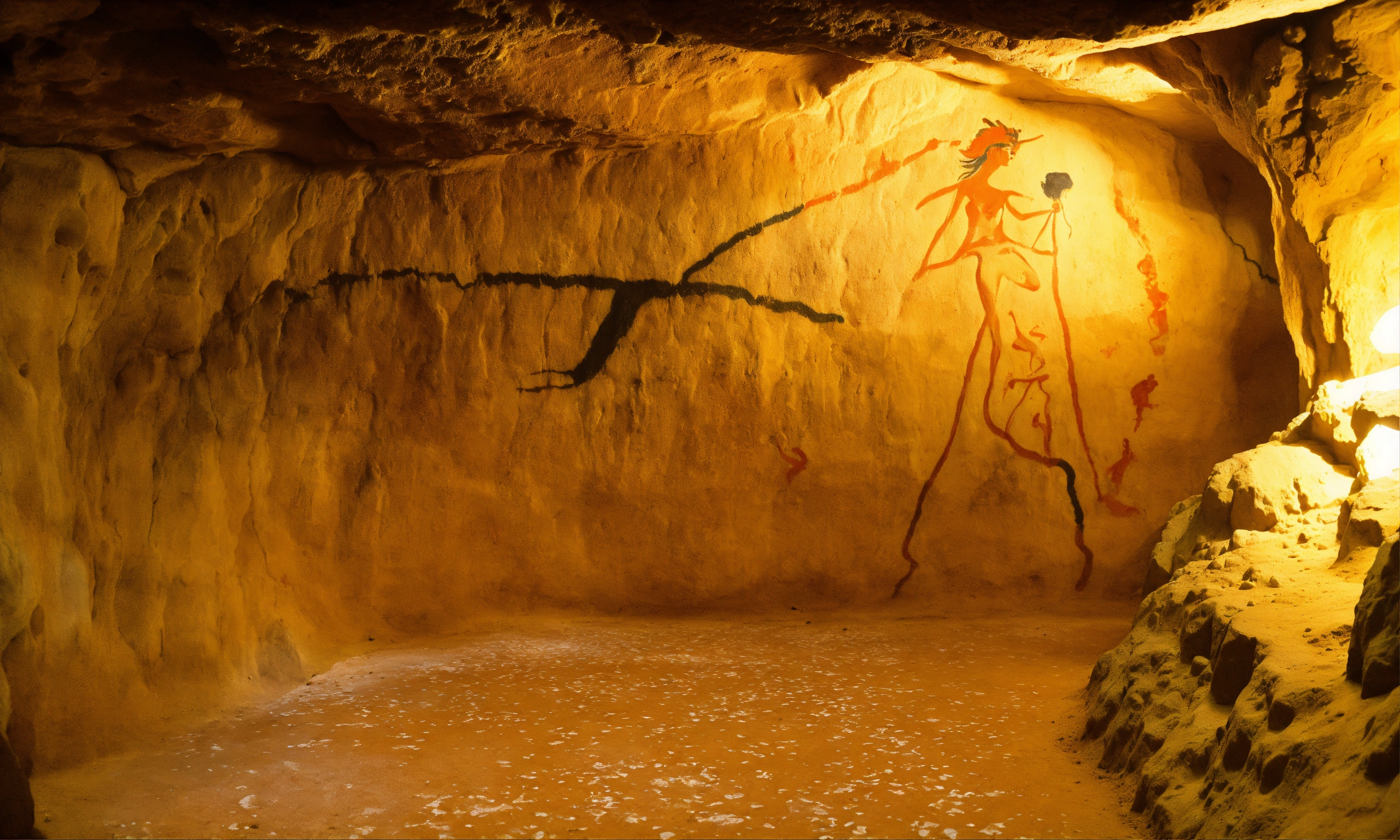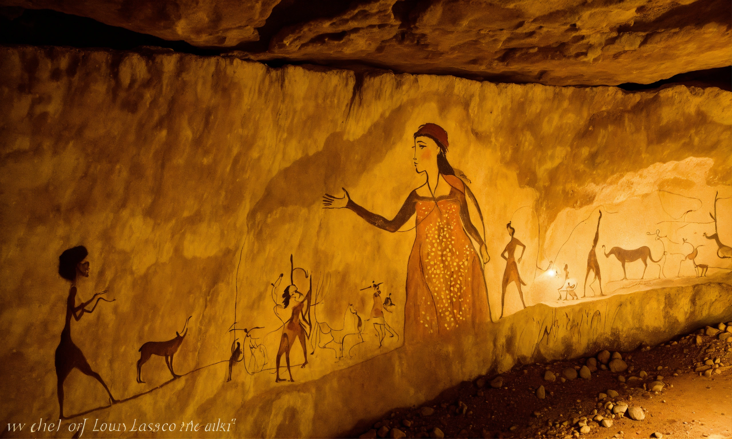 Prehistoric painting on the wall of a cave which represents a woman in the manner of the drawings in the cave of lascaux with the inscription "julie louka" below