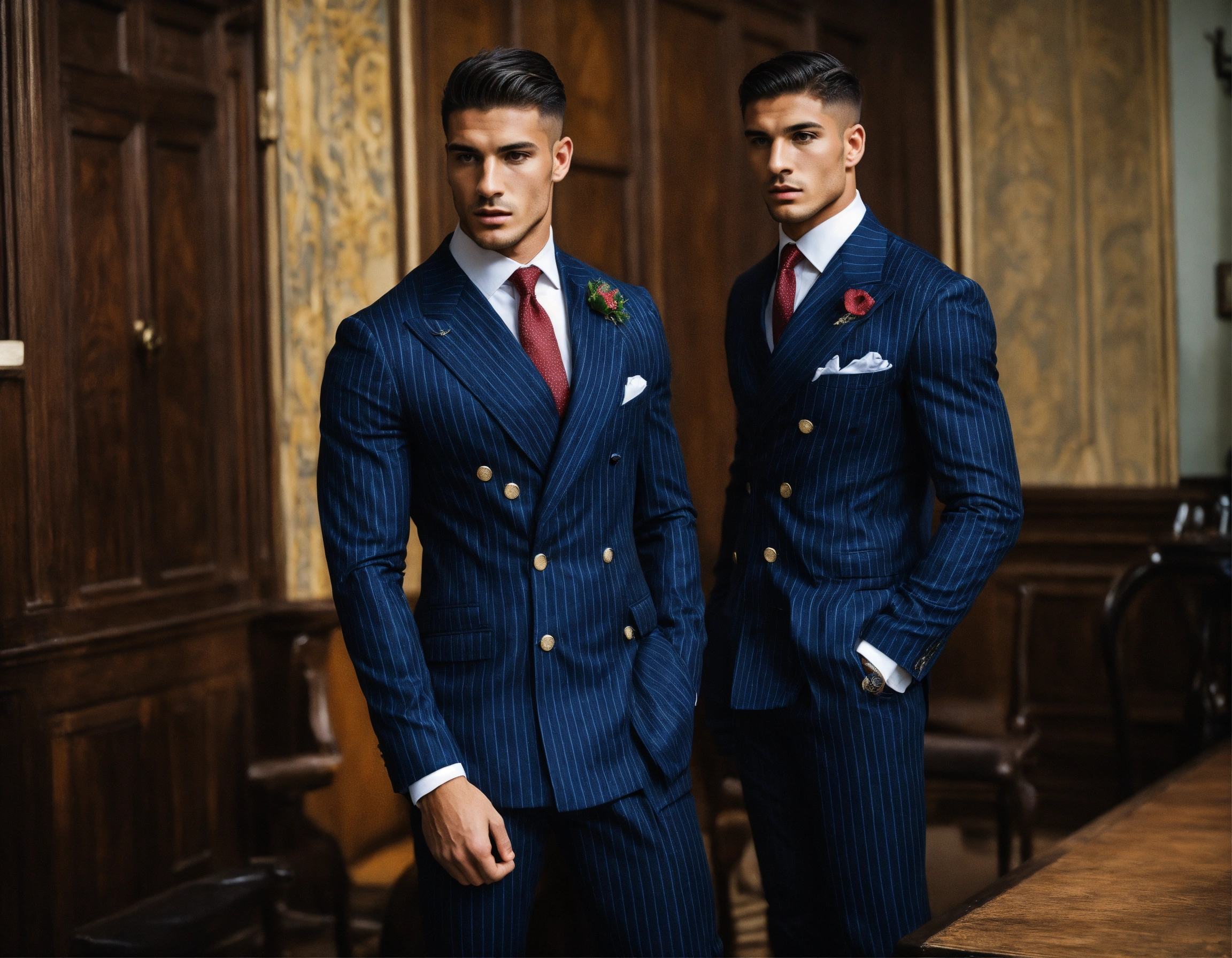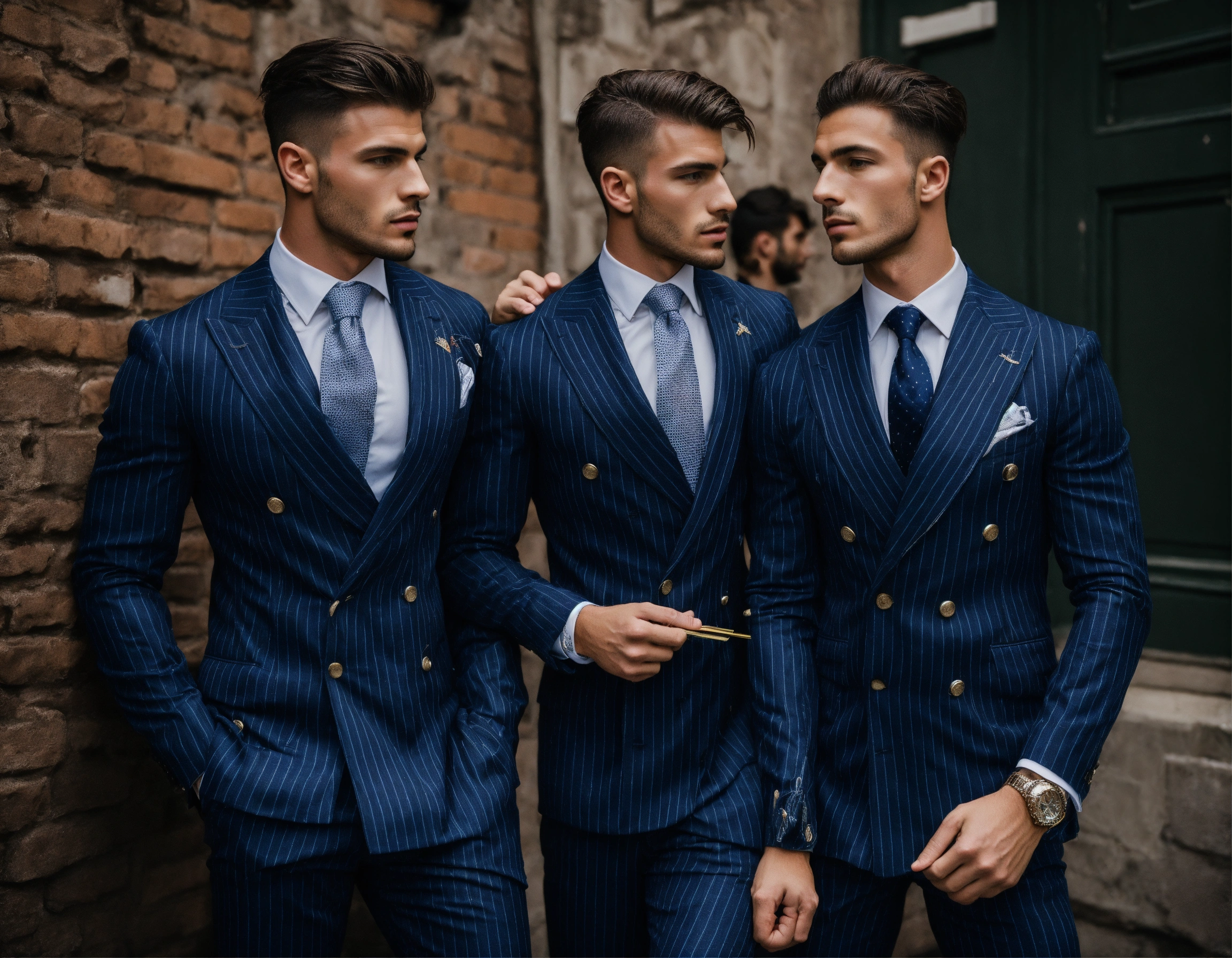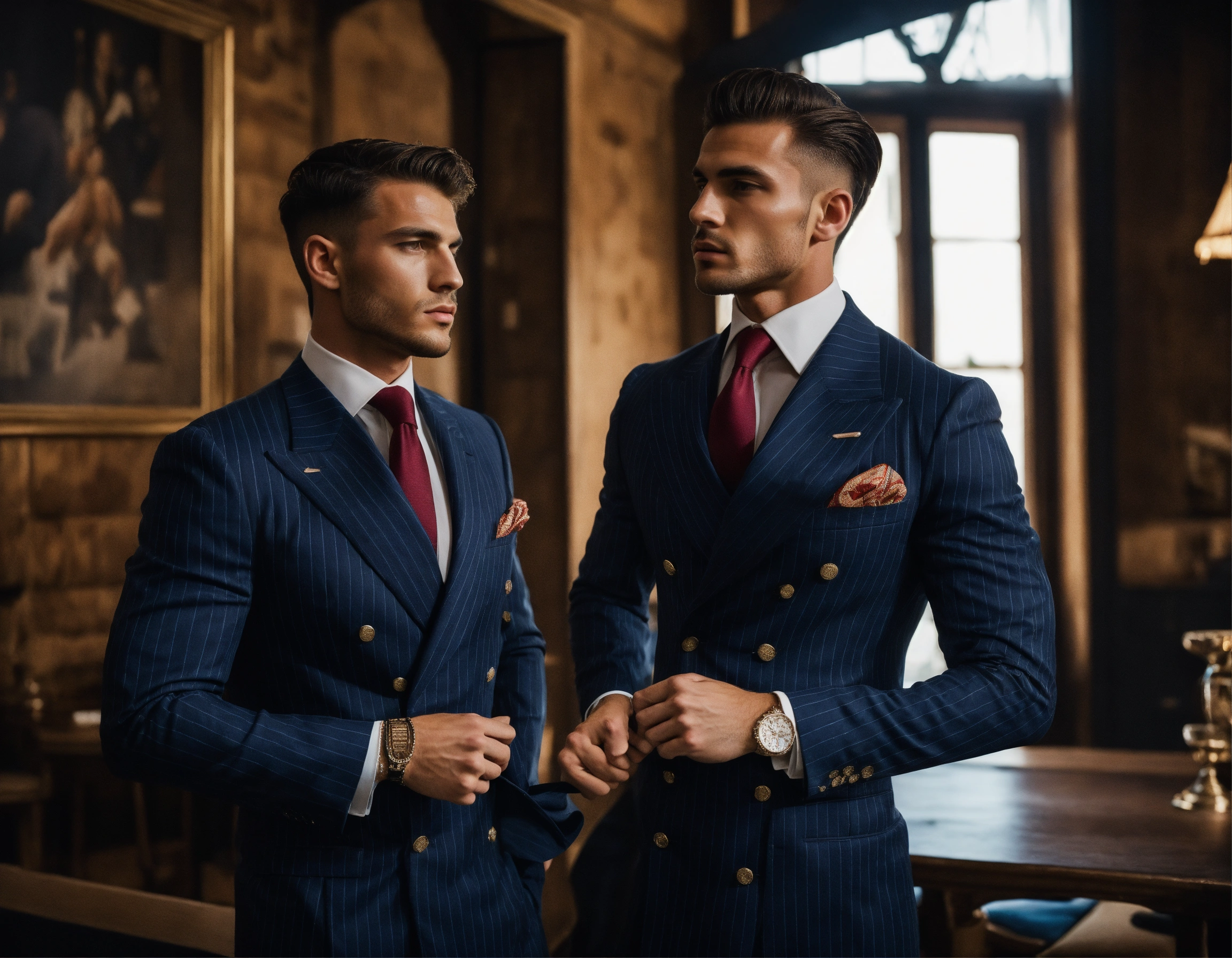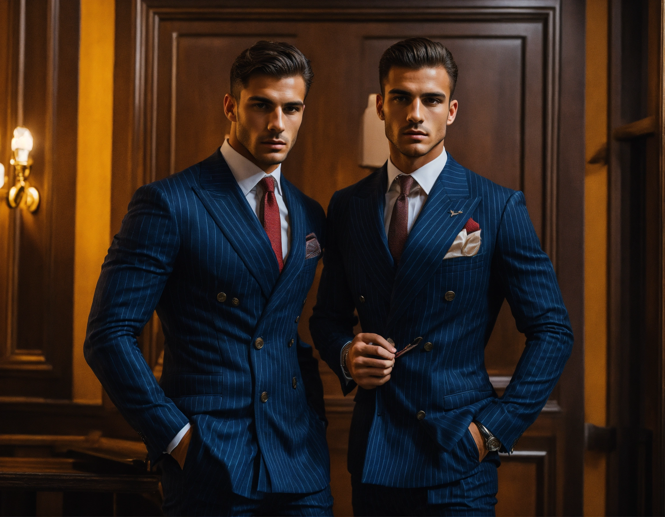 Two young italian muscled sportsmen in navy pinstripe double breasted suit, club tie, preparing to fight