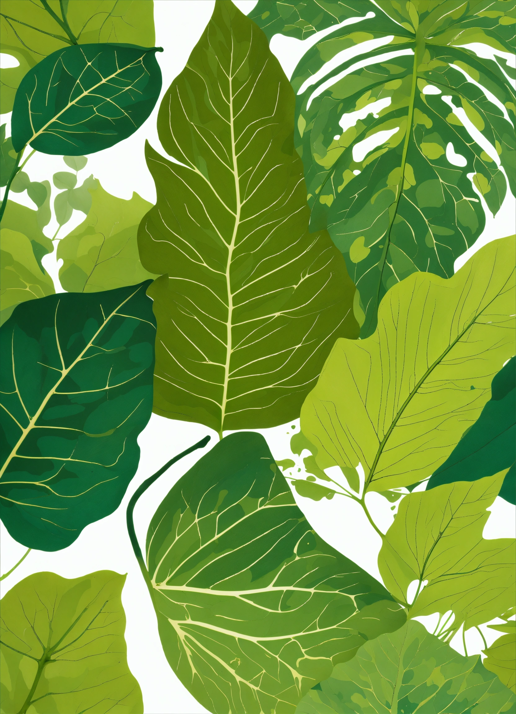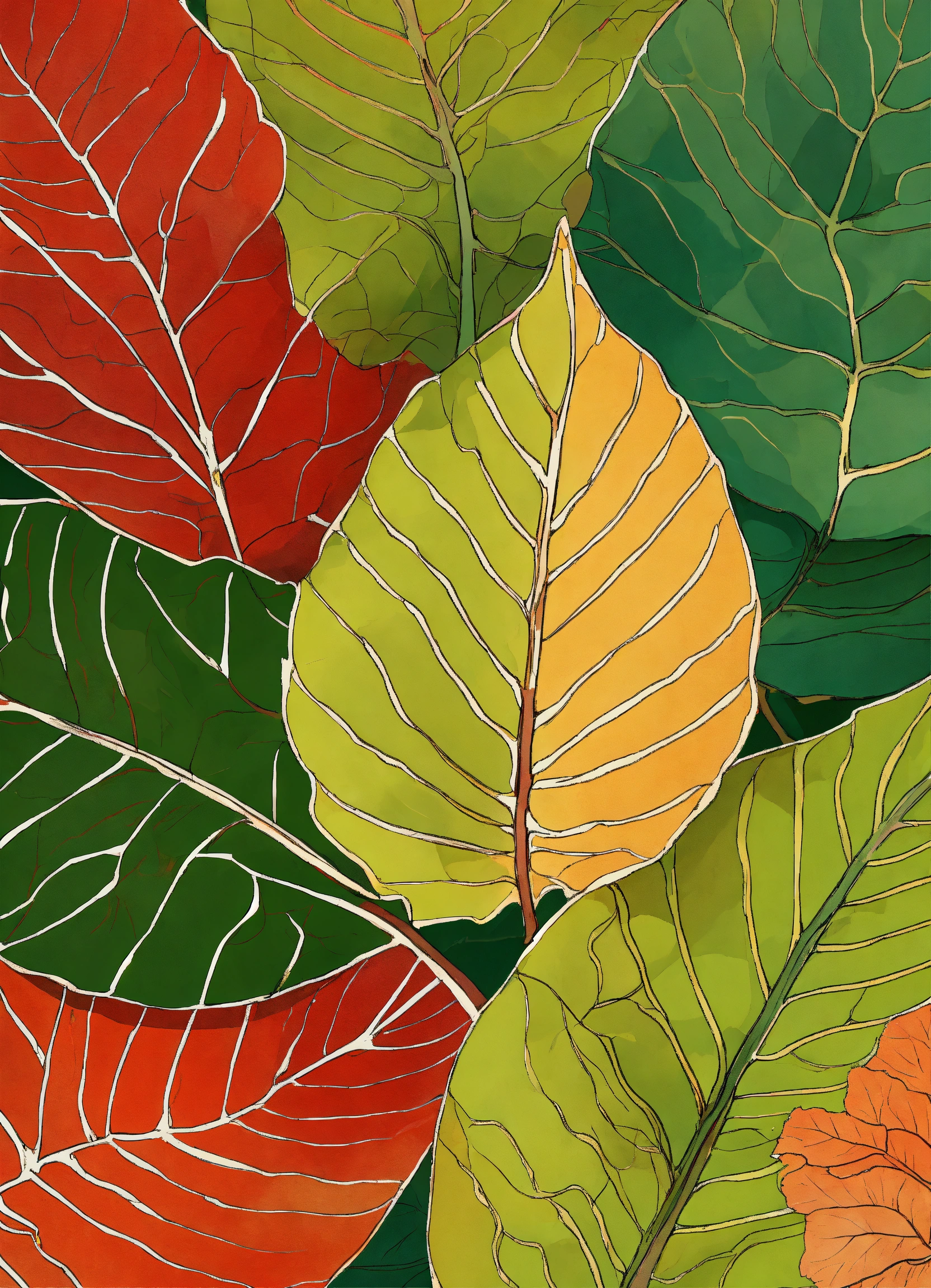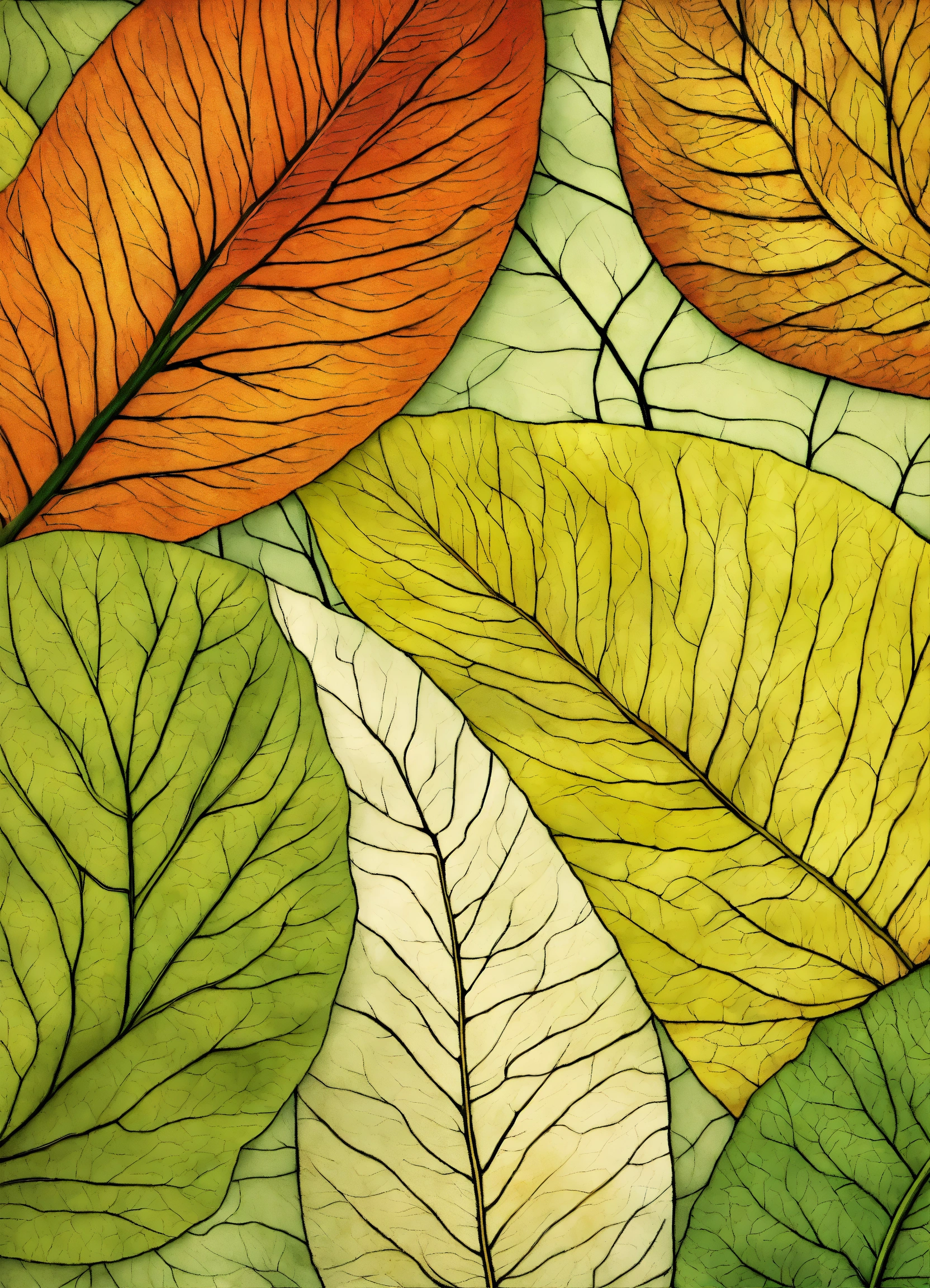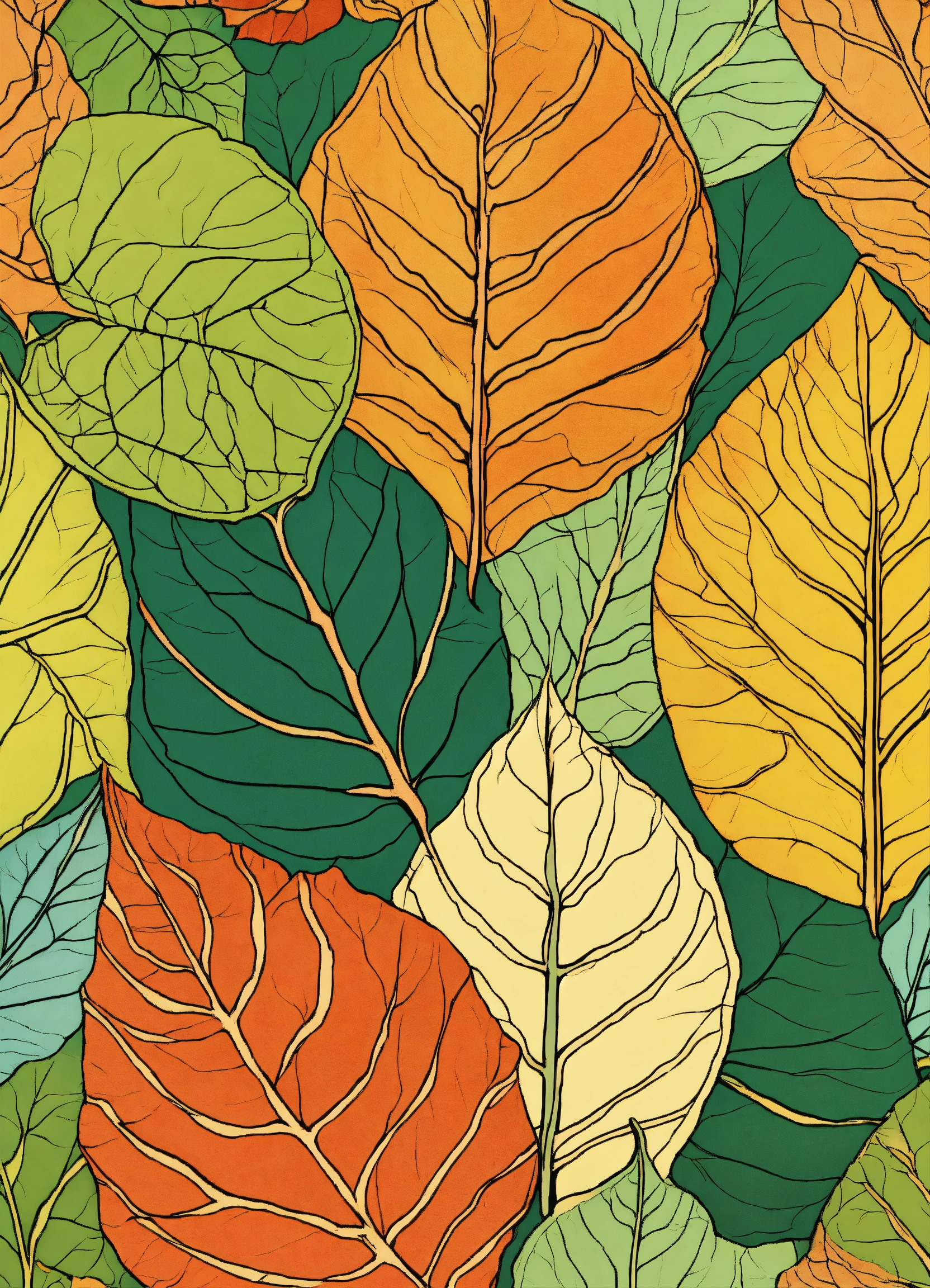 Create a large leaf outline, fragment it into pieces and add repetitive patterns within the veins of each leaf varied and vibrant.