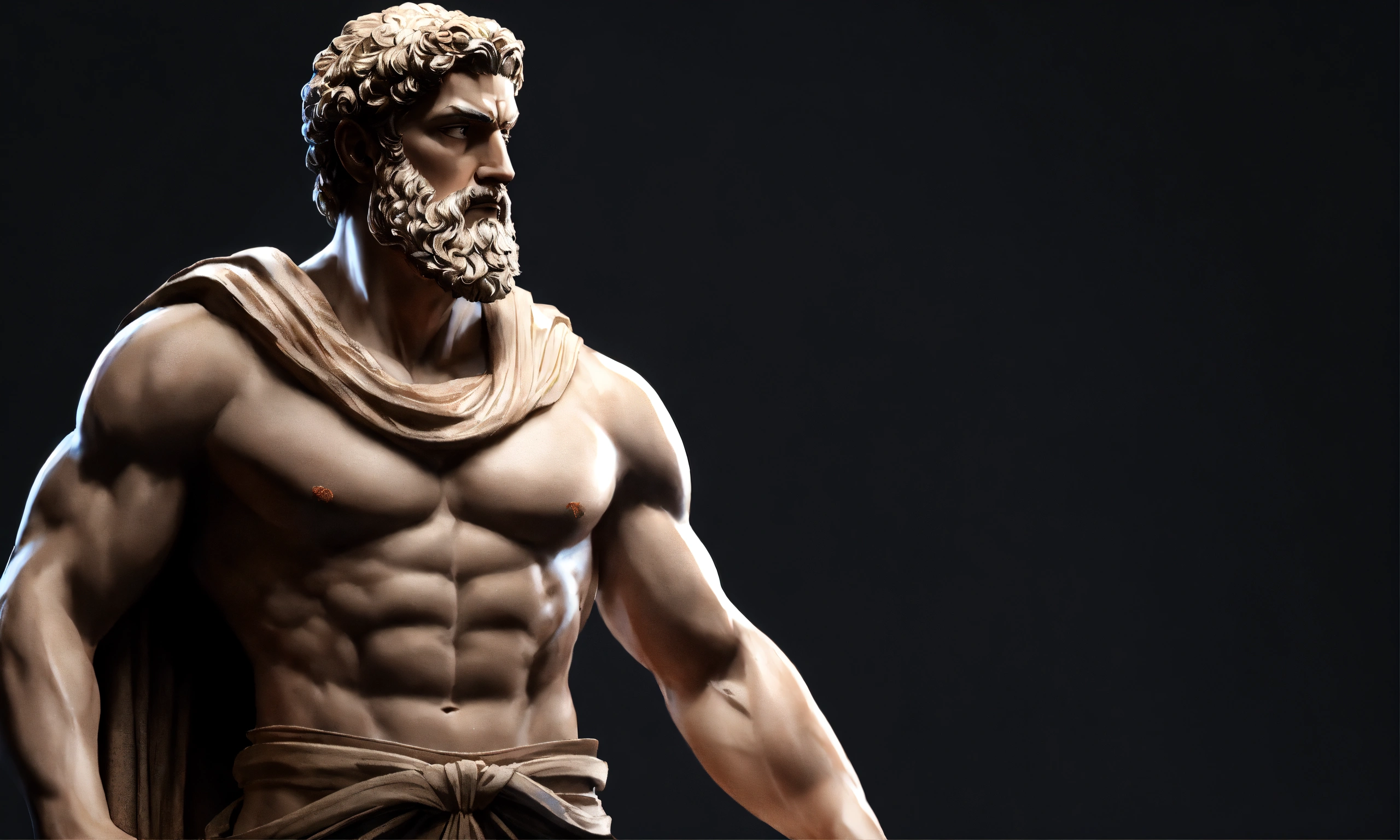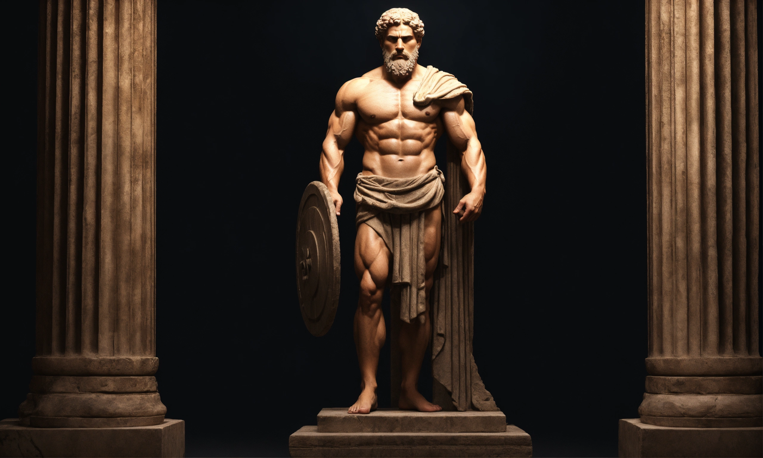 Strong stoic man, full body, muscle, stoic sculpture, dark background, ancient greece background realistic, 8k