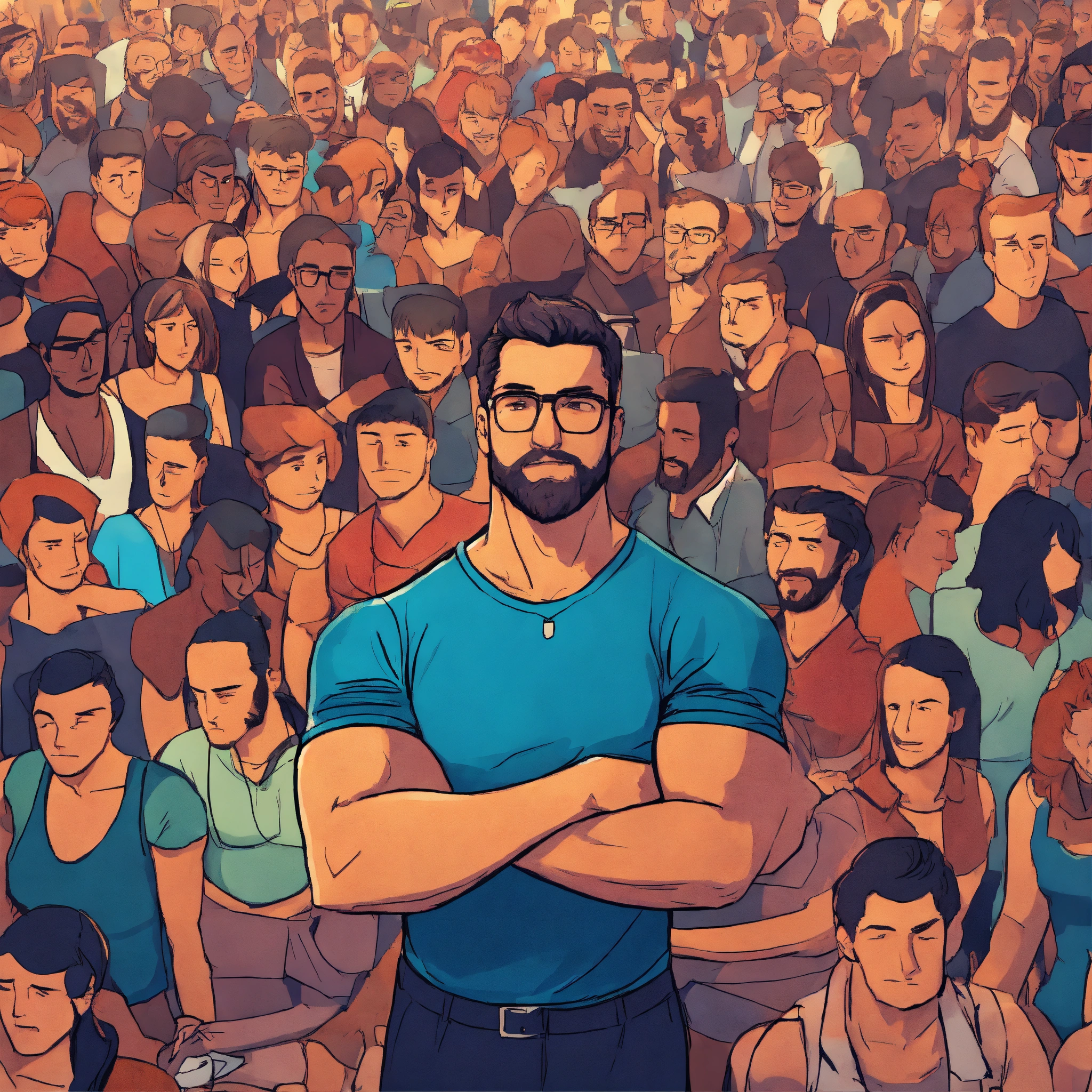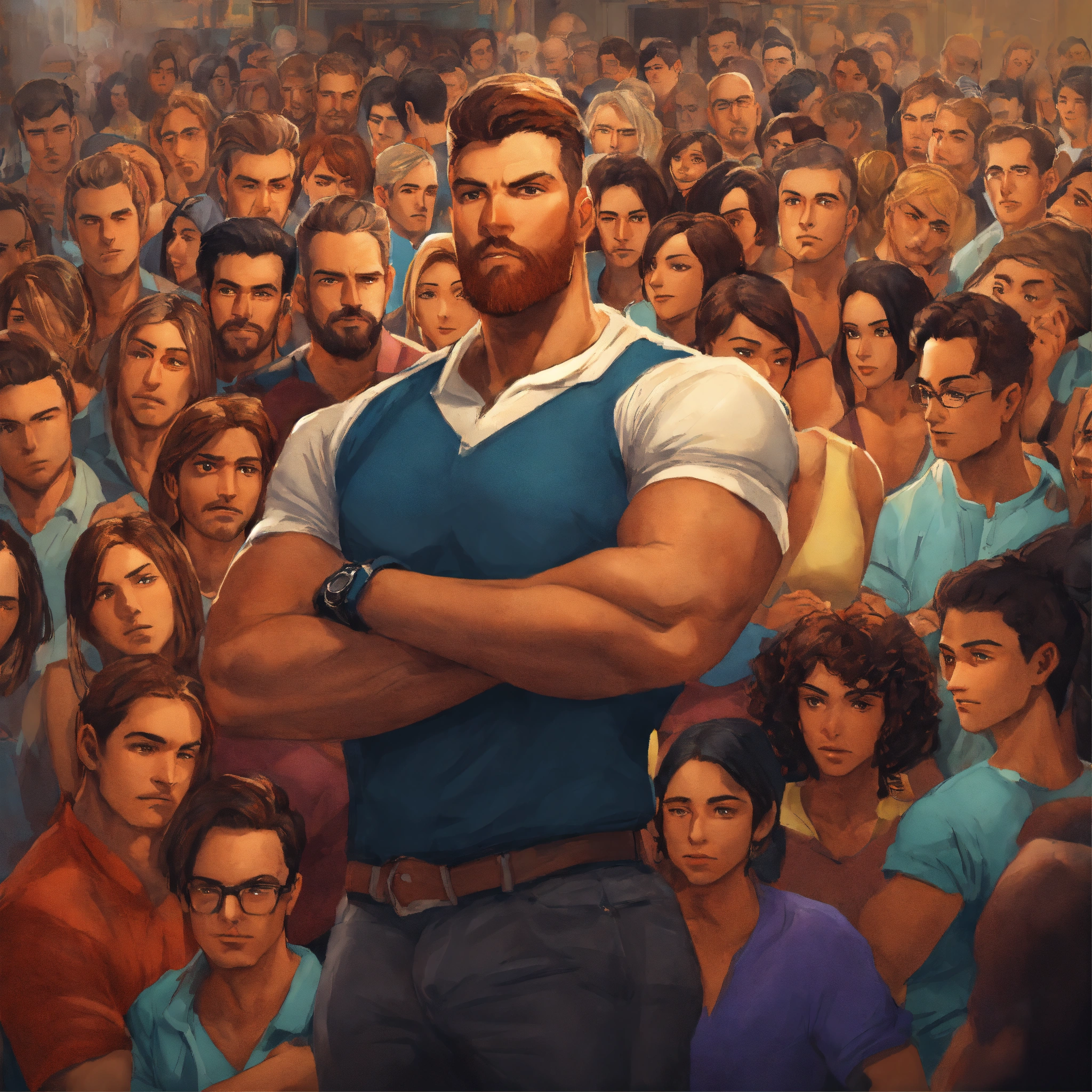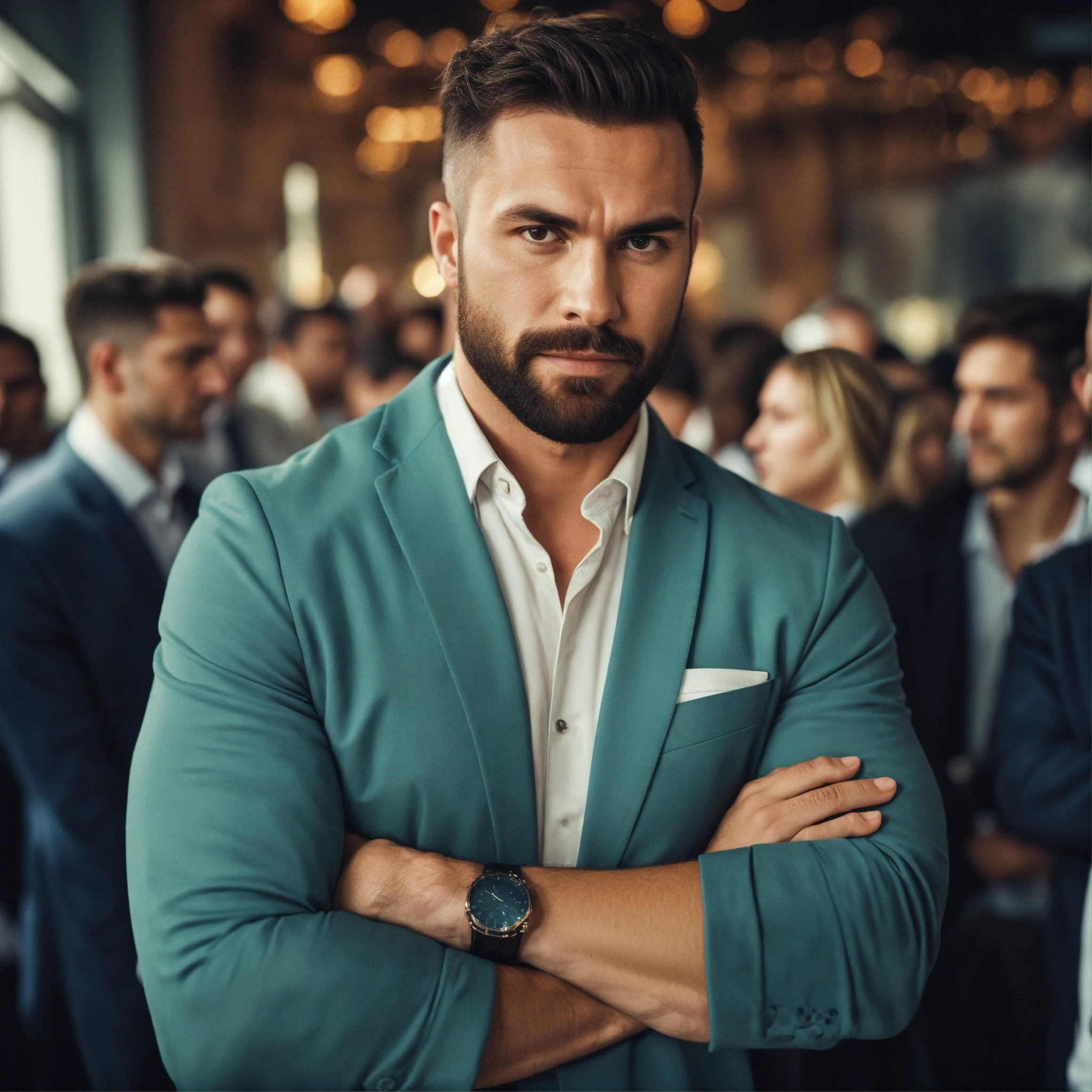 Strong confident man with his arms crossed in a crowded room