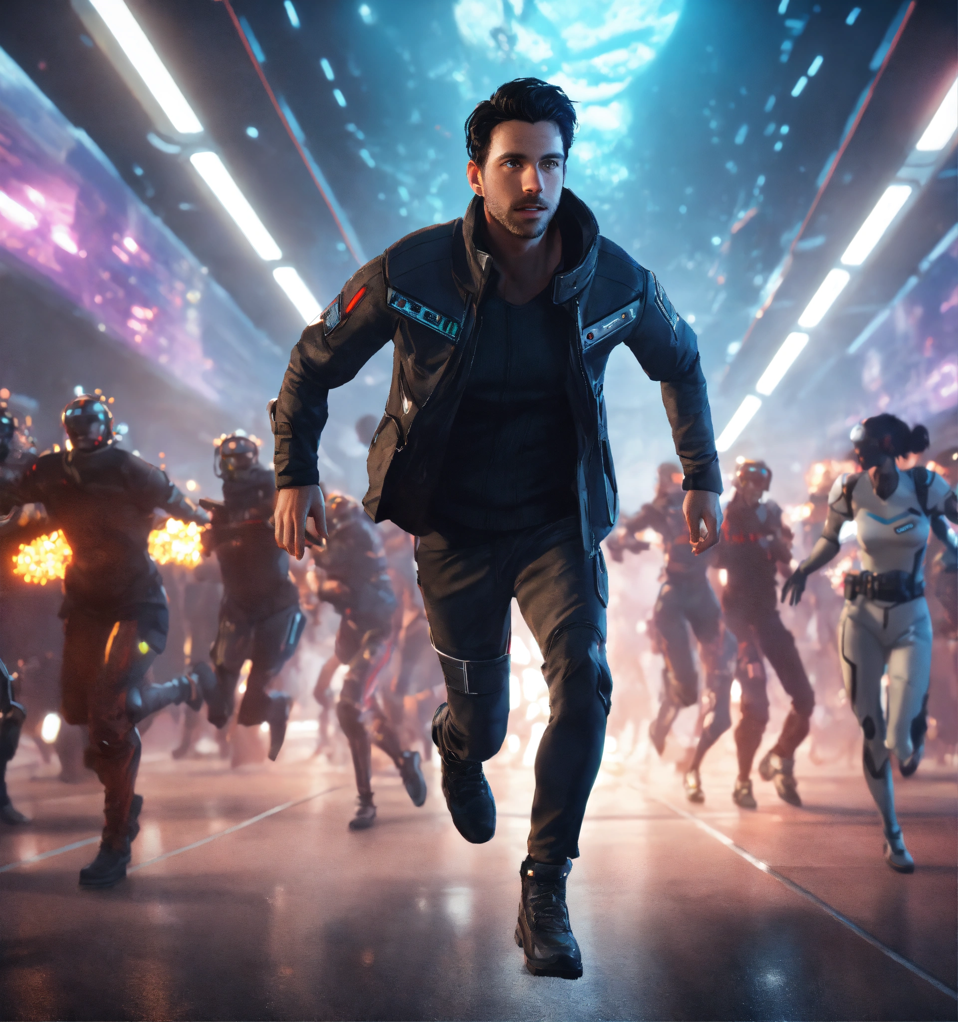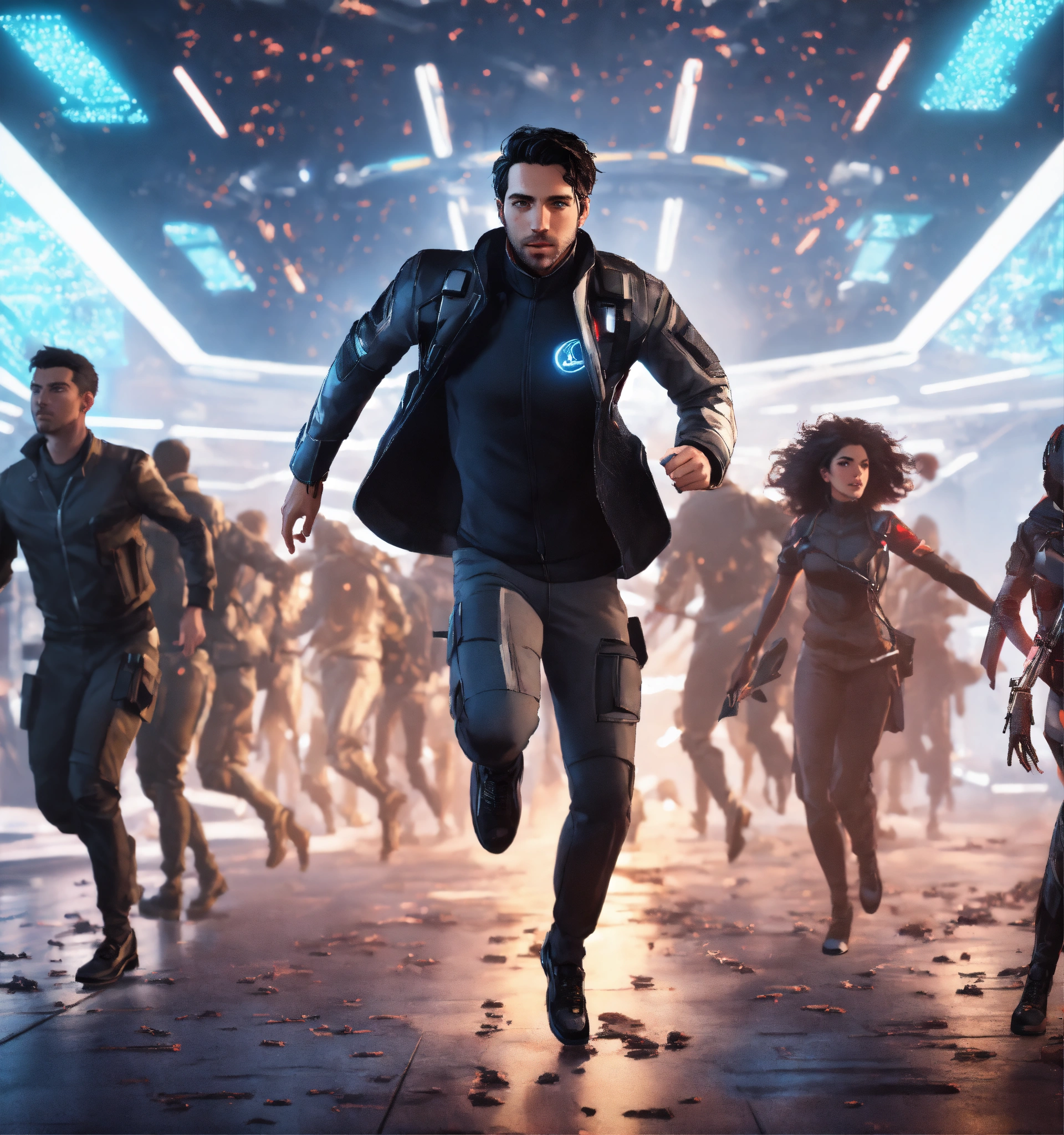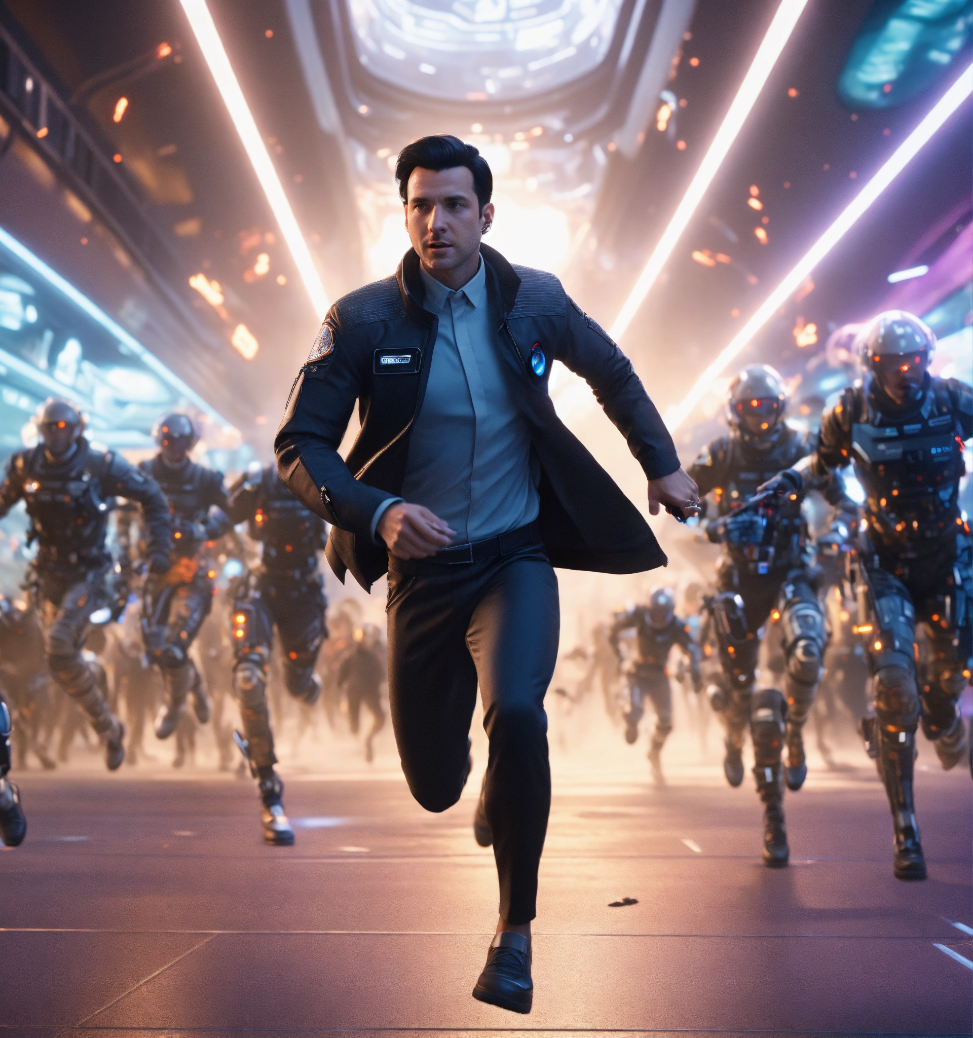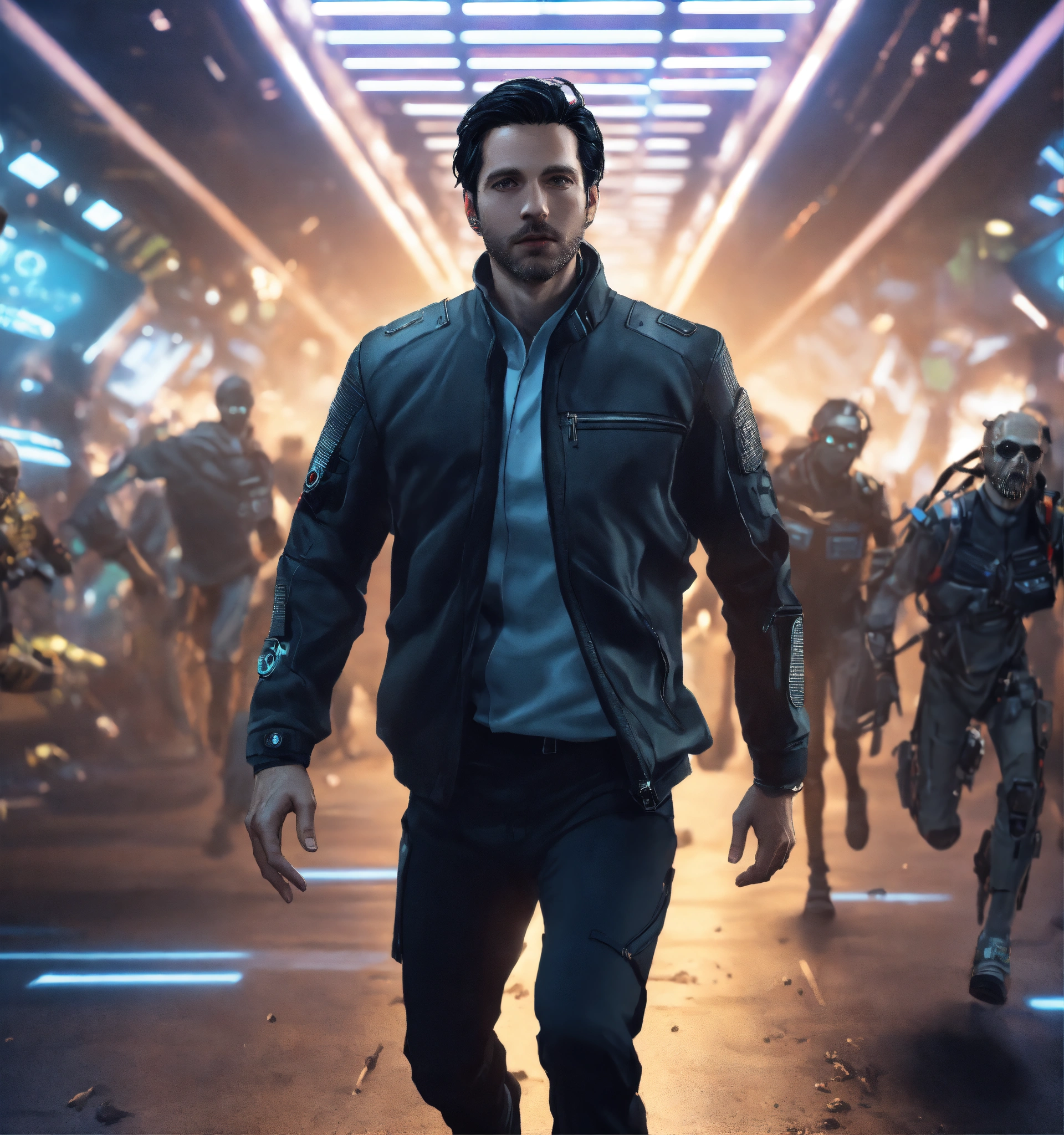 35 year old white male doctor with black hair wearing futuristic spy jacket running through a crowd of space zombies in a futuristic spaceport, realistic, futuristic, sci-fi, 8k, unreal engine, pixar, zaha hadid
