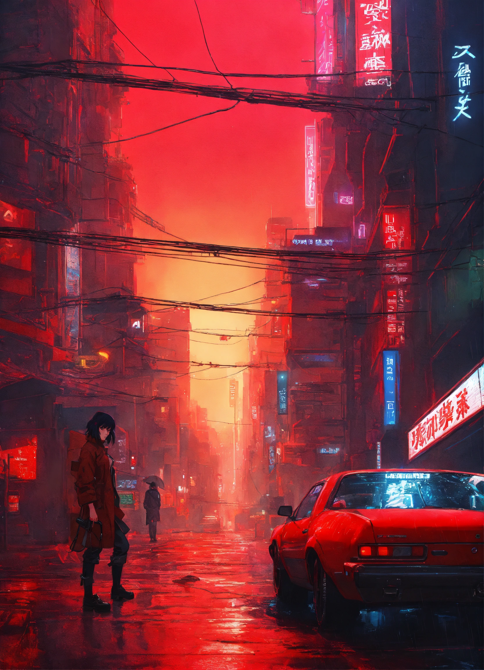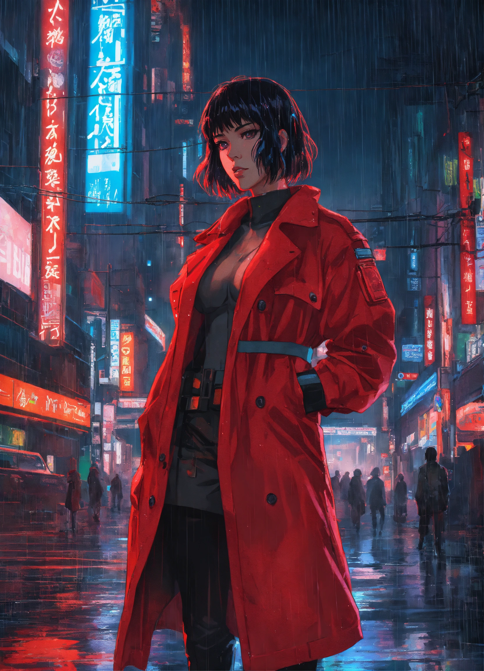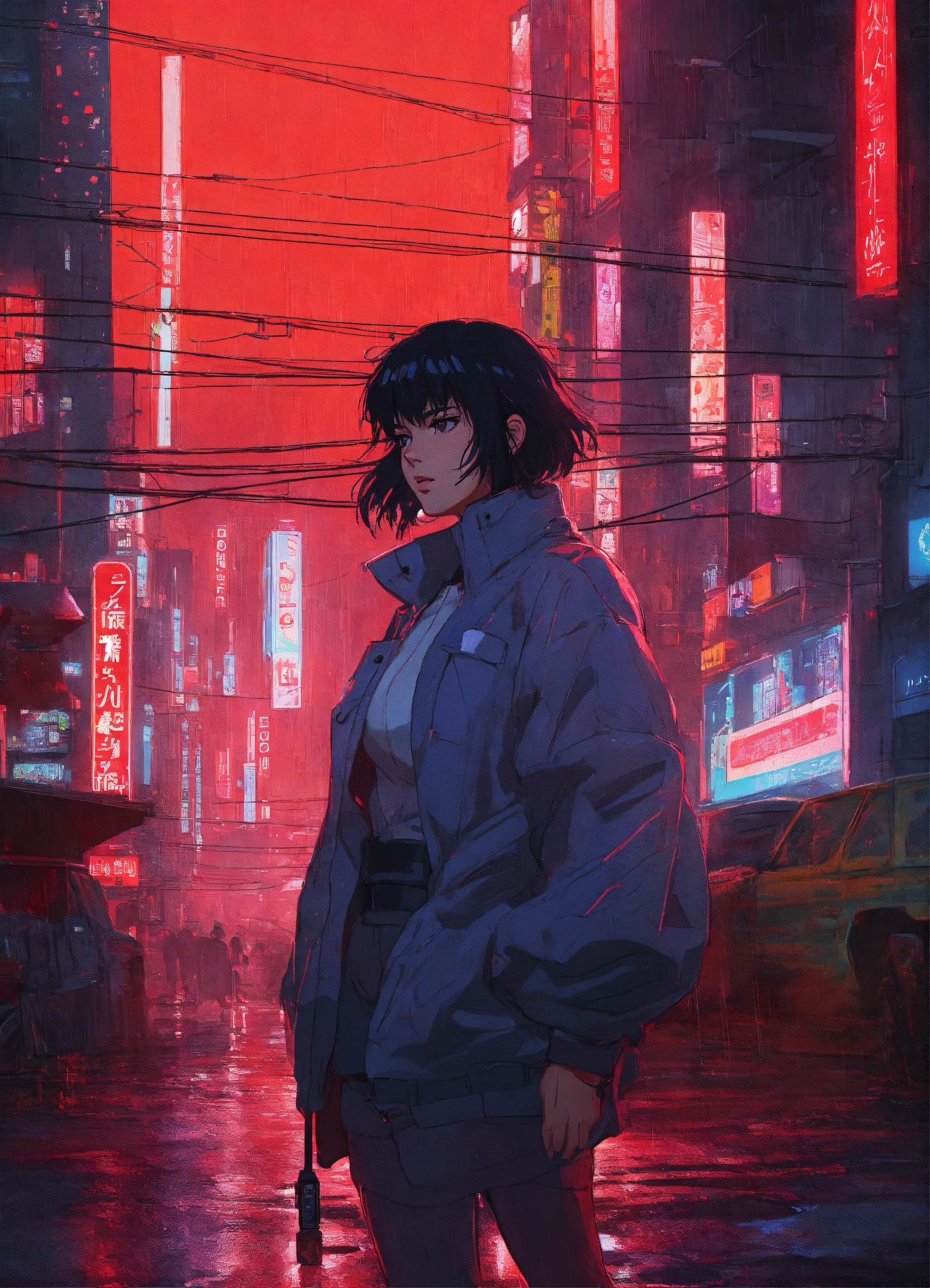 Anime art of ghost in the shell, detailed scene, red, perfect face, intricately detailed photorealism, trending on artstation, neon lights, rainy day, ray-traced environment, vintage 90's anime artwork.