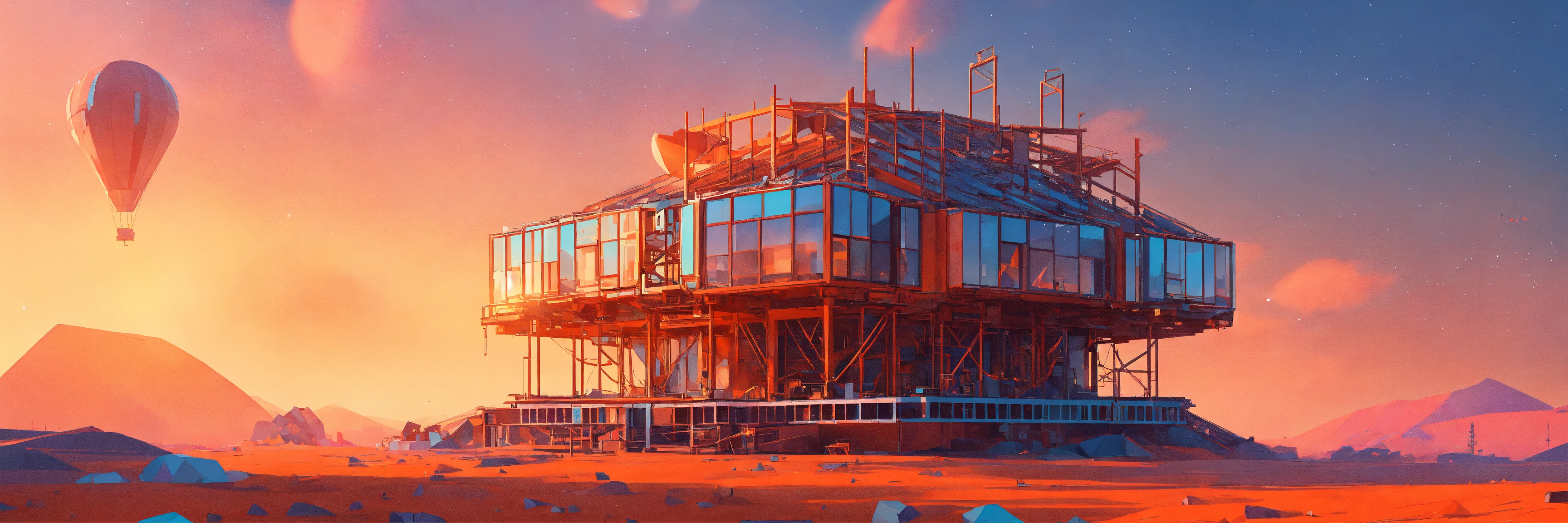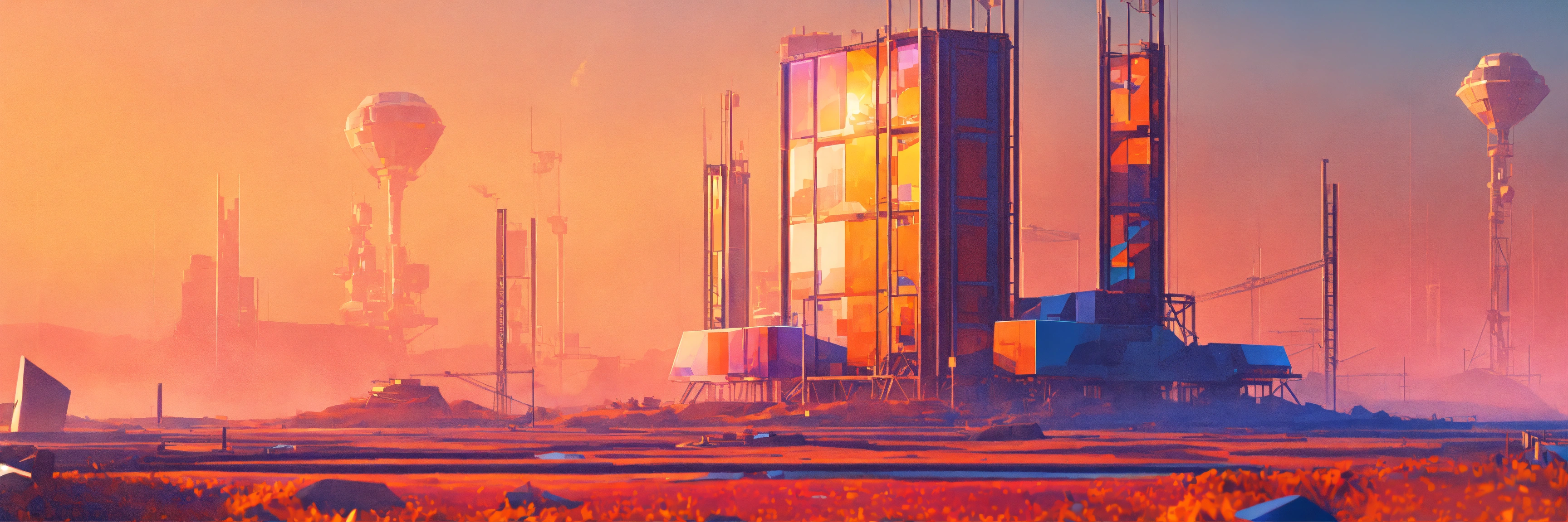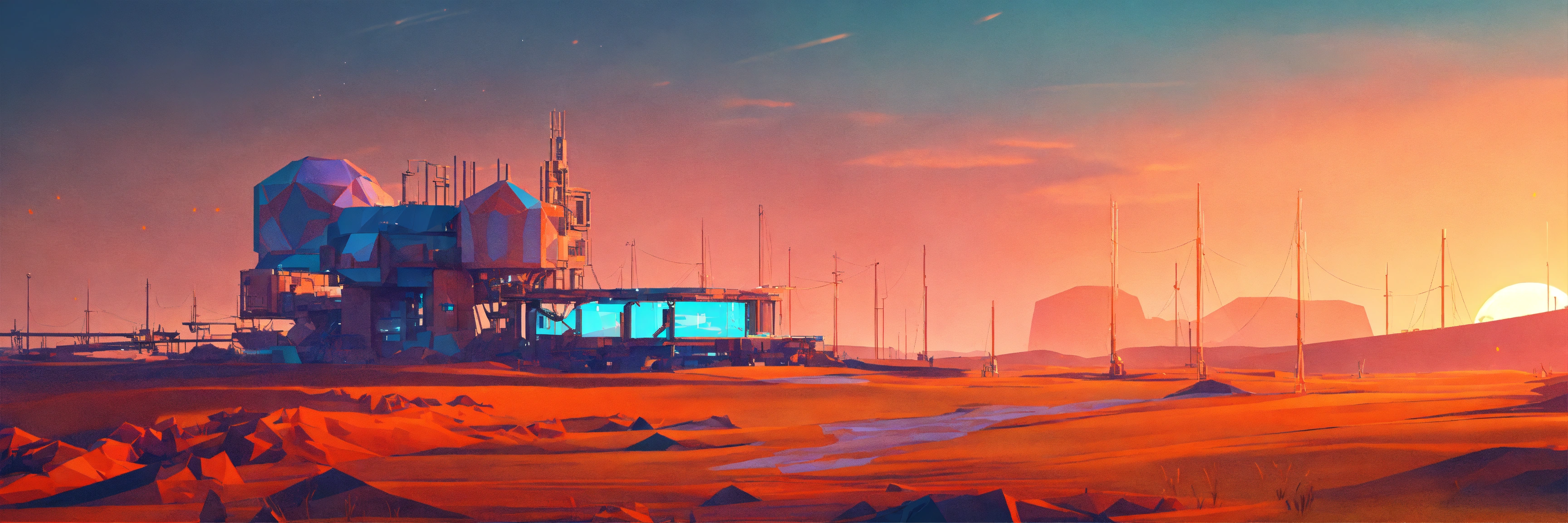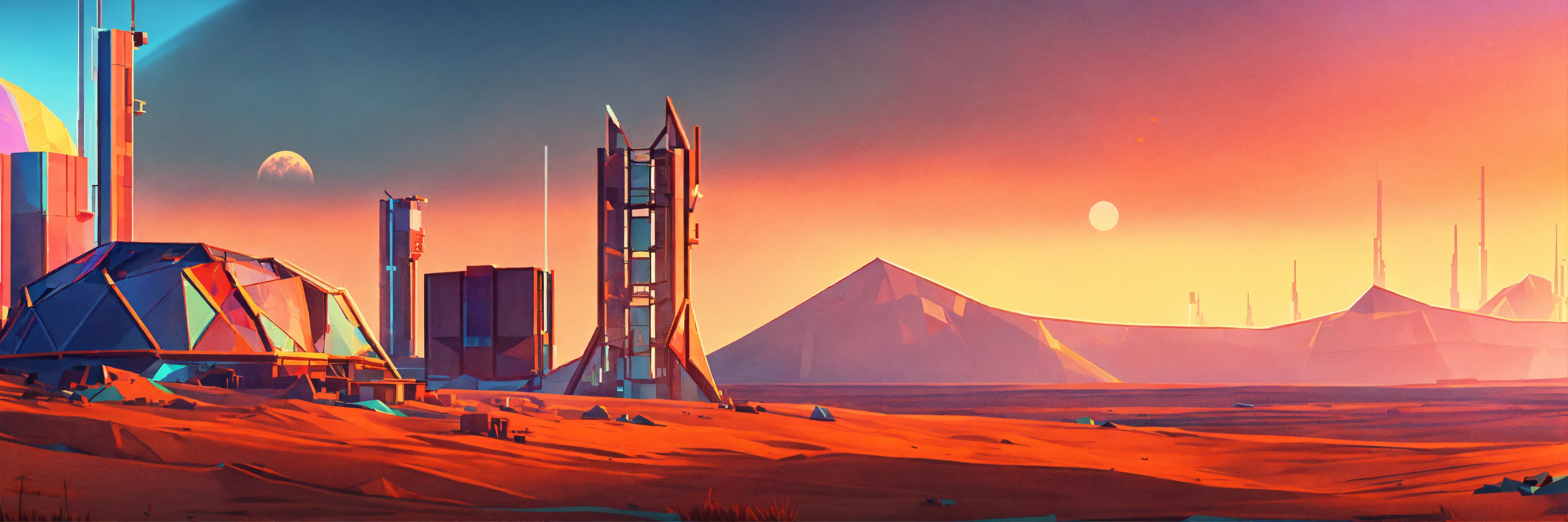 A cinematic low poly attractive background with more orange, little blue and sunset colors with only a few far distant blurred sci-fi abandoned constructions on the empty planet, beautiful, a minimalistic masterpiece, patterns, behance, ilm.