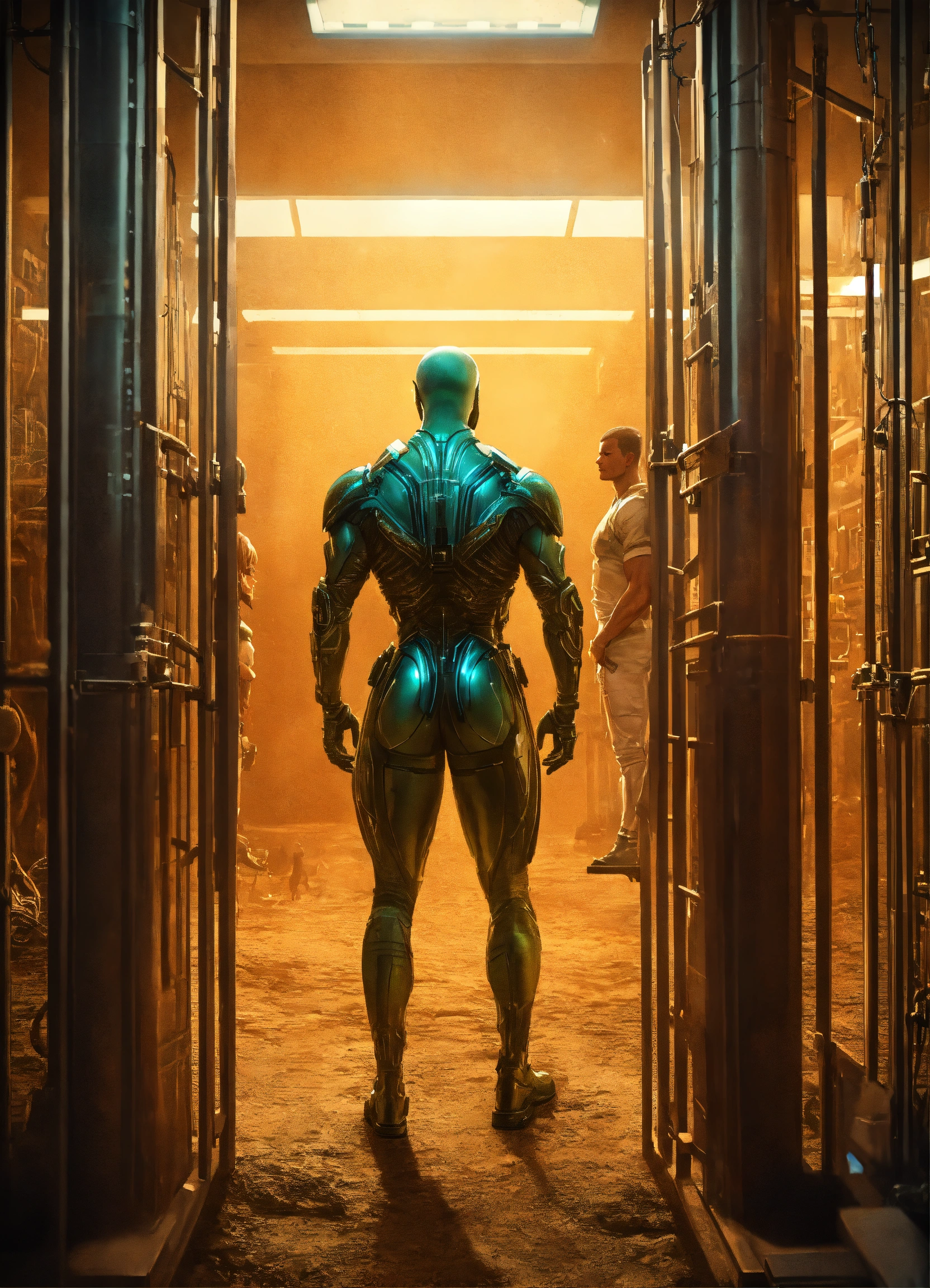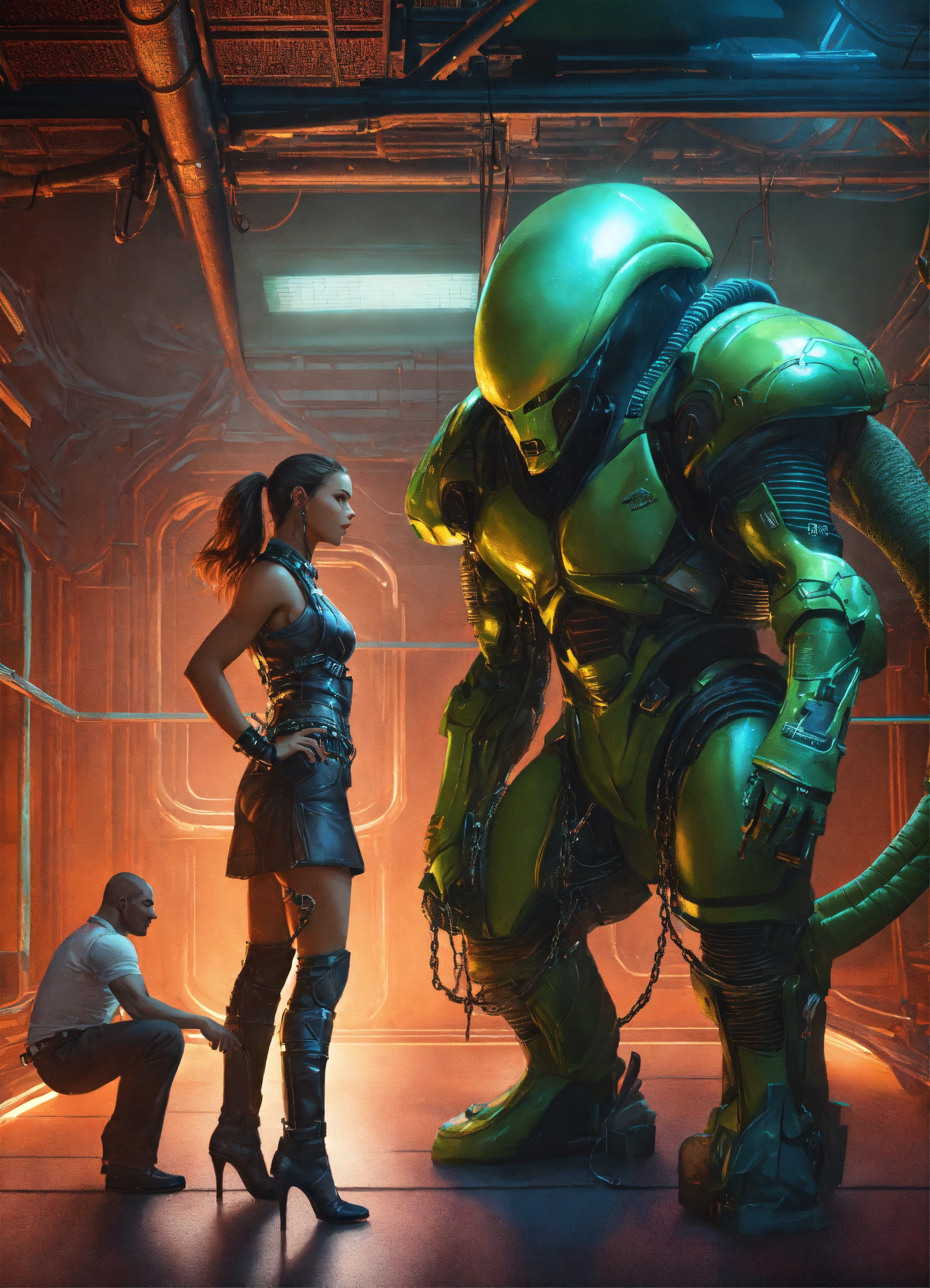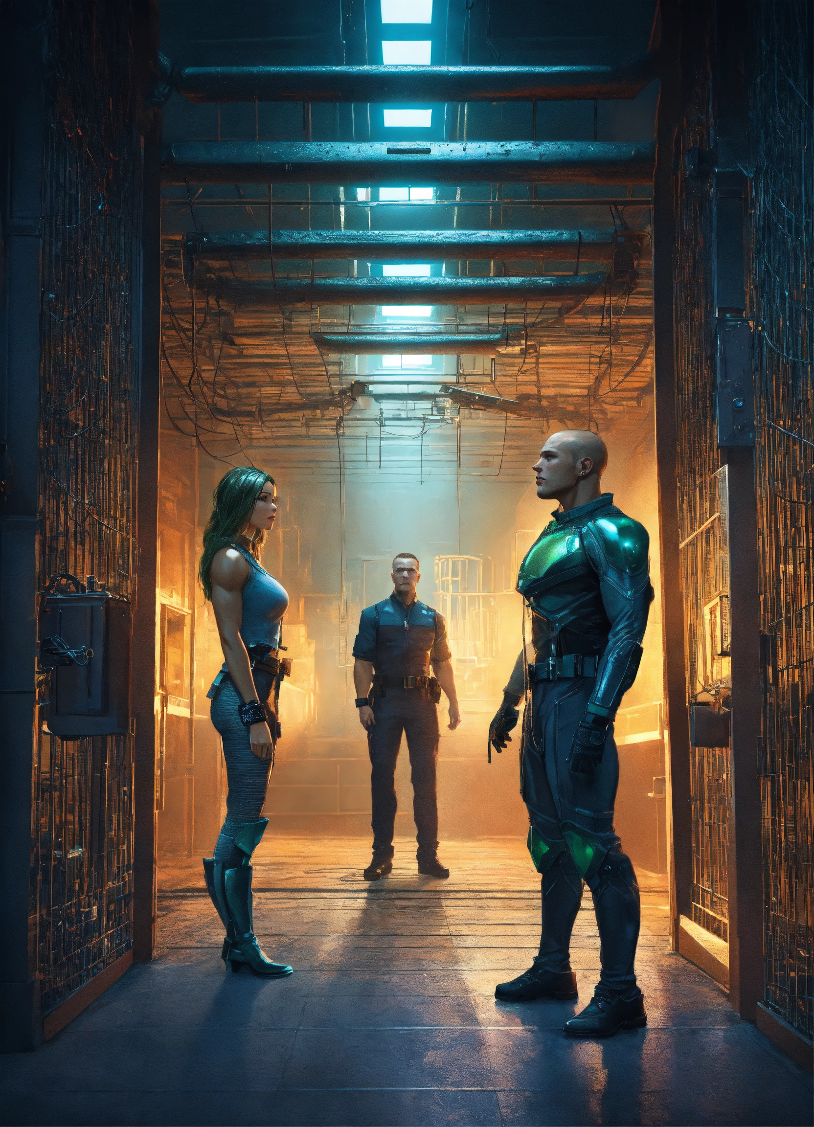 Human male and female captives in an alien prison chained inside a futuristic alien prison with glass cells and a seven foot muscular strong male alien prison warden watching, fantasy, high detail, realistic photo, high detail, digital painting, cinematic, stunning, hyper-realistic, sharp focus, high resolution 8k, insanely detailed