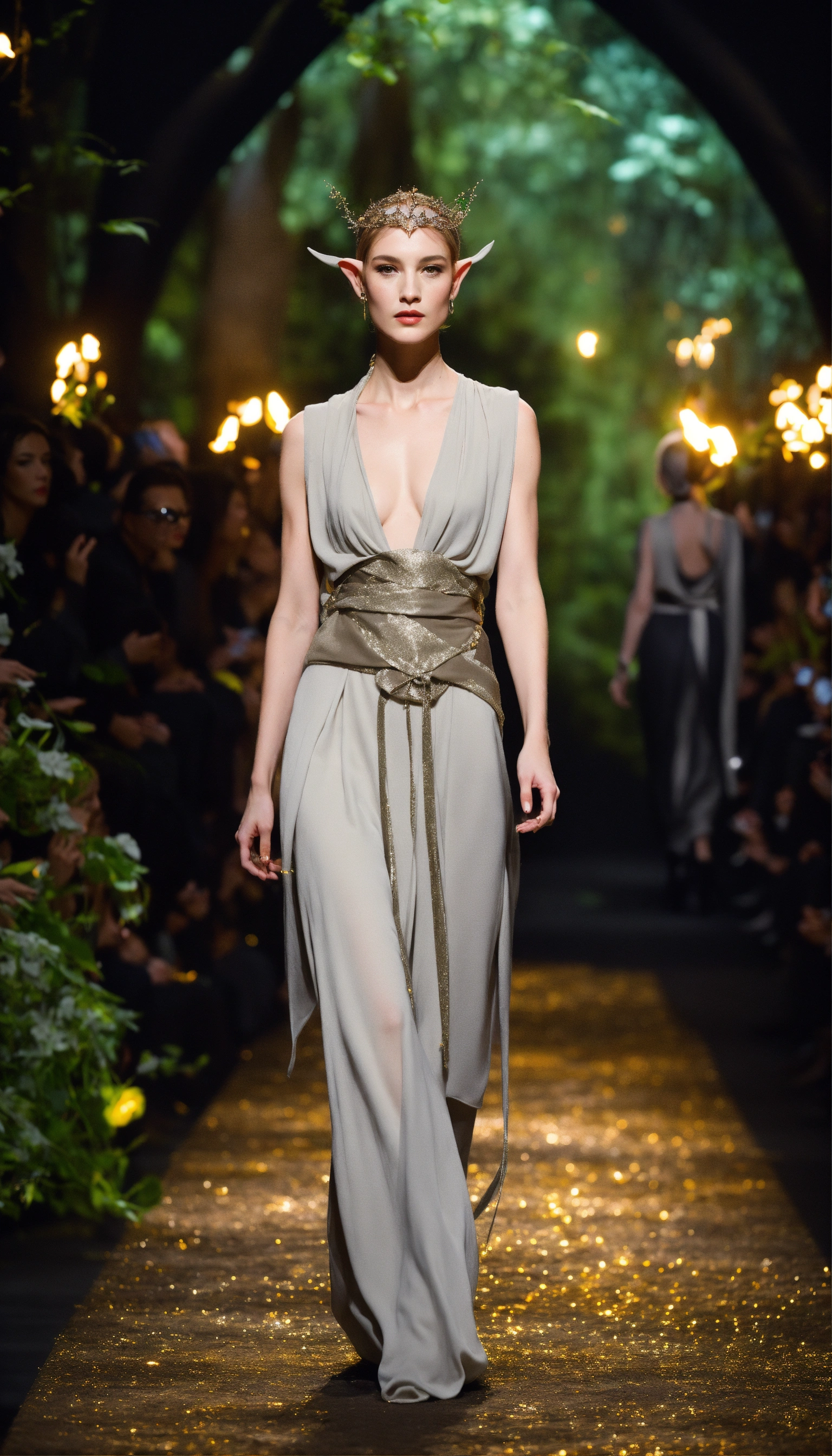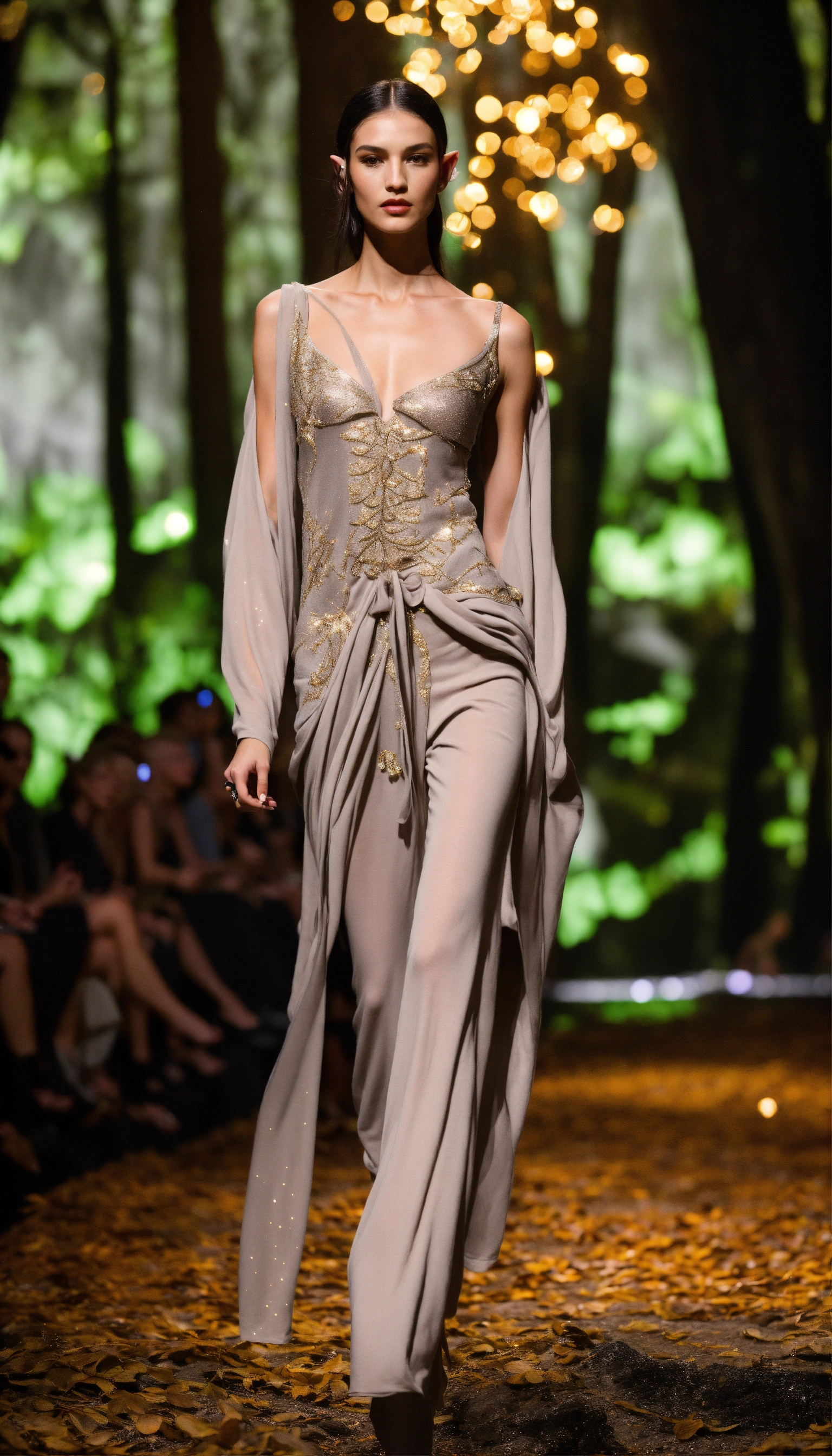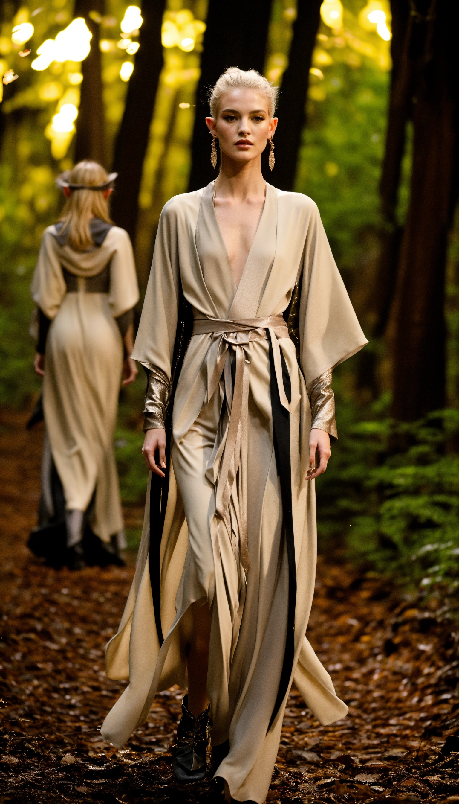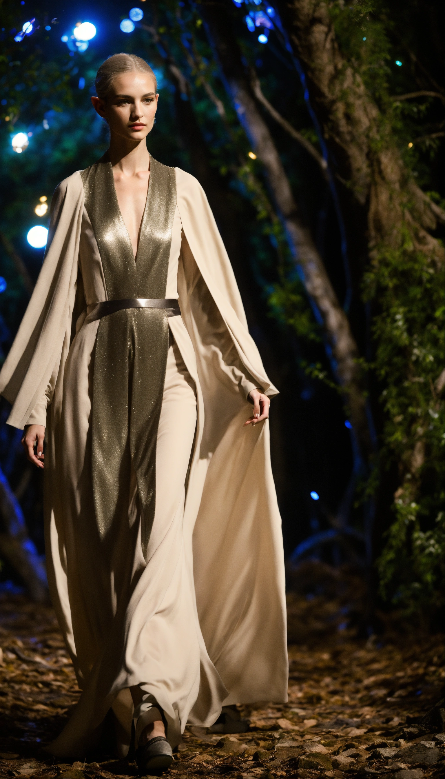 Lothlorien androgynous elves walking runway during elvin fashion week wearing dolman sleeve elvish donna karan fashion in black, white, grey, beige, stone, metallics, shimmer at an enchanted forest runway at starry nighttime, fireflies