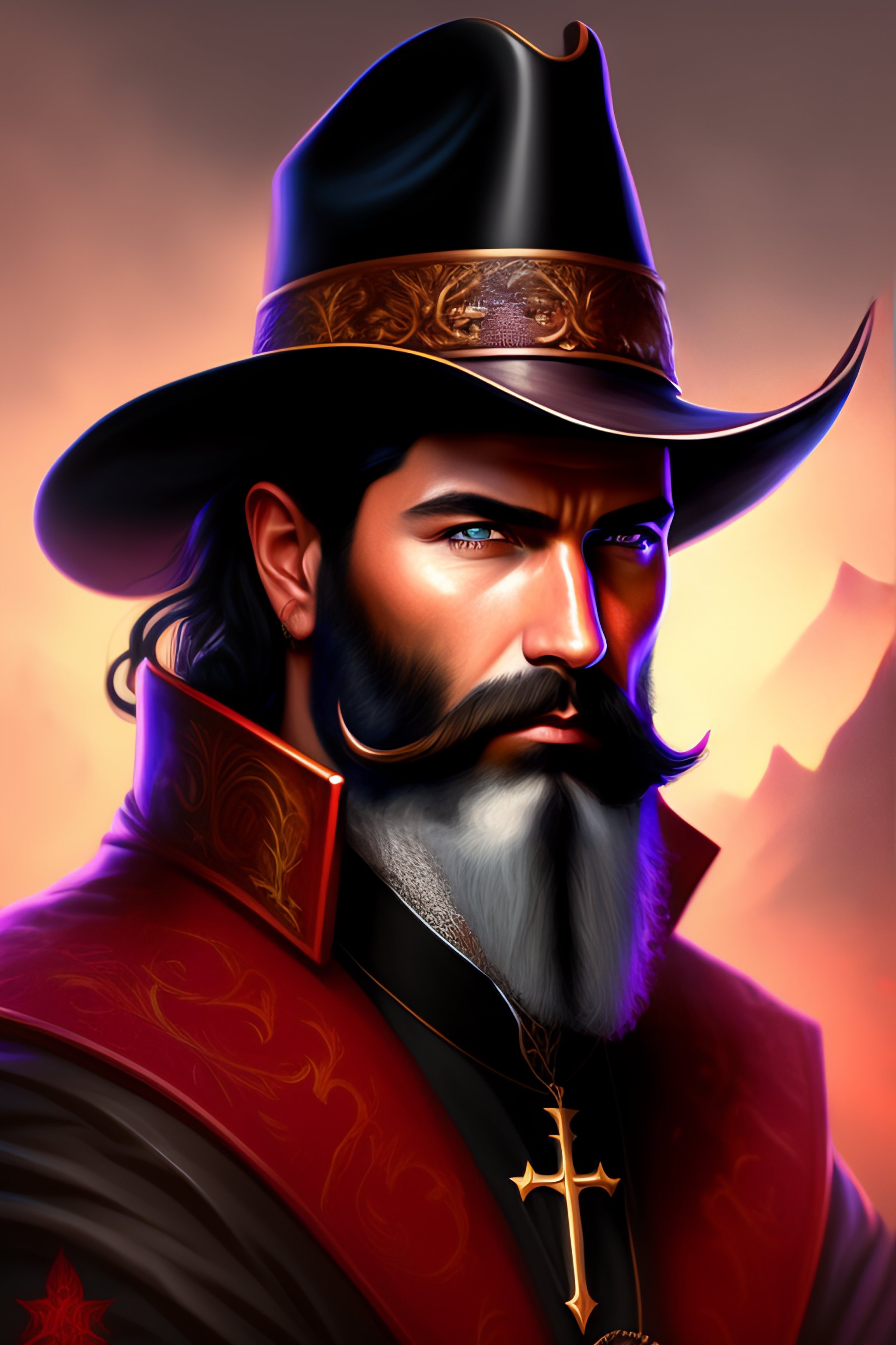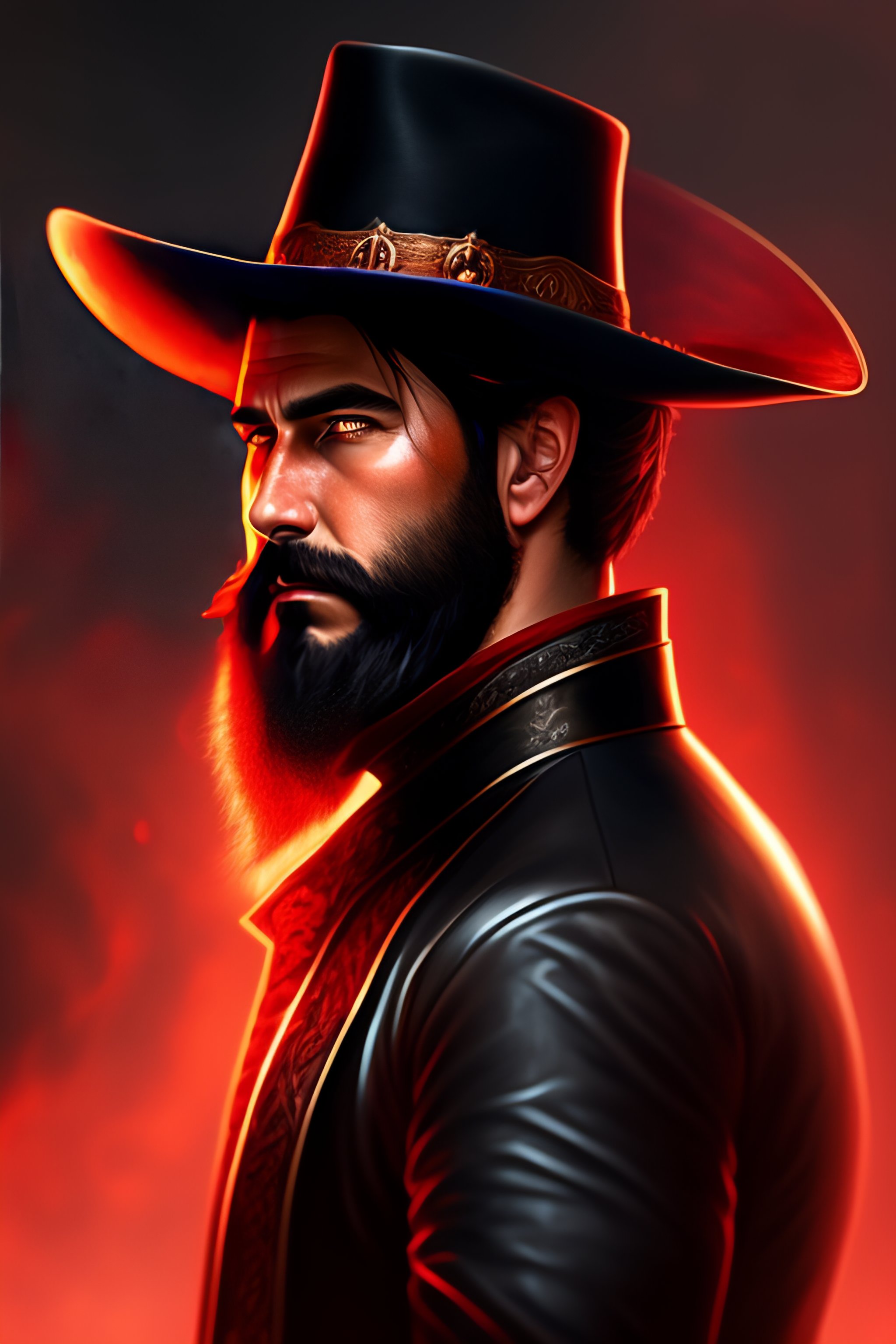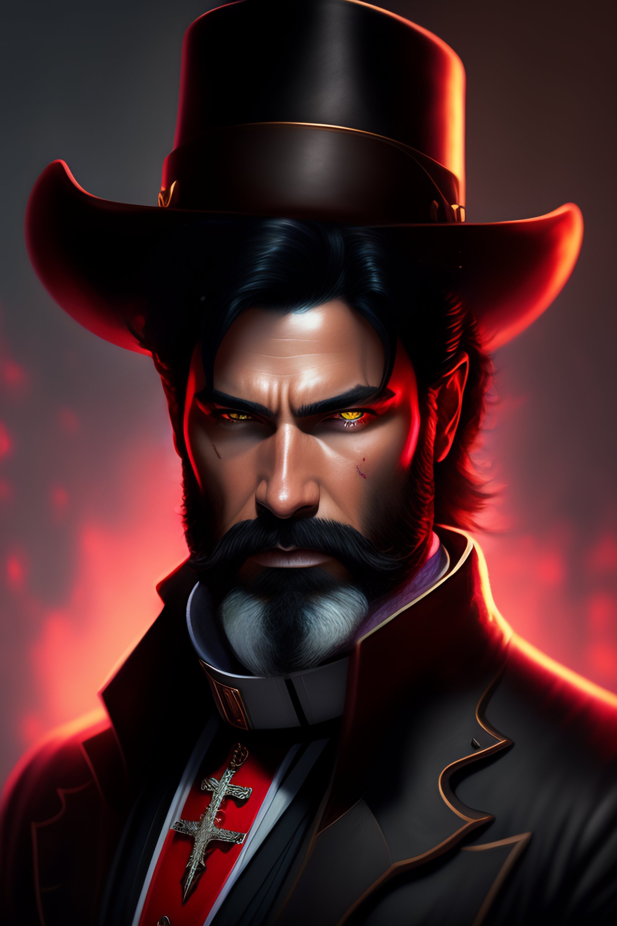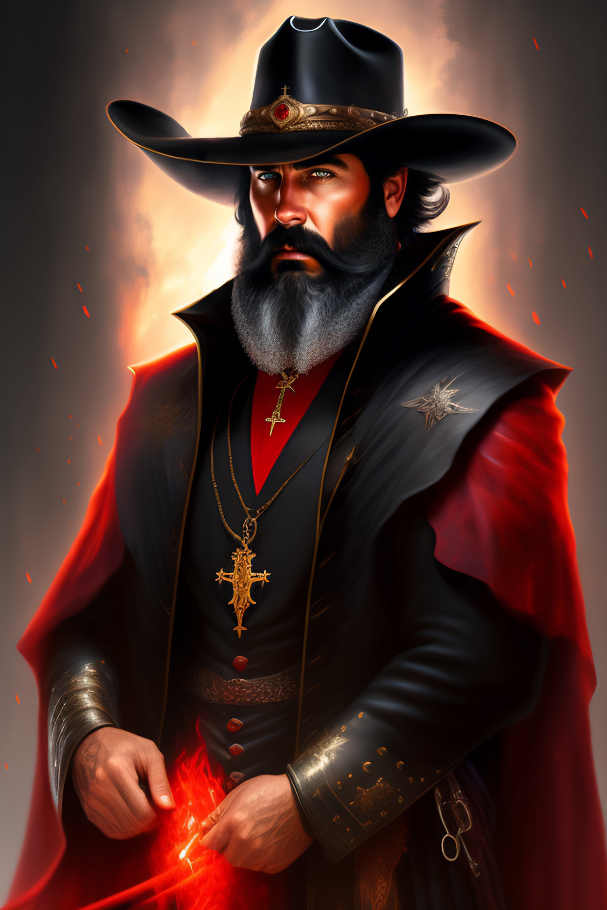 American catholic priest cowboy 50 years old man from american 1890s, black hair and beard, highly detailed, digital painting, splash art, dark, daemoniac, red ayer, black hair, half demon, powerfull wizard, evil face