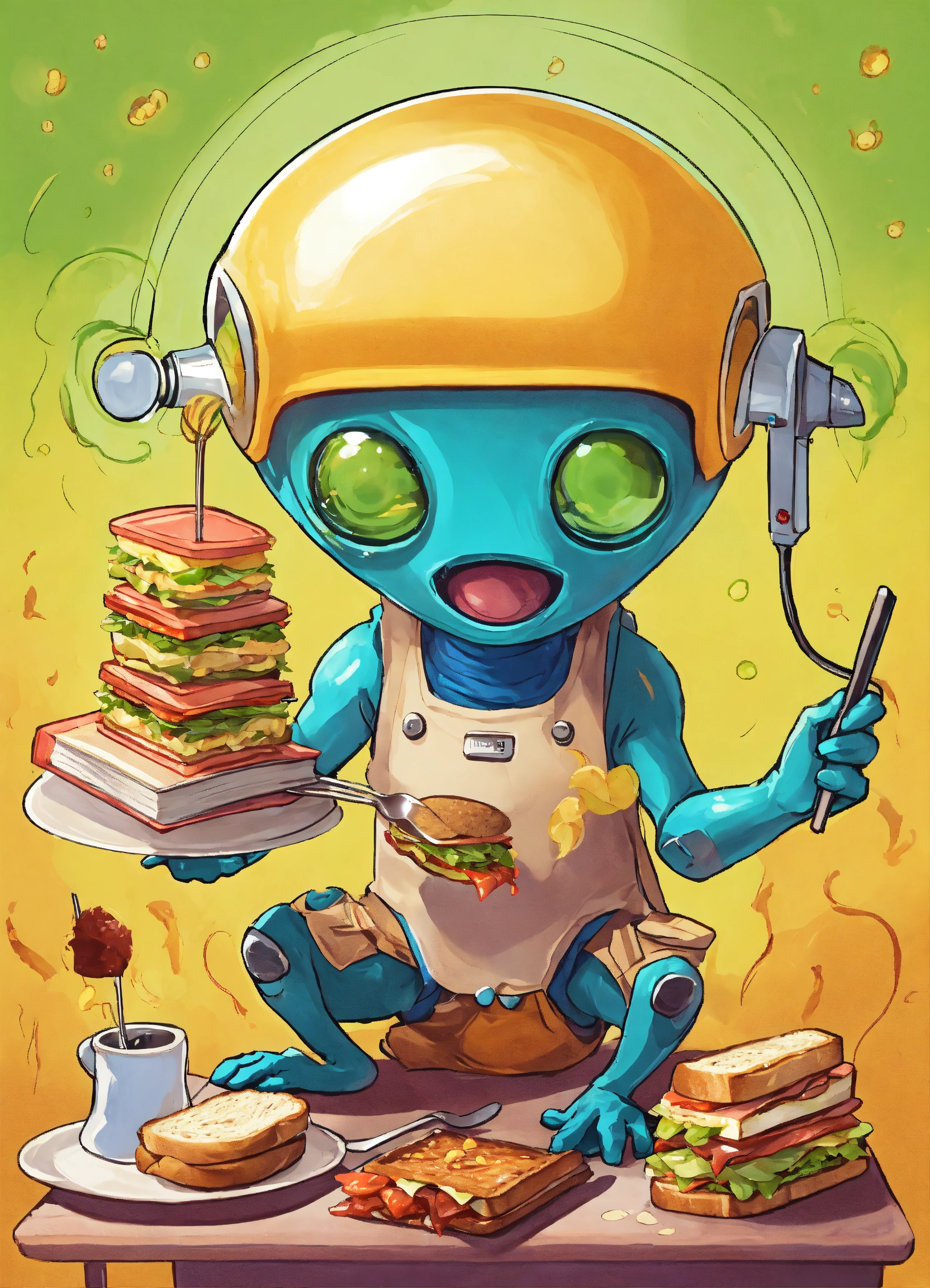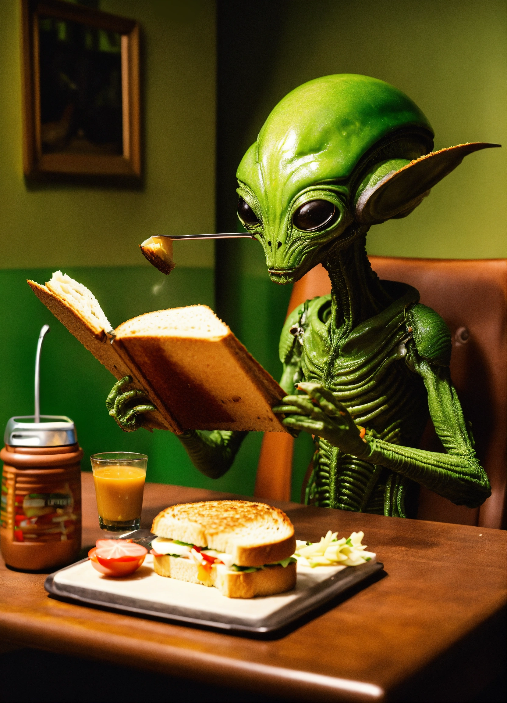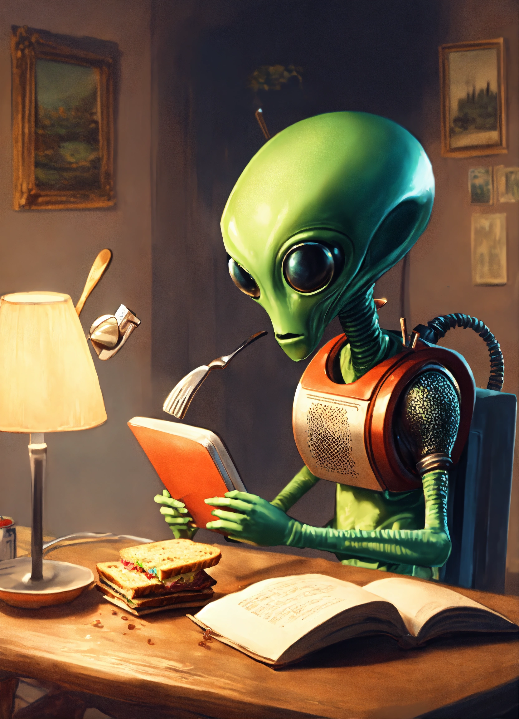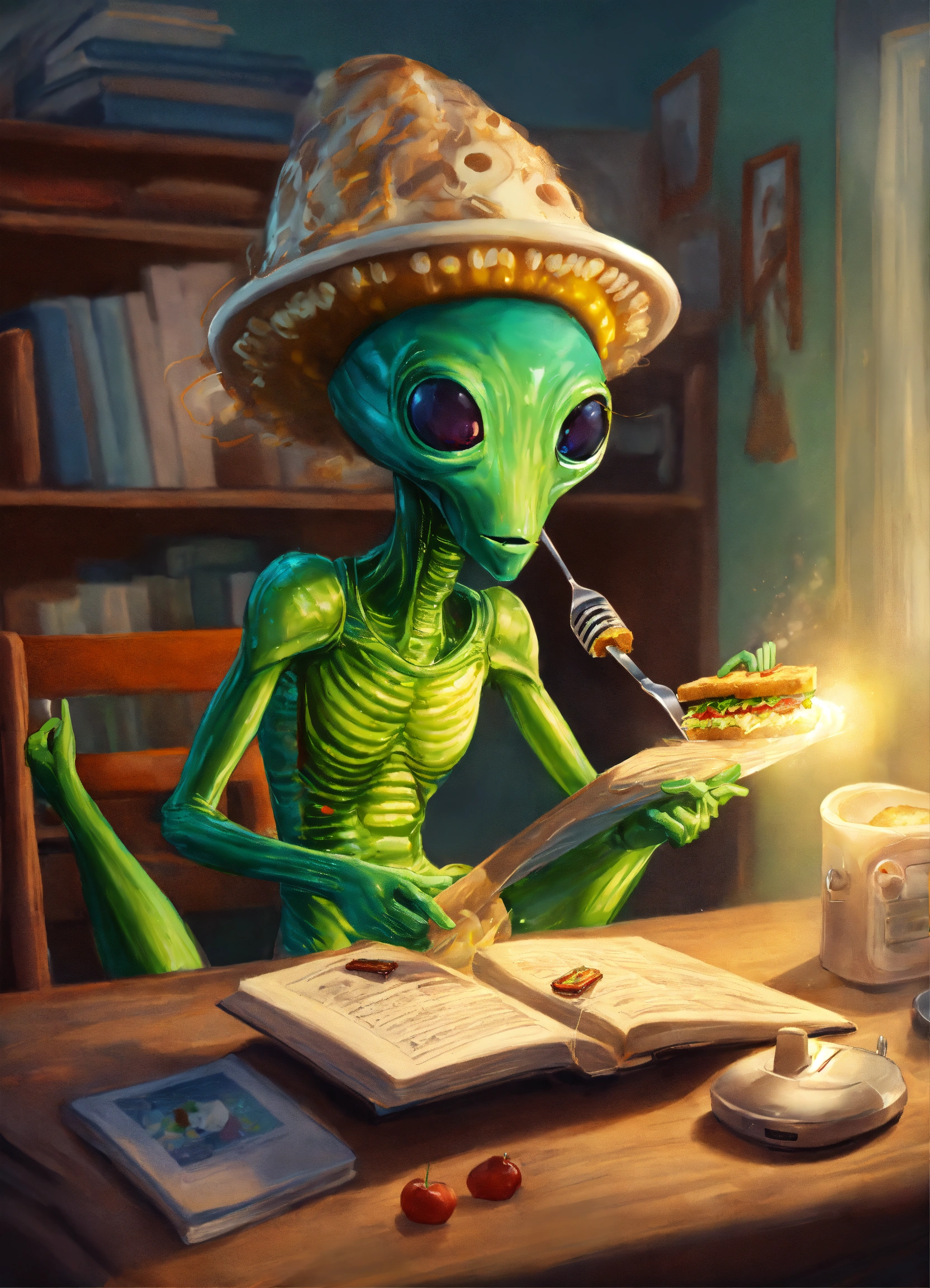 An alien trying to use everyday human items holding a fork like a phone, wearing a toaster as a hat, using a vacuum cleaner as a musical instrument, and attempting to eat a book as if it's a sandwich