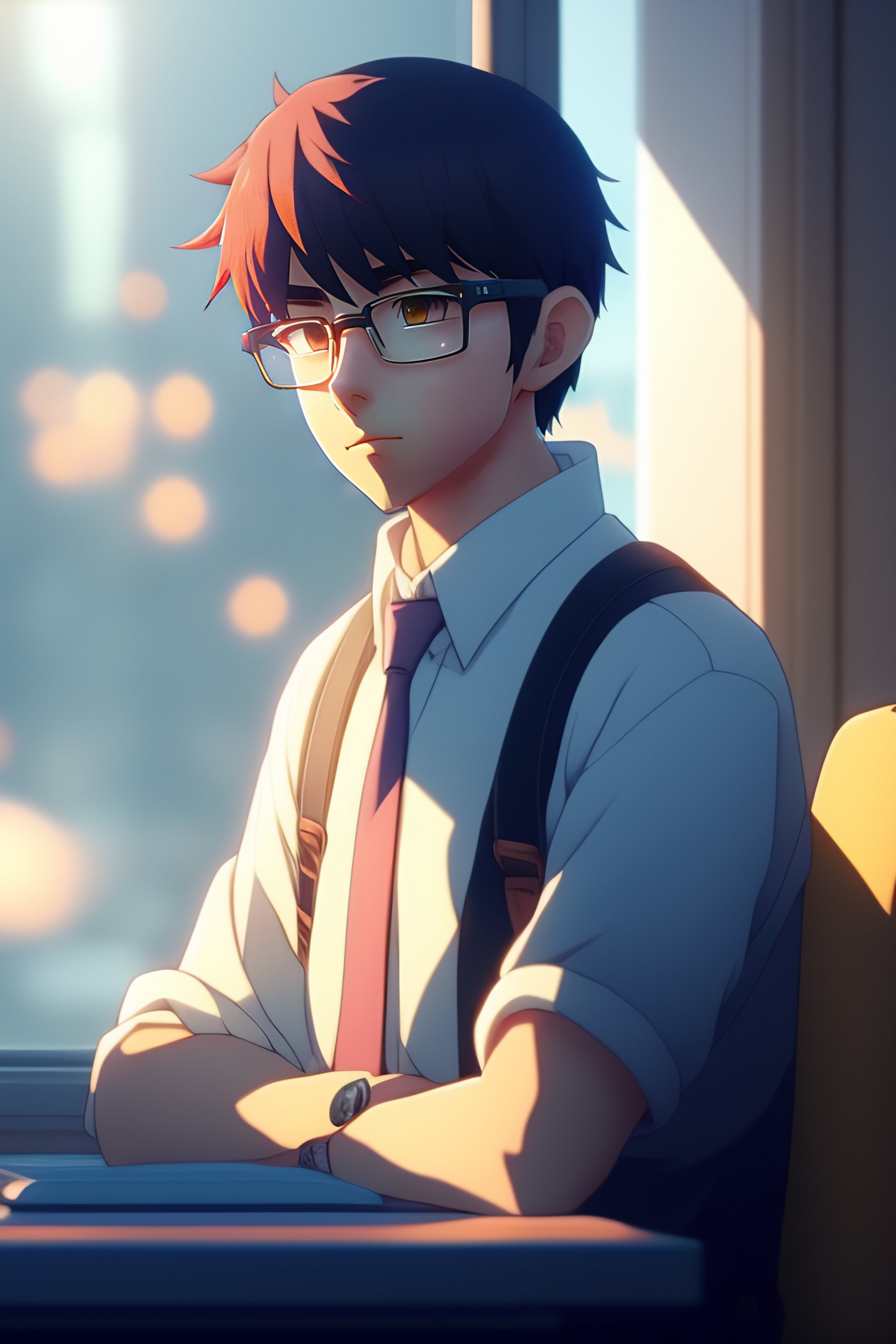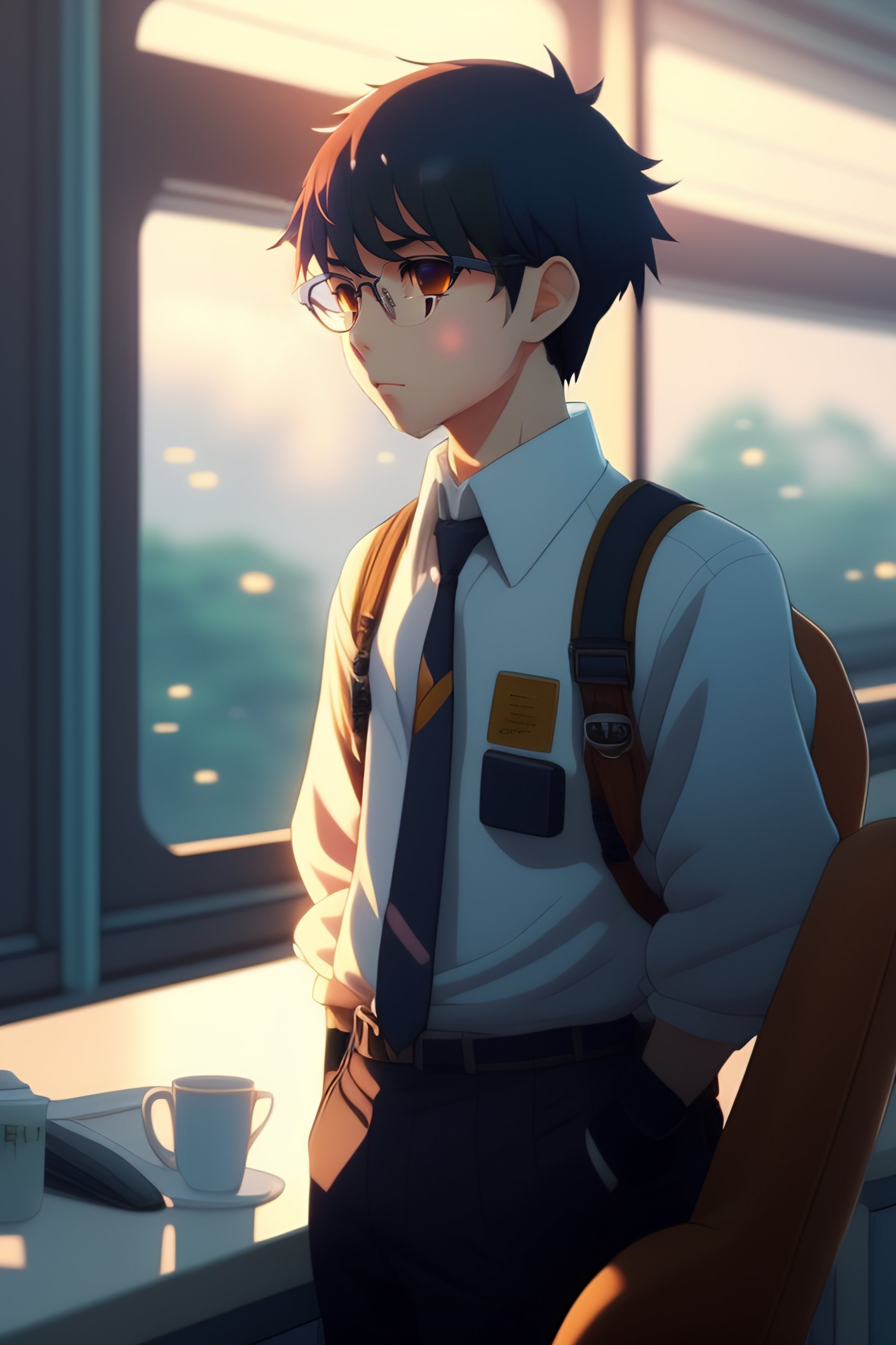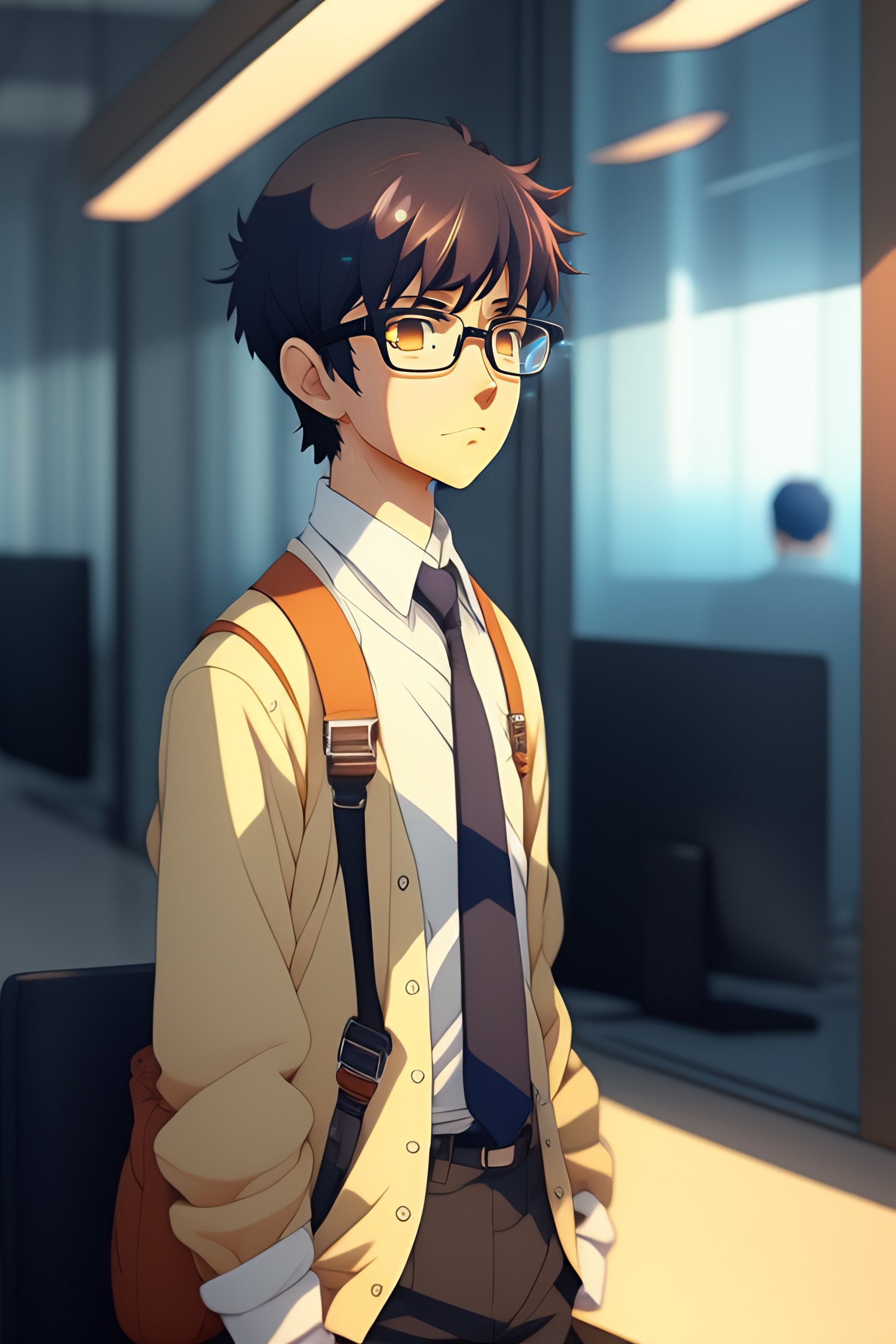 A nerdy anime boy is problem solving alone thinking about problems looking for solutions, in the office, by makoto shinkai and ghibli studio, dramatic lighting, highly detailed, incredible quality, trending on artstation