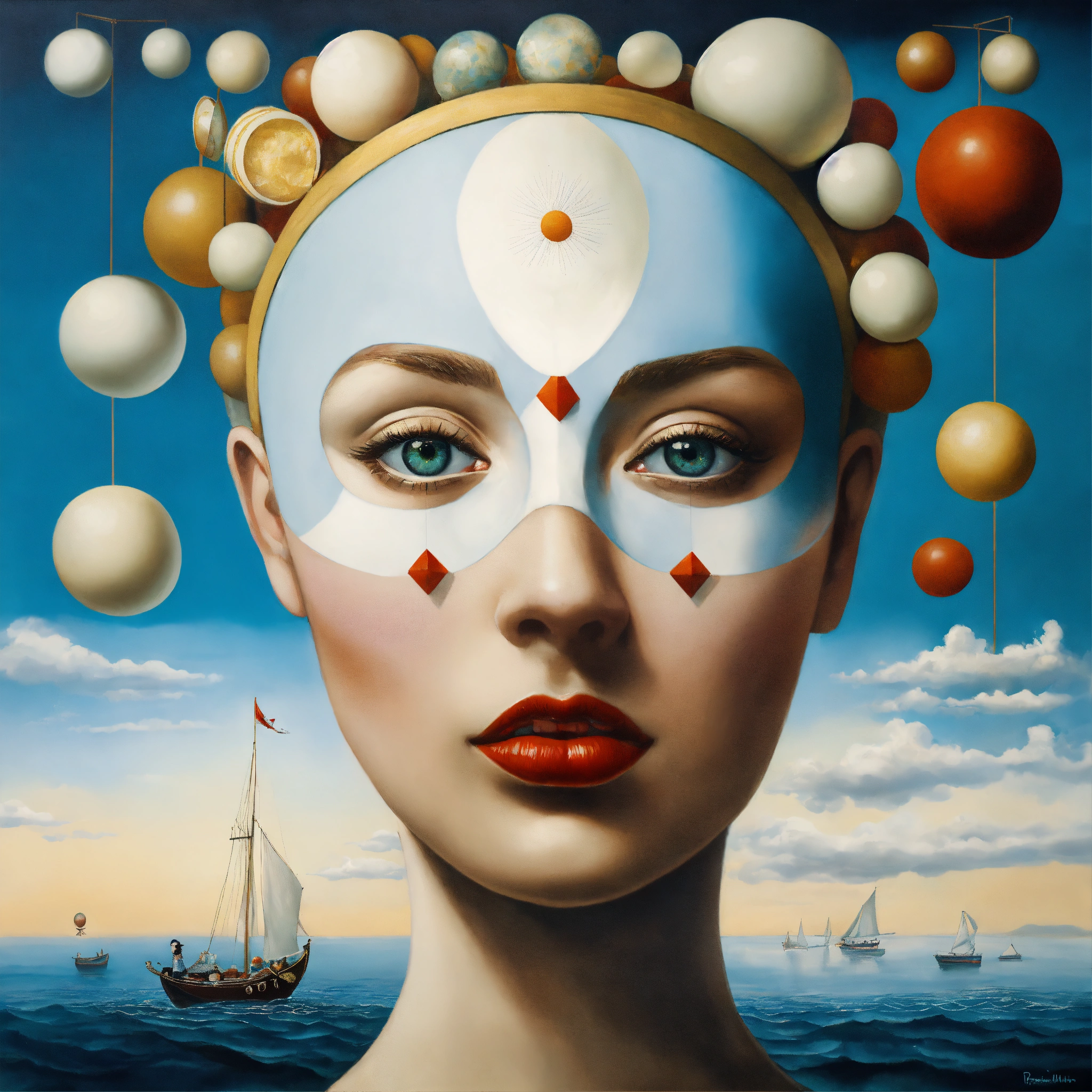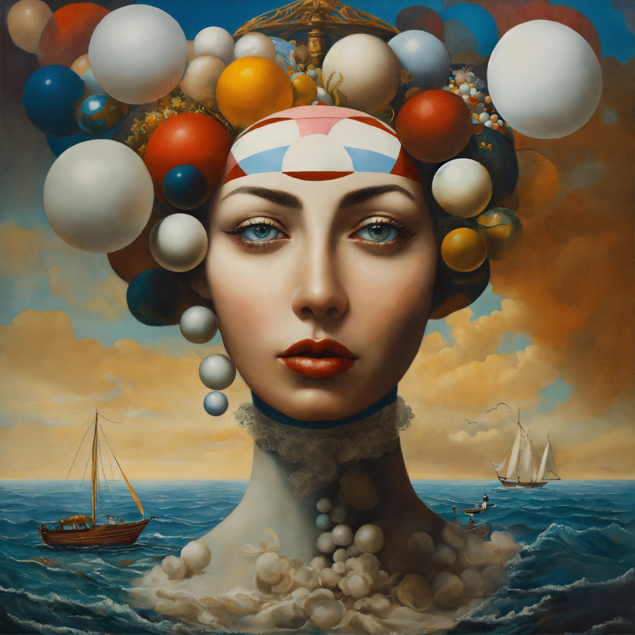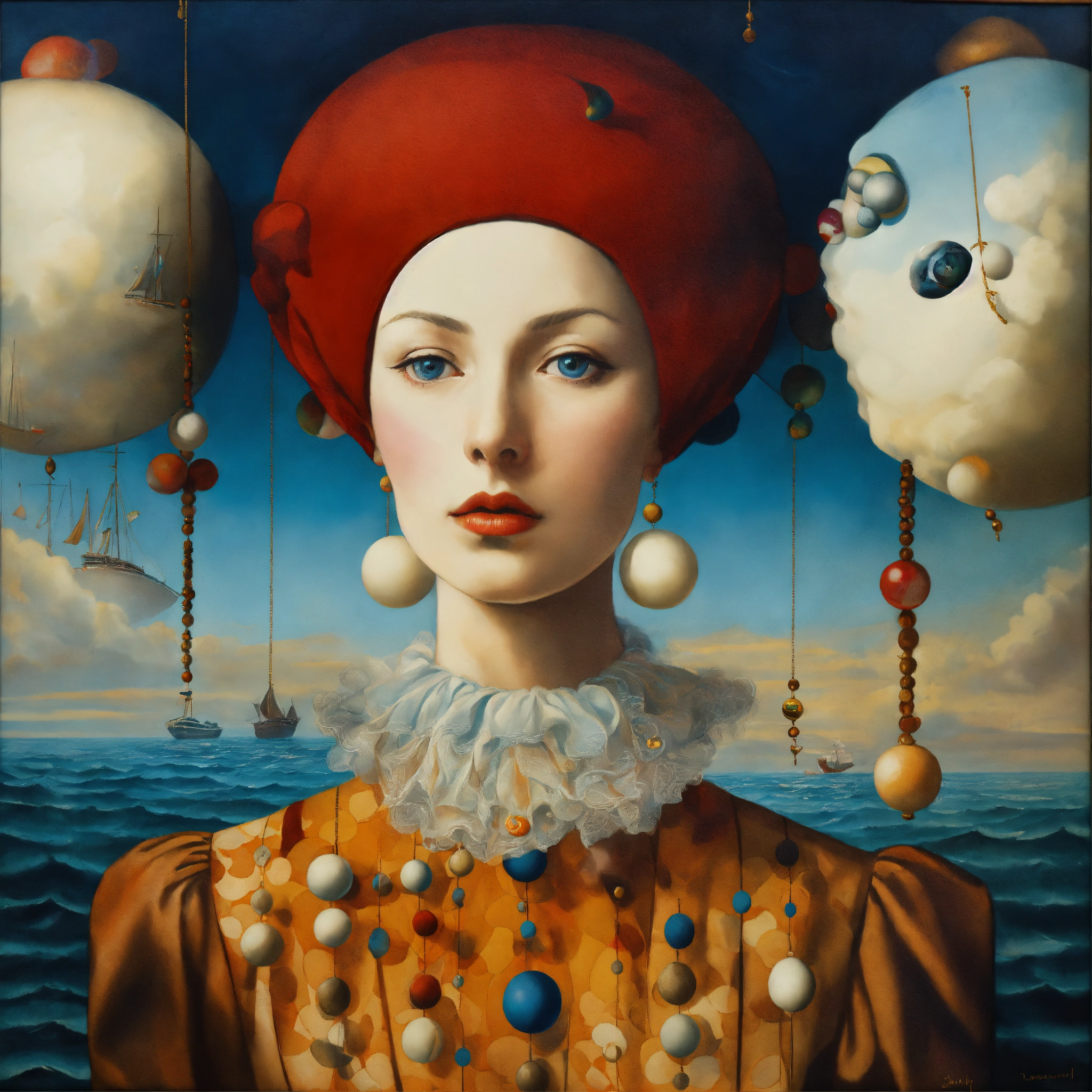 A close up portrait of elegant female humpty with pale white face with eyes looking straight at you. also a harlequin lady with juggling balls on a boat on choppy sea scape by rené magritte. more surrealism and madness. much more surrealism and crazy designs. with surreal clouds, salvador dali clouds coming out of her head. more surrealism and crazy ideas. like a circus theme.
