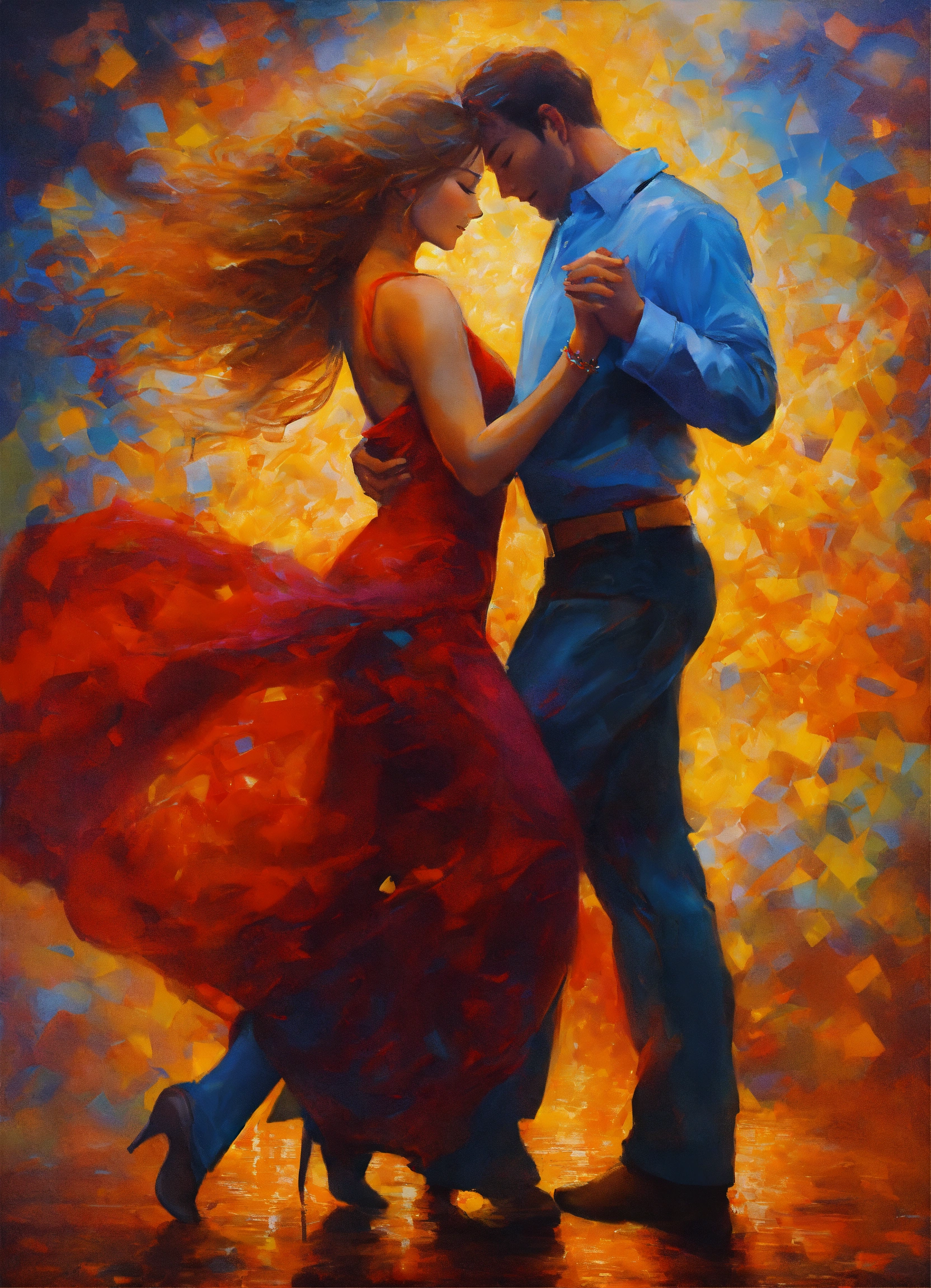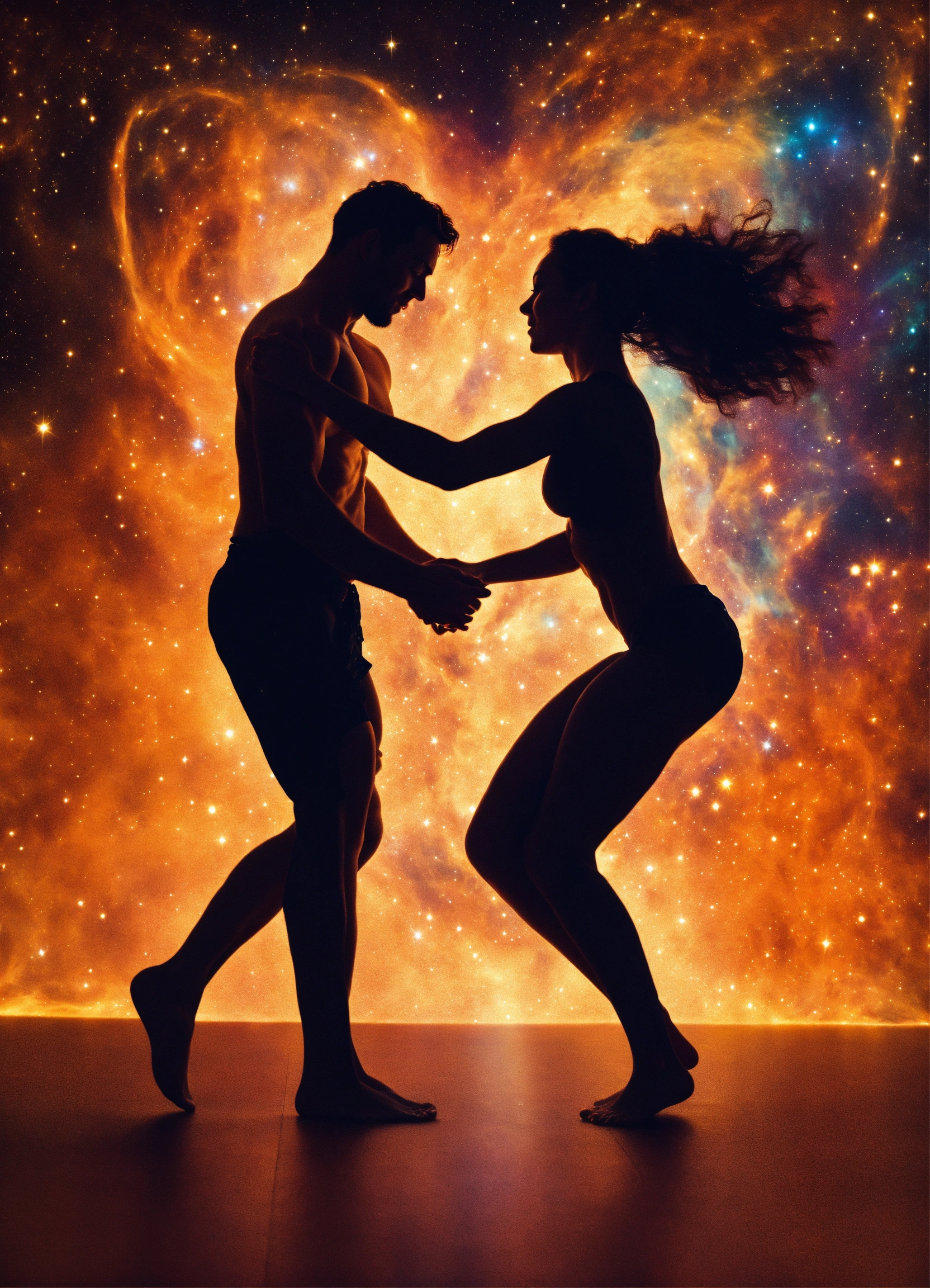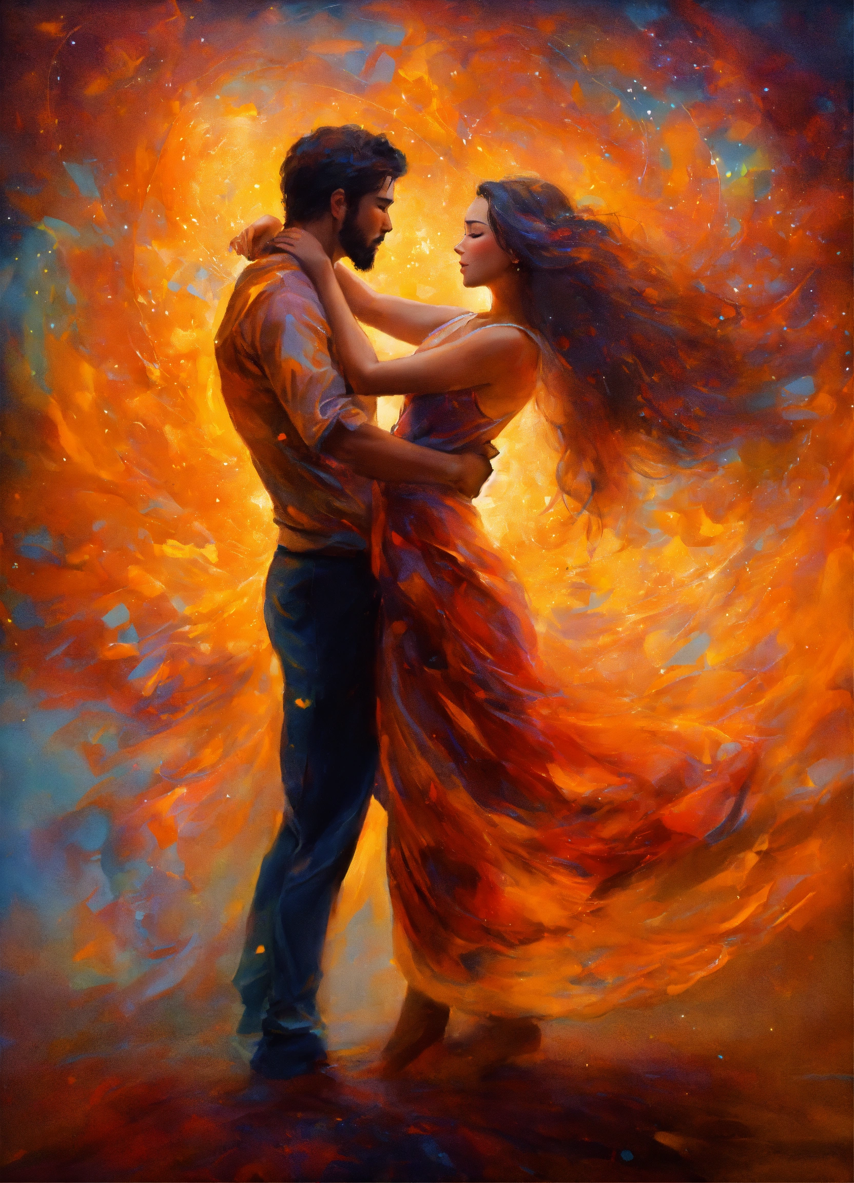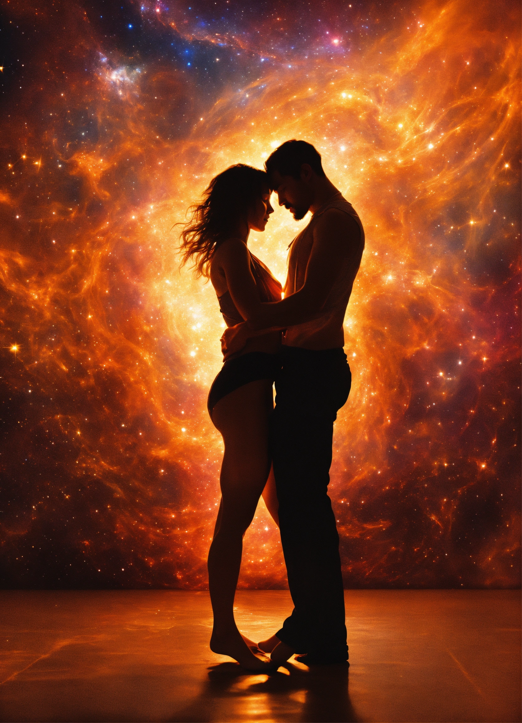Man and woman together in love, connected, full body, merging together, dancing, passion, warmth, soul, cosmic