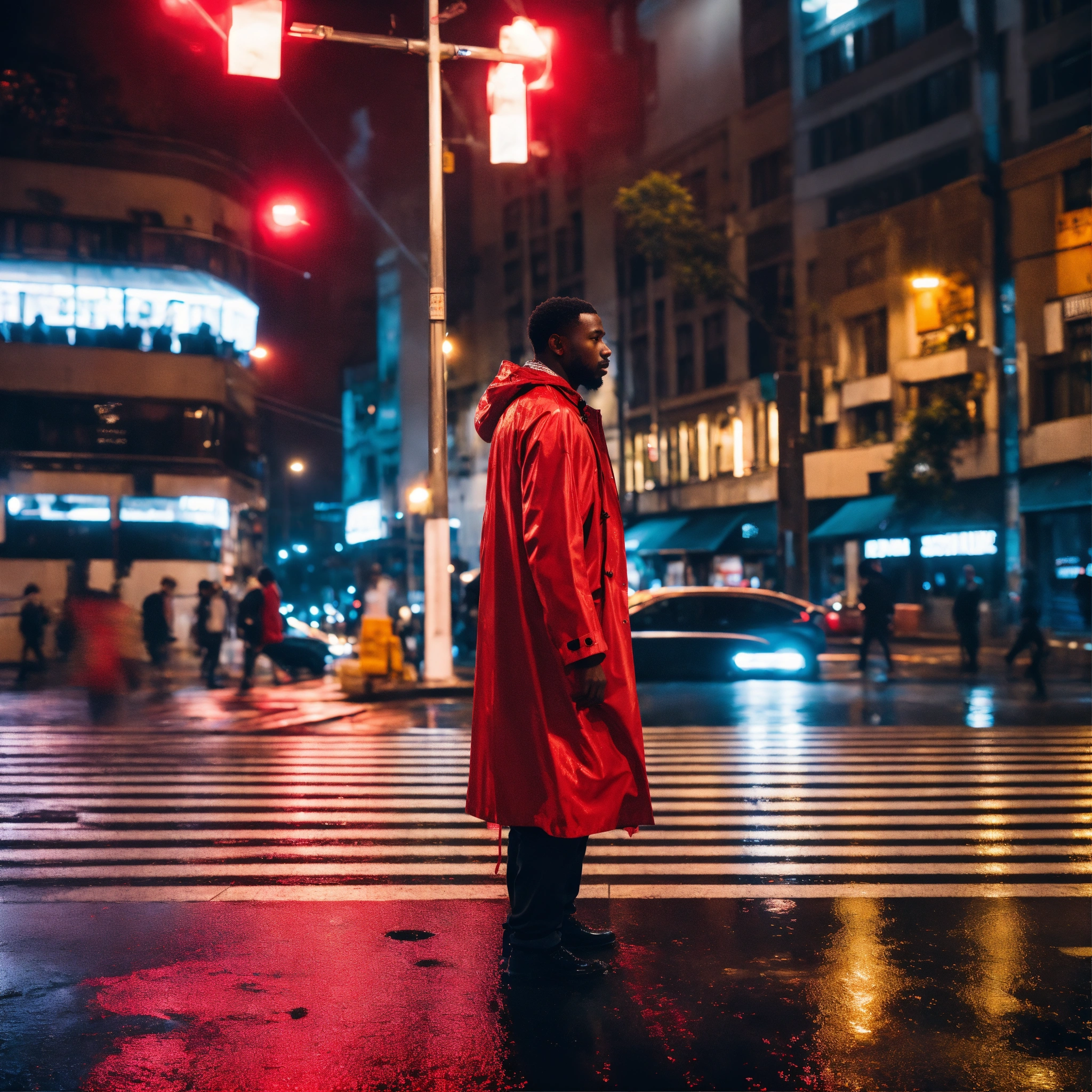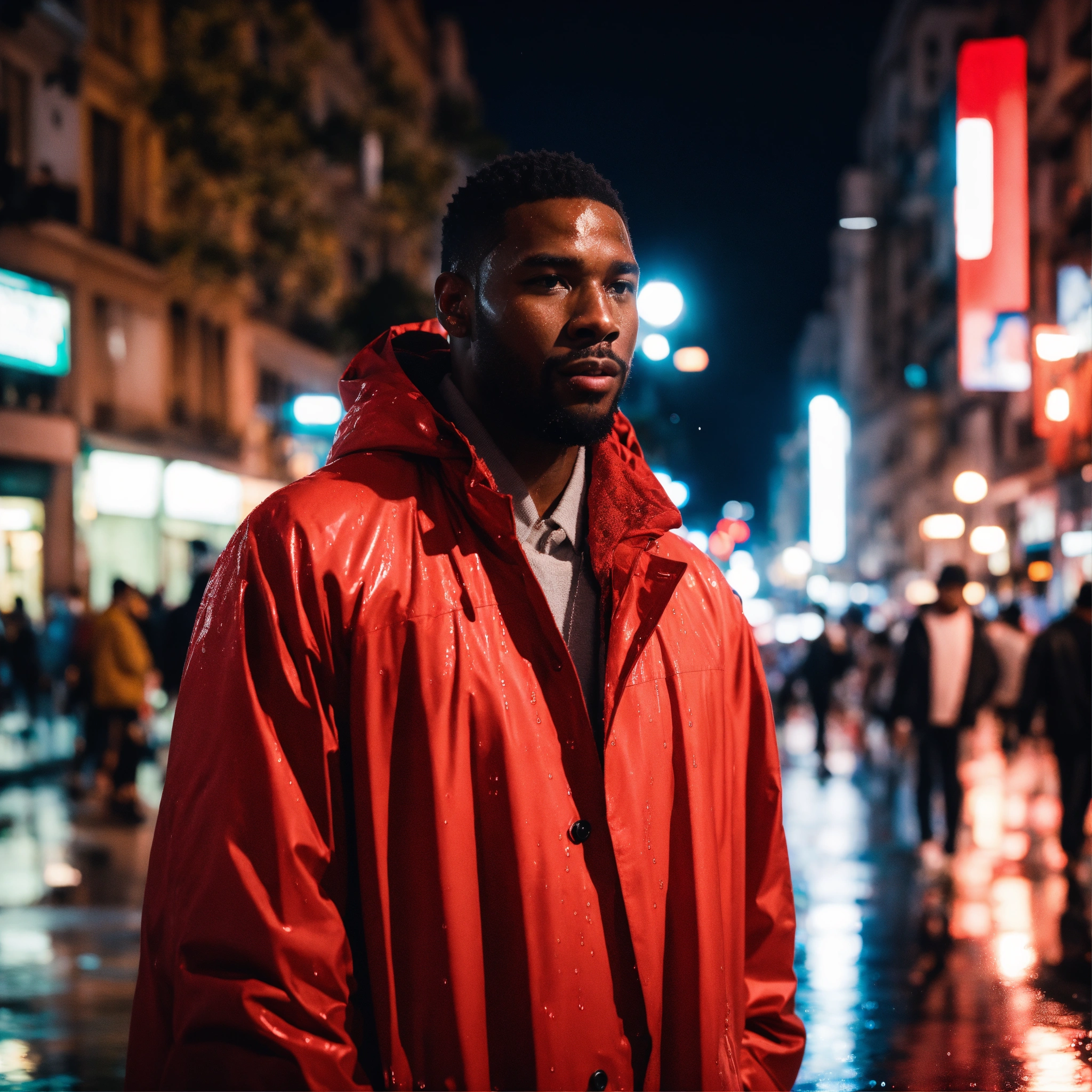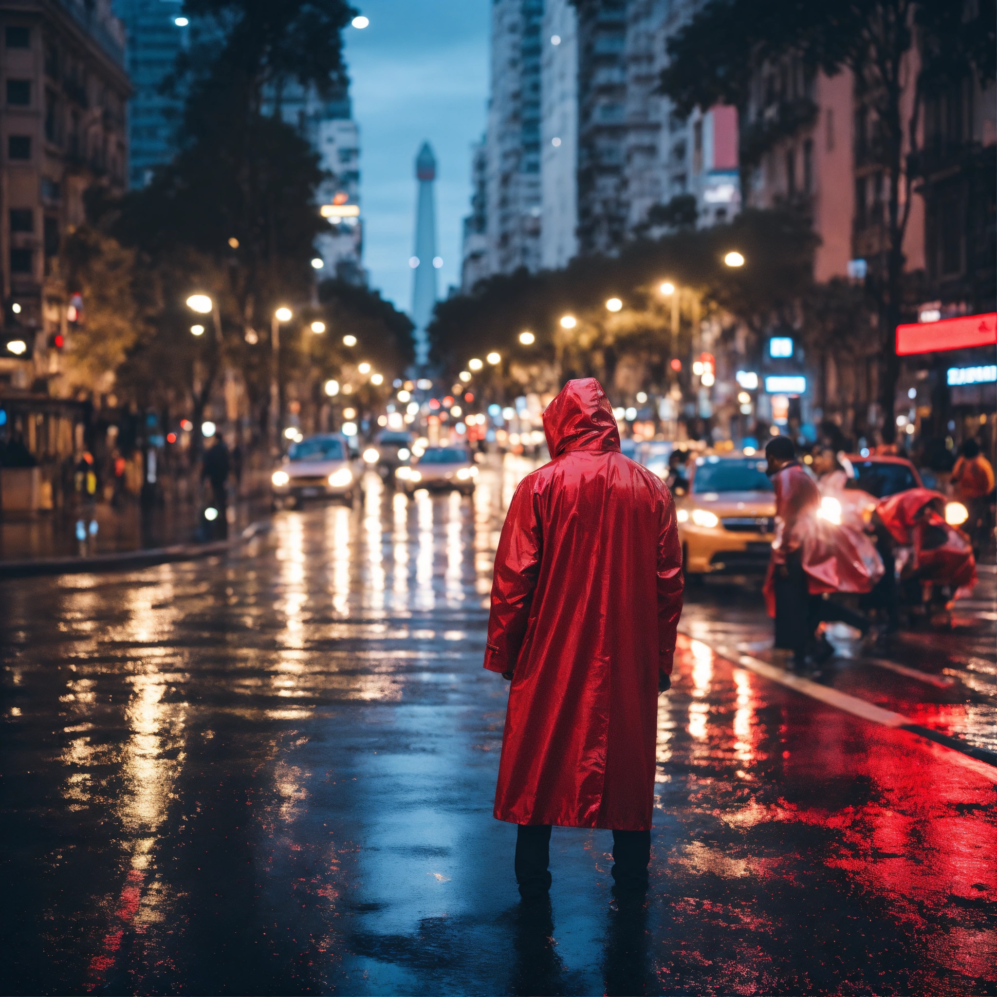 8k photo portrait of a black men in a red raincoat, at a bustling crosswalk in buenos aires, argentina, obelisk at night, highly detailed, vibrant, production cinematic, reflections on wet street, 8k, film grain