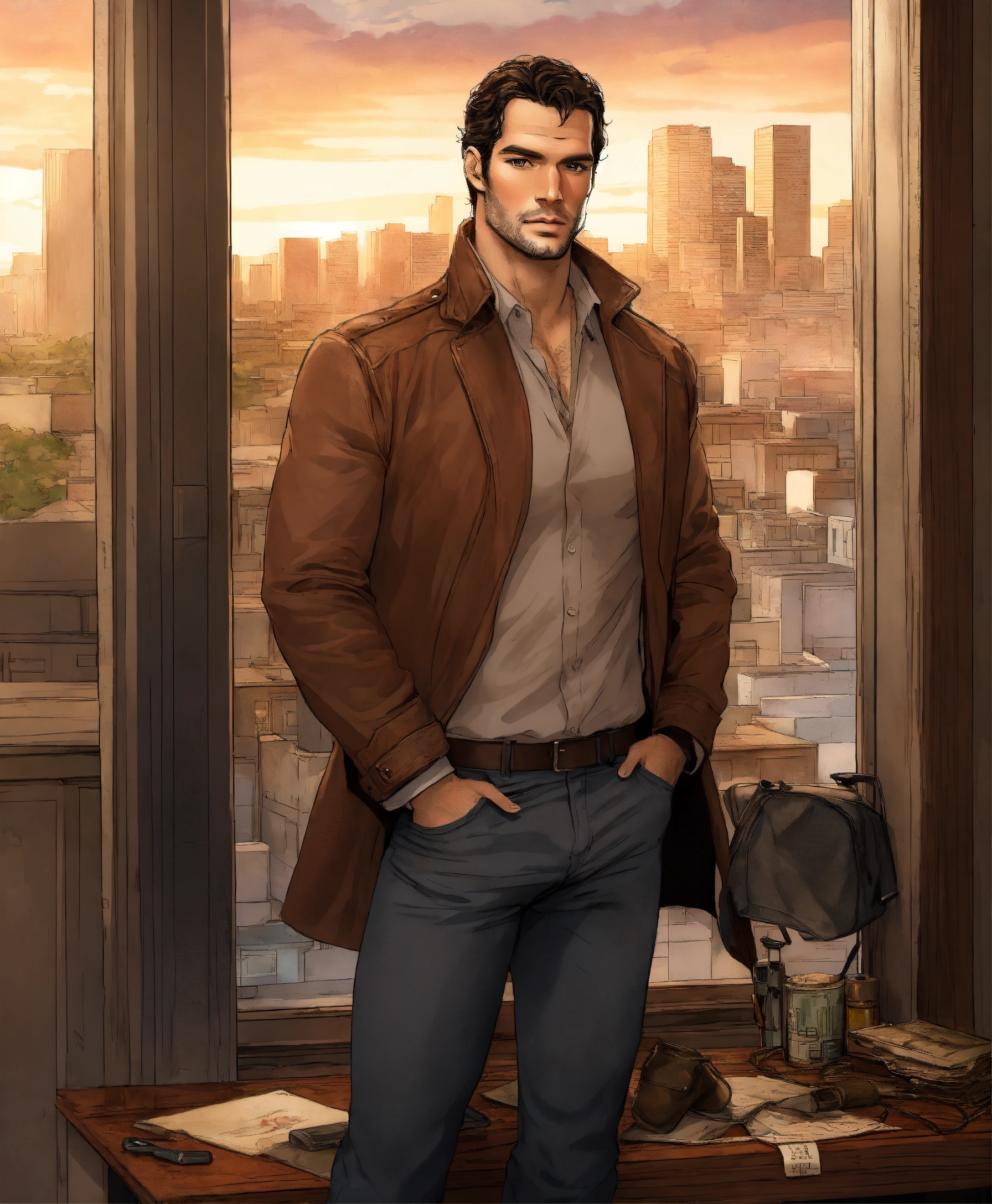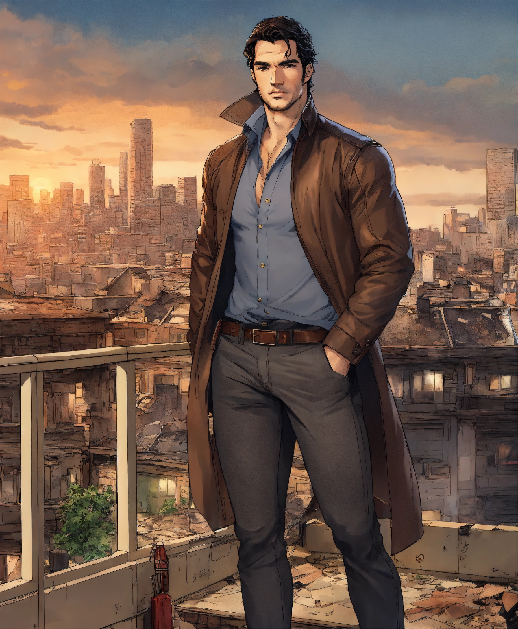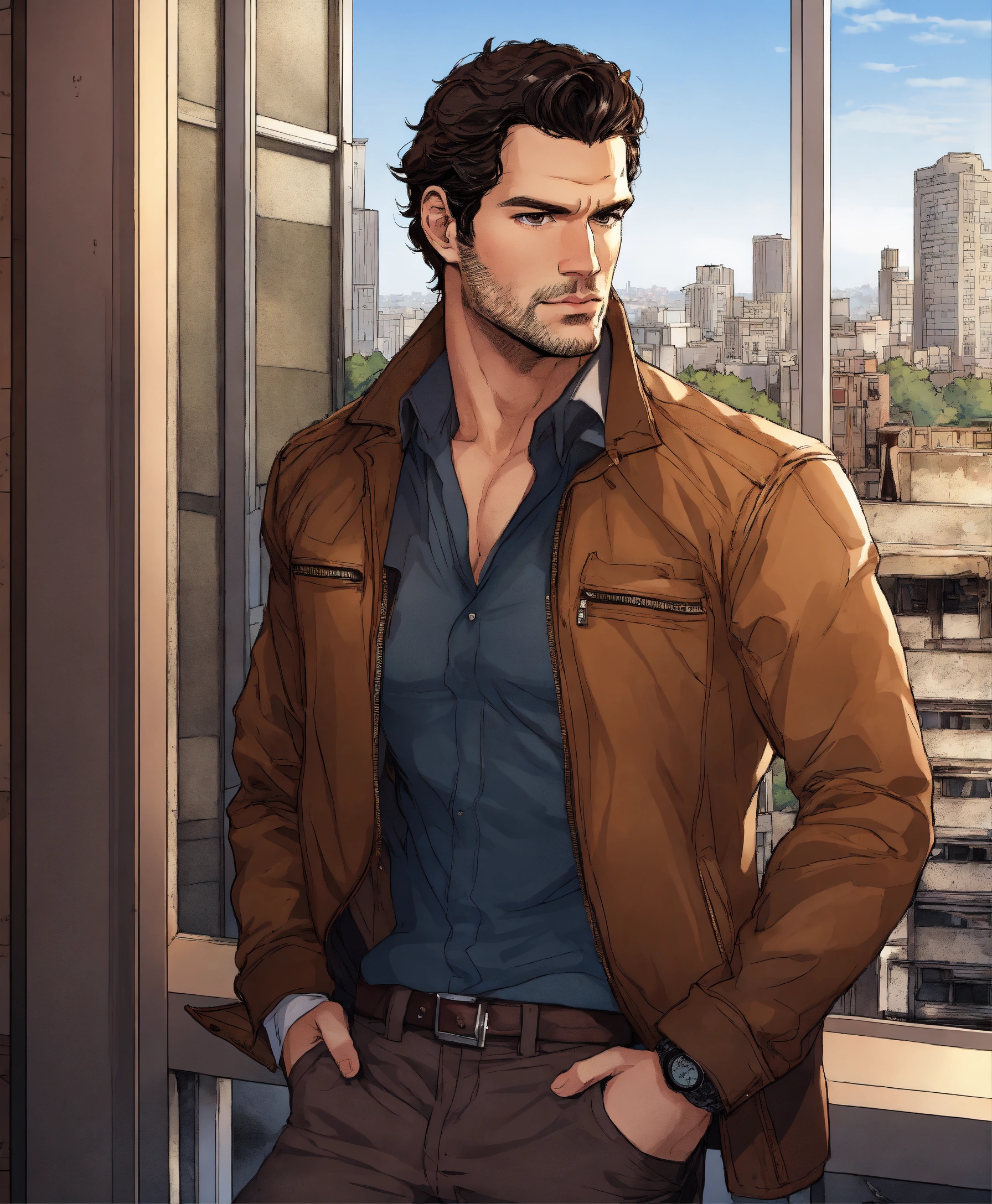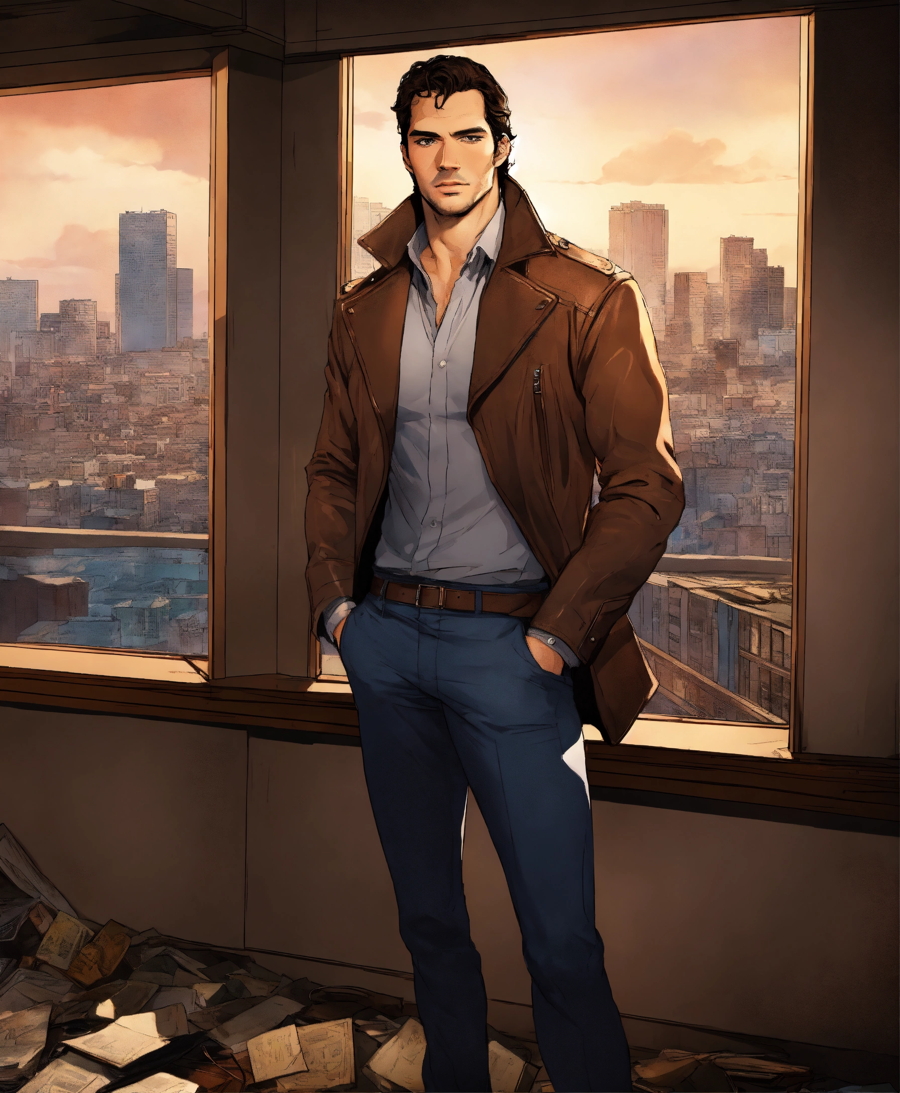 Anime manga type illustration, inside a derelict apartment, like todd mcfarlane, a 35-year-old male, henry cavill head, private detective, brown hair. handsome man, 1, 85 meters tall, elegant pants and shirt and leather jacket, intricate, elegant, highly detailed, portland u.s city background