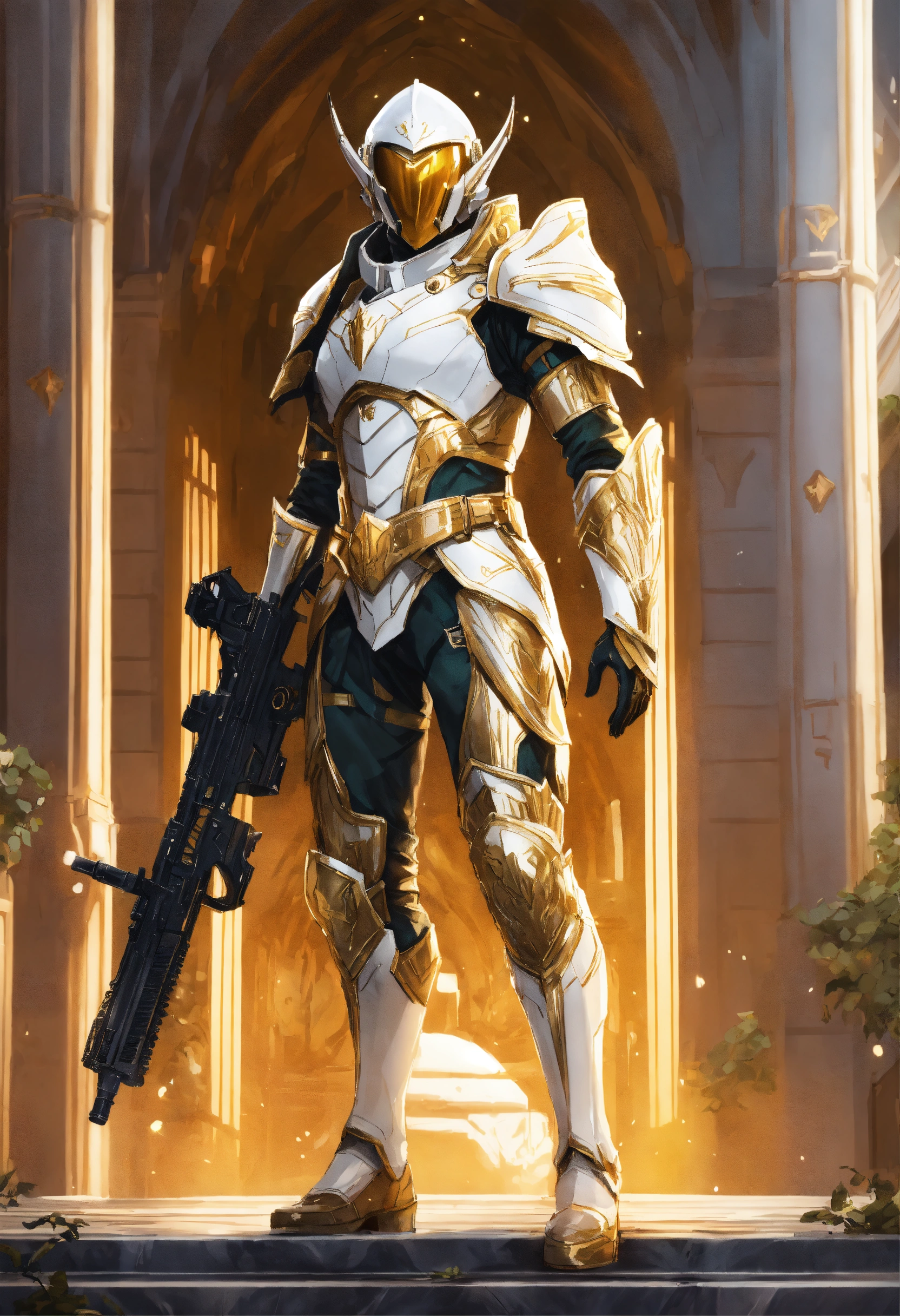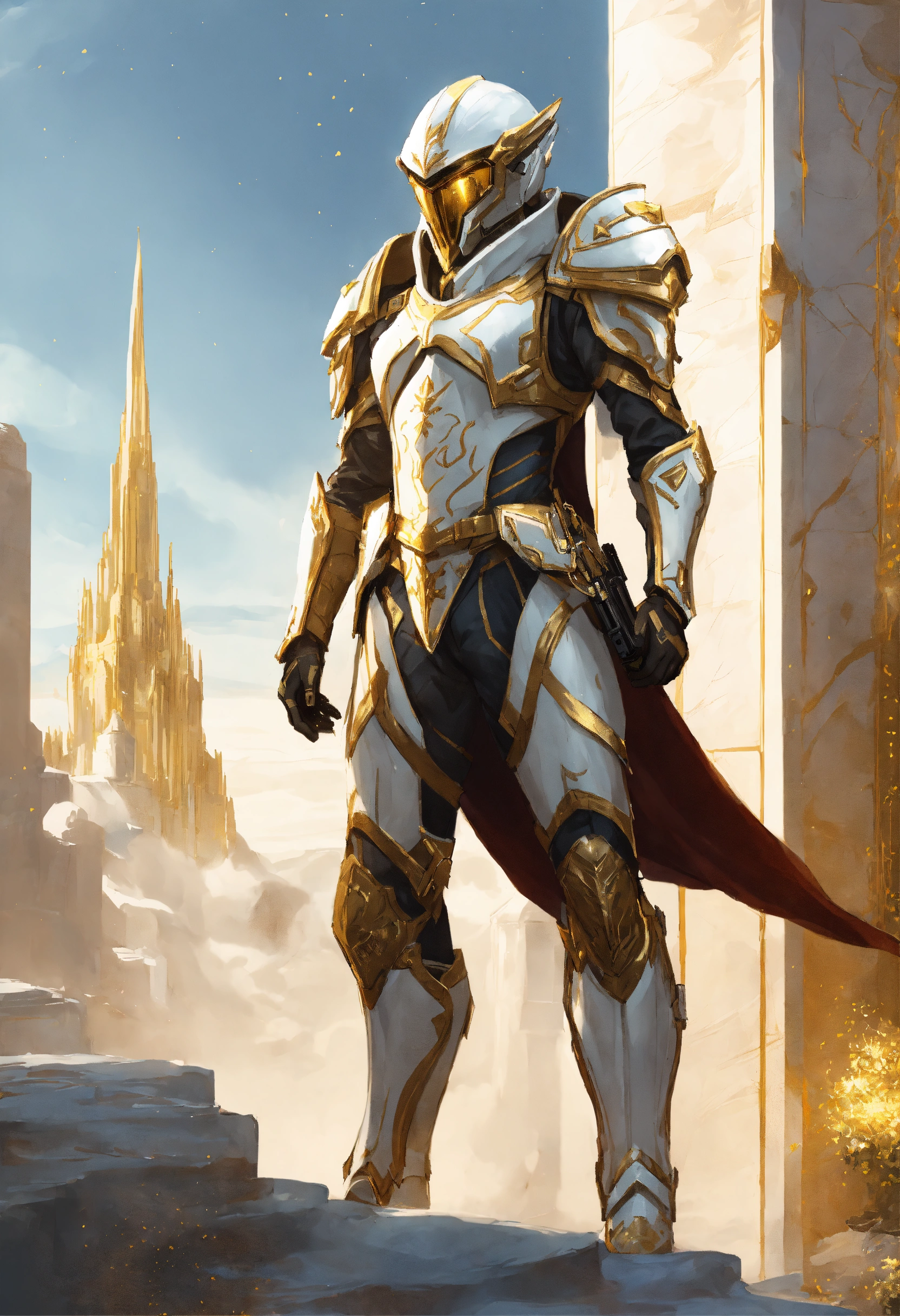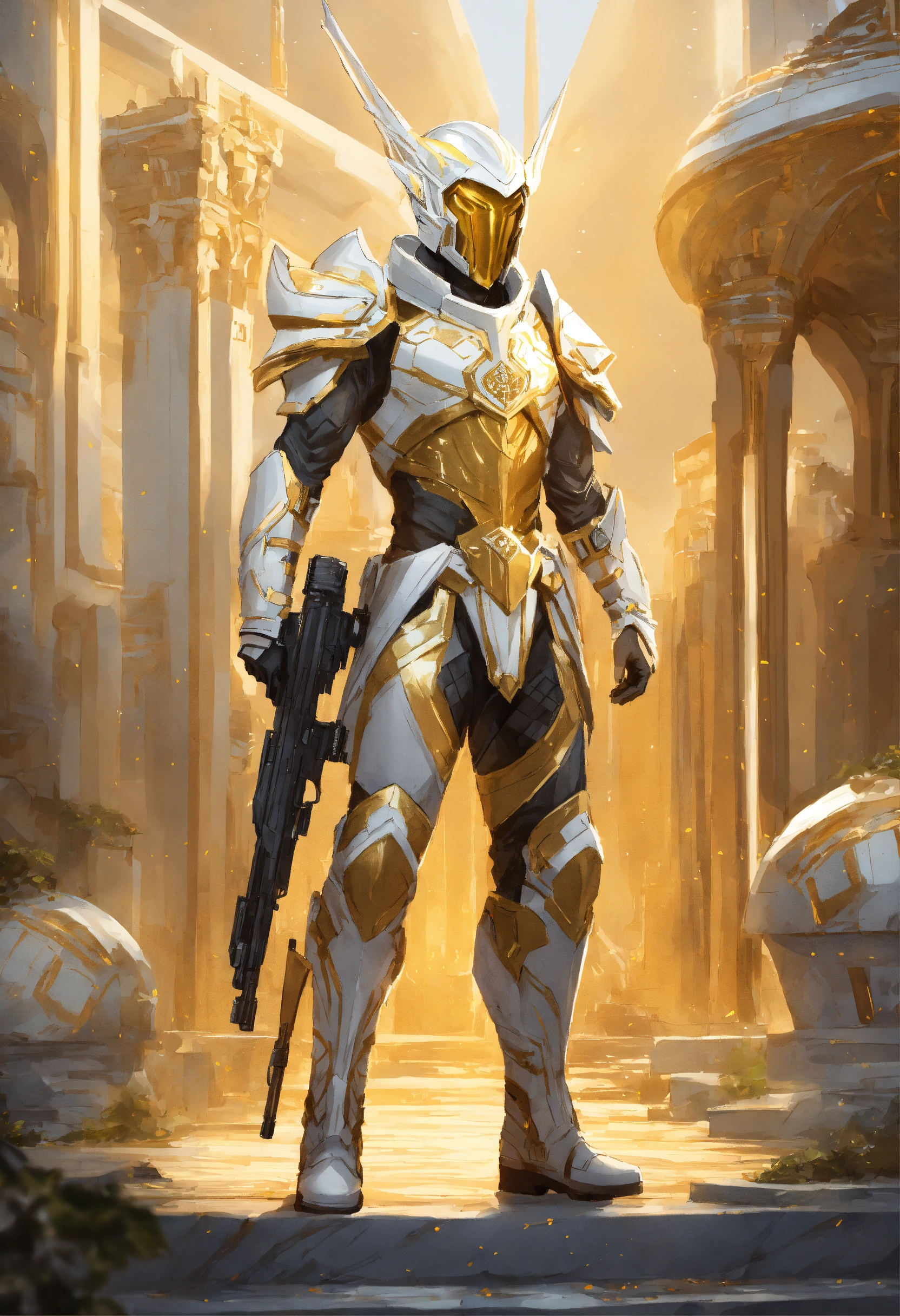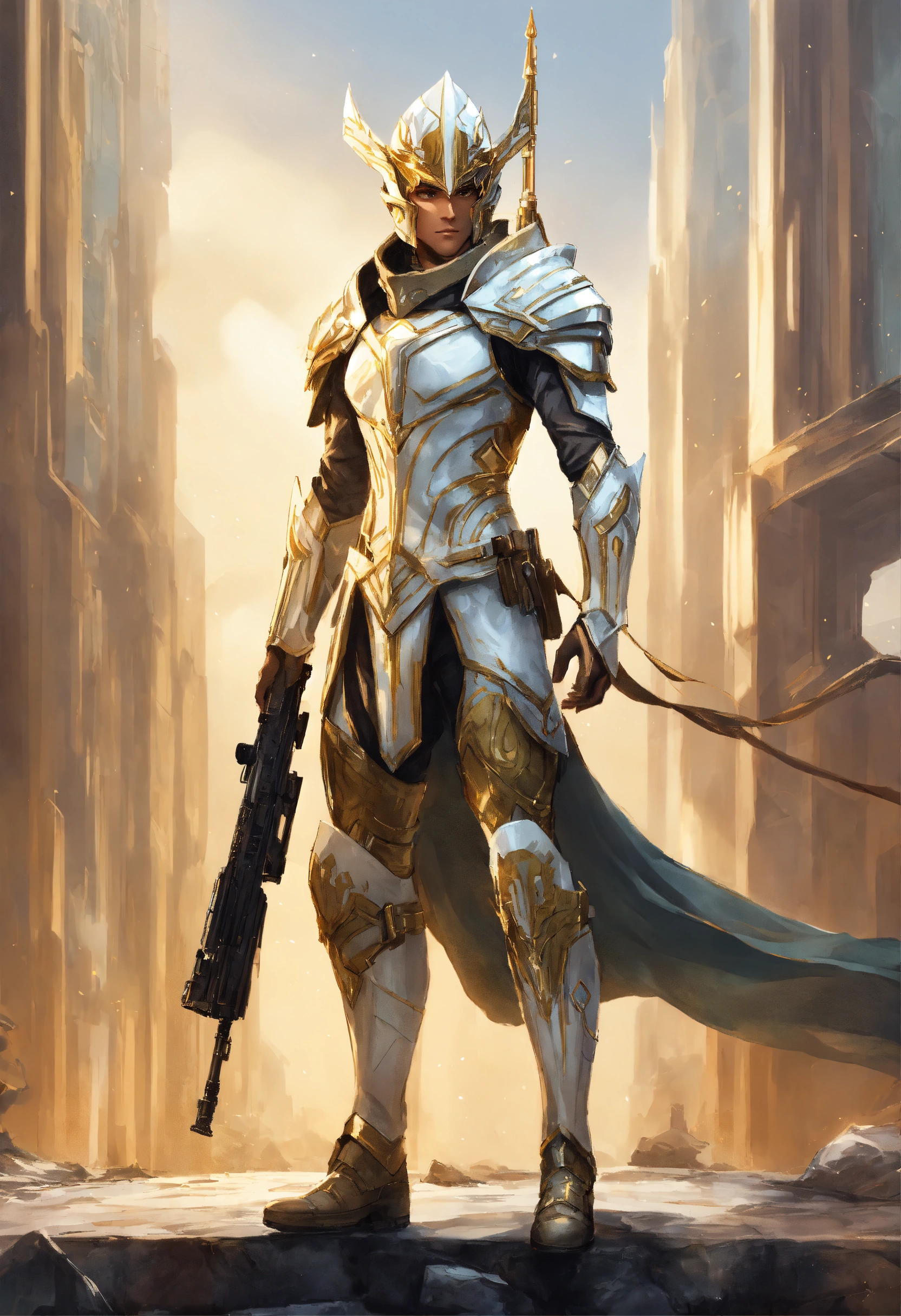 Epic drawing of a full body of a high elf sci fi soldier wearing slender sci fi armor, white and gold sci fi armor and helmet, boots, male, holding a machine gun, standing in a white marble elven city