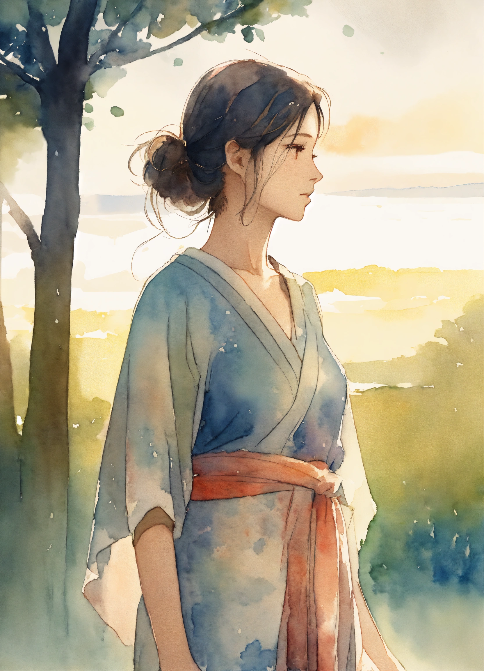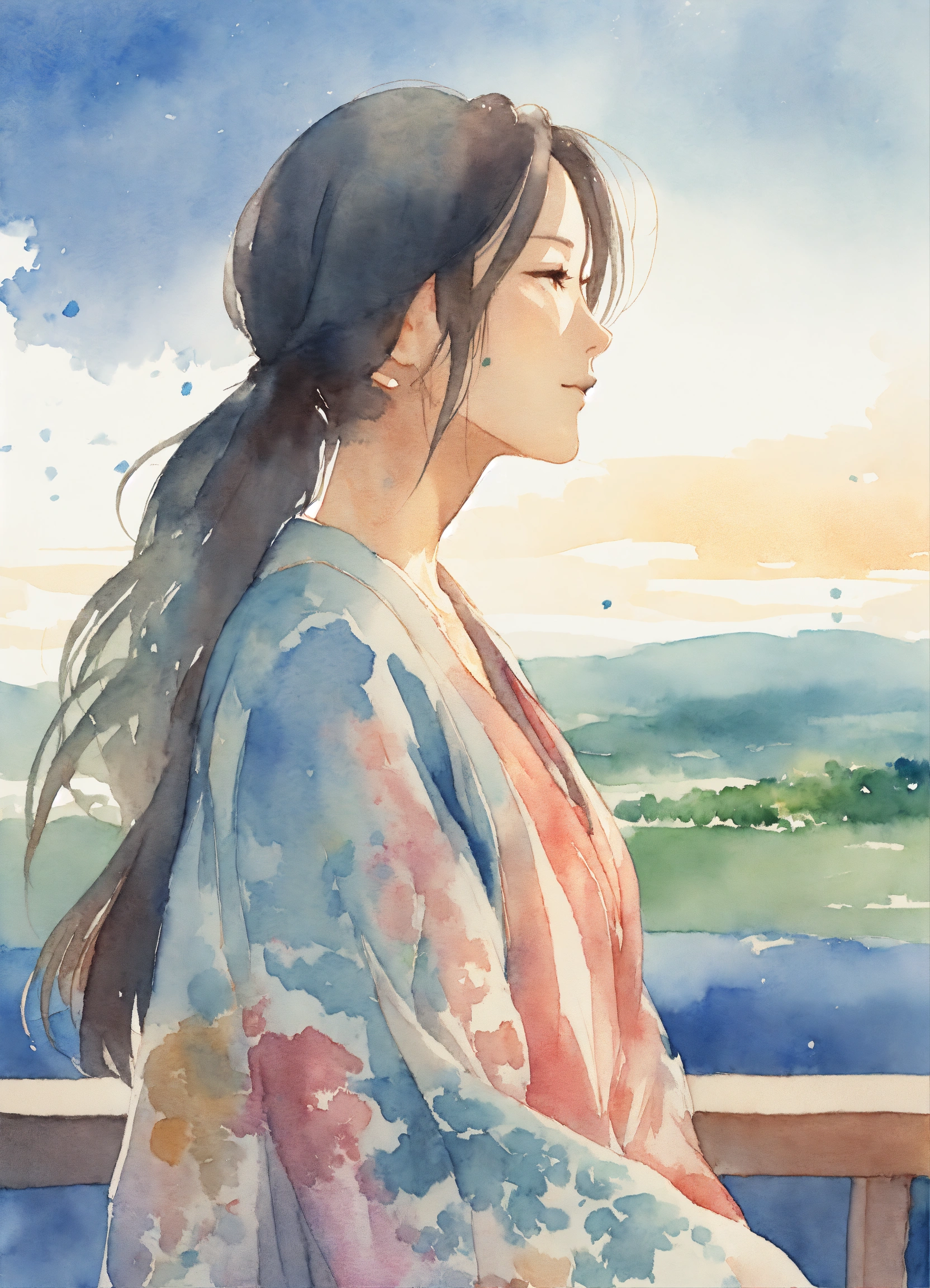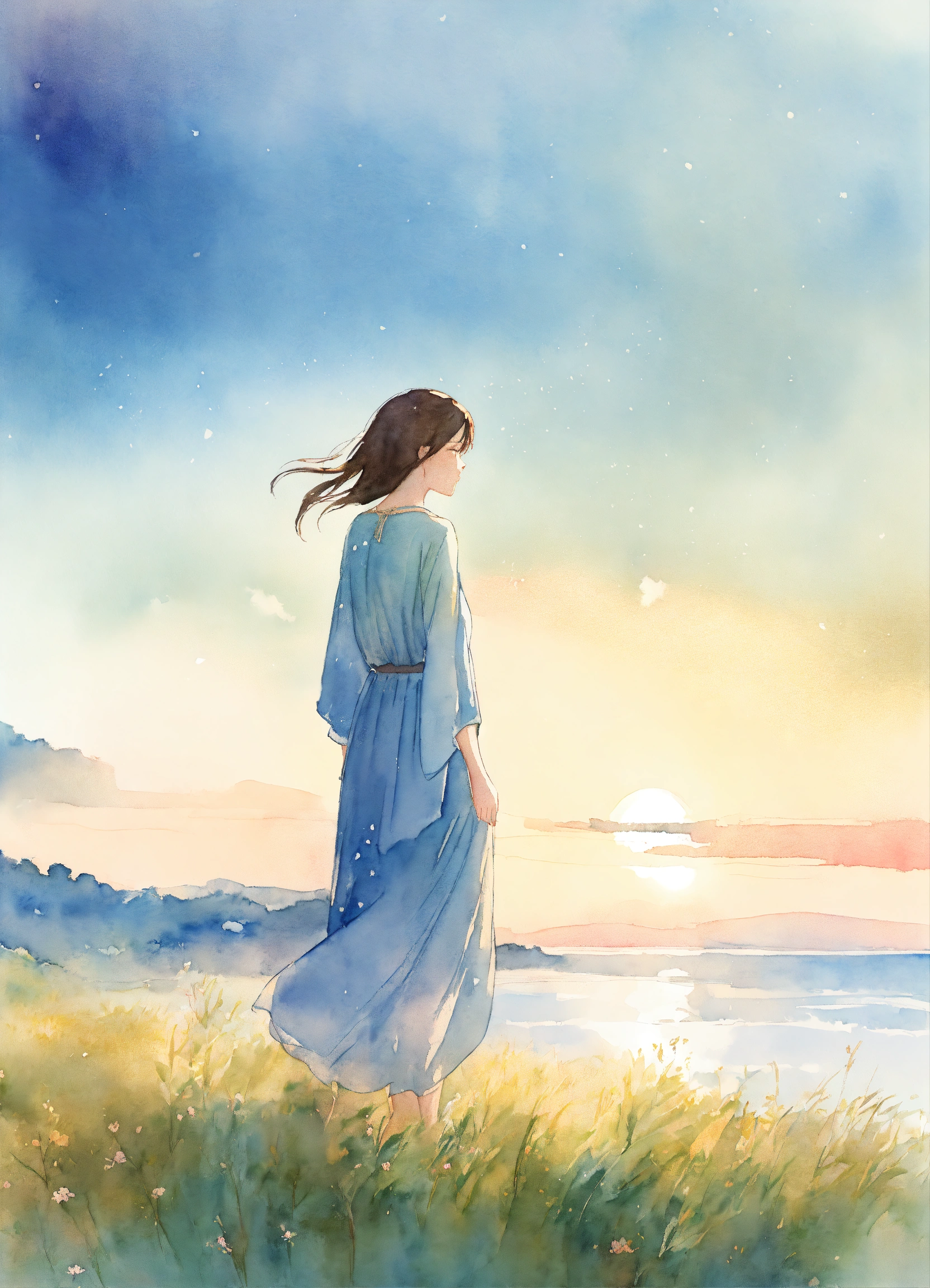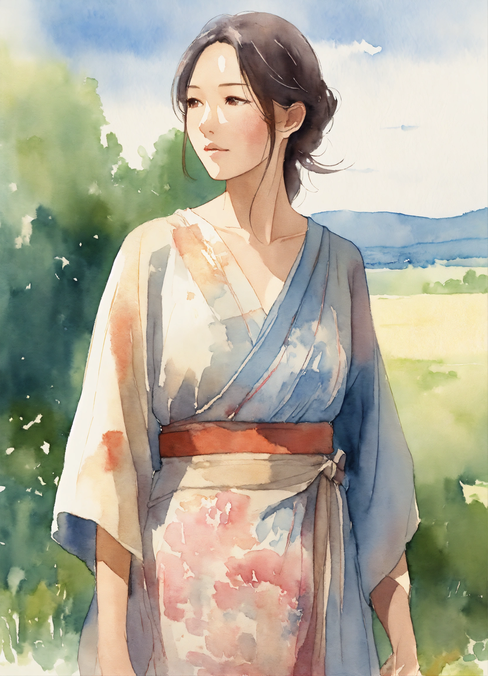 Half body watercolor illustration of an 42 year woman, wearing a long boho dress, comfortable, stylish, chic, no makeup, effortless, relaxed, casual, laid-back, frontal facing, beautiful light sky, low saturation, muted colors, animation, fantasy art, by makoto shinkai