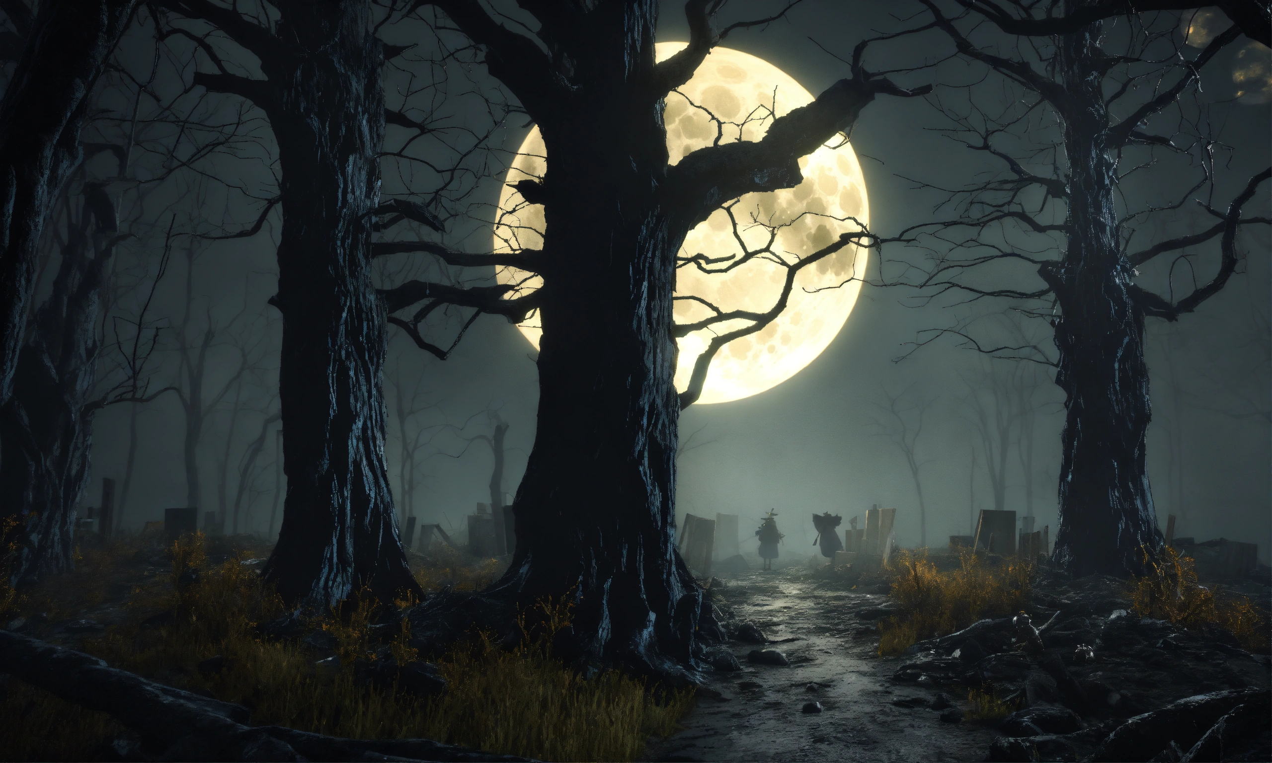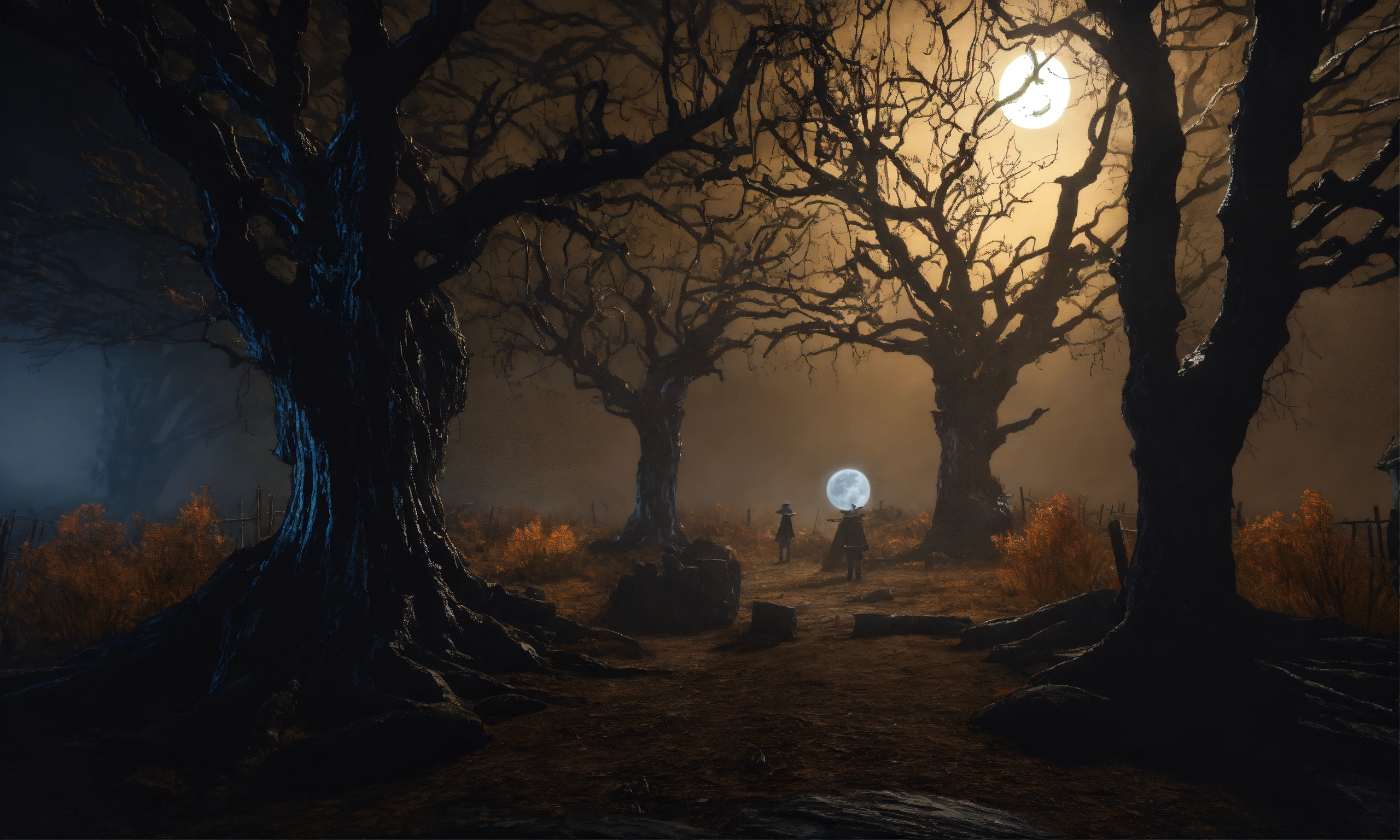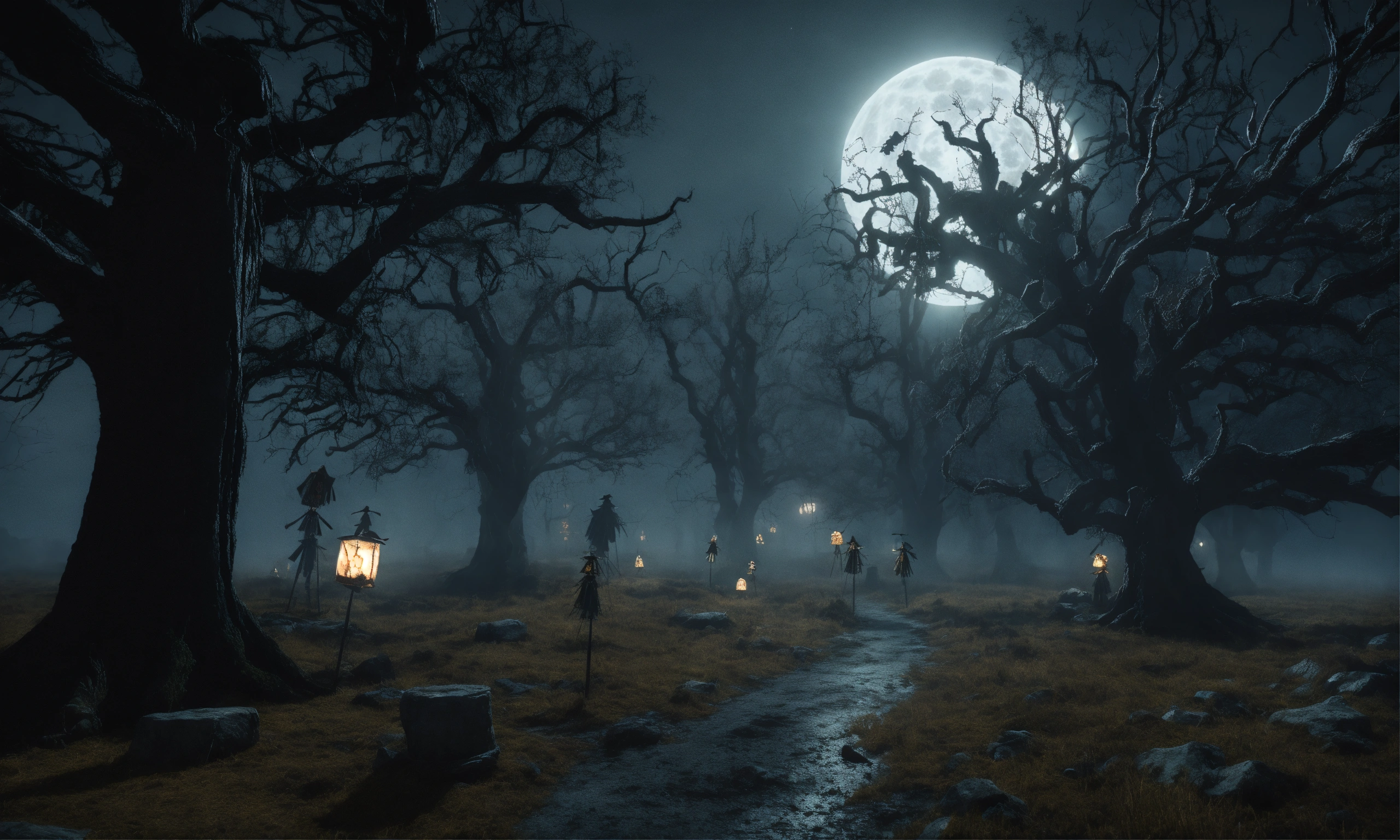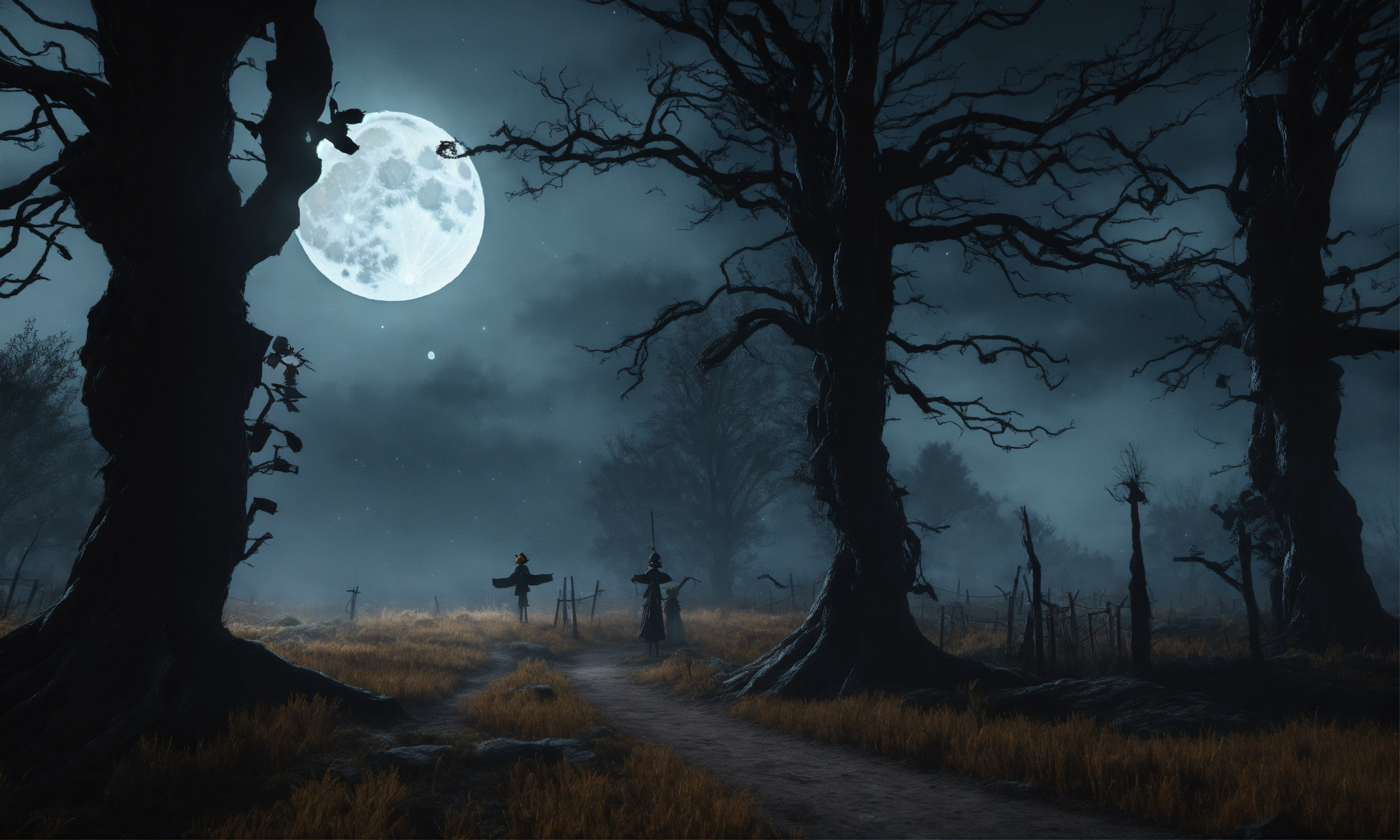 3d black creepy trees haunted scarecrows in a wicked forest engraved obsidian and hyper realistic 8k at night with a full moon sinister