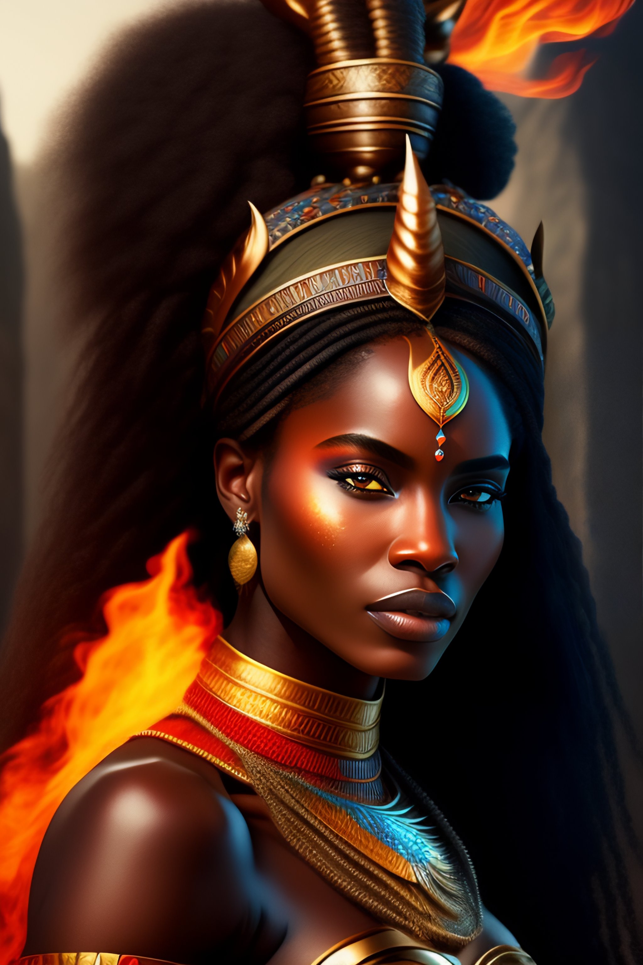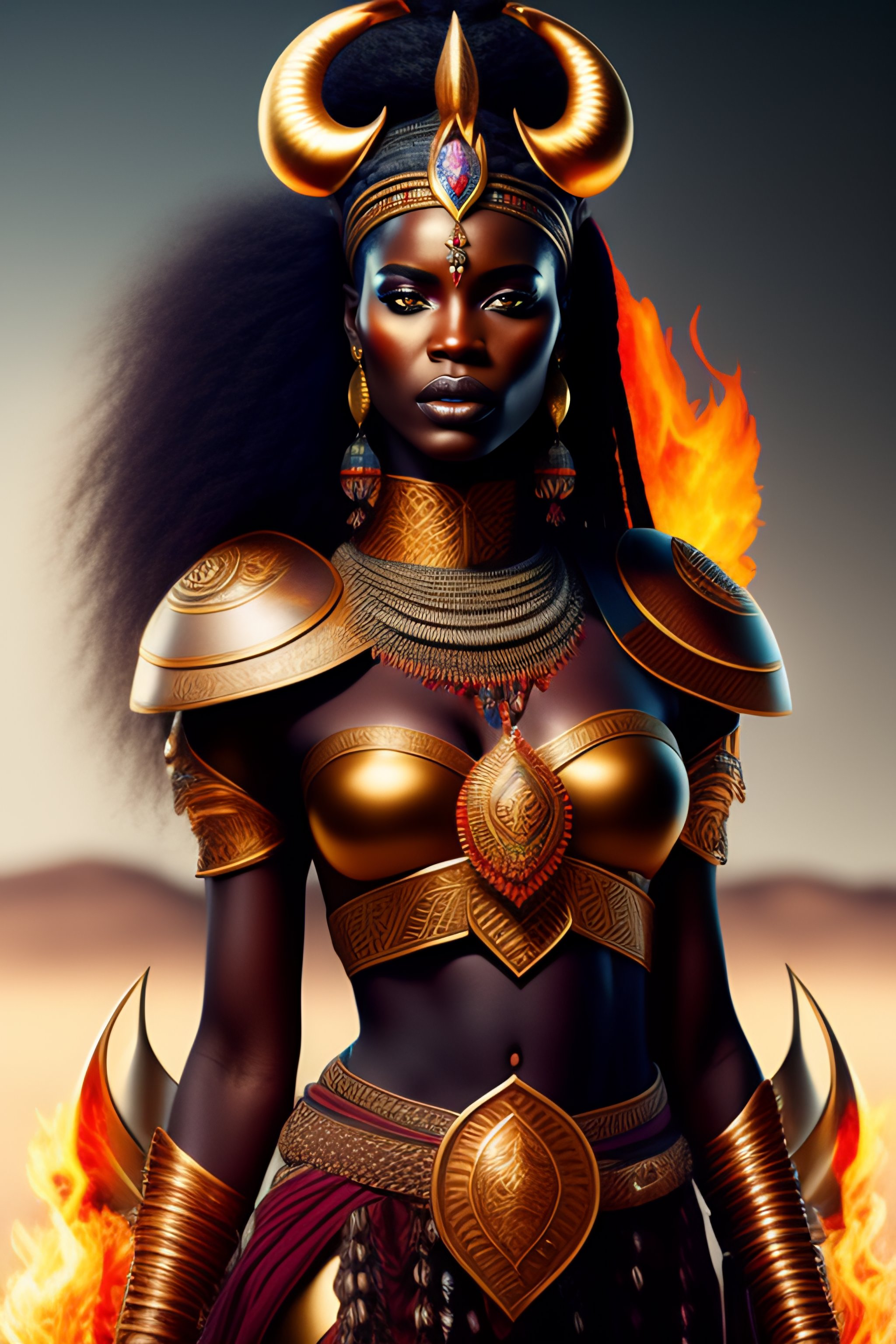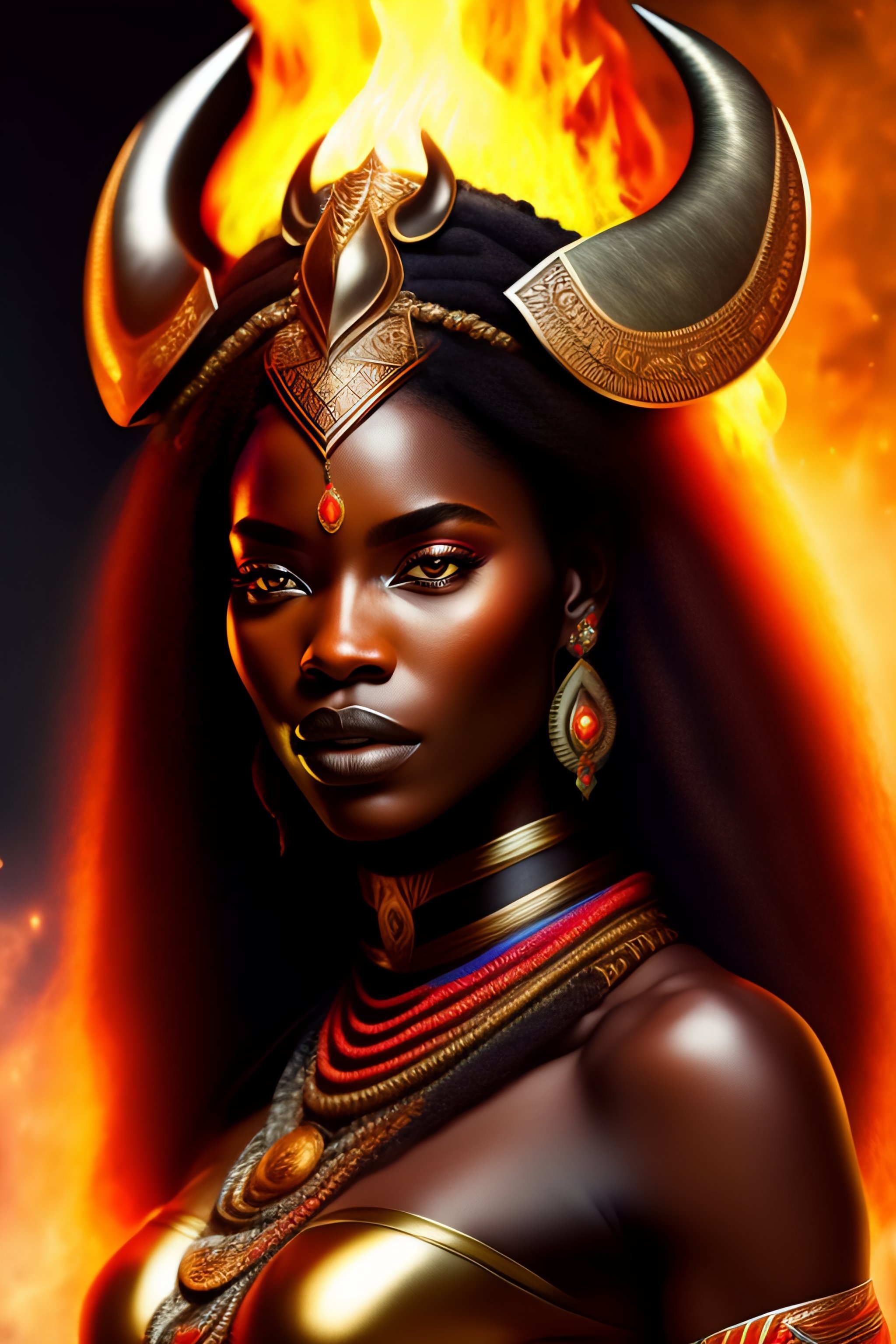 Beautiful african woman goddess of war, background with fire and stone woman wearing armor, horns of a buffalo, digital art hyper realistic 4k