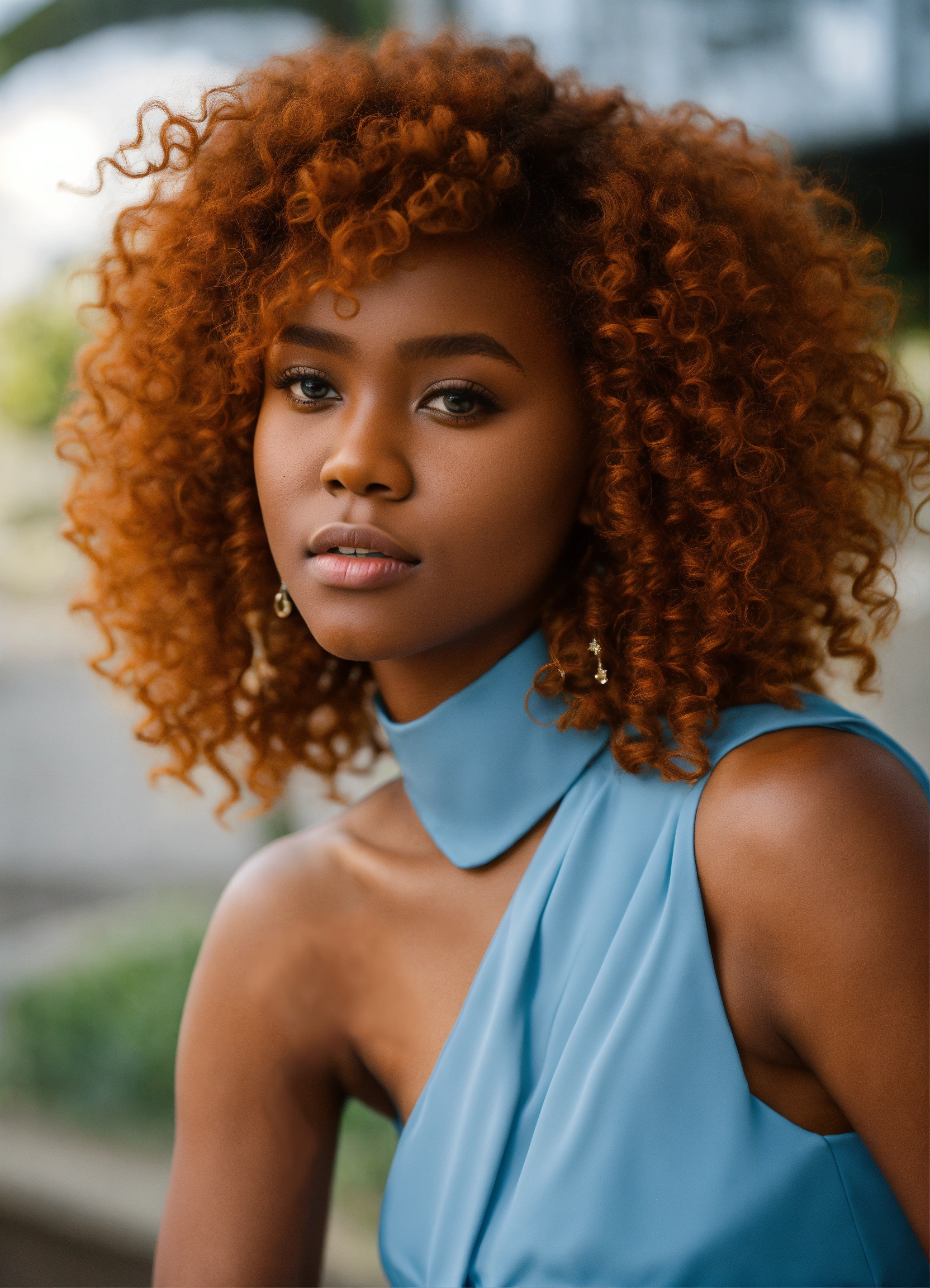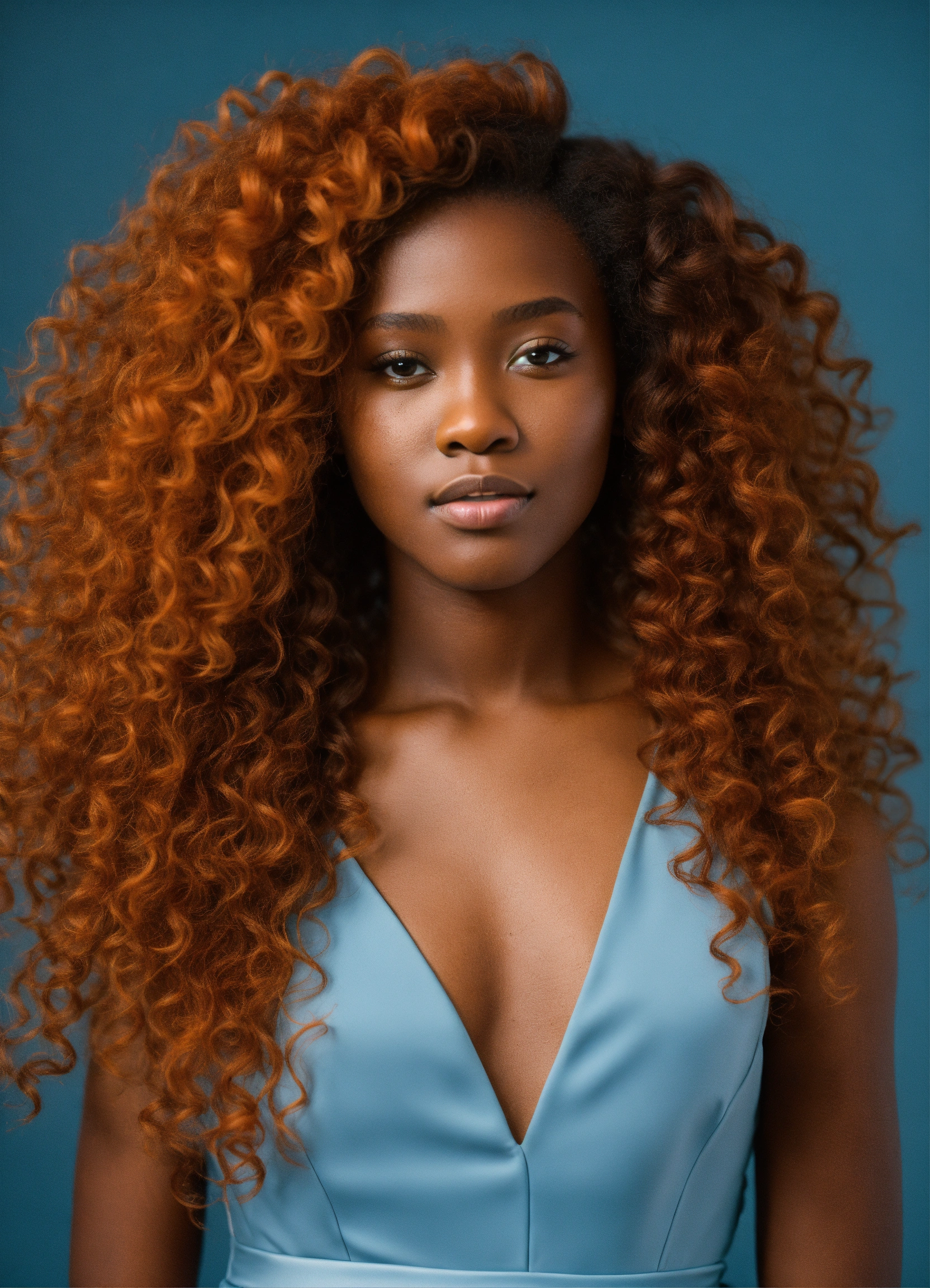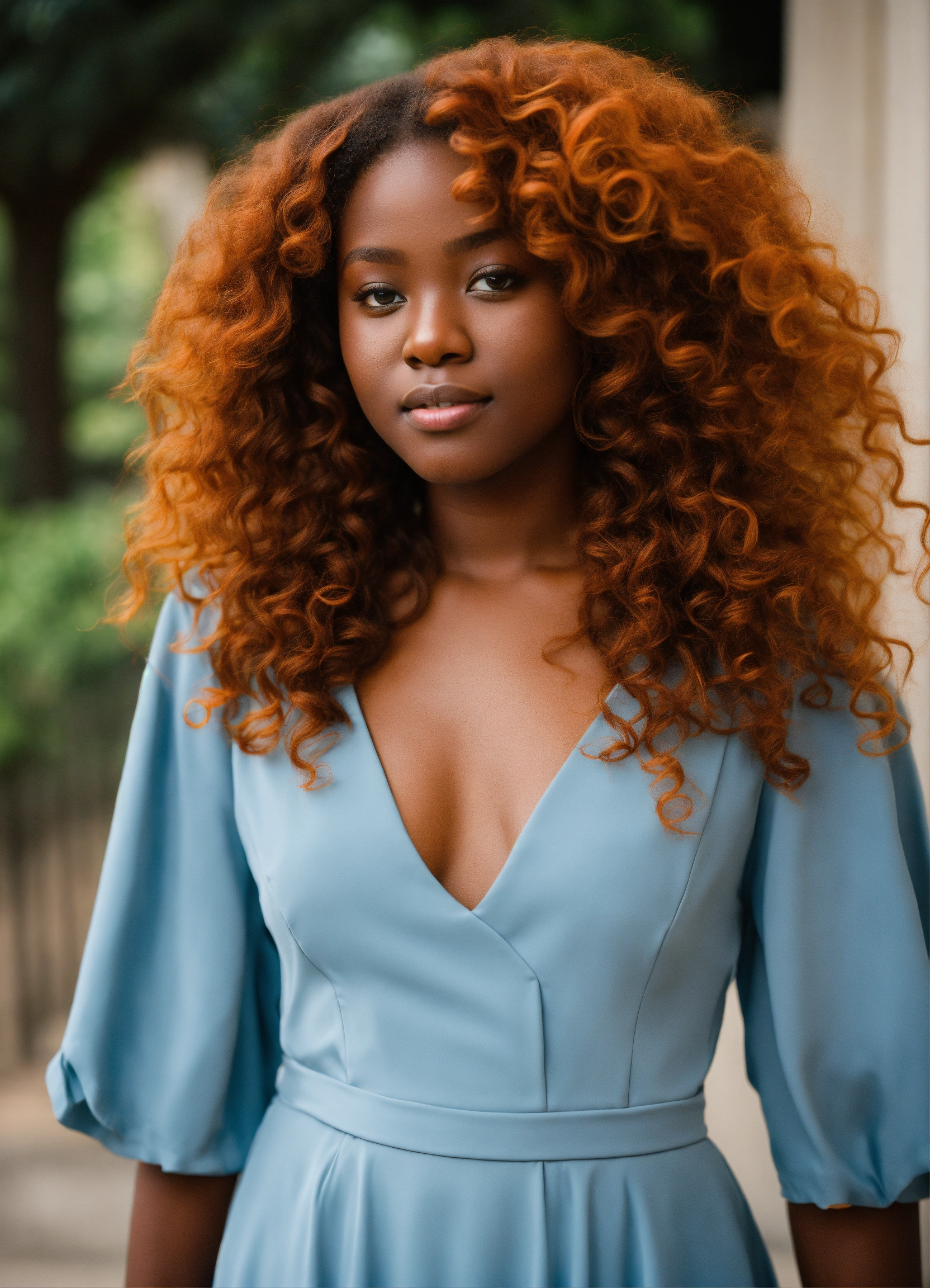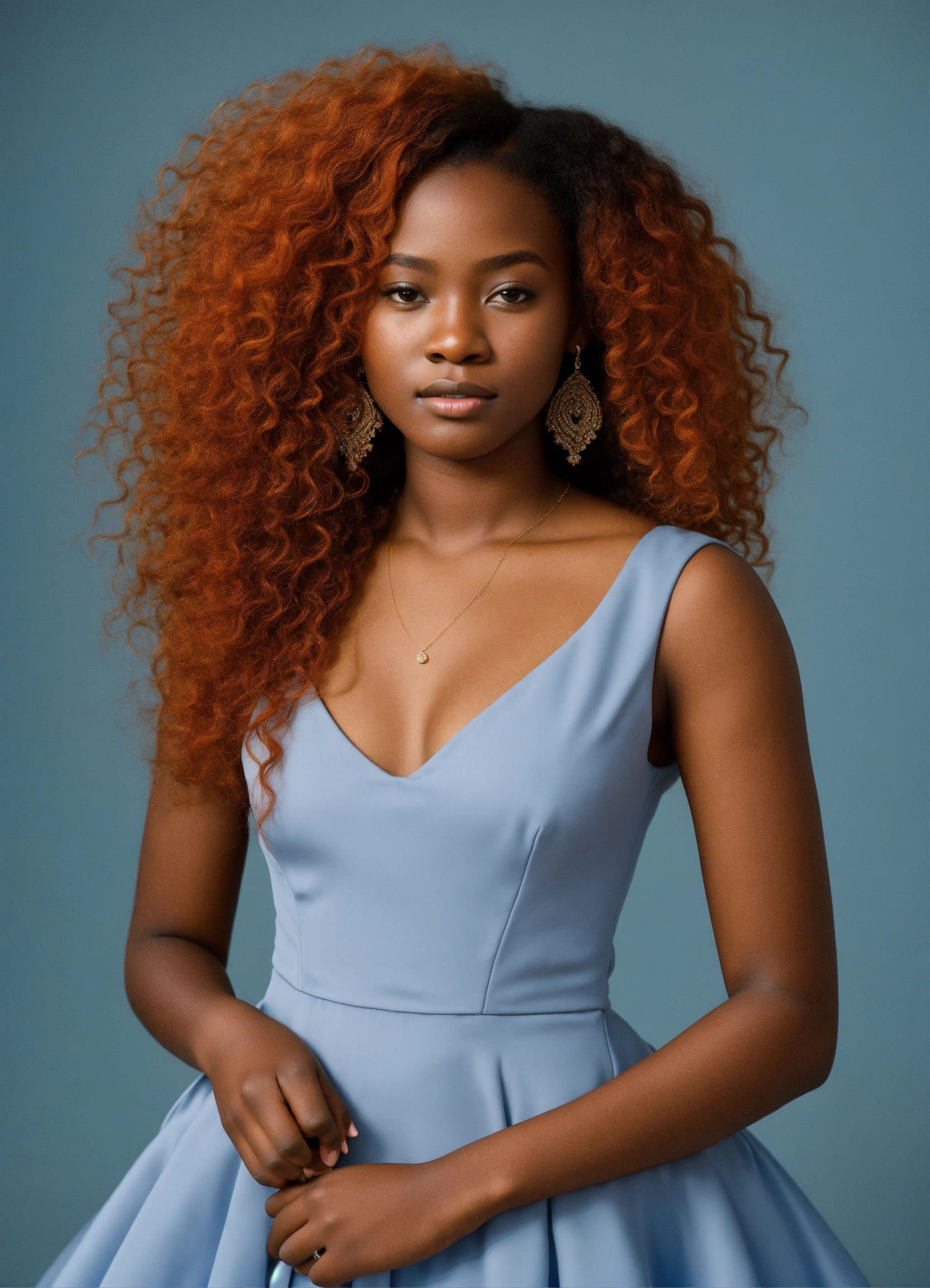 A volumptious, african college student with long reddish-orange curly hair. dressed in a light blue formal dress.