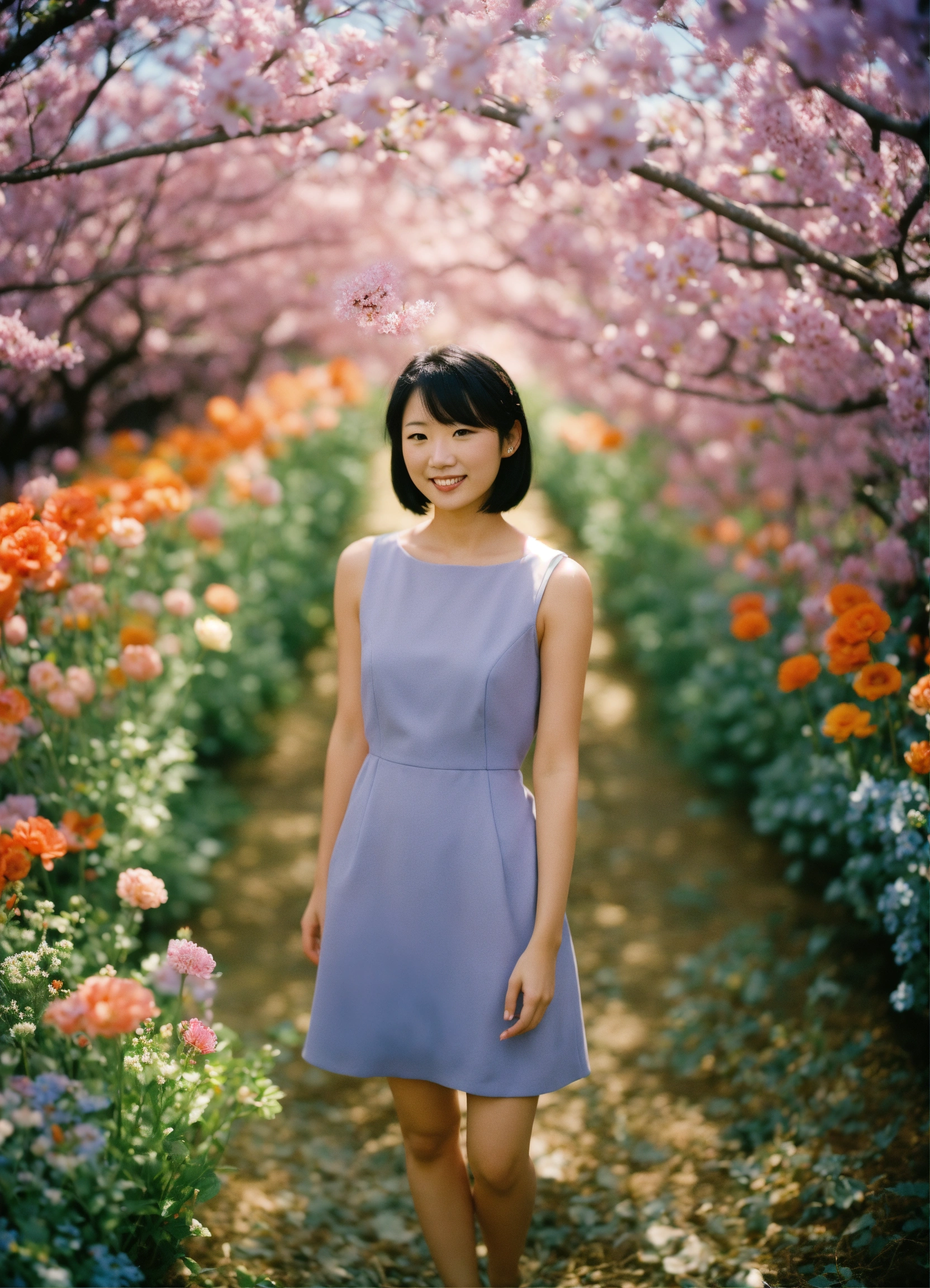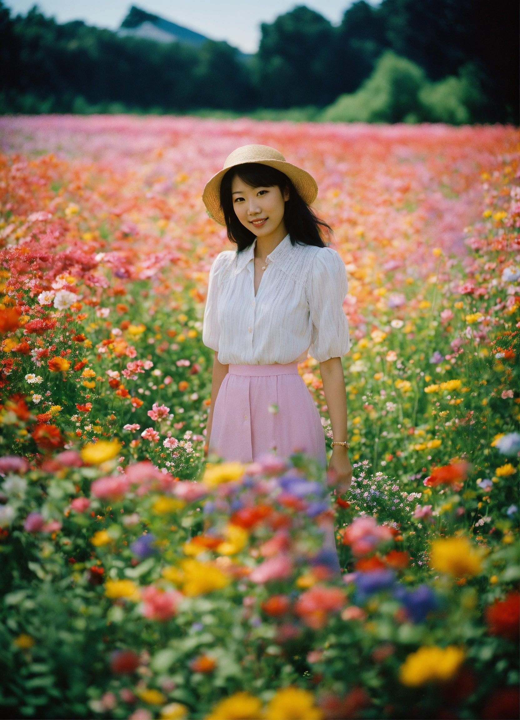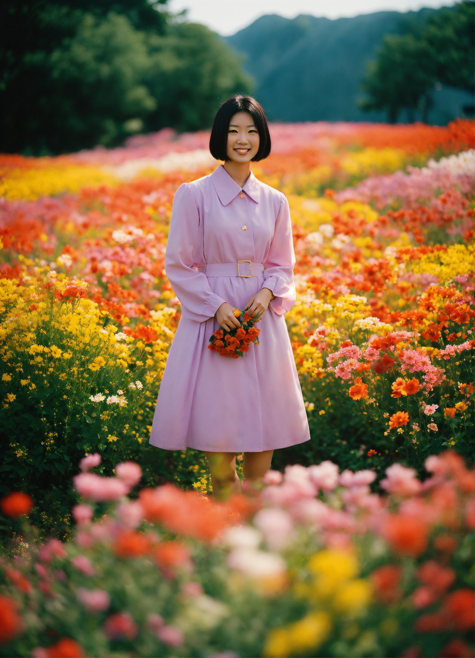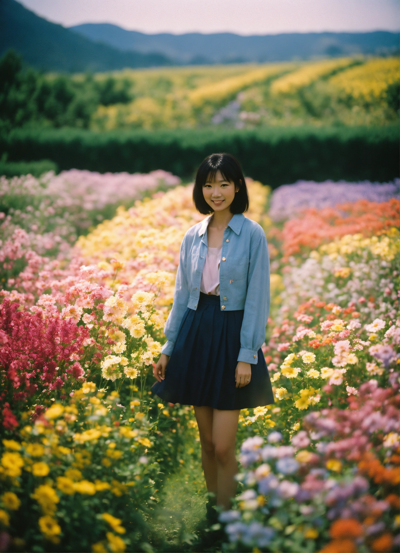 Happy misato katsuragi standing in a beautiful field of flowers, colorful flowers everywhere, perfect lighting, leica summicron 35mm f2.0, kodak portra 400, film grain
