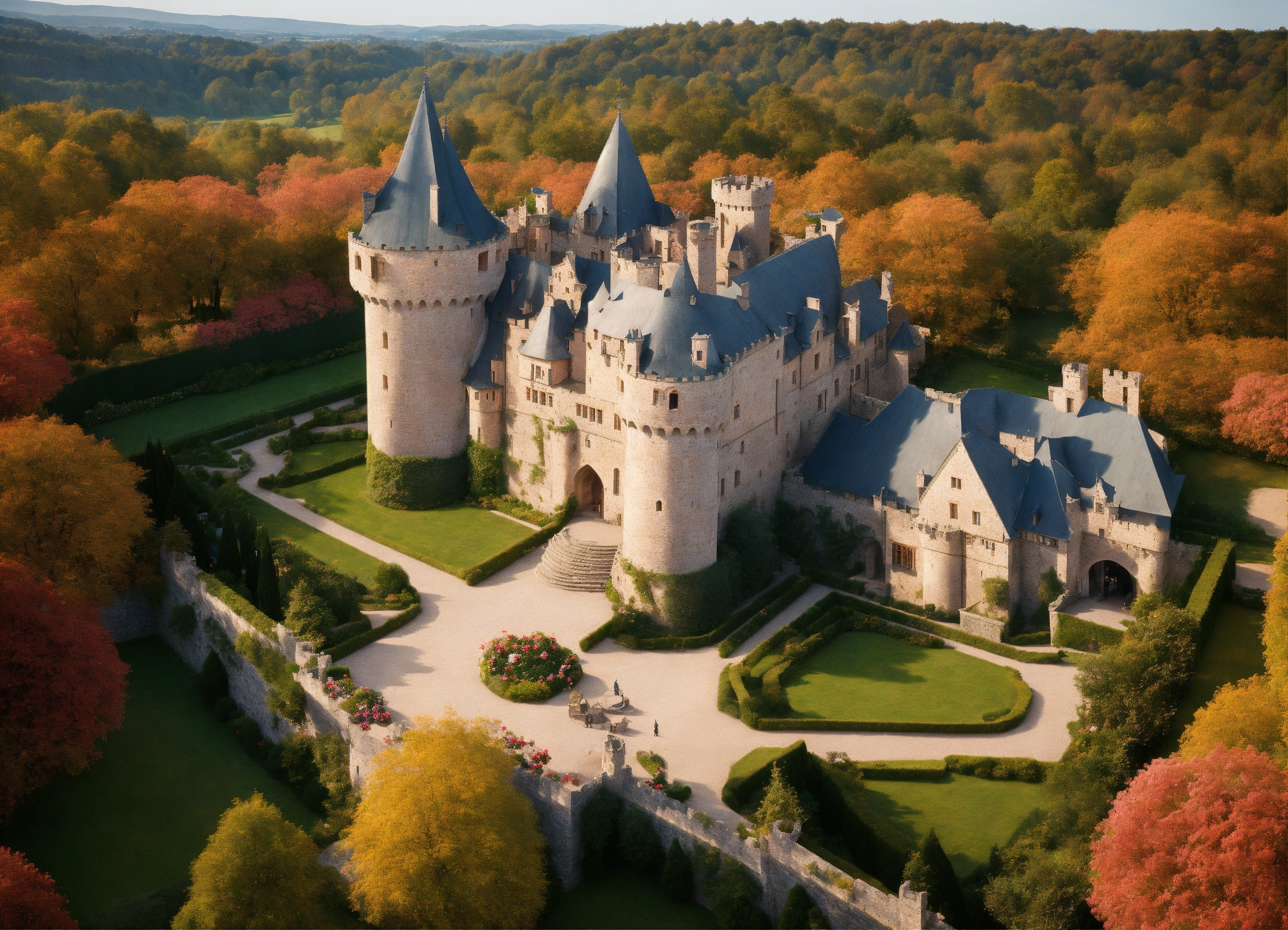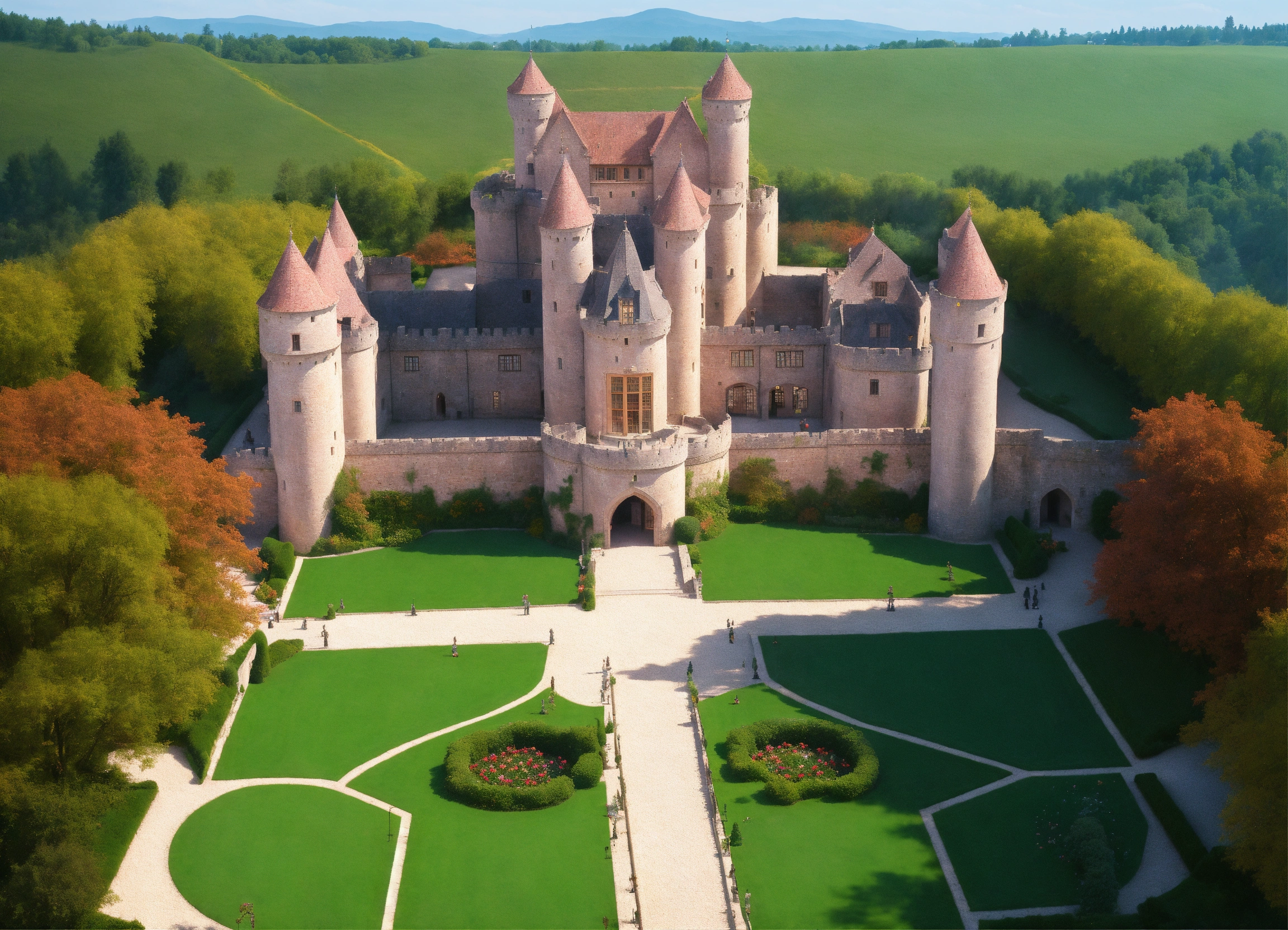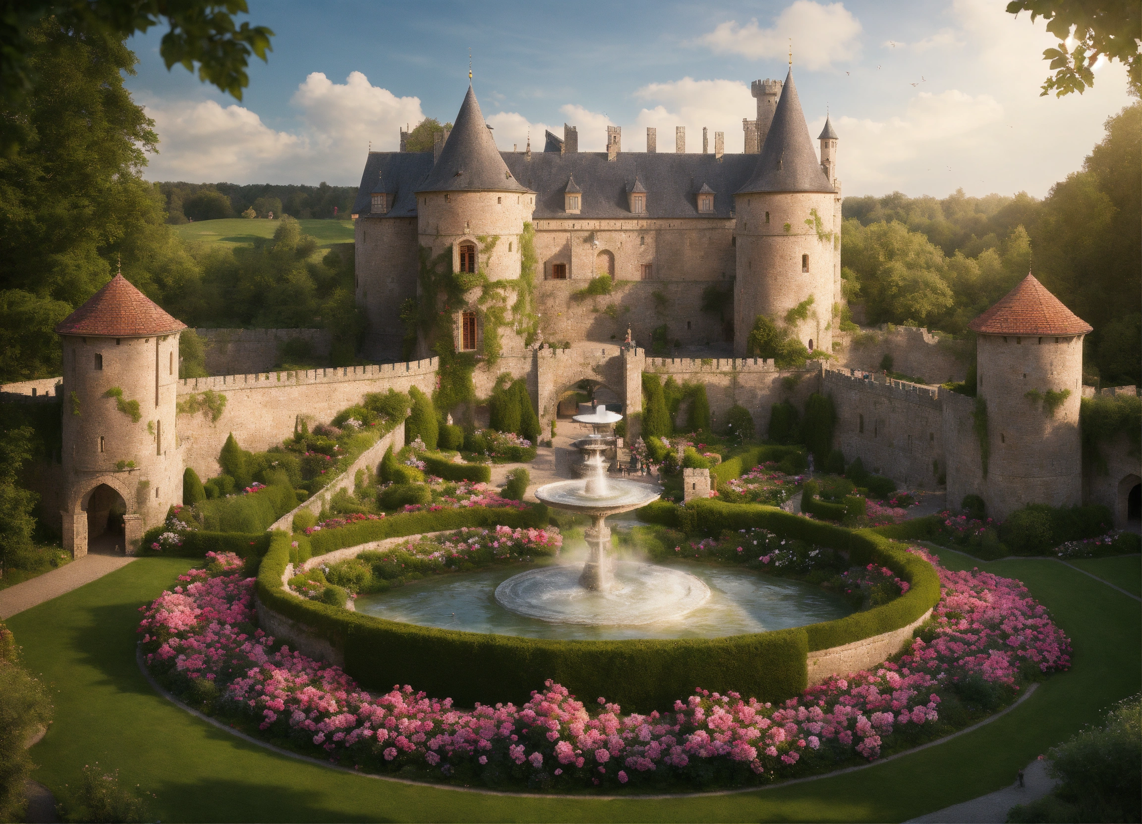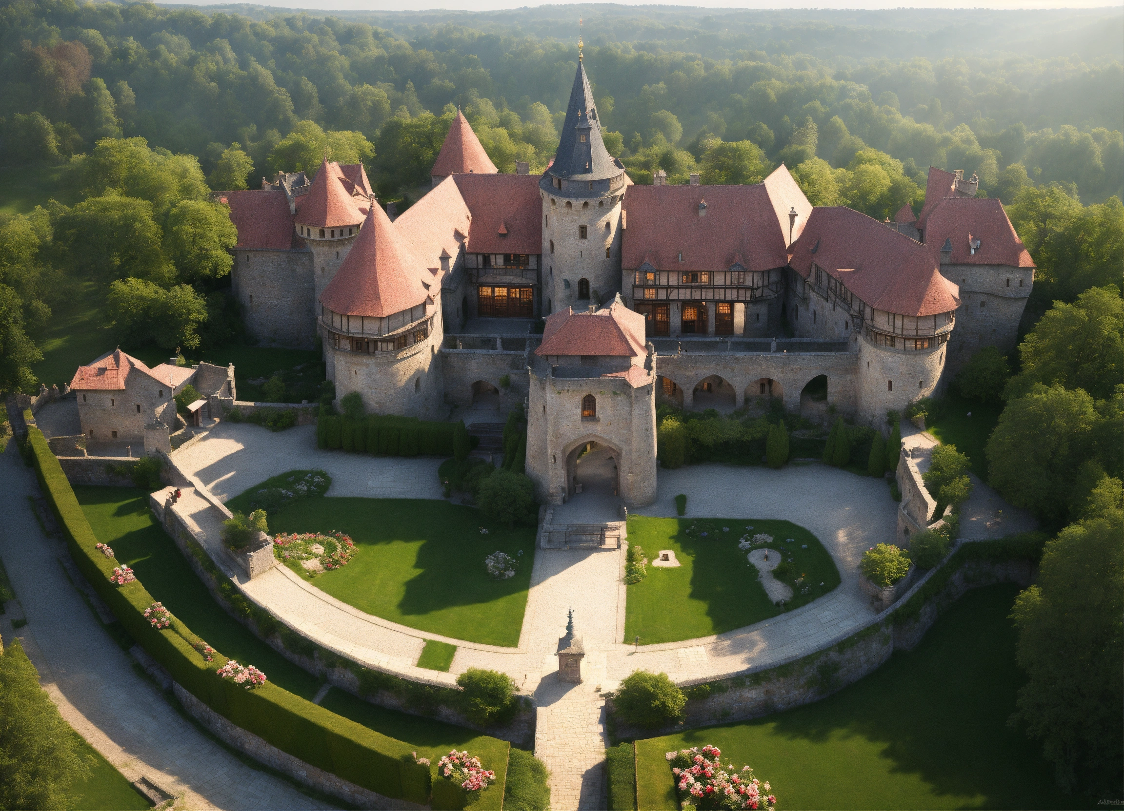 Ultra realistic, photorealistic, bird's eye view of a small medieval castle on a rock, garden terraces with pond, rose bowers, magnificent rose garden and arcades, magnificent fountain, massive crenellated stone wall with a central wall gate and watchtowers surrounds the castle area, with a large inner courtyard and several servants quarters and stables, rose pavillon, pleasure grotto, large forecourt, a wide boulevard leads to the entrance of the castle, extensive rose fields on hilly landscapes in the area around the castle, ultra detailled, focus on castle, sharp focus, sharp, ambient lighting, ksiąz castle in poland