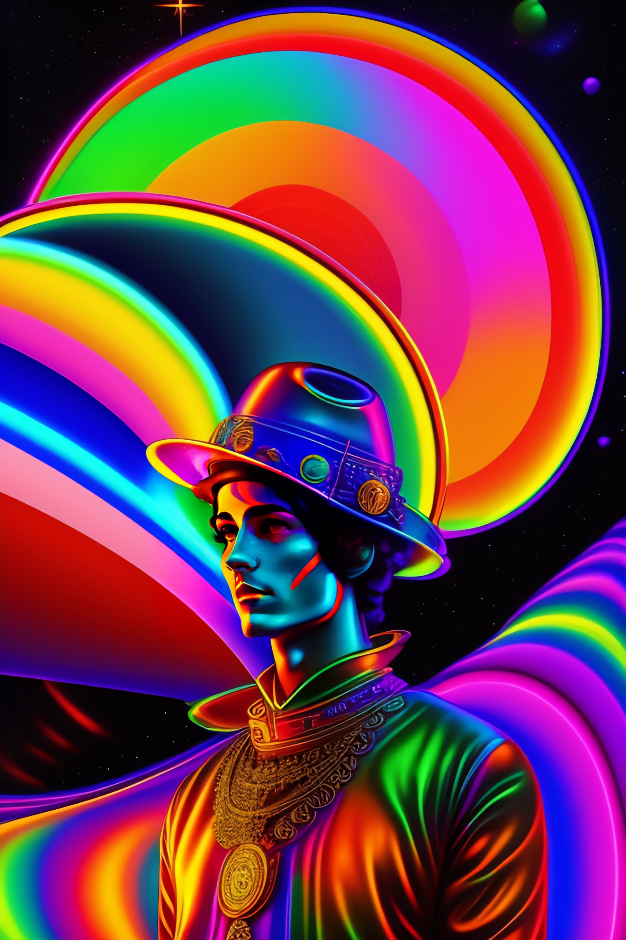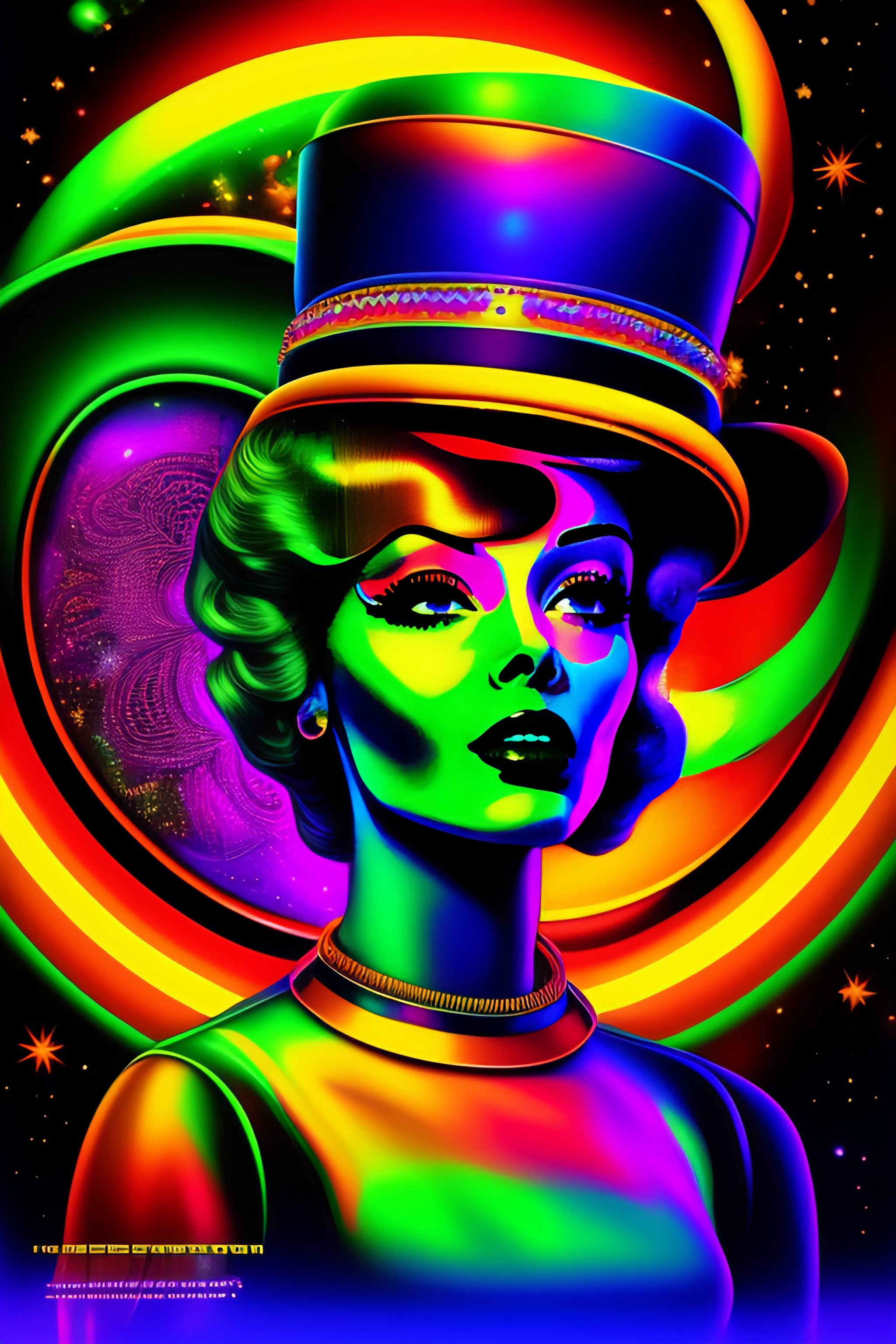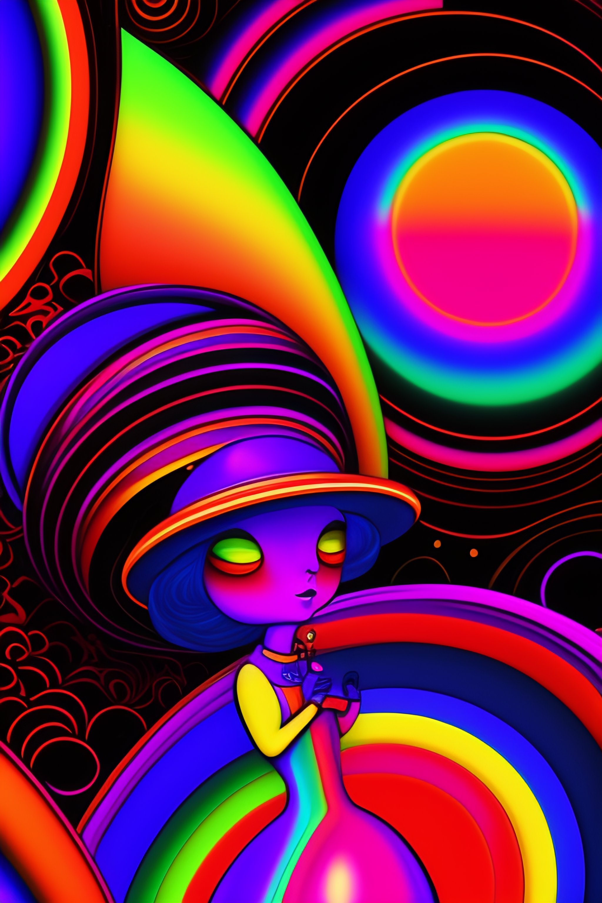 Psychedelic vintage full shot 1960's cartoon poster with alien hippy, ovni, tron, psychedelic alien hippy smoking marijuana, black in color, with a psychedelic steampunk space background, futuristic rainbow lighting, cinematic lighting, cozy lighting, 8k, cinematic poster vintage 1960's