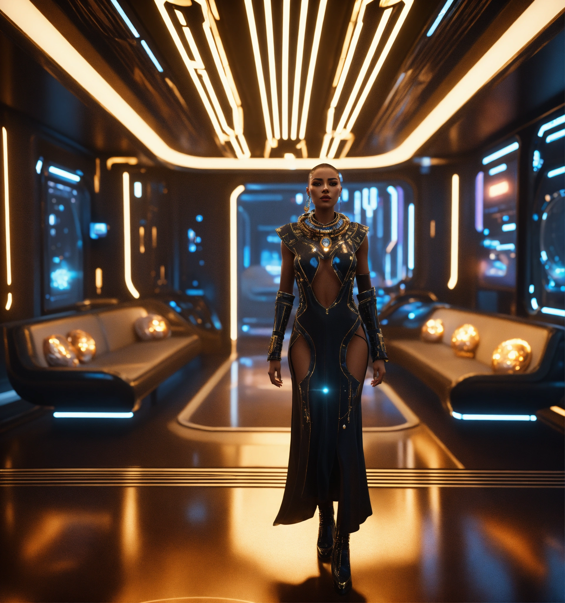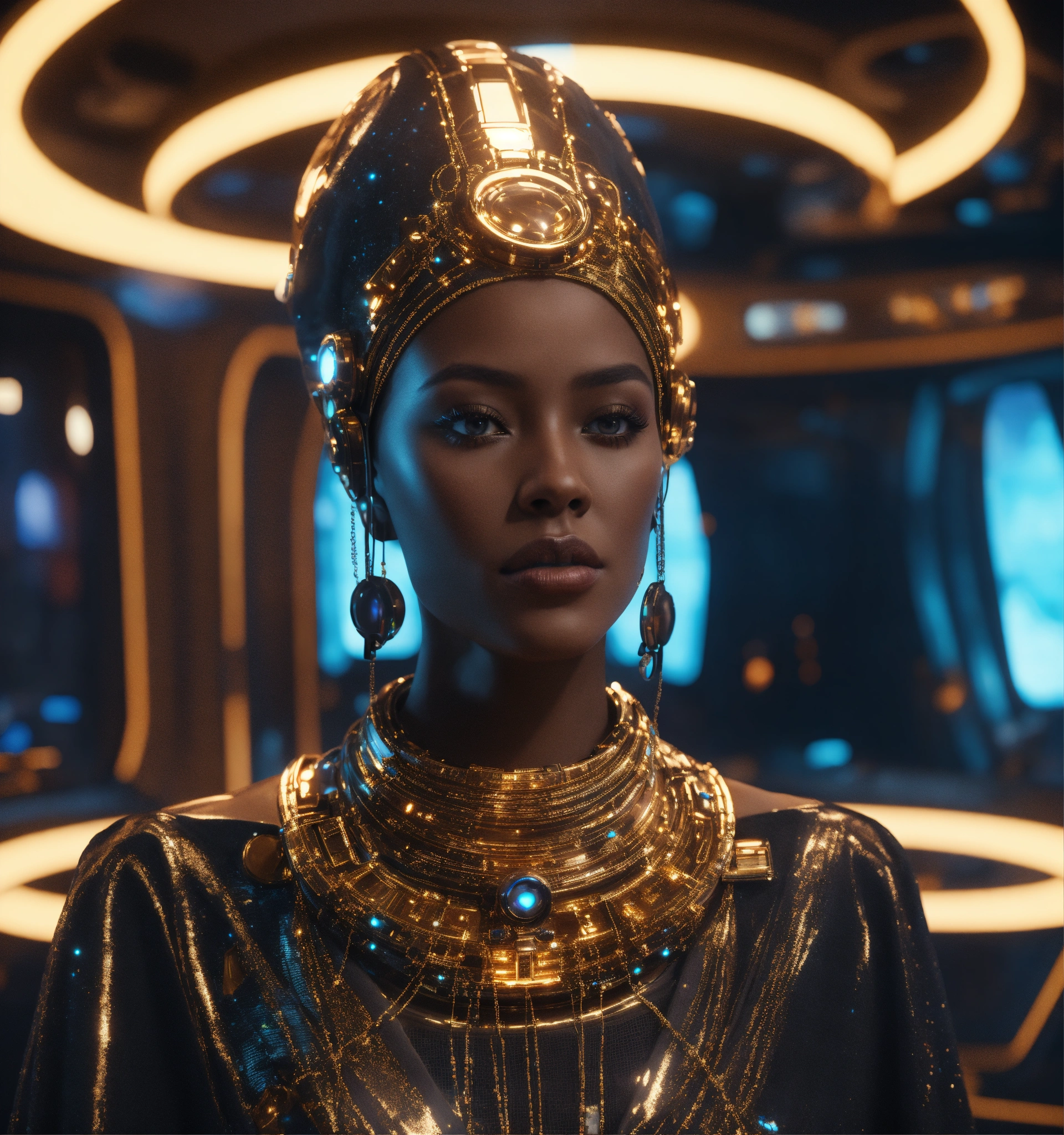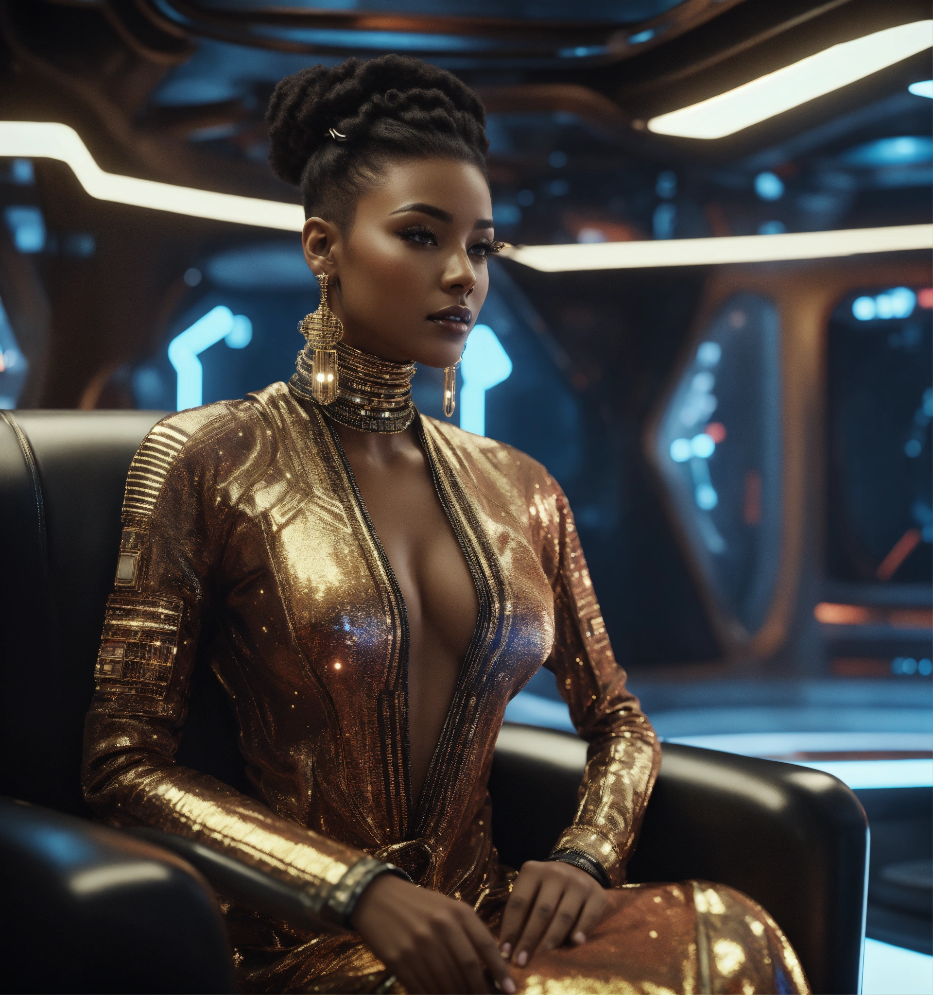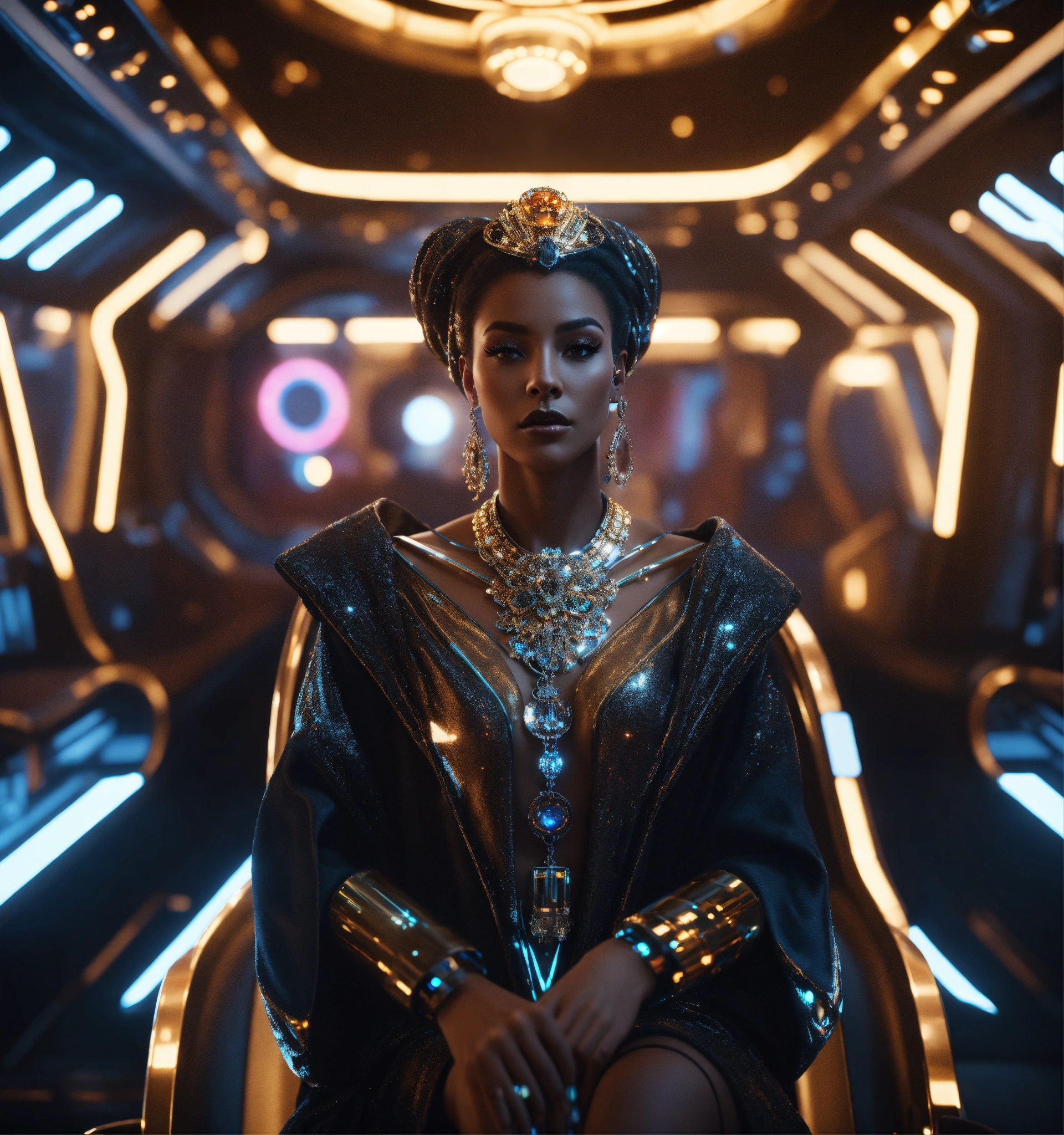 Zoom out from an alluring black beautiful faced humanoid, wearing a fancy space robe and jewelry in a futuristic space ship lounge, realistic, futuristic, sci-fi, 8k, unreal engine