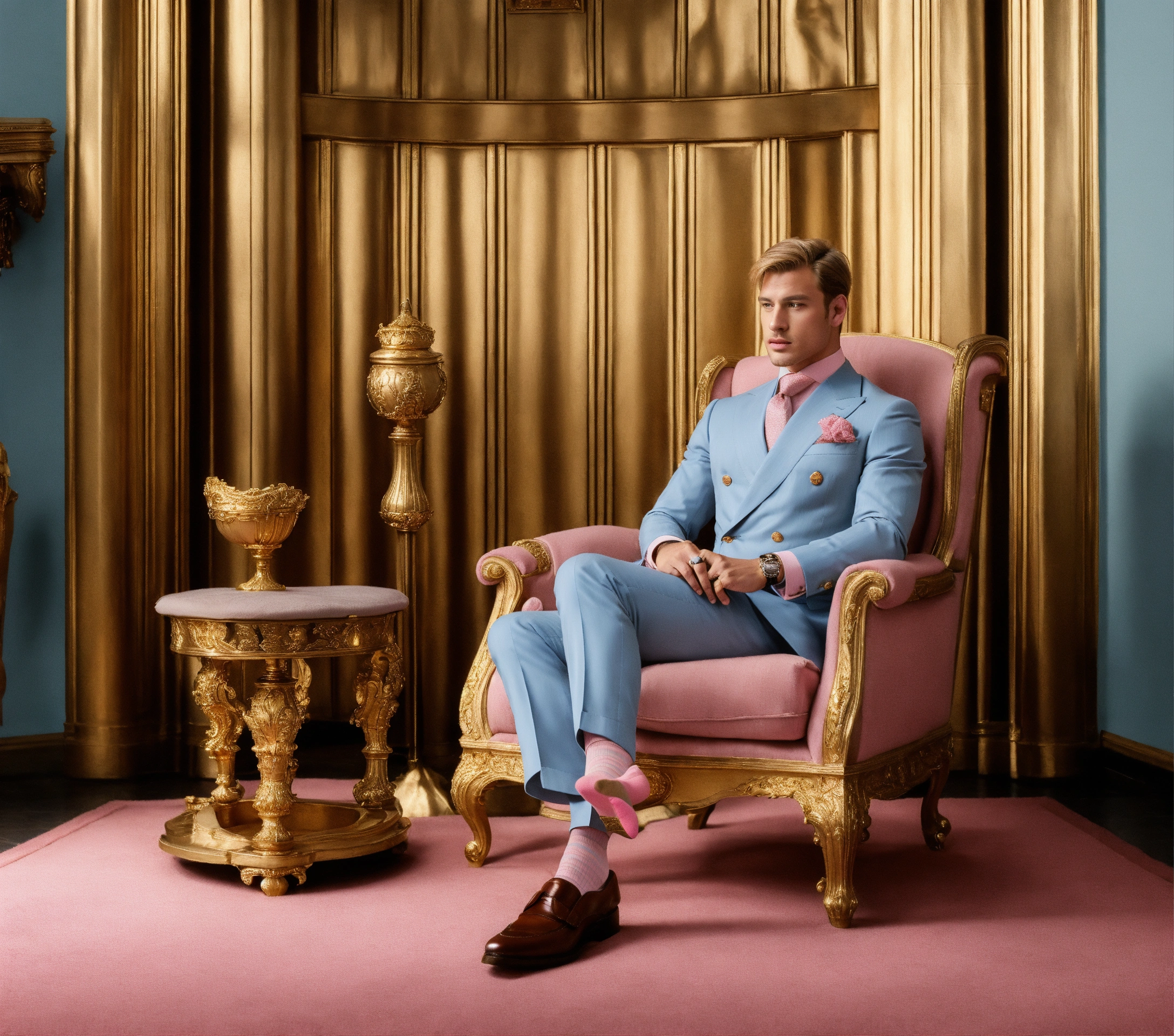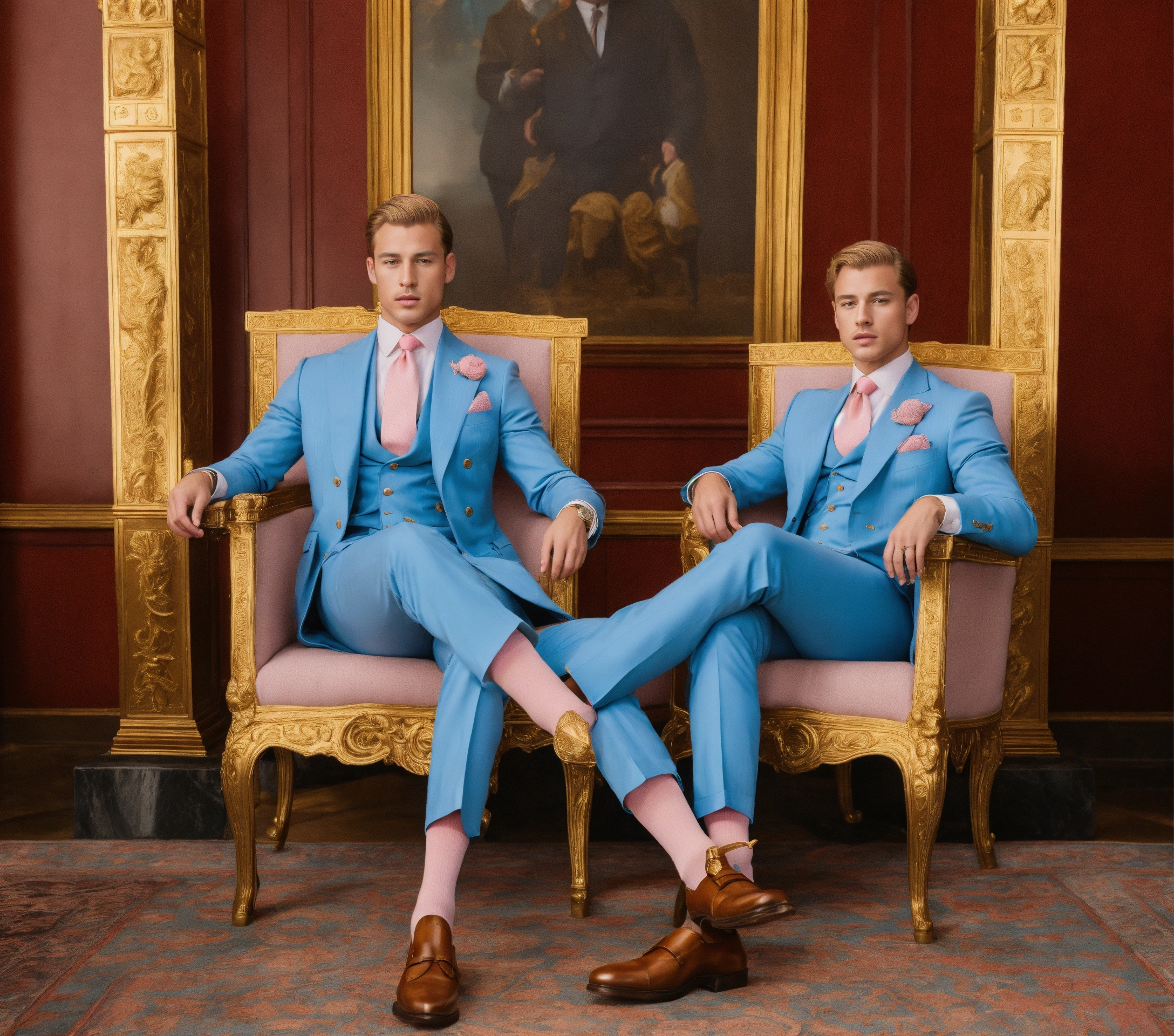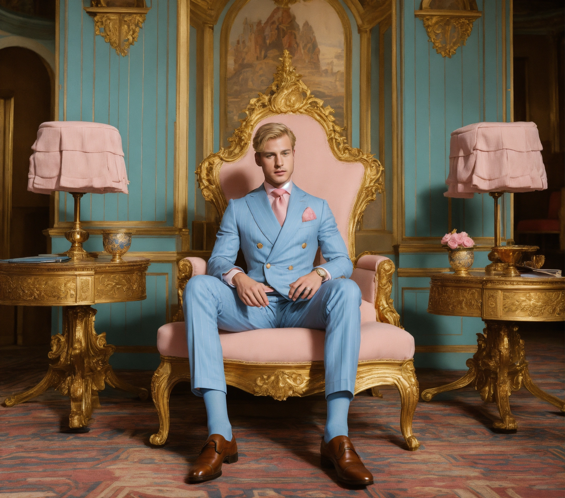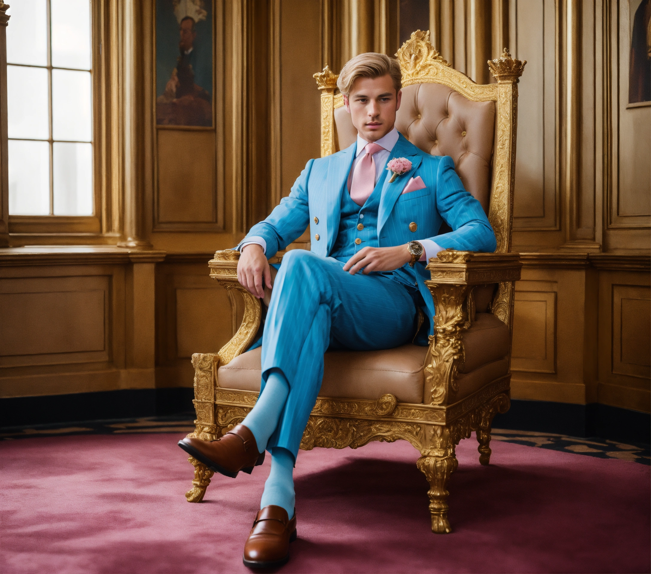 A blonde prince, in pale blue pinstripe double breasted suit, golden tie, pink socks, light brown monkstrap shoes, seating on a throne, with two guards