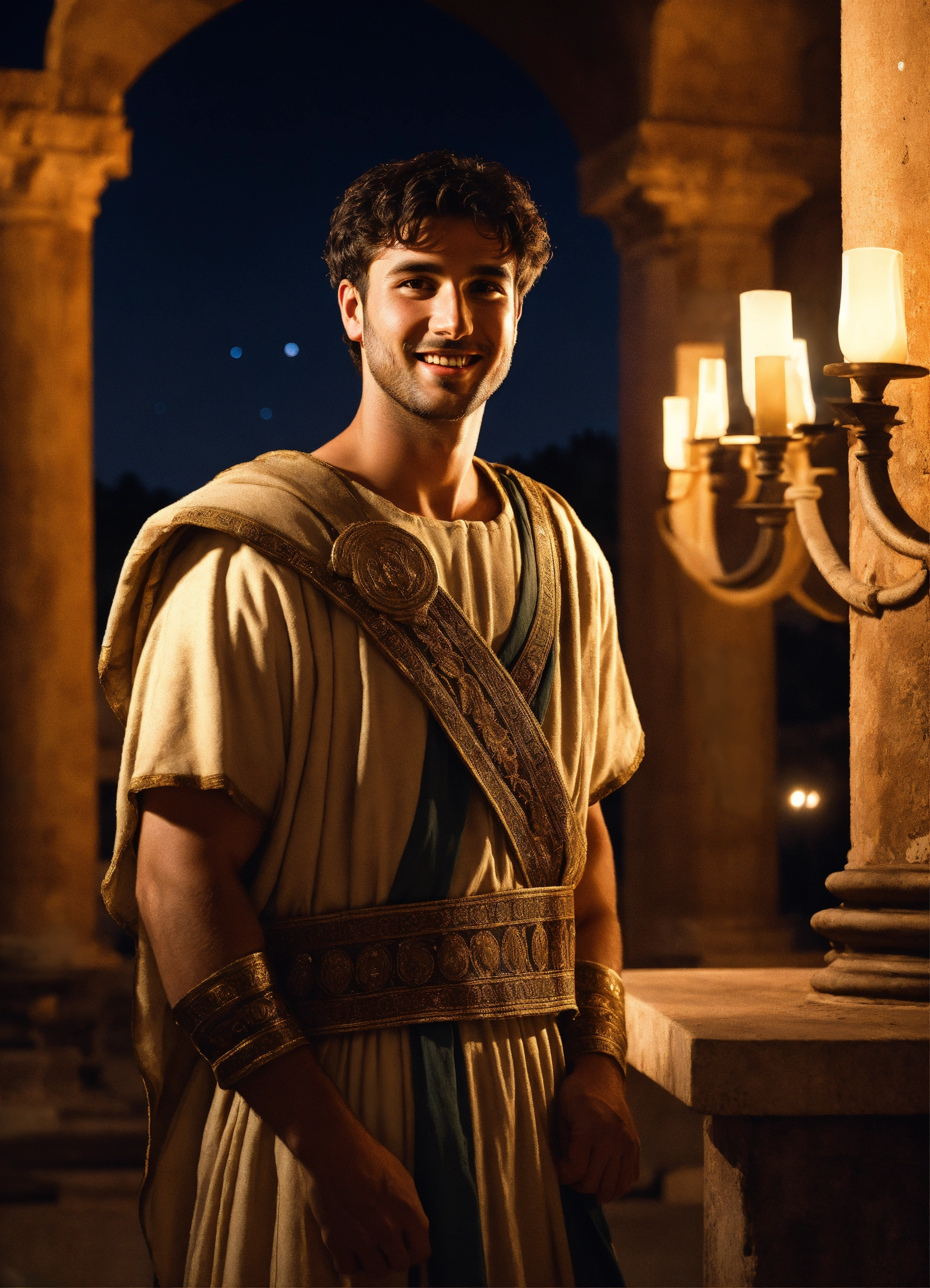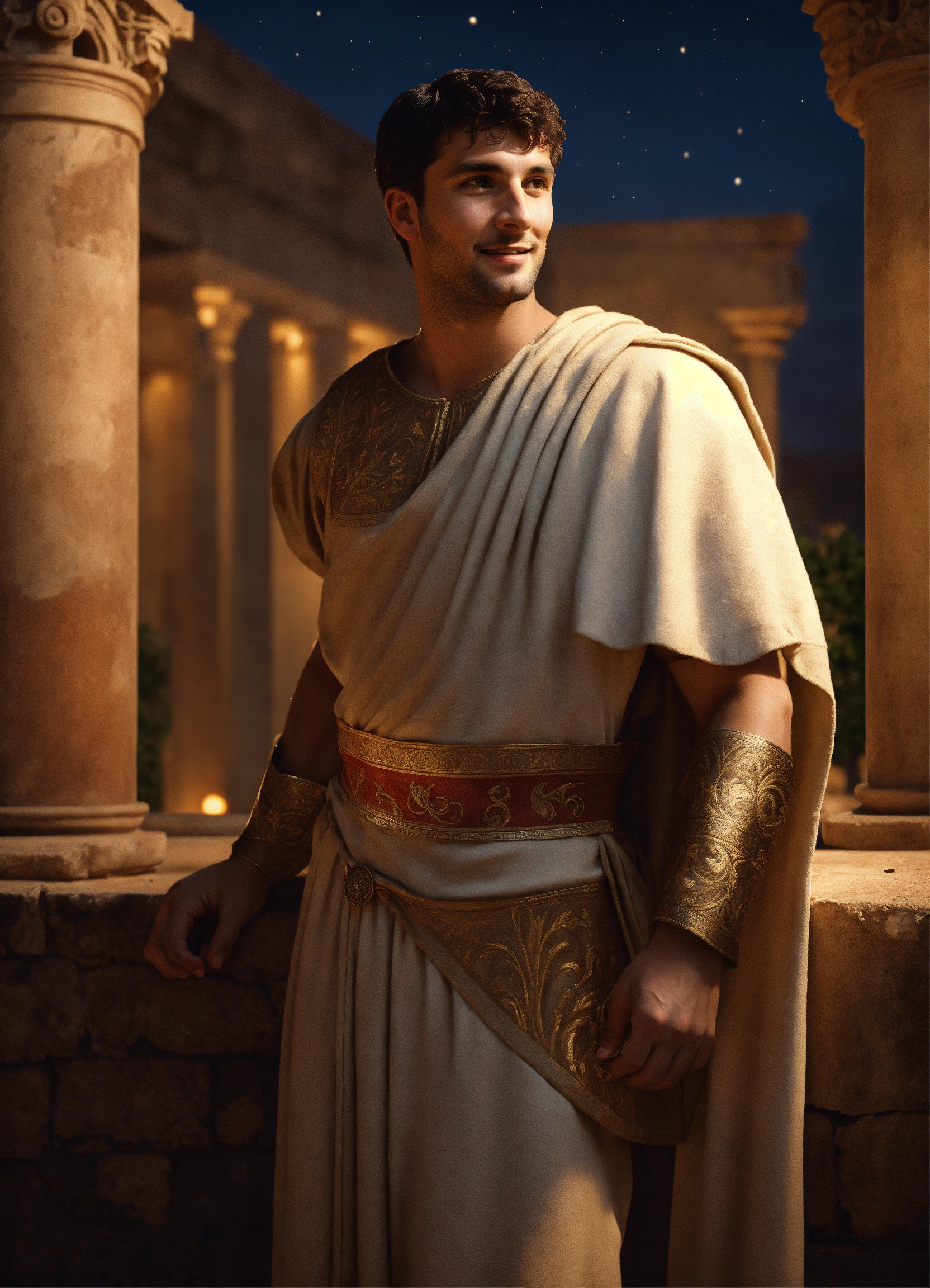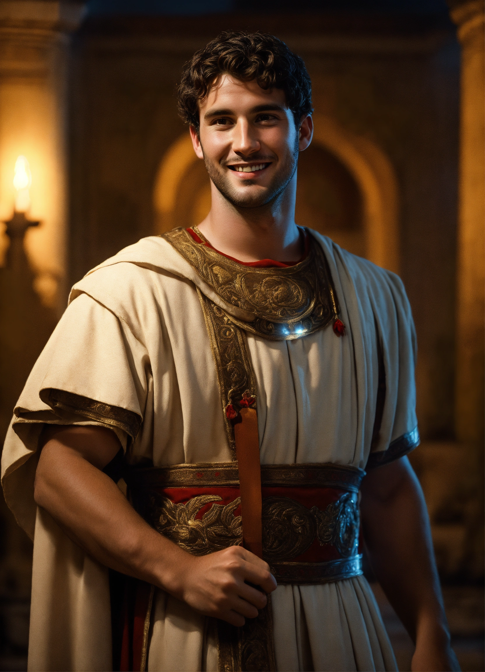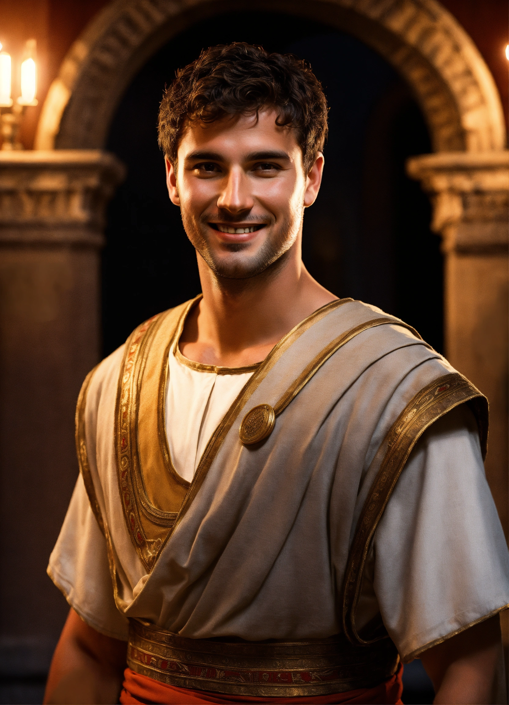 A young tall noble athletic smiling handsome roman tribune wearing simple historical roman clothes, light-colored tunic, smart, solemn, amused, 30 years old, historically accurate ancient rome, in his luxurious pompeian villa, detailed colored decor, photorealistic, hyperdetailed, 8k, at night, glamorous lights, short hair, dark-haired